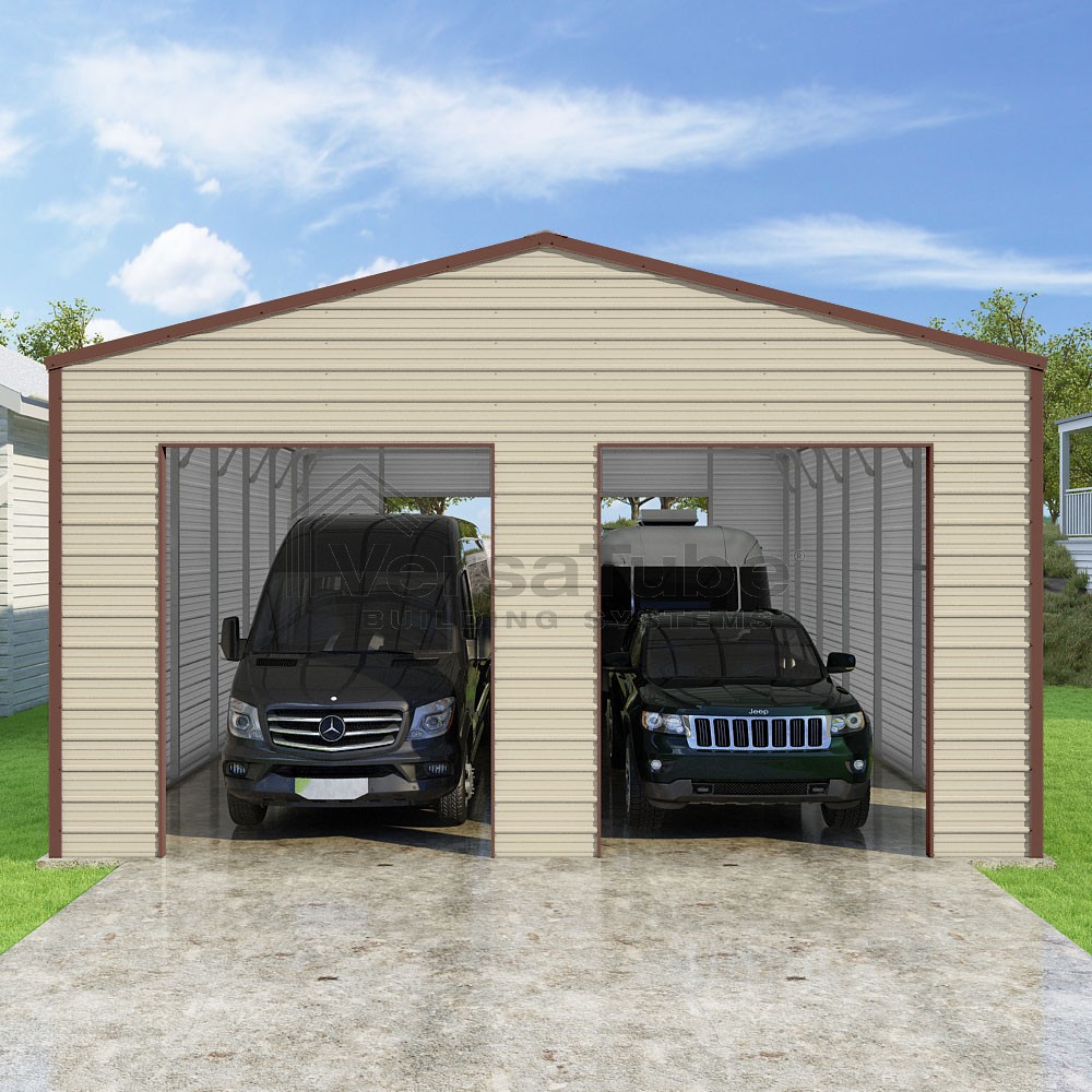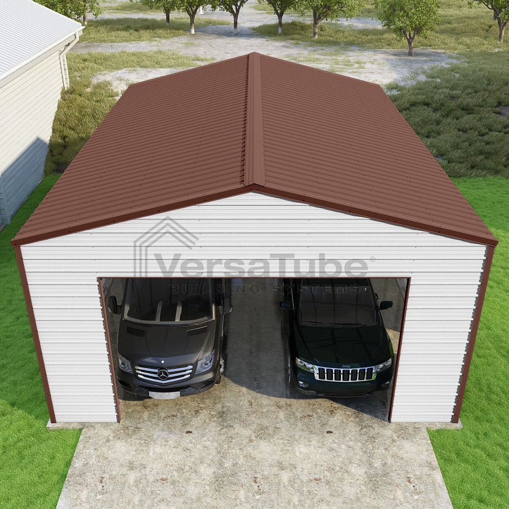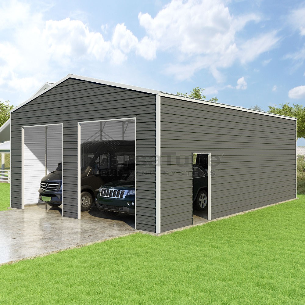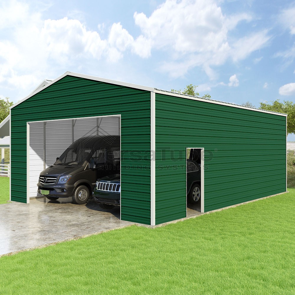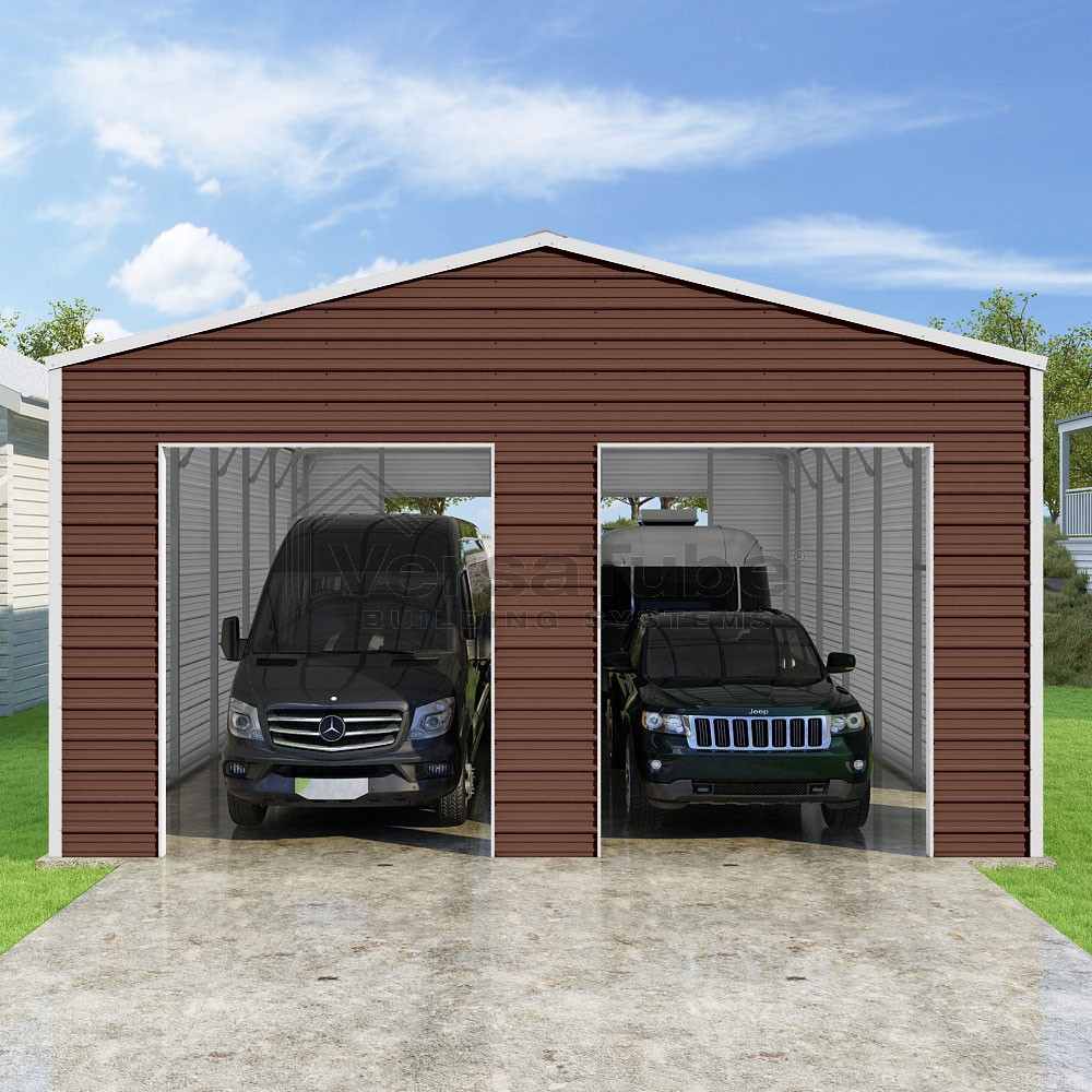Frontier Series DIY garage kit features vertical sheet metal roof panels with horizontal siding panels..