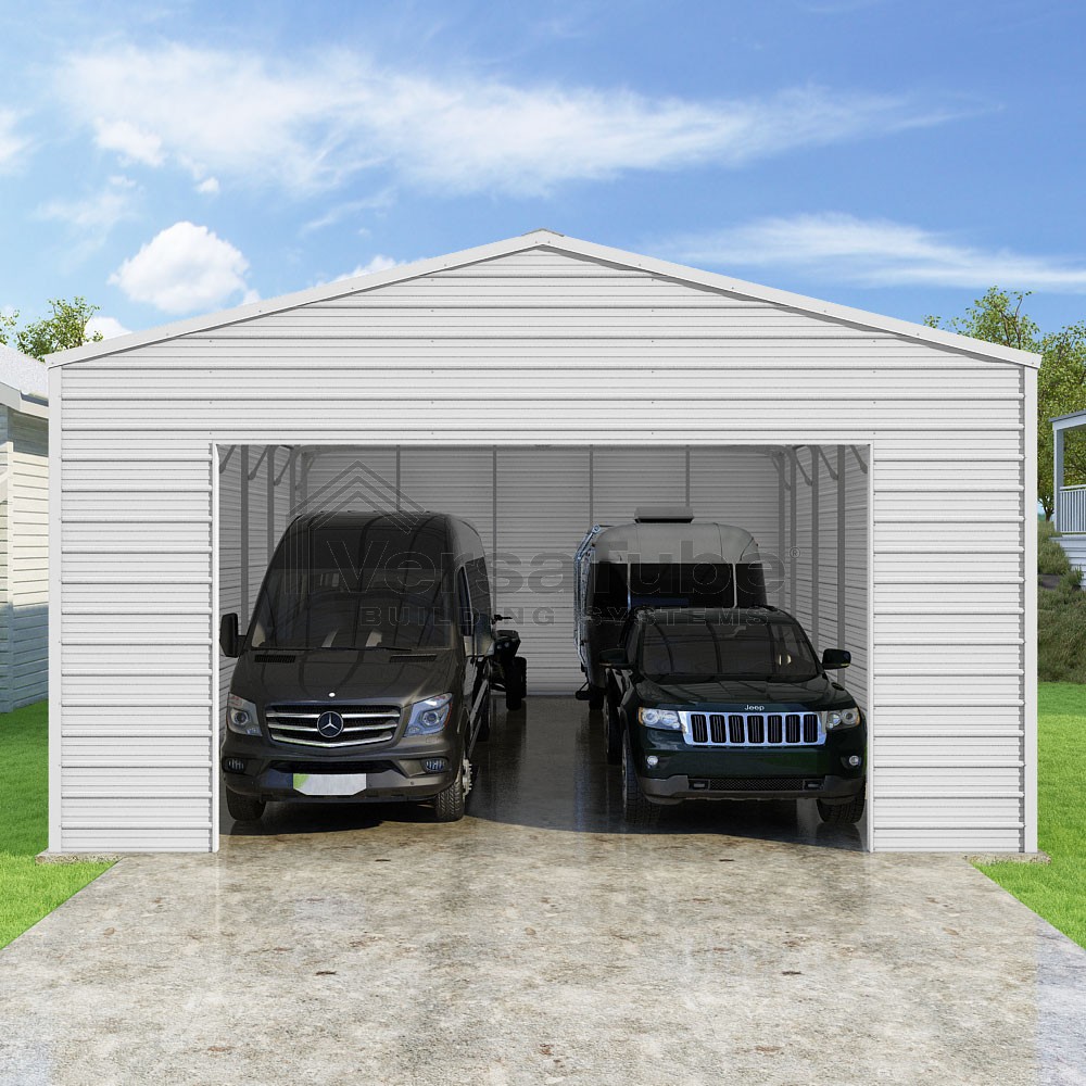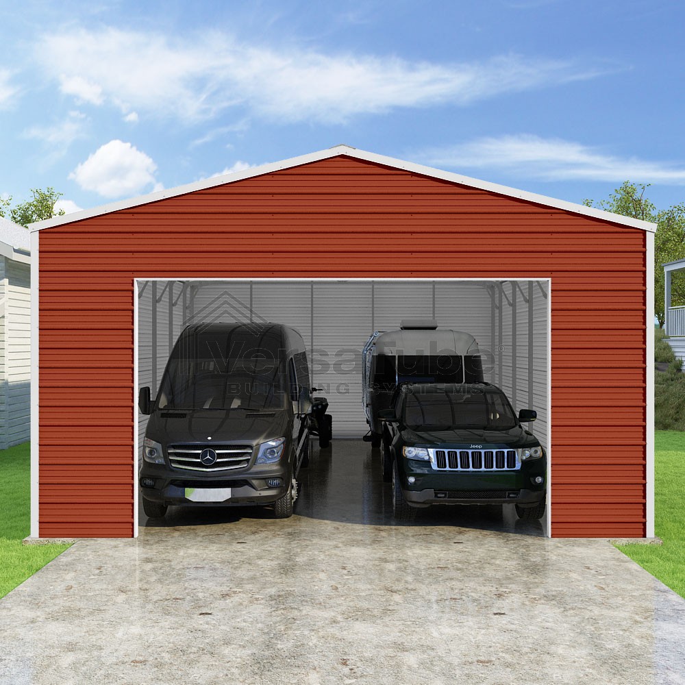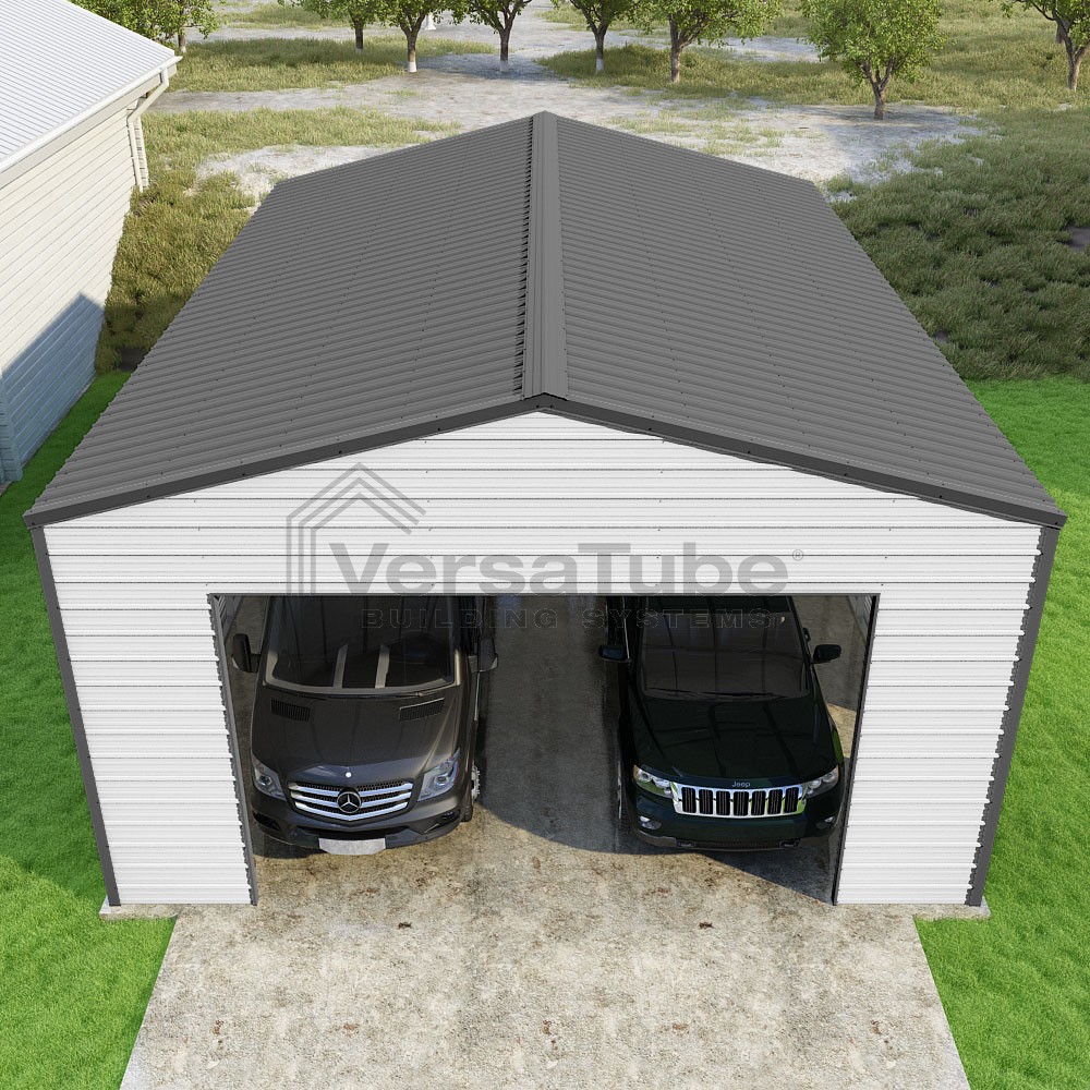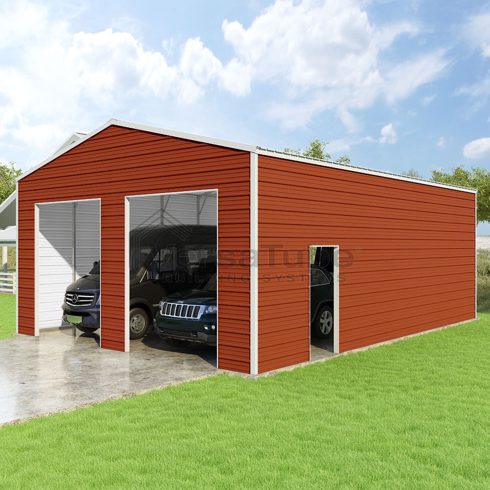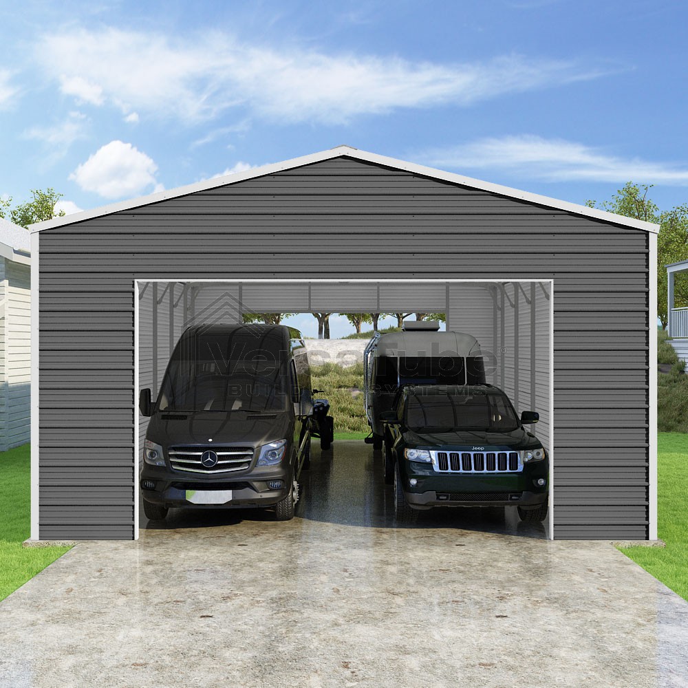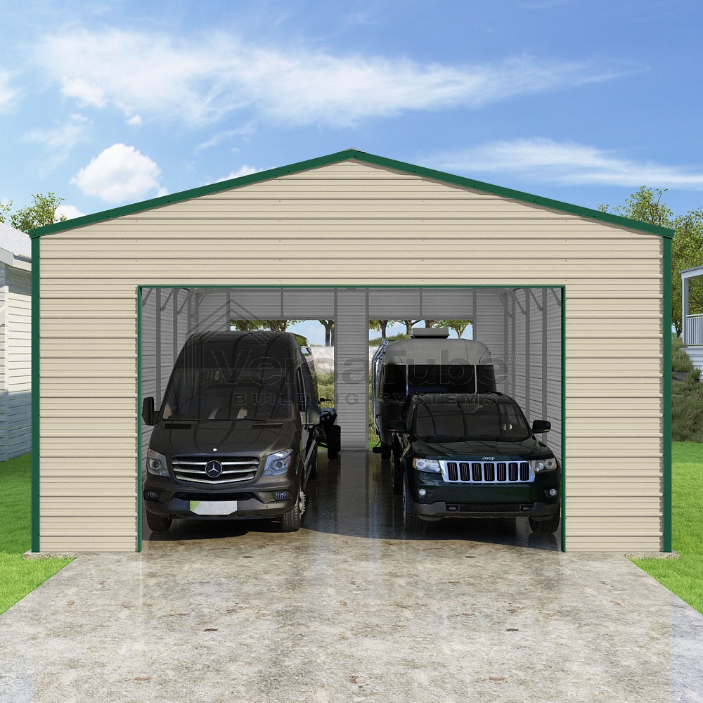 Frontier Series DIY garage kit features vertical sheet metal roof panels with horizontal siding panels..