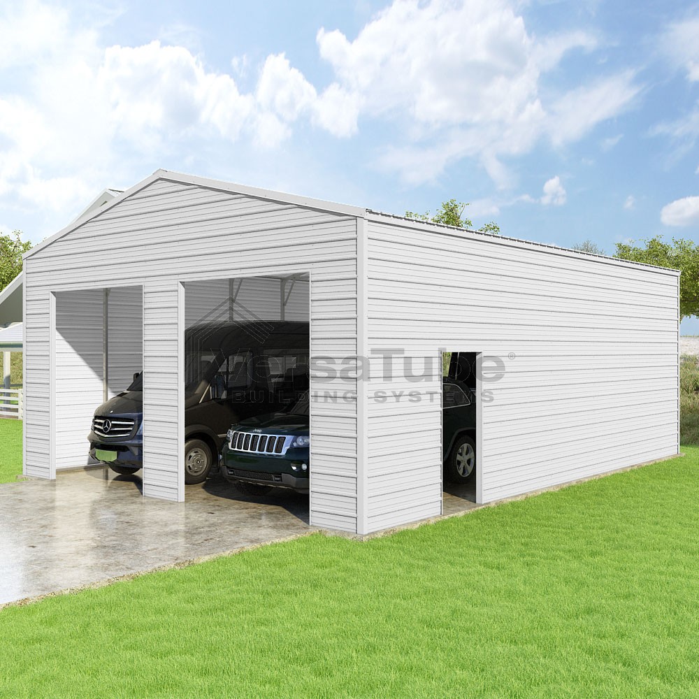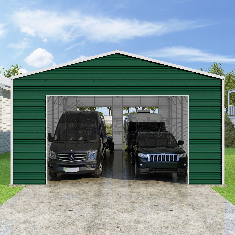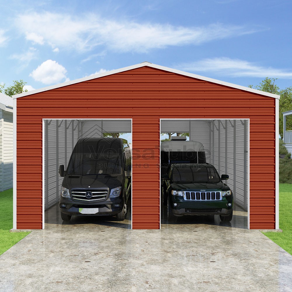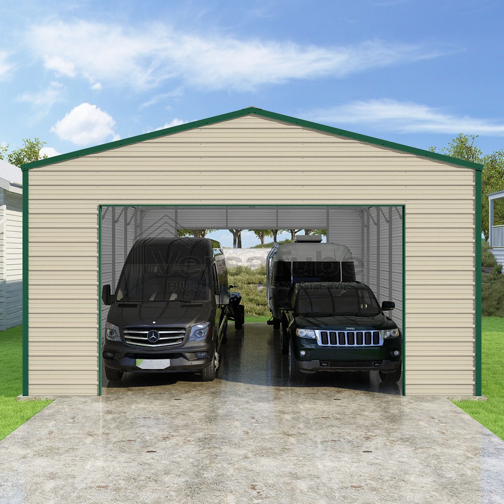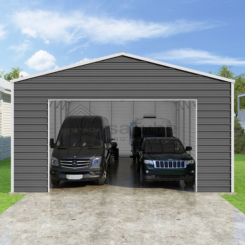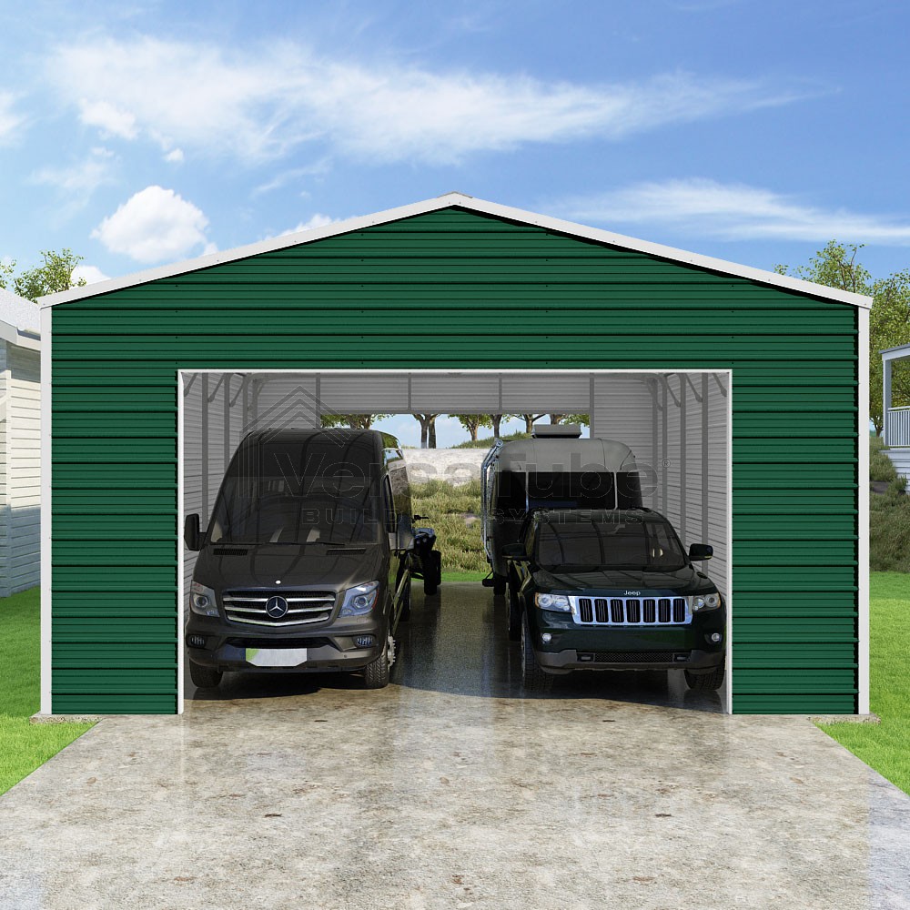 Frontier Series DIY garage kit features vertical sheet metal roof panels with horizontal siding panels..