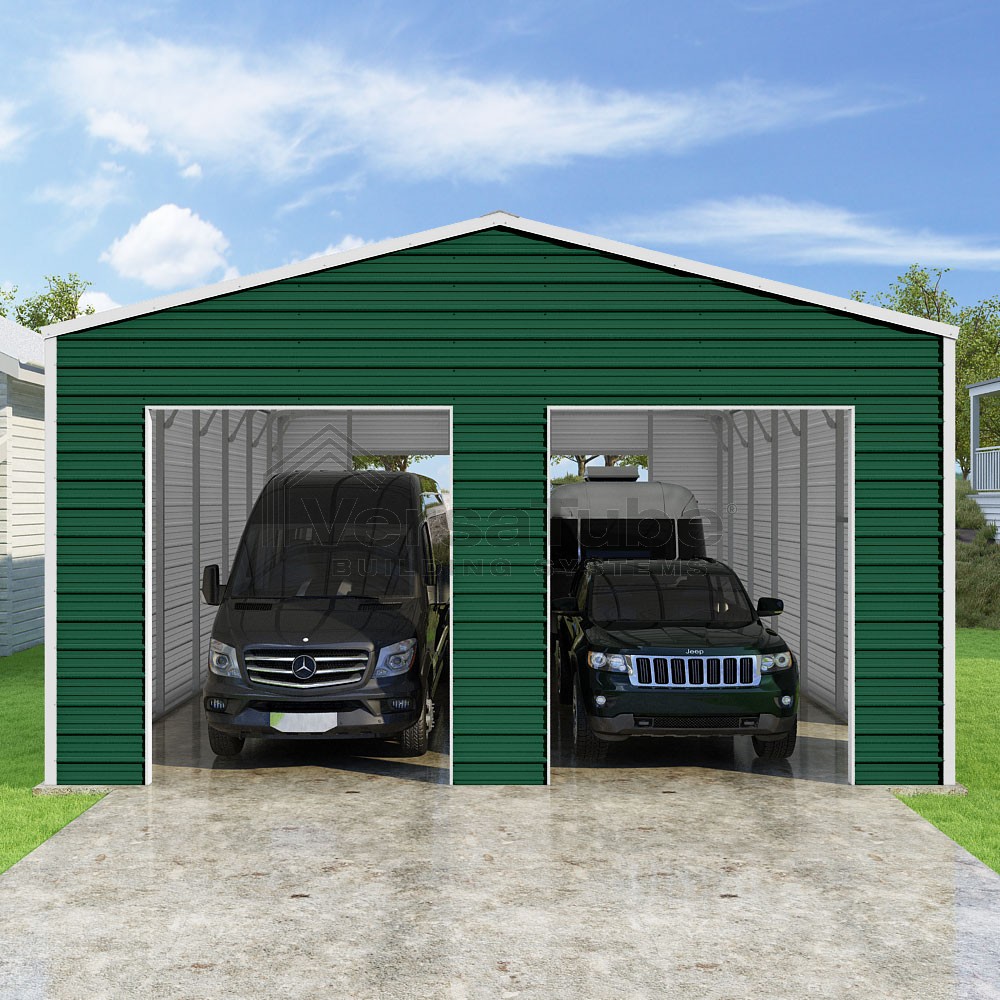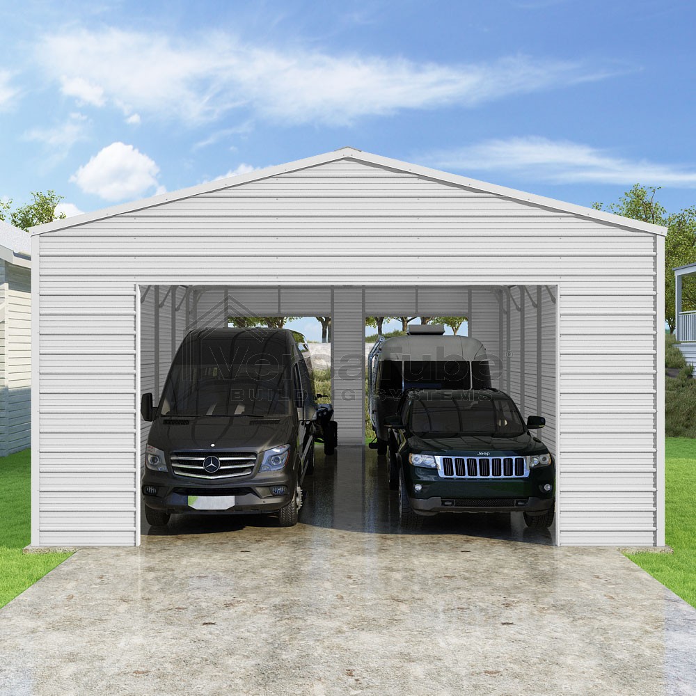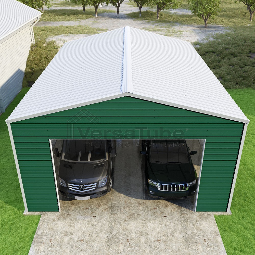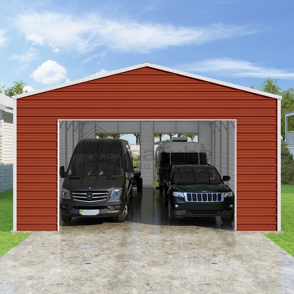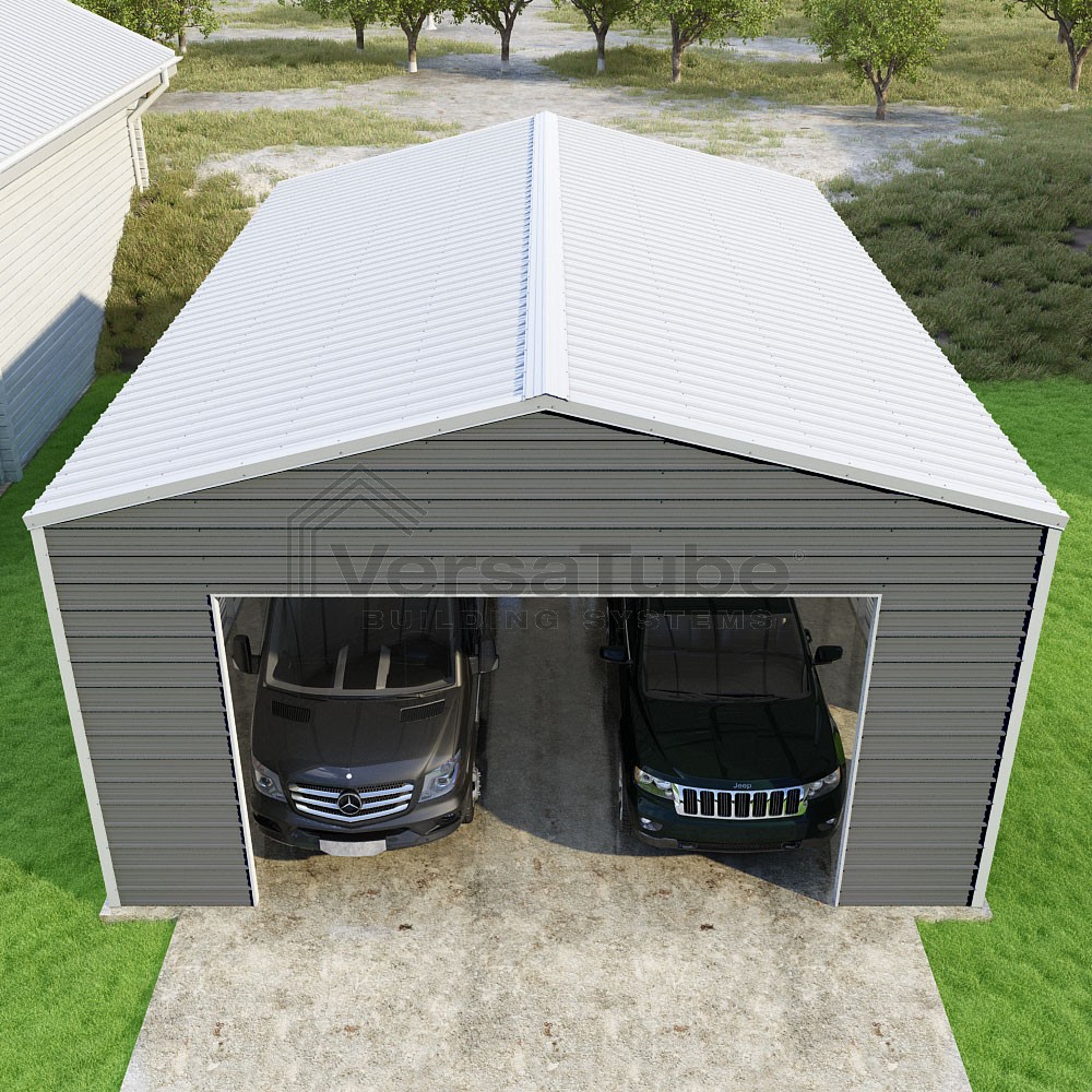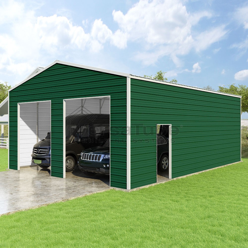 Frontier Series DIY garage kit features vertical sheet metal roof panels with horizontal siding panels..