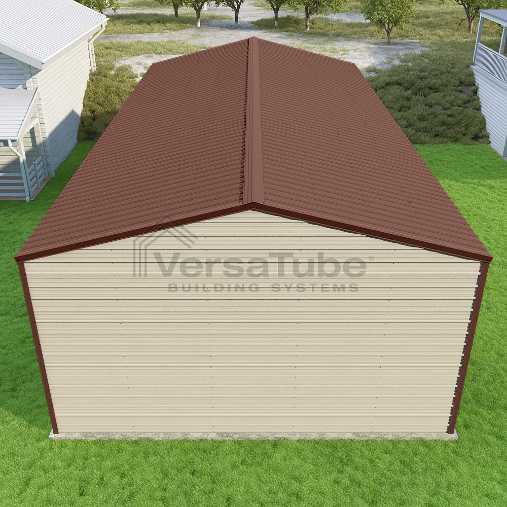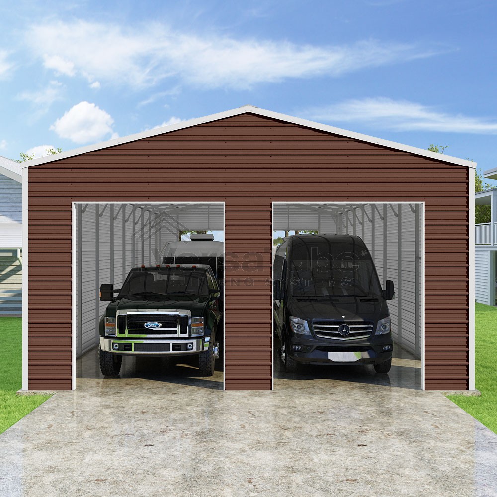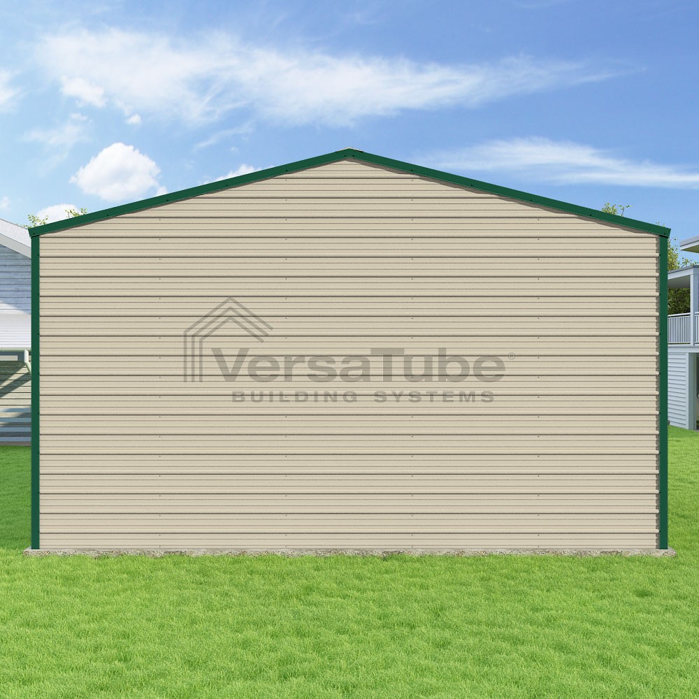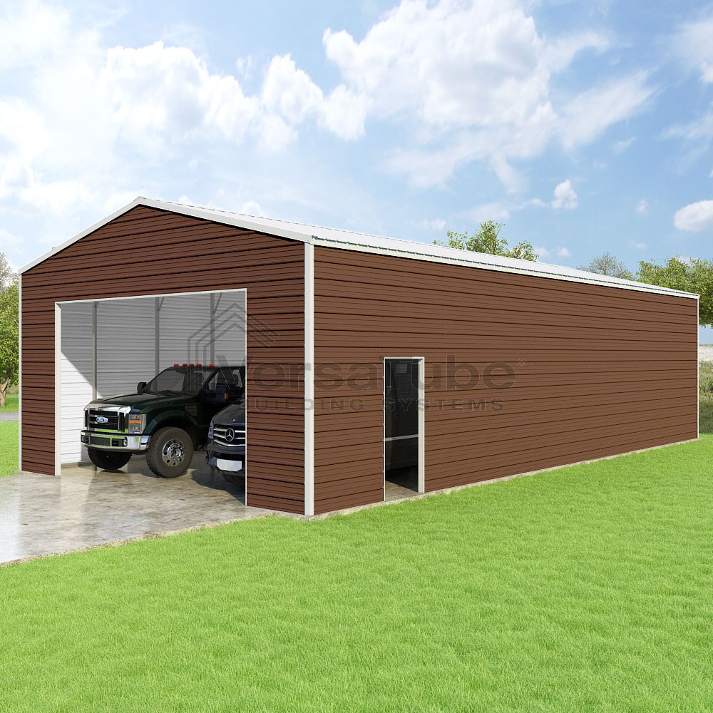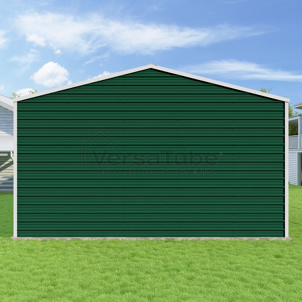 Frontier Series DIY garage kit features vertical sheet metal roof panels with horizontal siding panels..