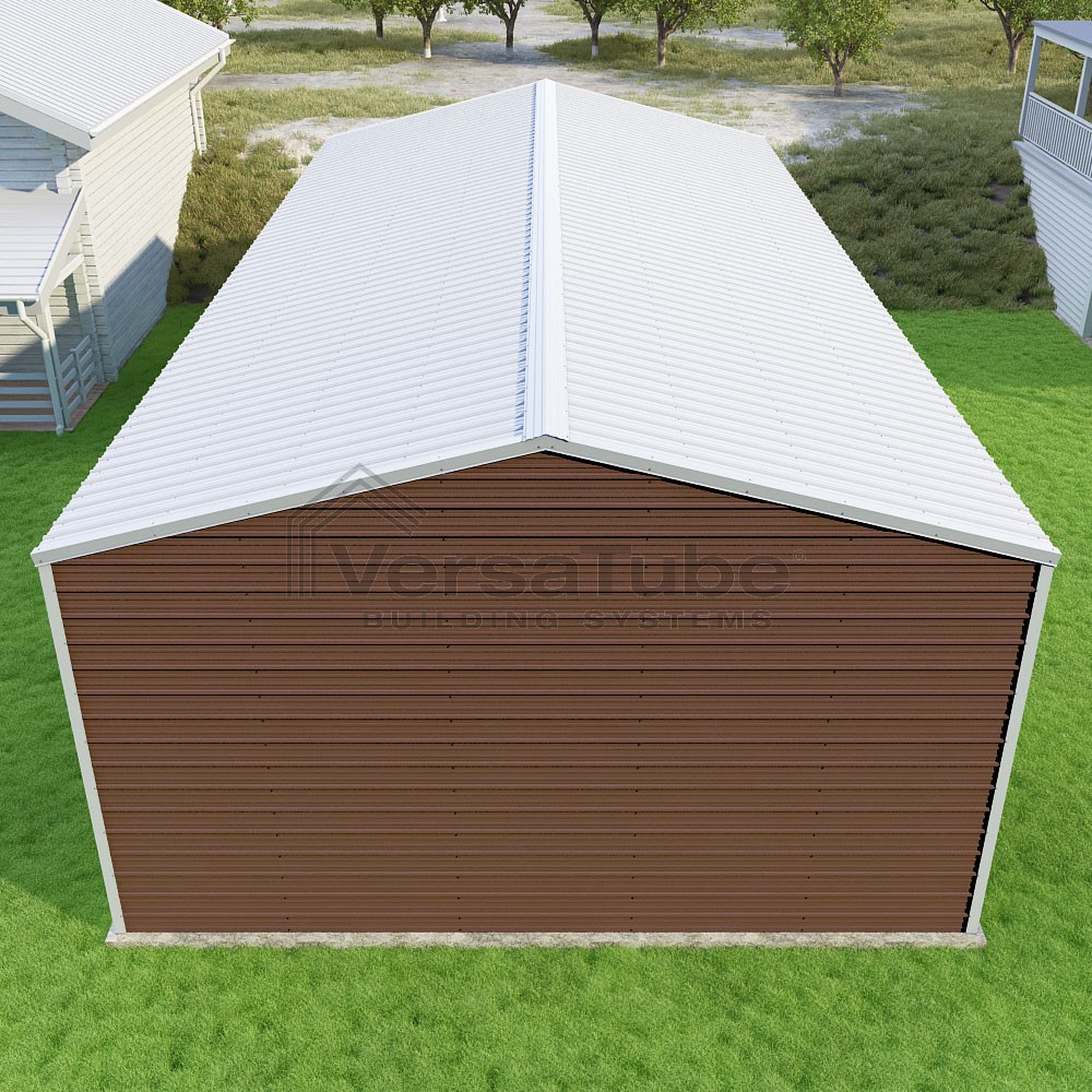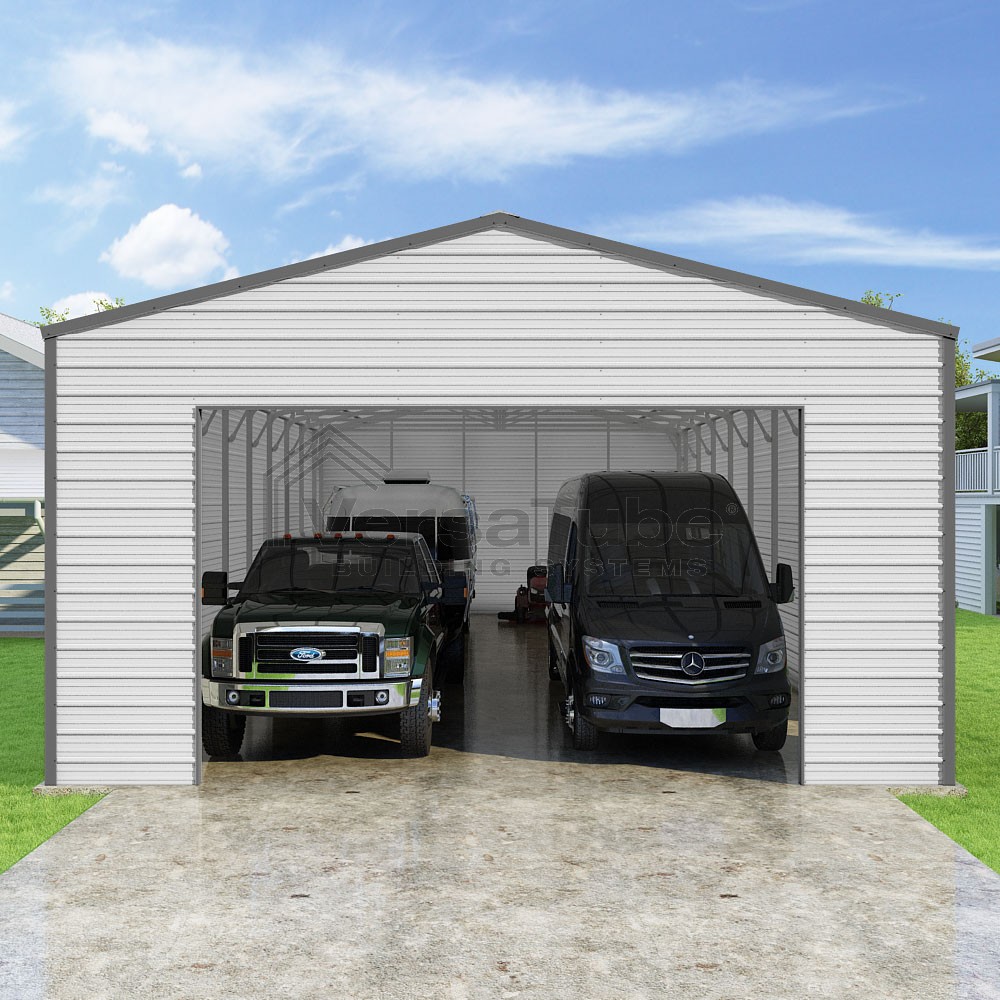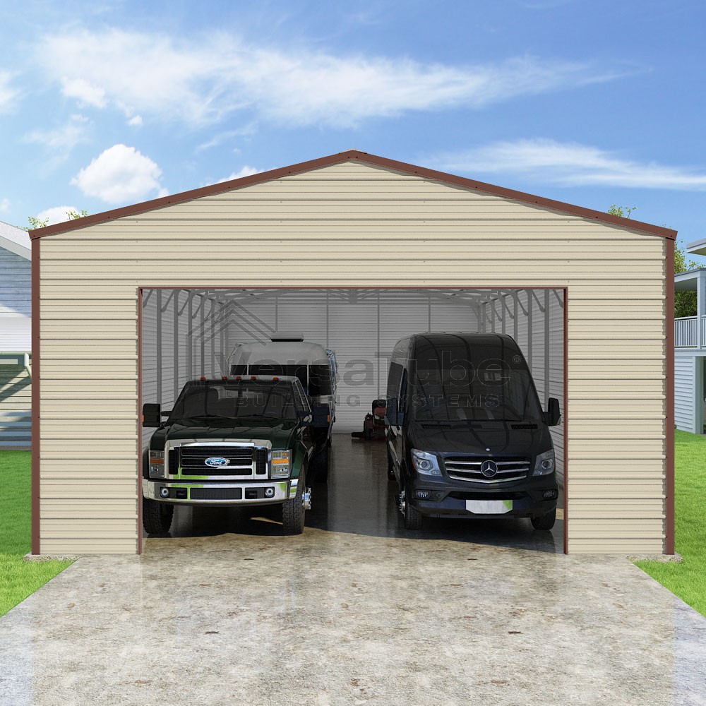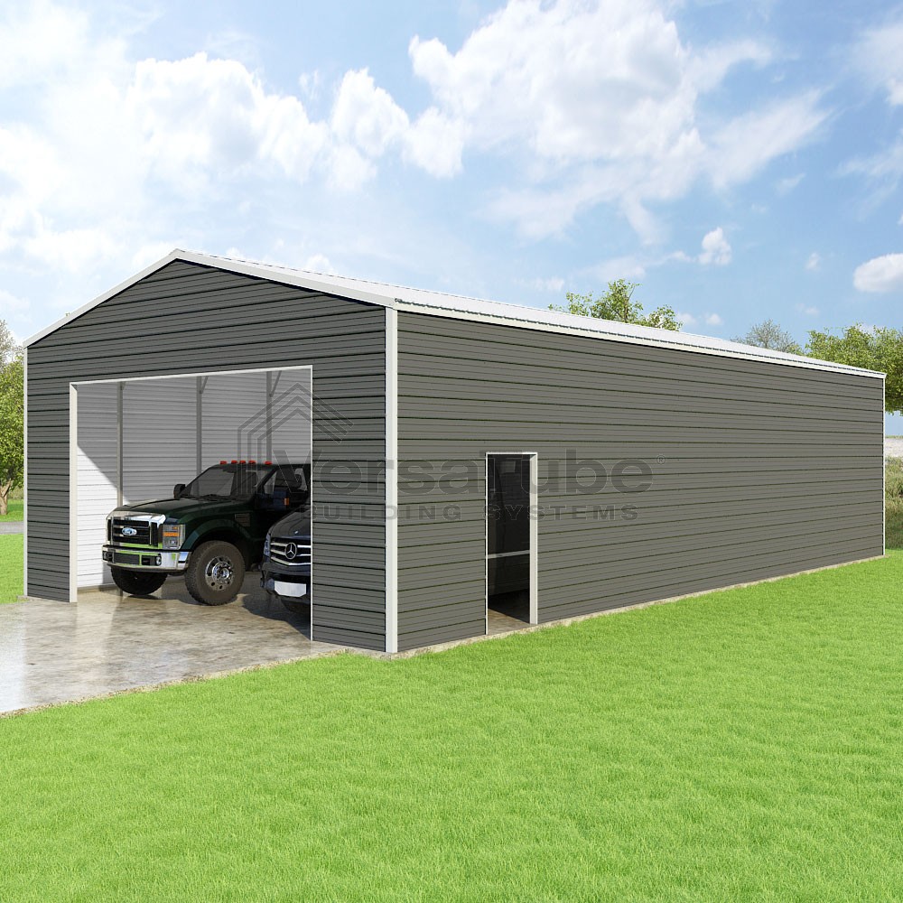 Frontier Series DIY garage kit features vertical sheet metal roof panels with horizontal siding panels..
