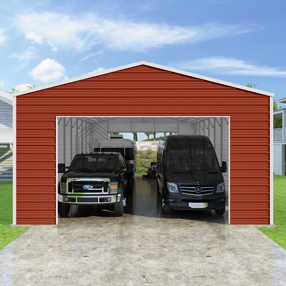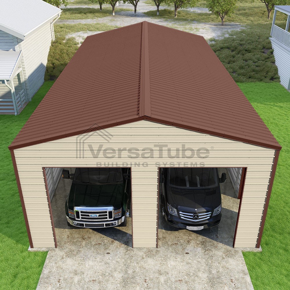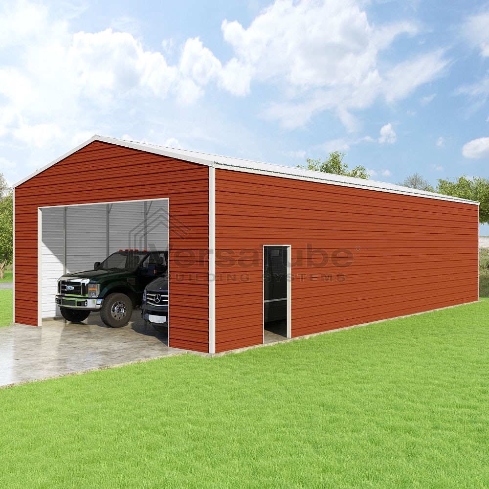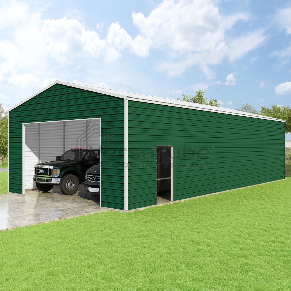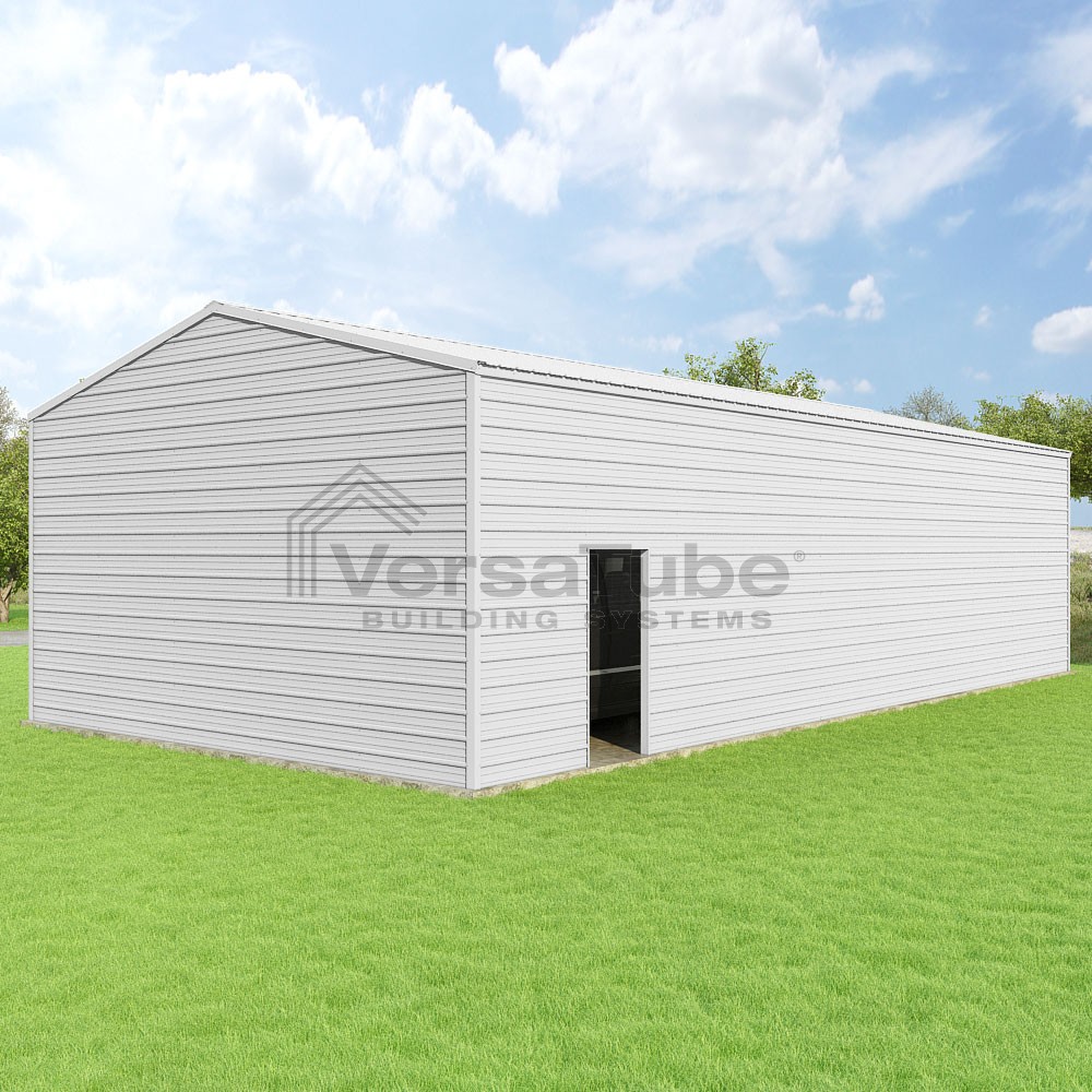 Frontier Series DIY garage kit features vertical sheet metal roof panels with horizontal siding panels..