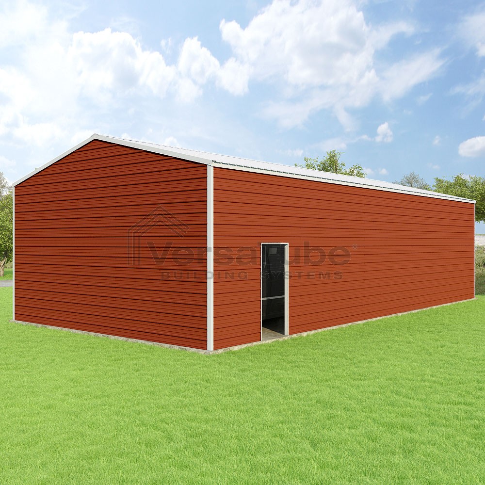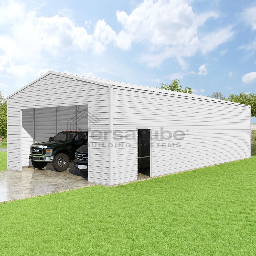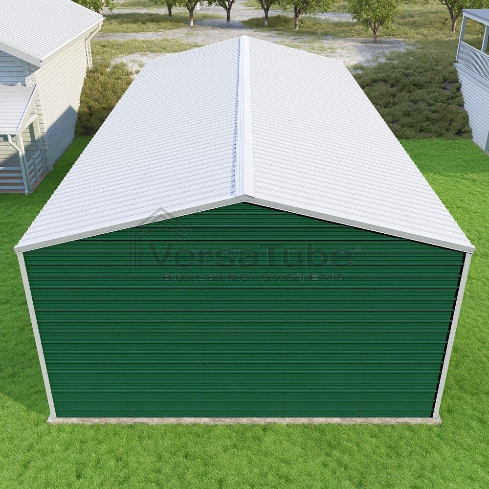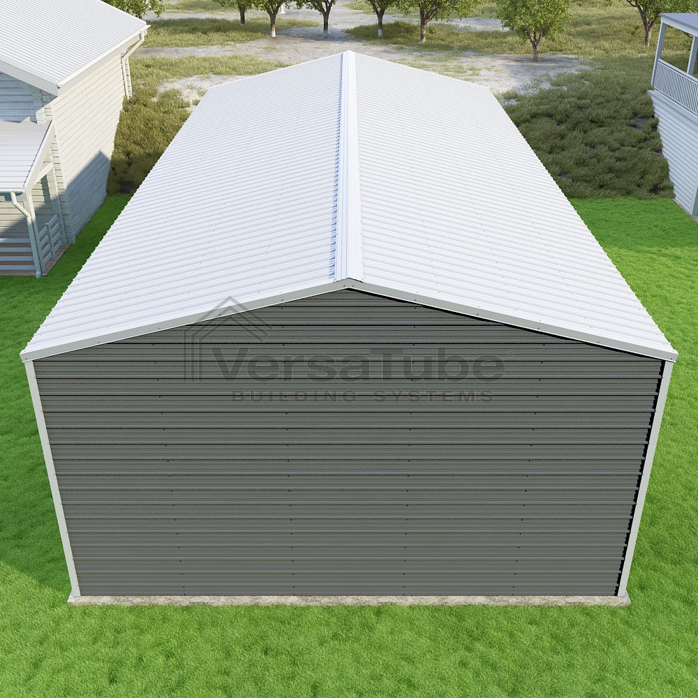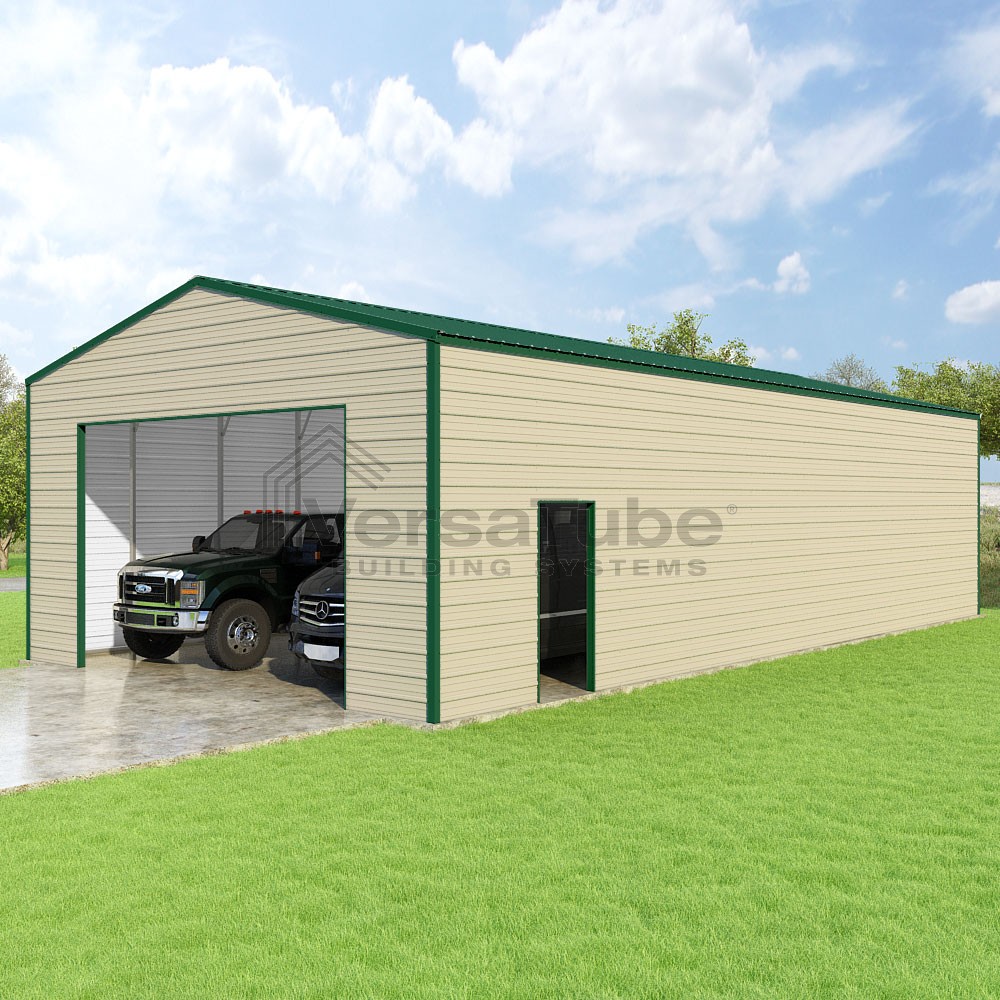 Frontier Series DIY garage kit features vertical sheet metal roof panels with horizontal siding panels..