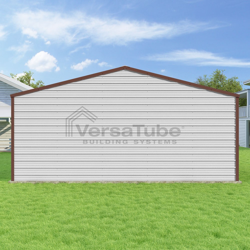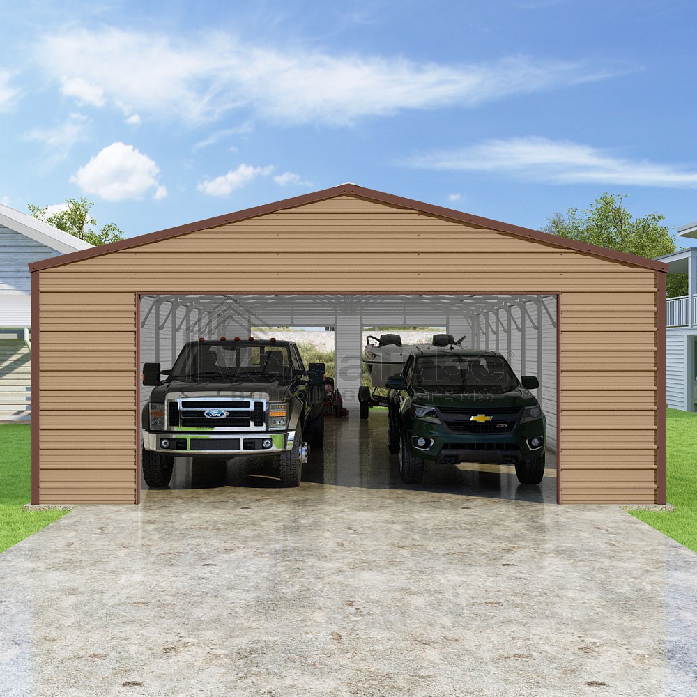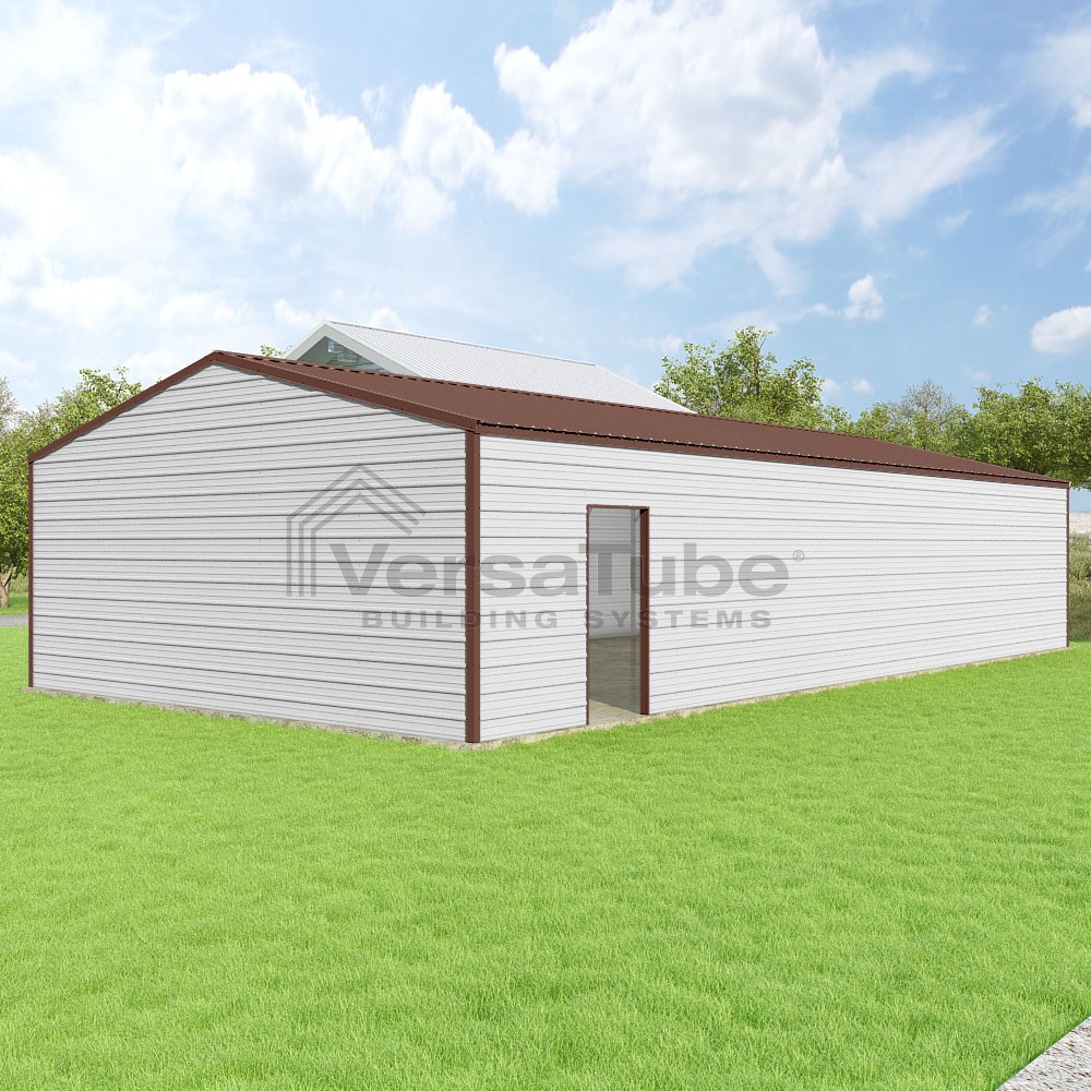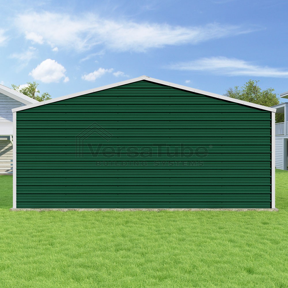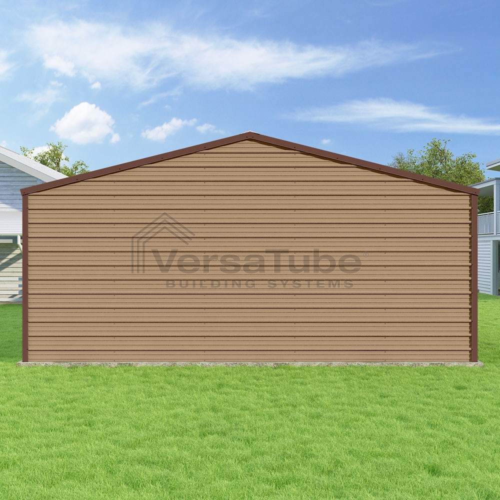 Frontier Series DIY garage kit features vertical sheet metal roof panels with horizontal siding panels..