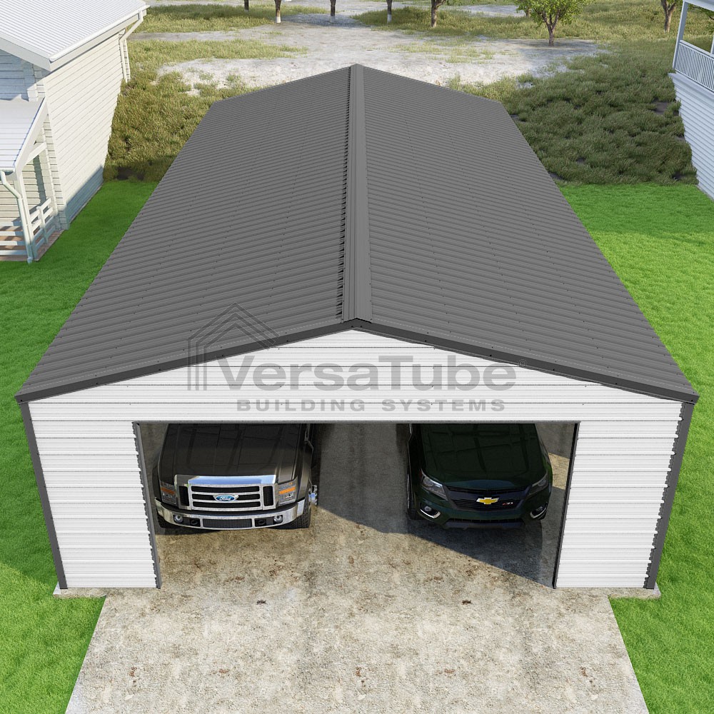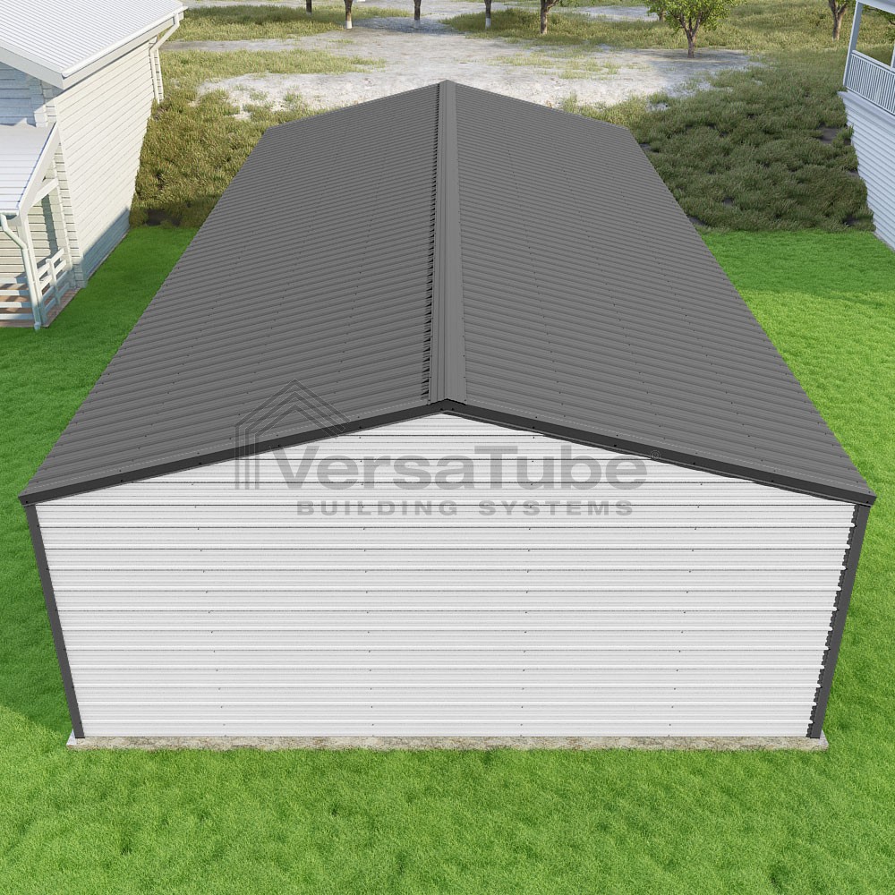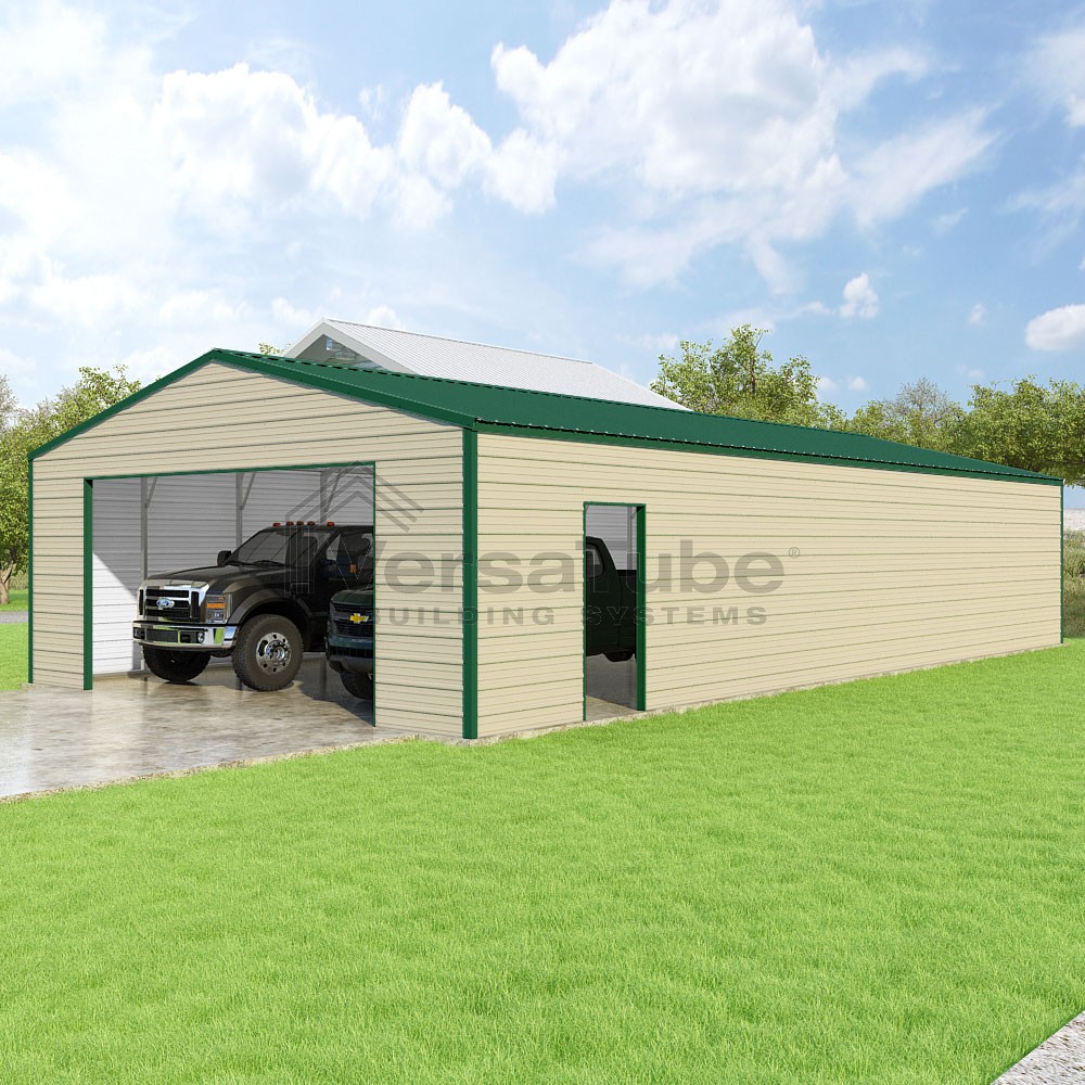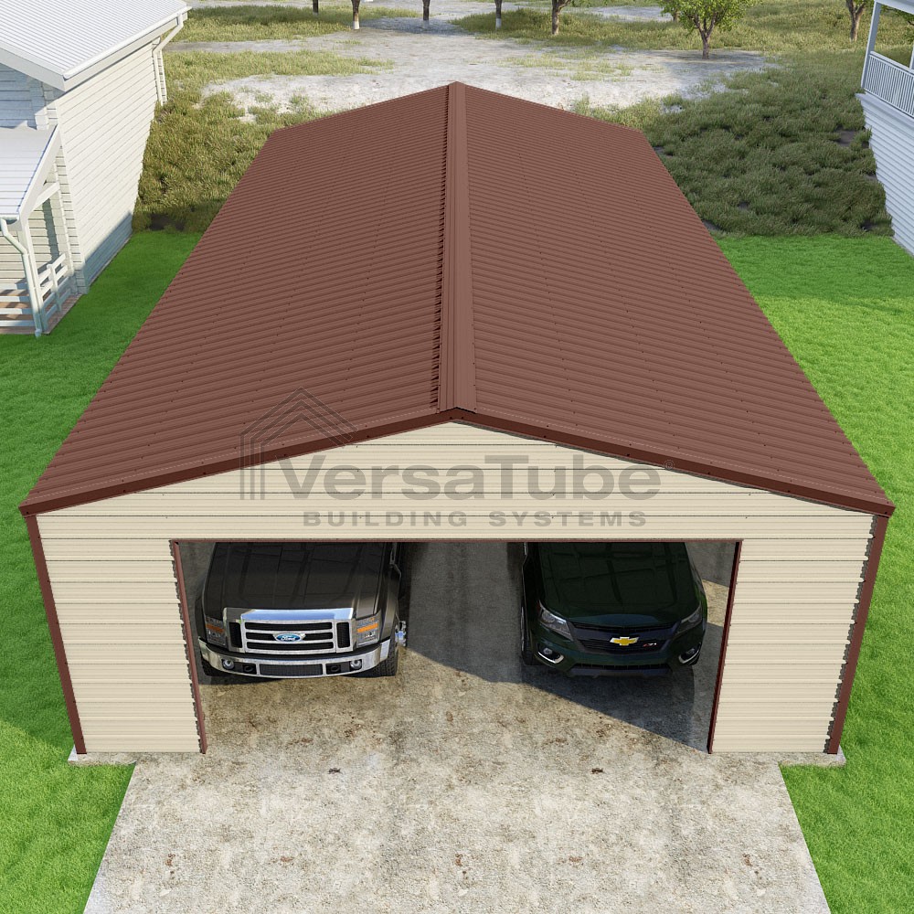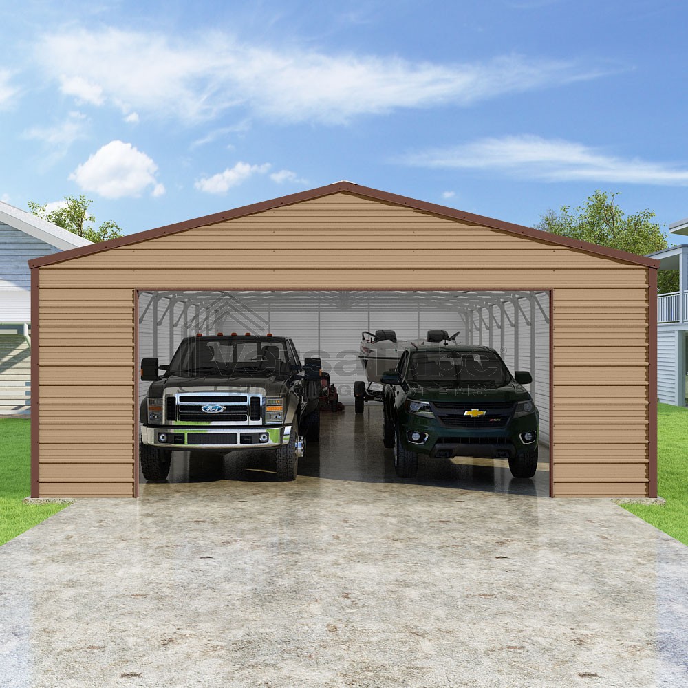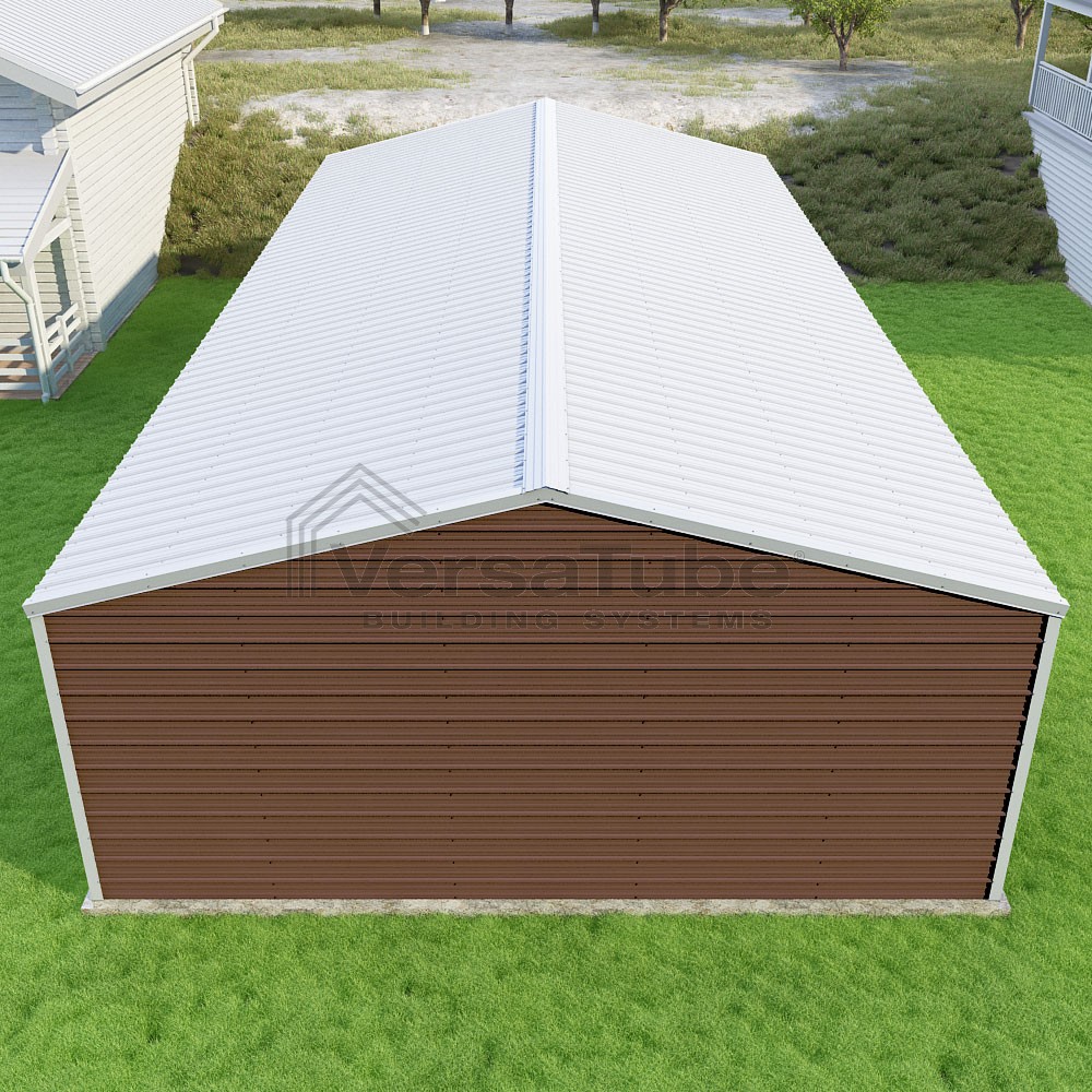 Frontier Series DIY garage kit features vertical sheet metal roof panels with horizontal siding panels..