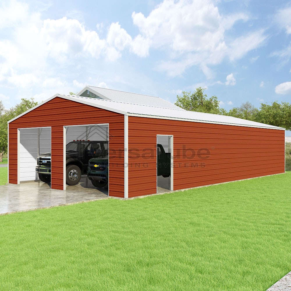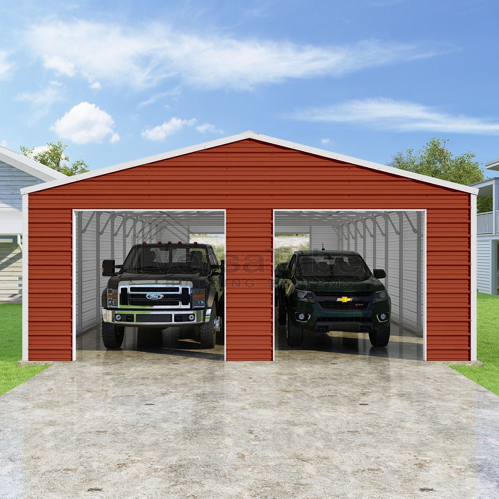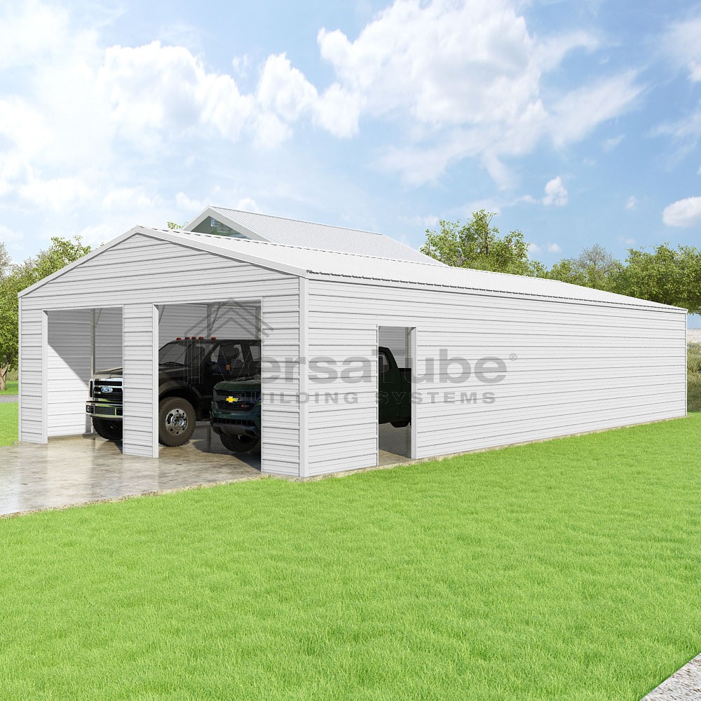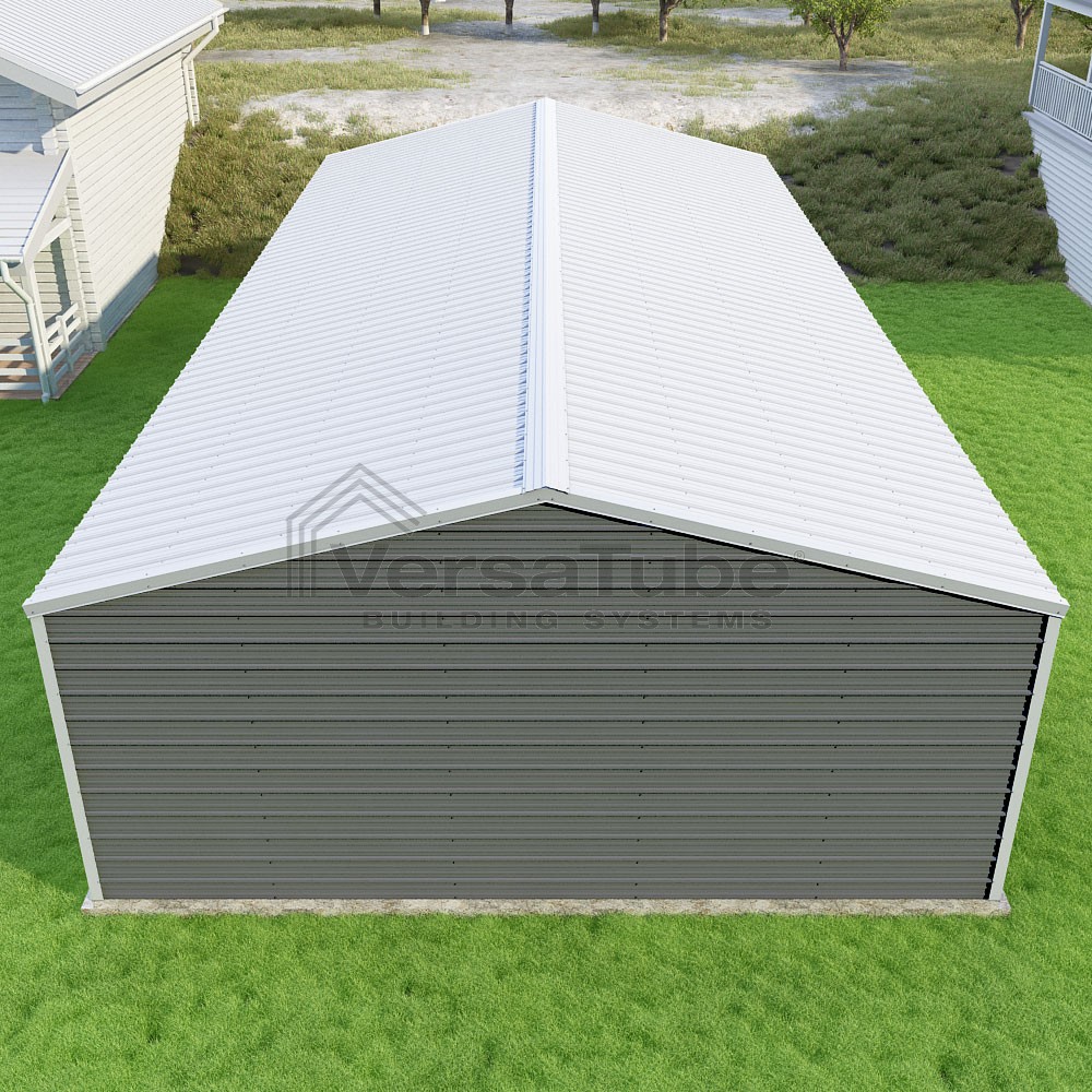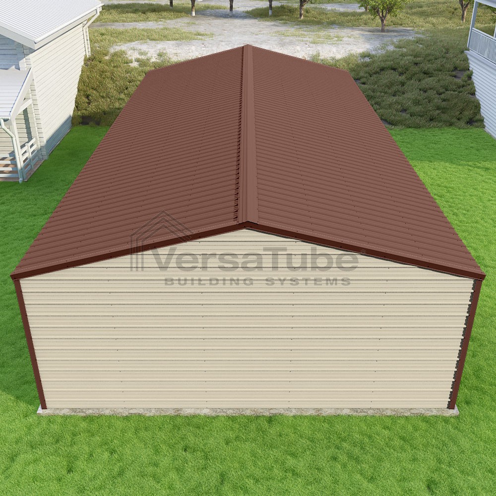 Frontier Series DIY garage kit features vertical sheet metal roof panels with horizontal siding panels..