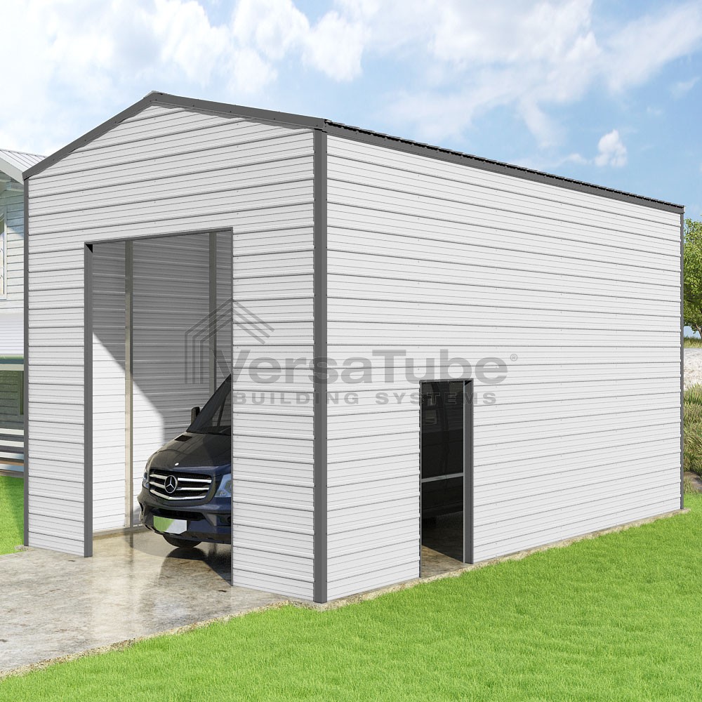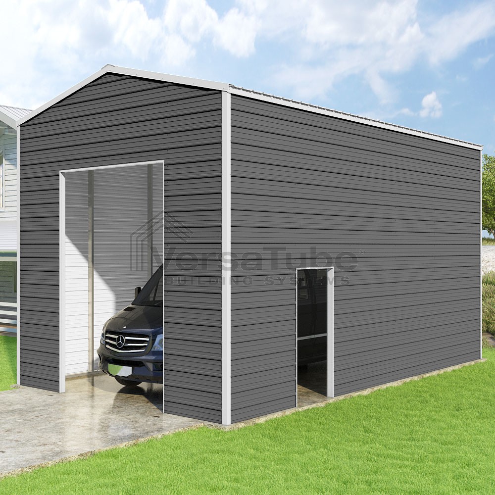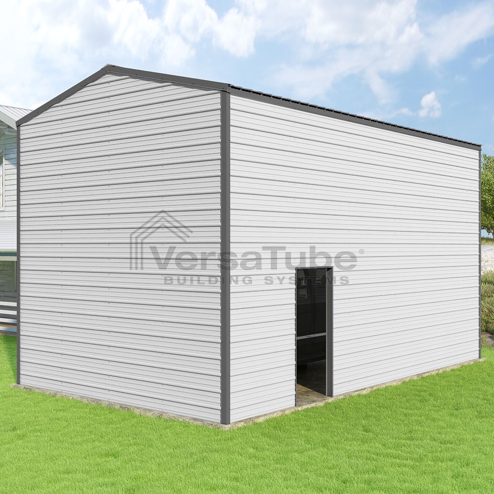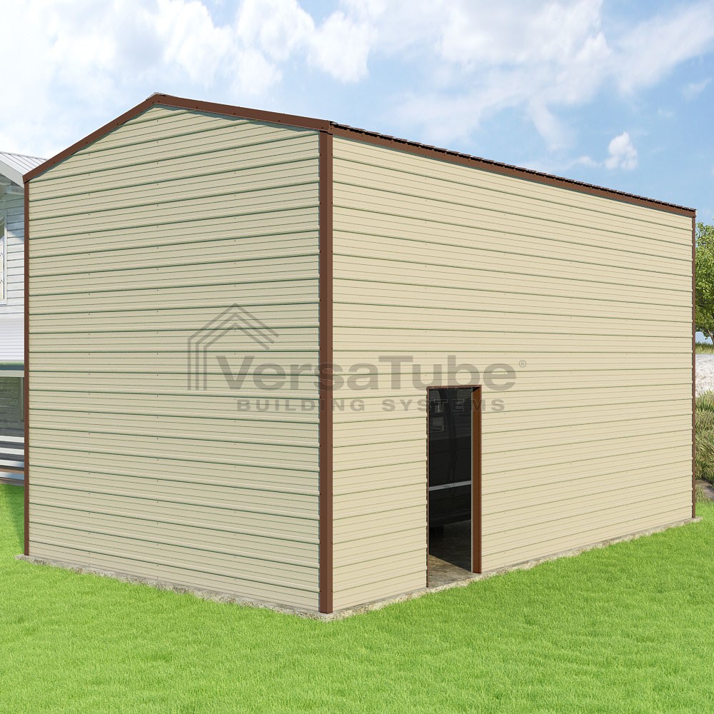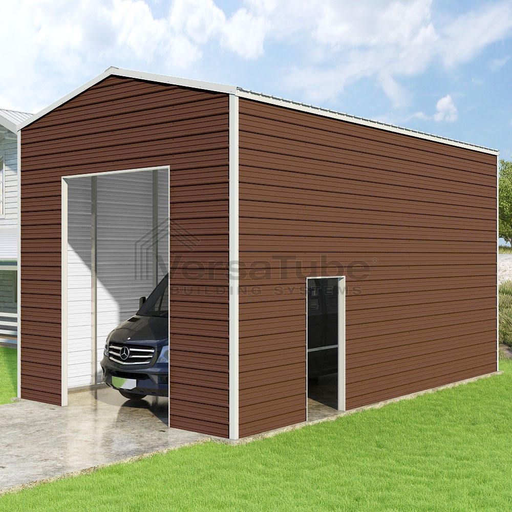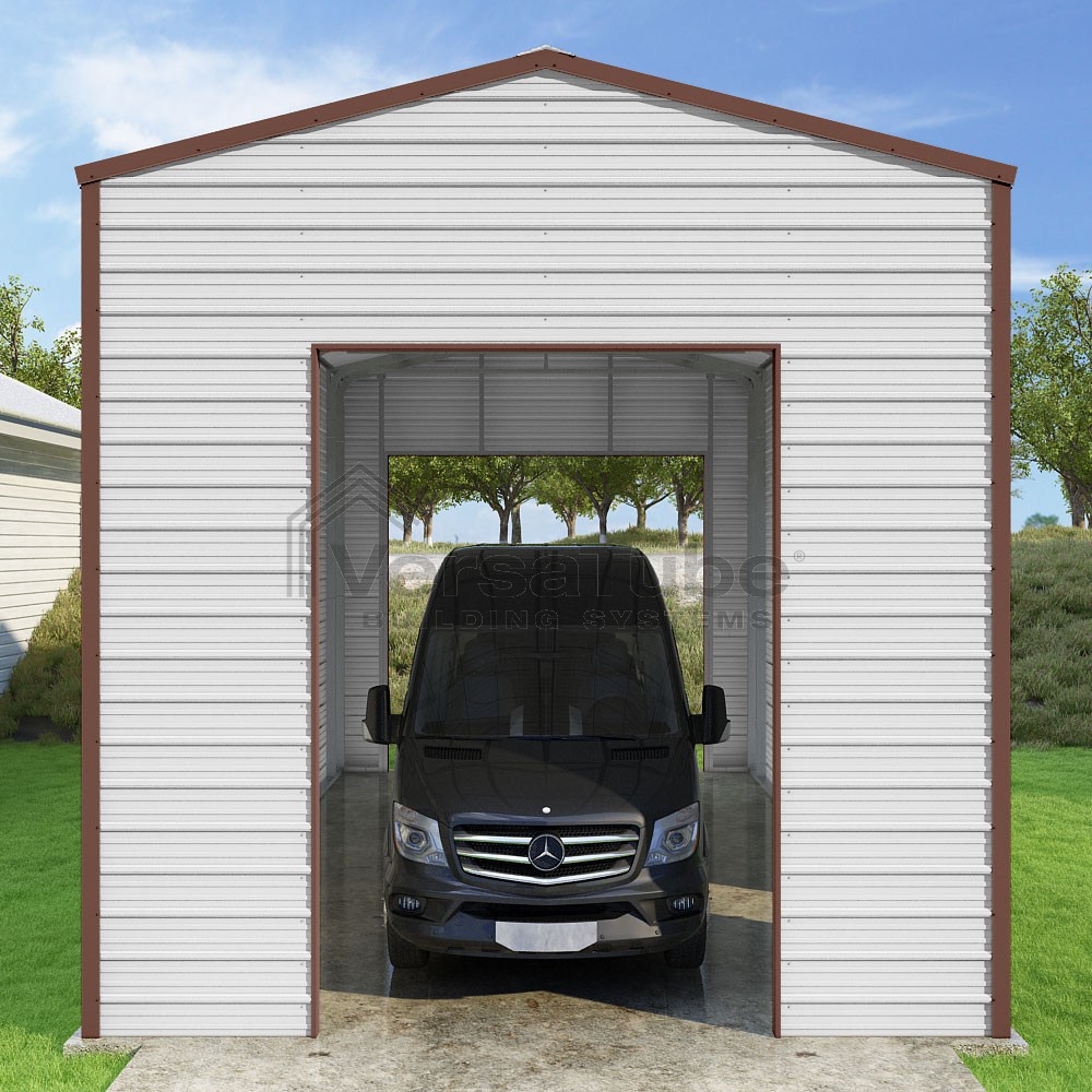 Frontier Series DIY garage kit features vertical sheet metal roof panels with horizontal siding panels..