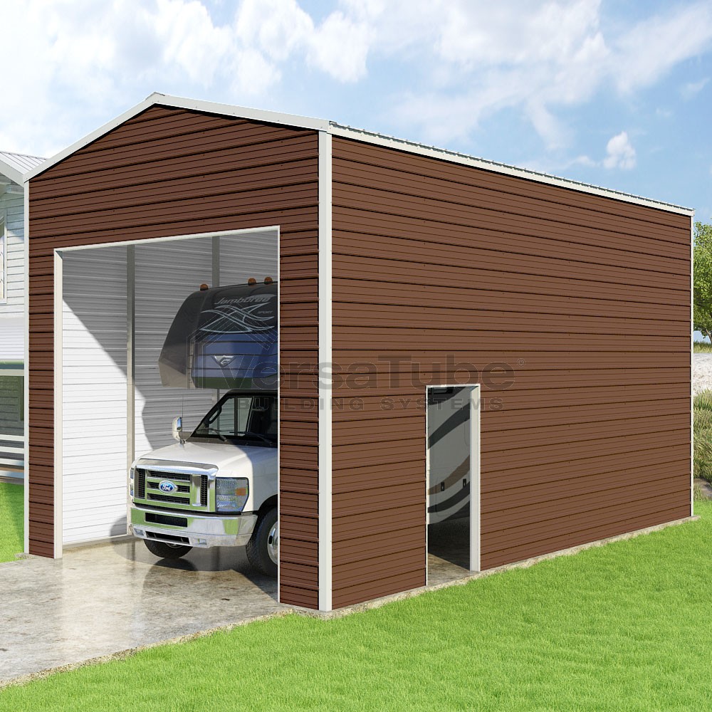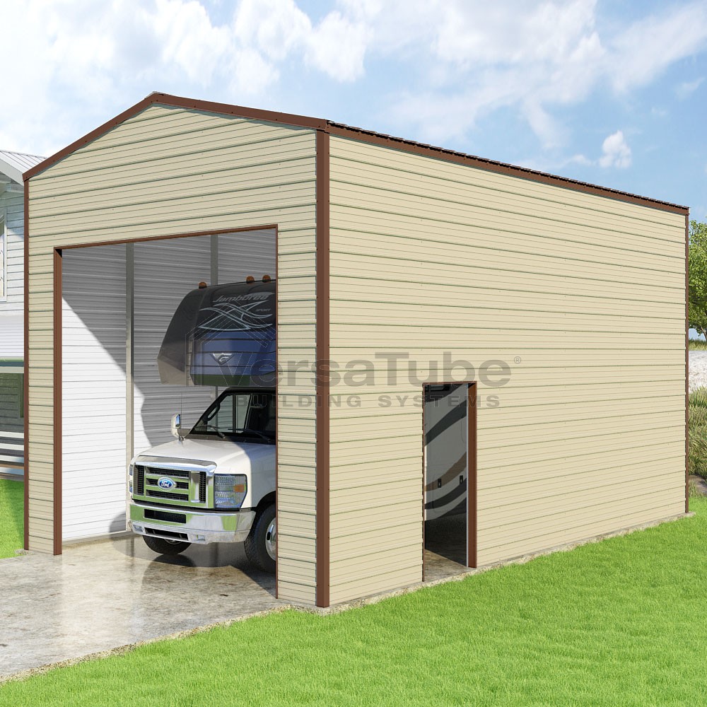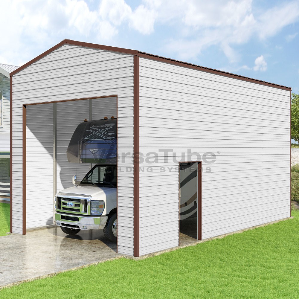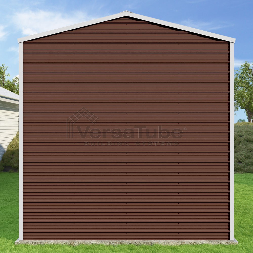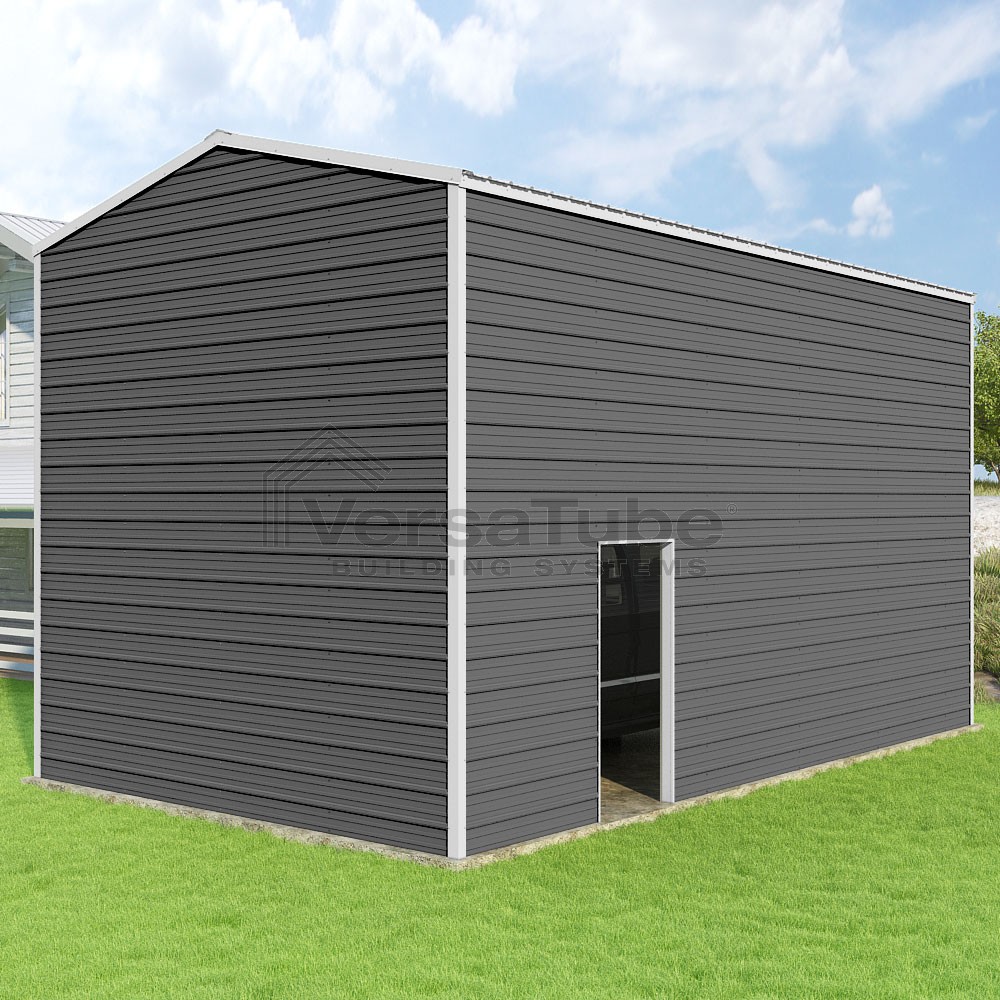 Frontier Series DIY garage kit features vertical sheet metal roof panels with horizontal siding panels..