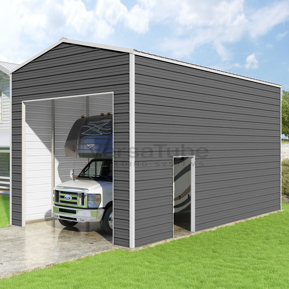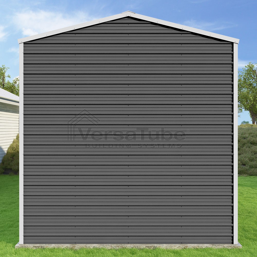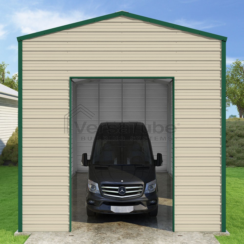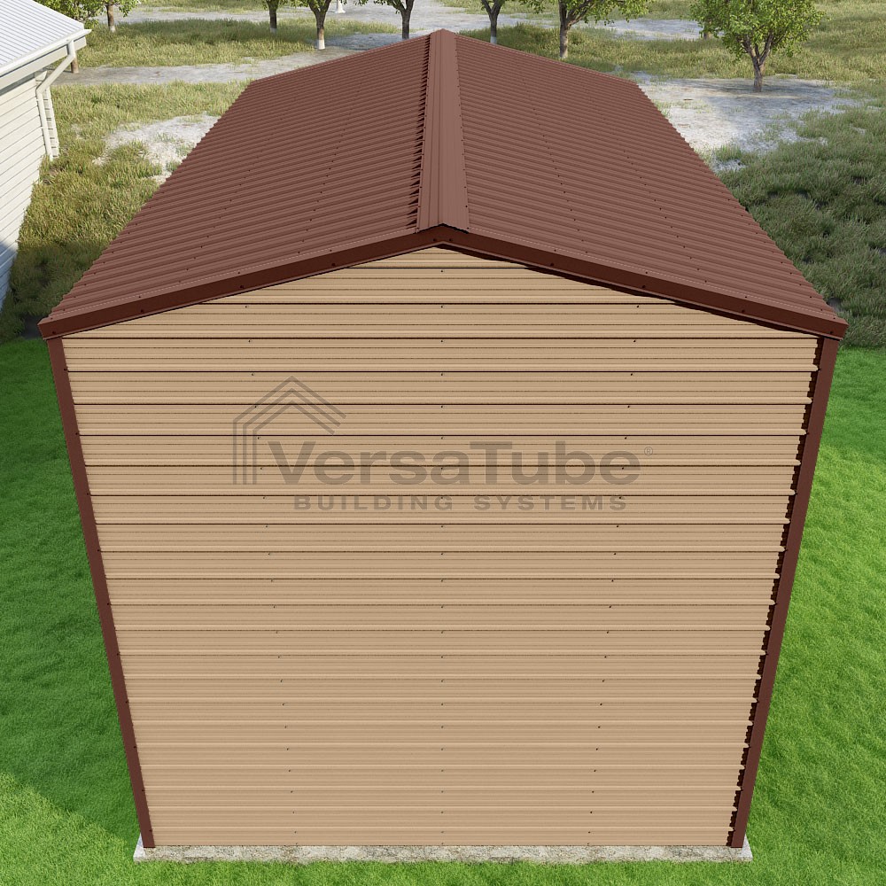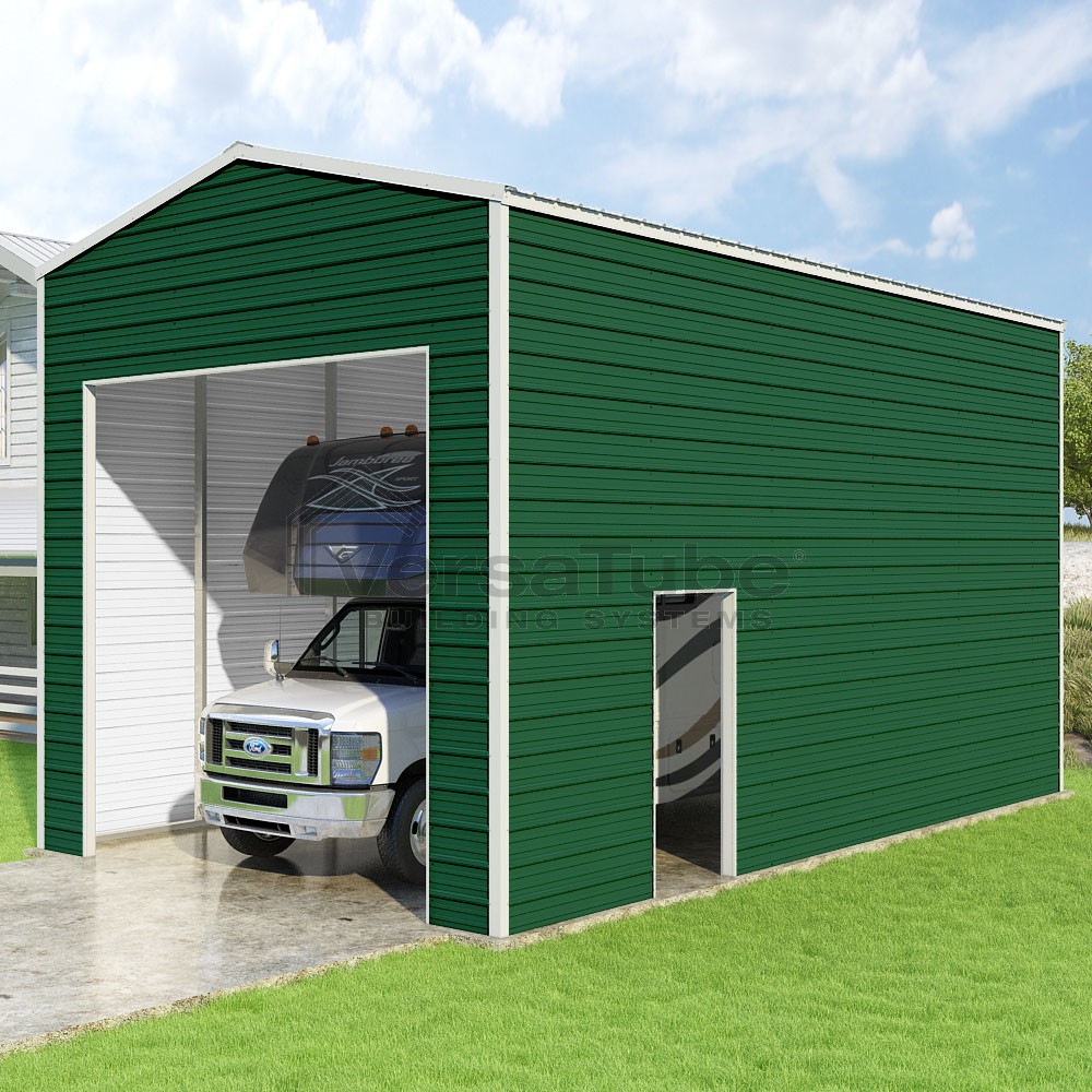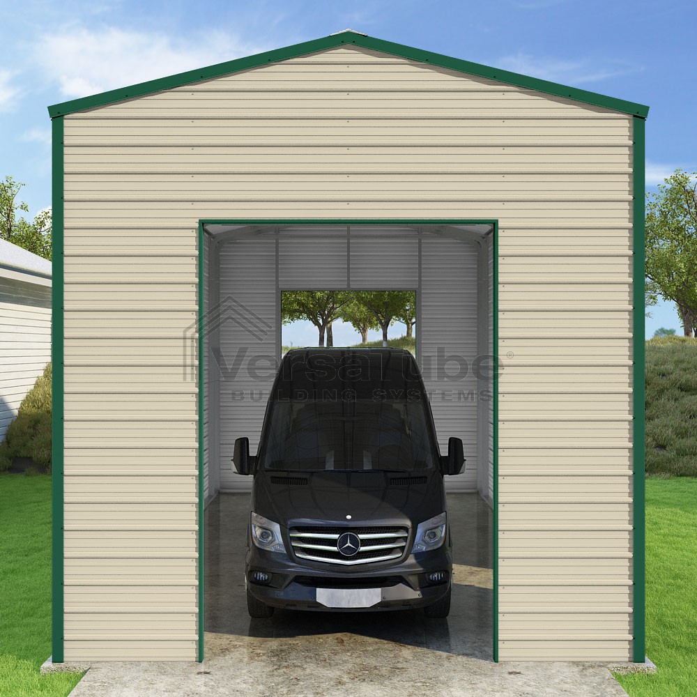 Frontier Series DIY garage kit features vertical sheet metal roof panels with horizontal siding panels..
