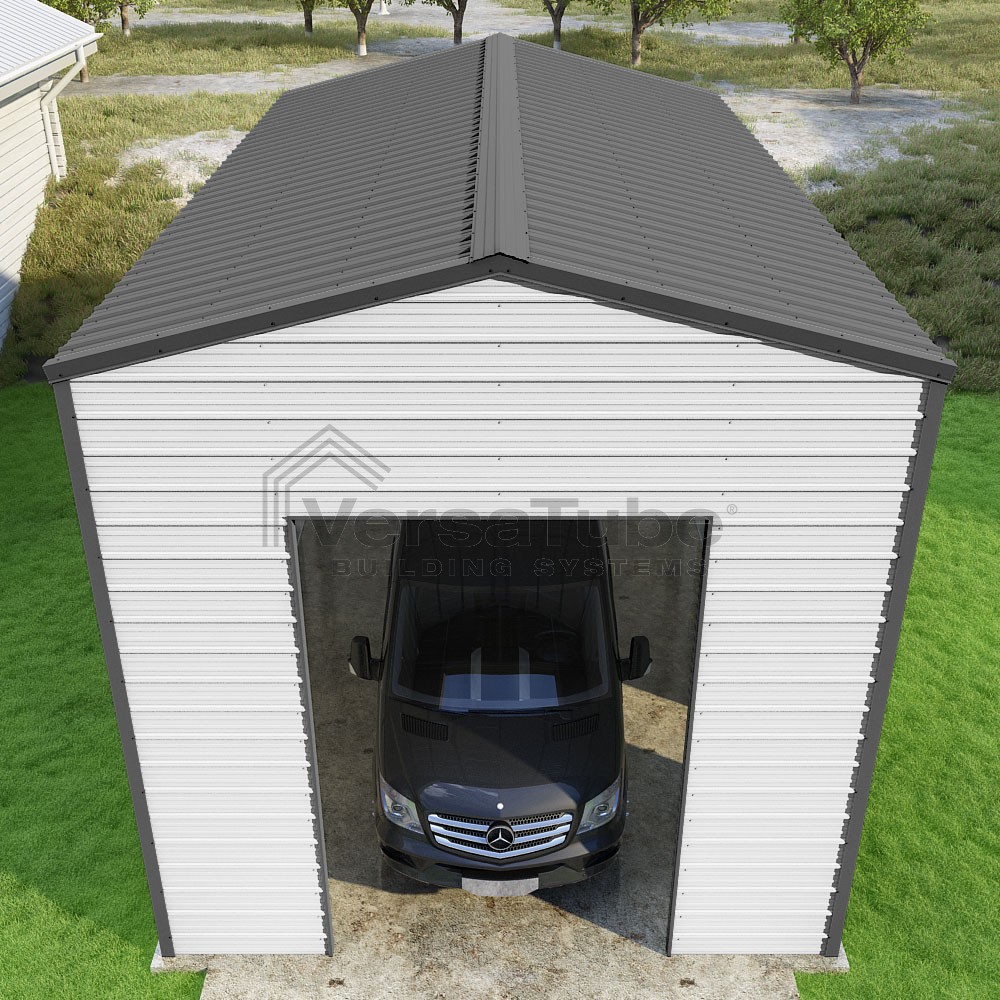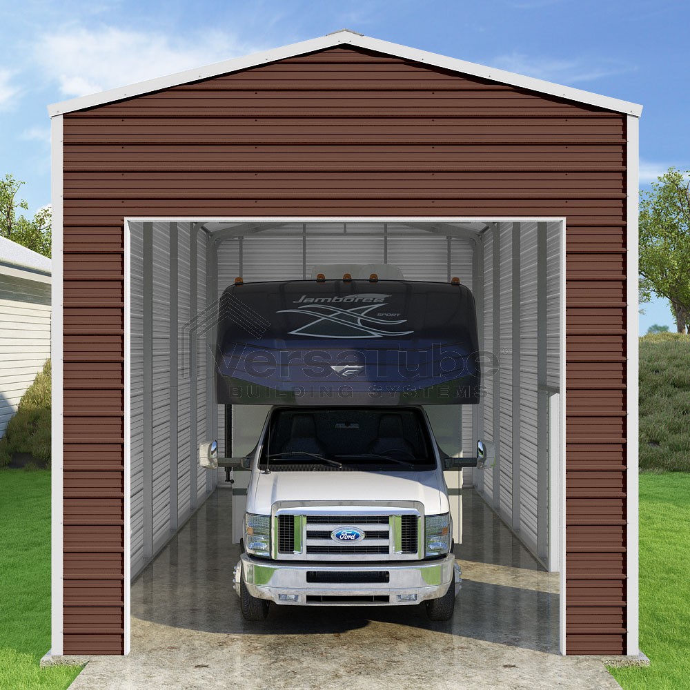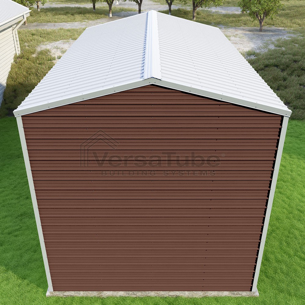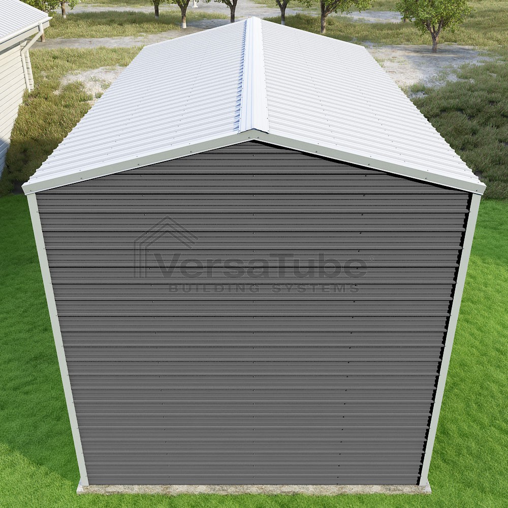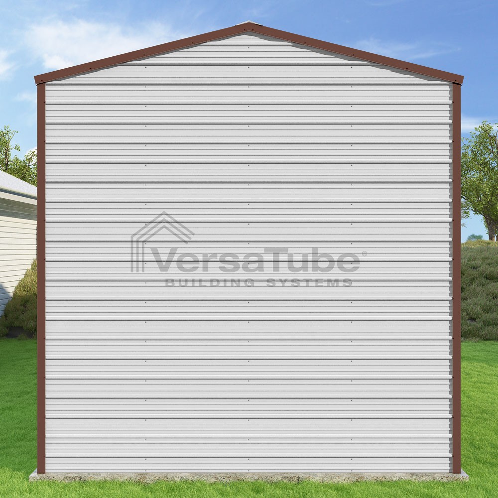 Frontier Series DIY garage kit features vertical sheet metal roof panels with horizontal siding panels..