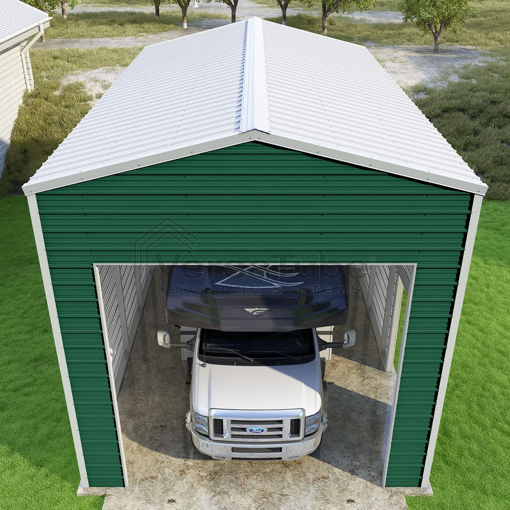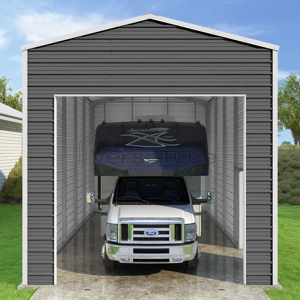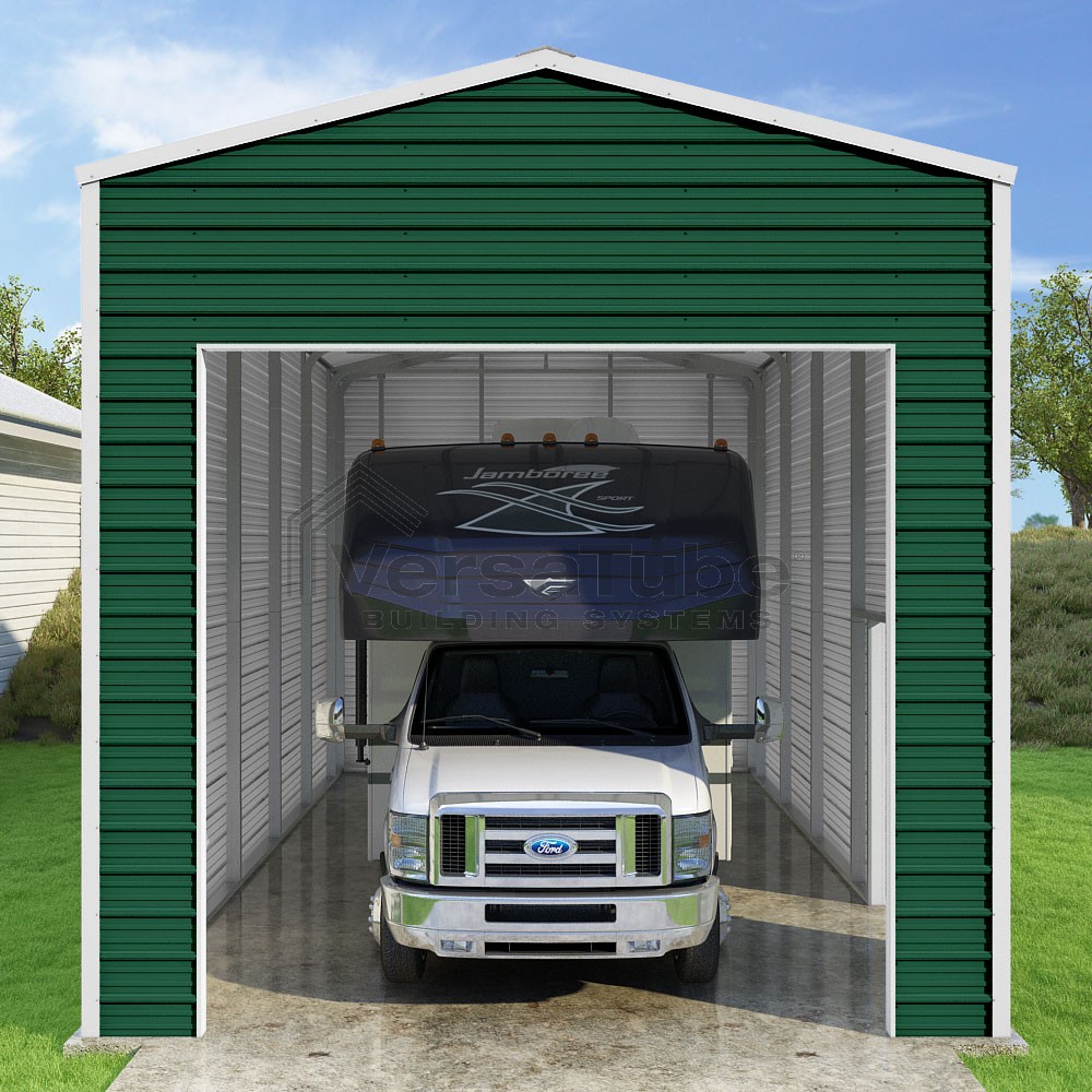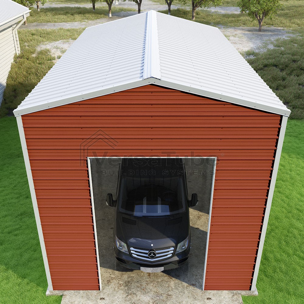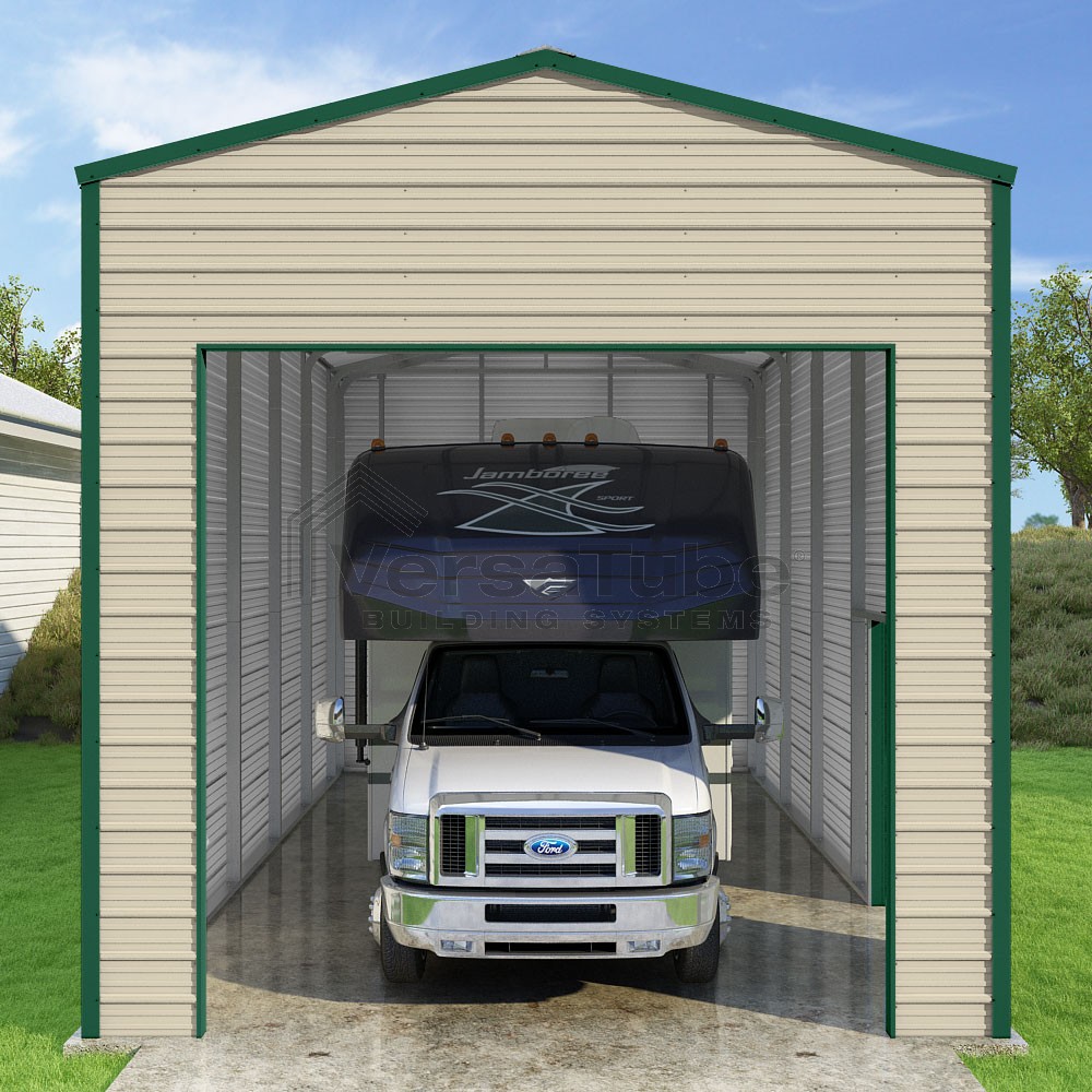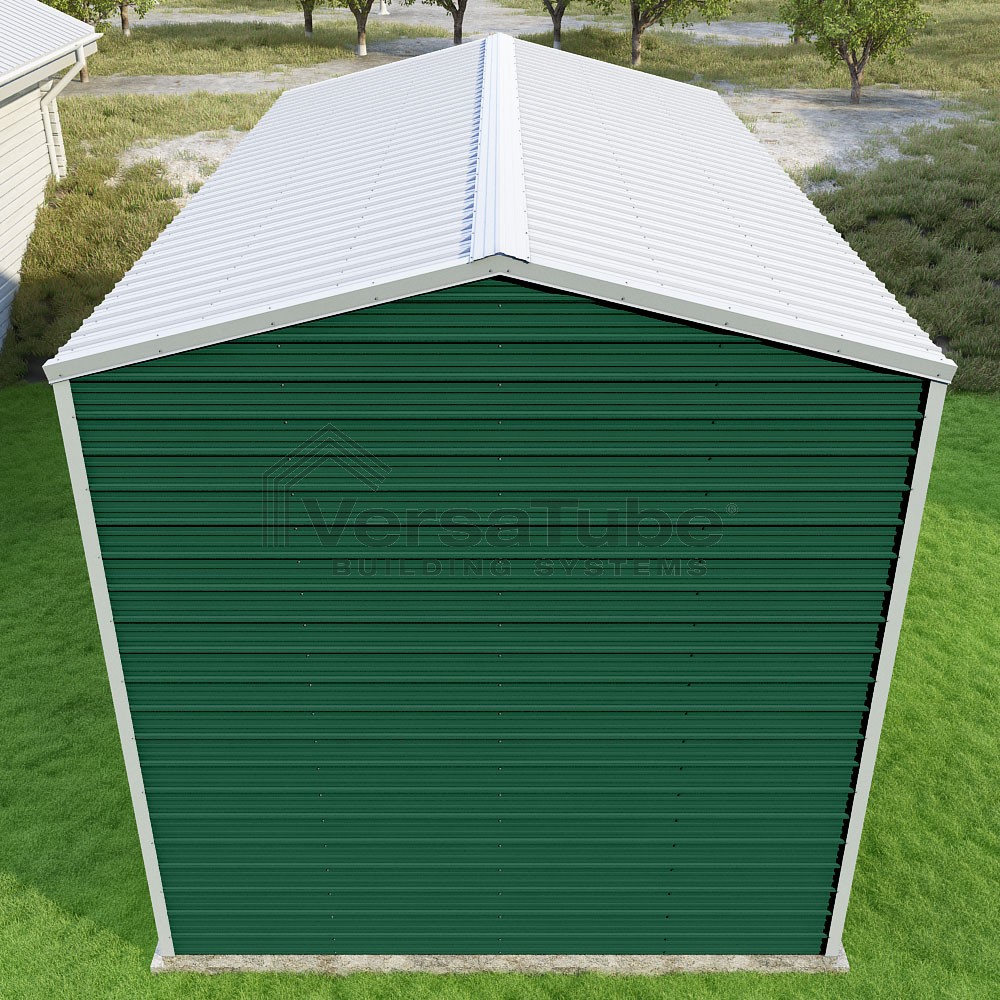 Frontier Series DIY garage kit features vertical sheet metal roof panels with horizontal siding panels..
