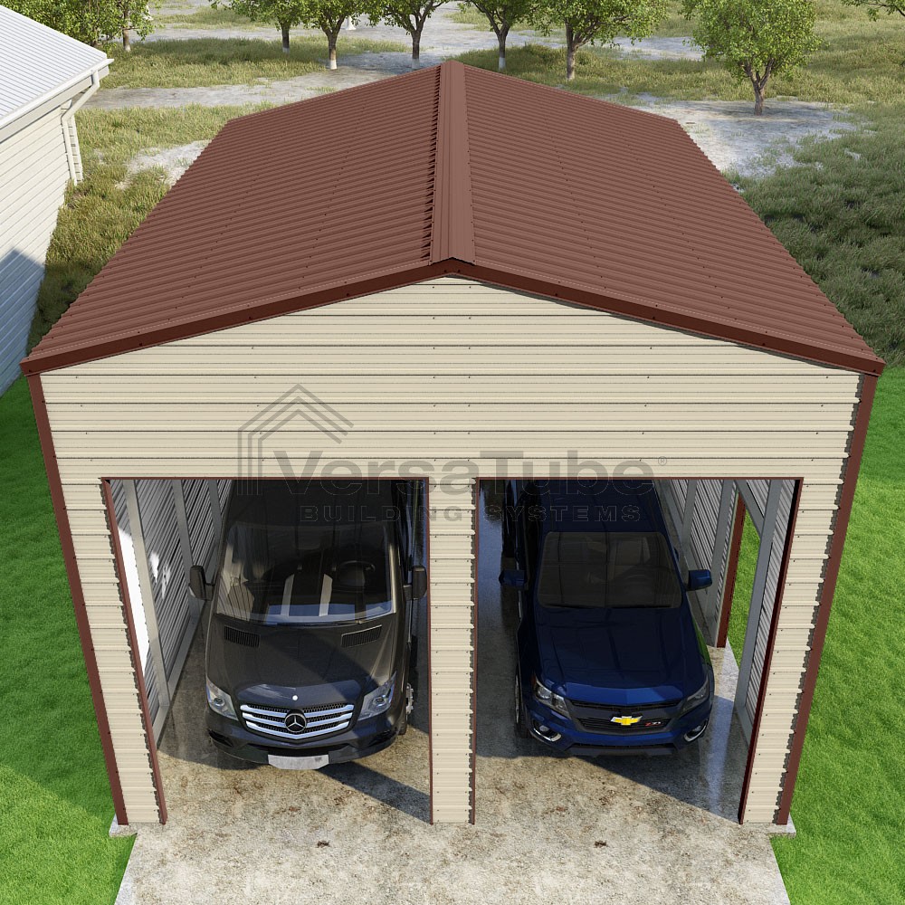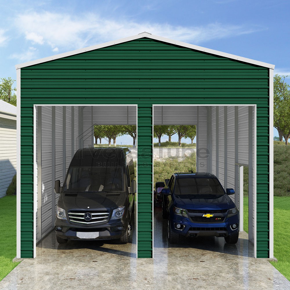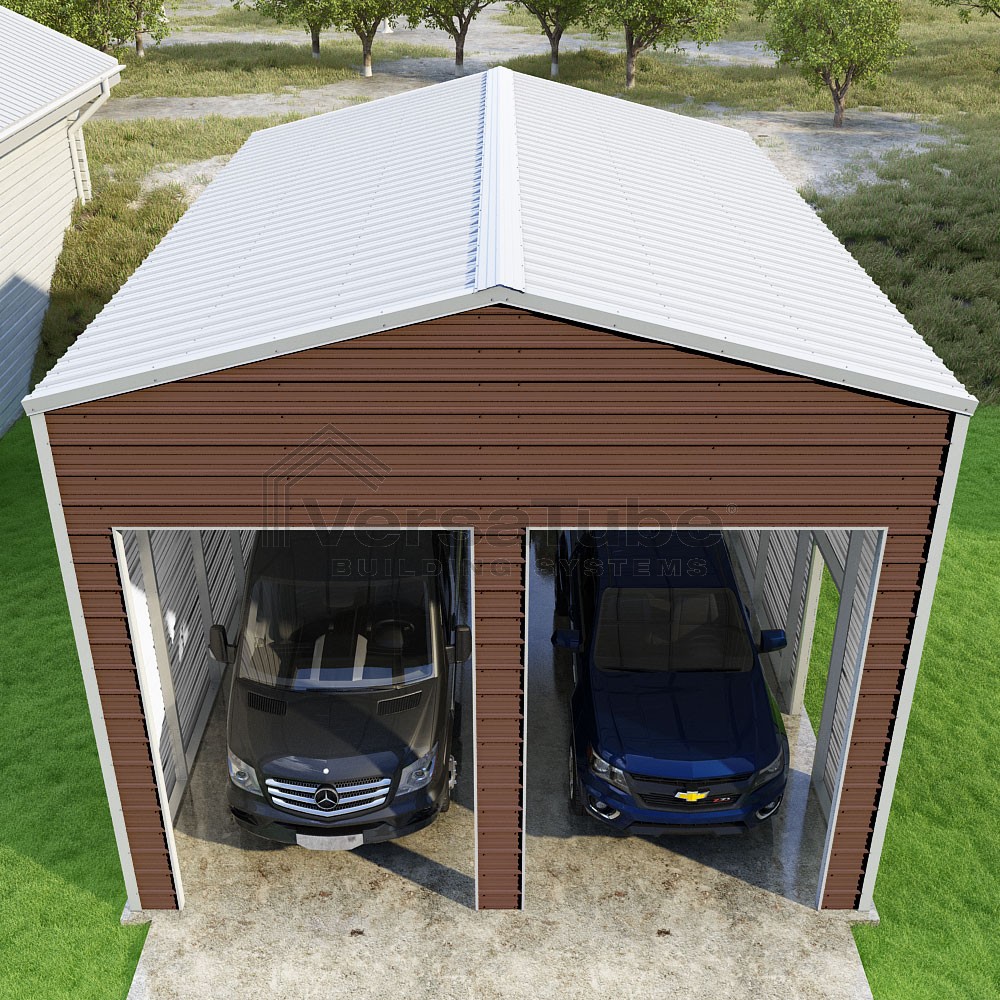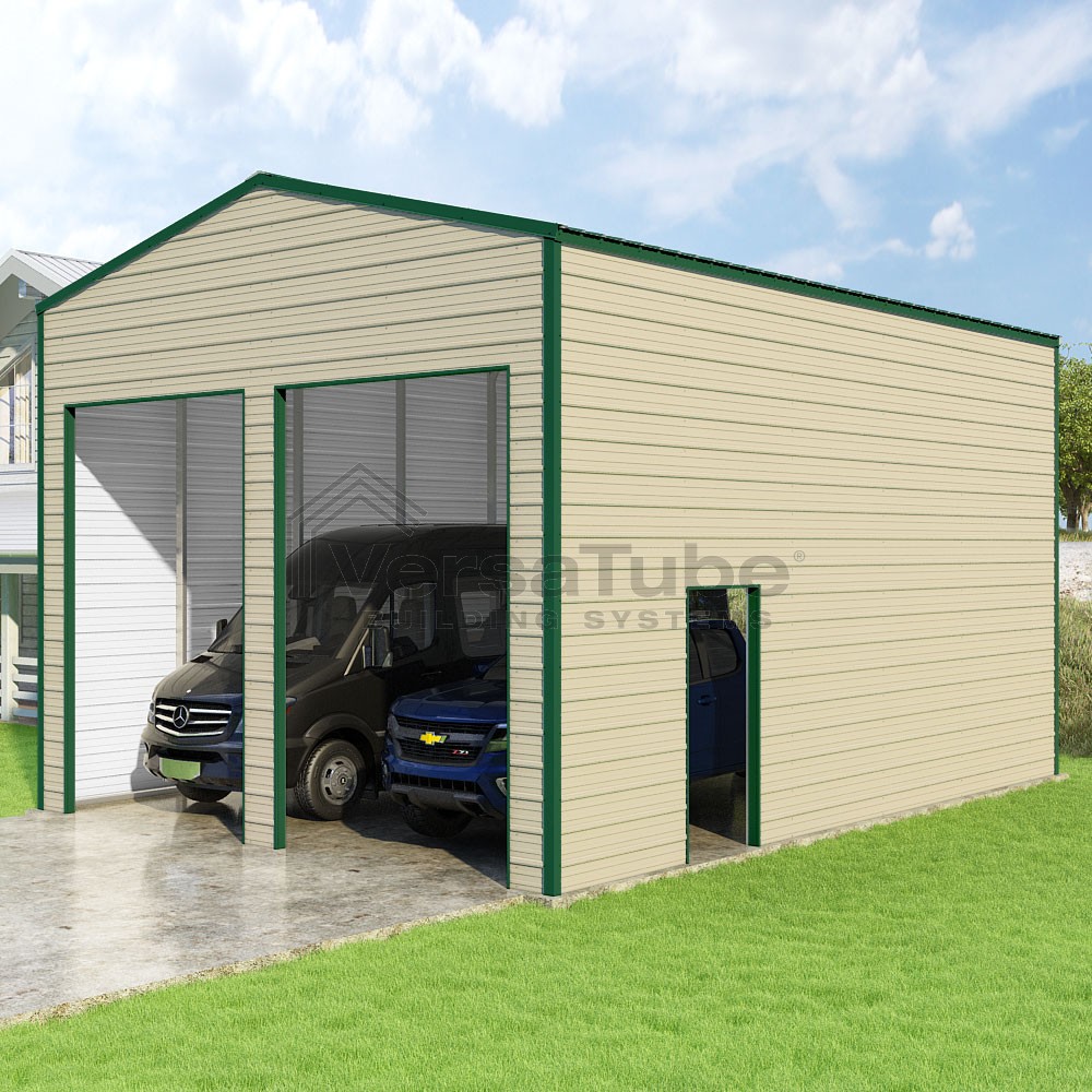 Frontier Series DIY garage kit features vertical sheet metal roof panels with horizontal siding panels..