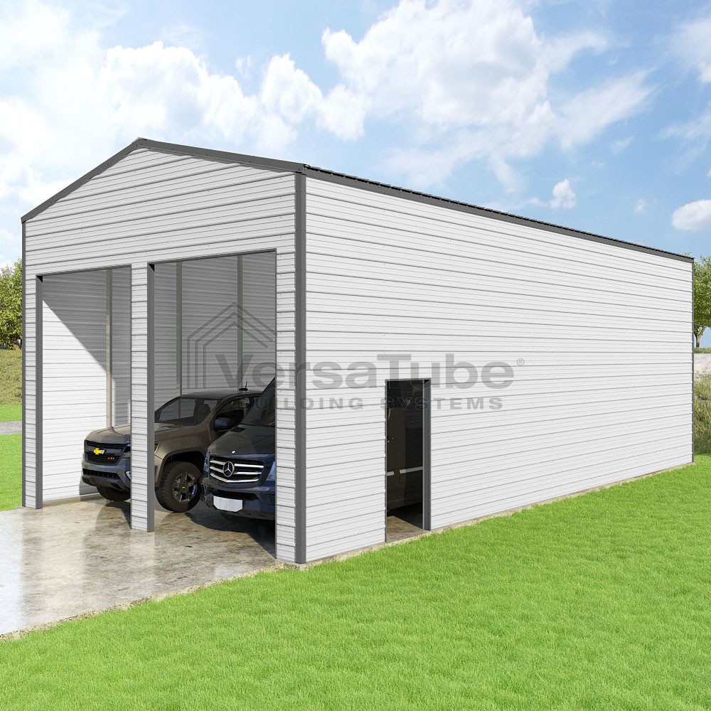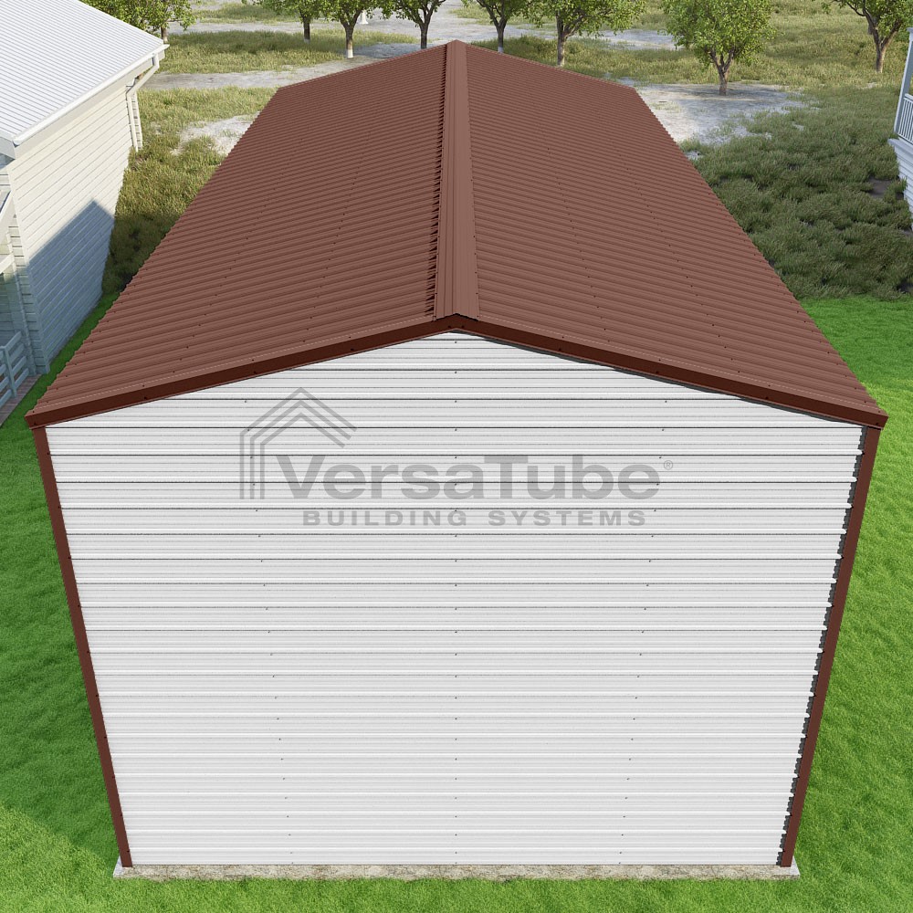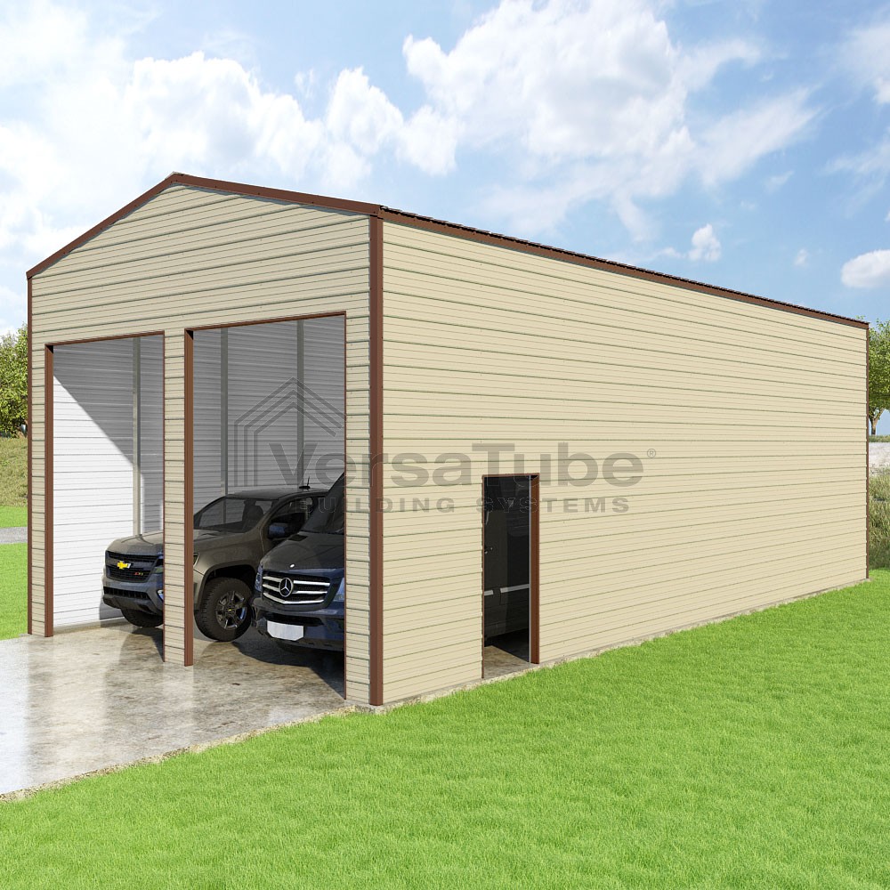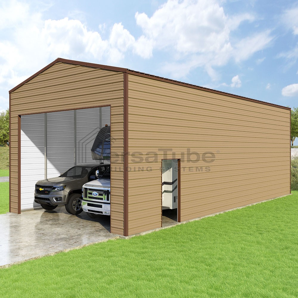 Frontier Series DIY garage kit features vertical sheet metal roof panels with horizontal siding panels..
