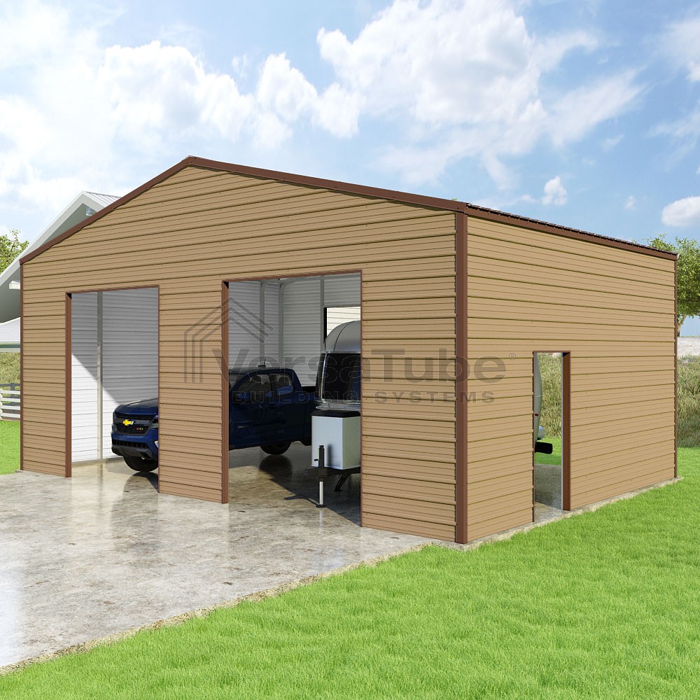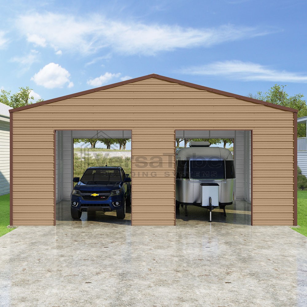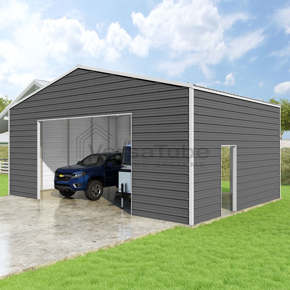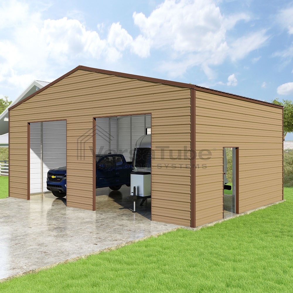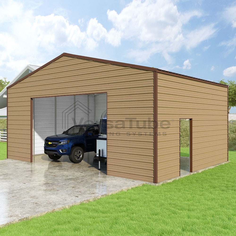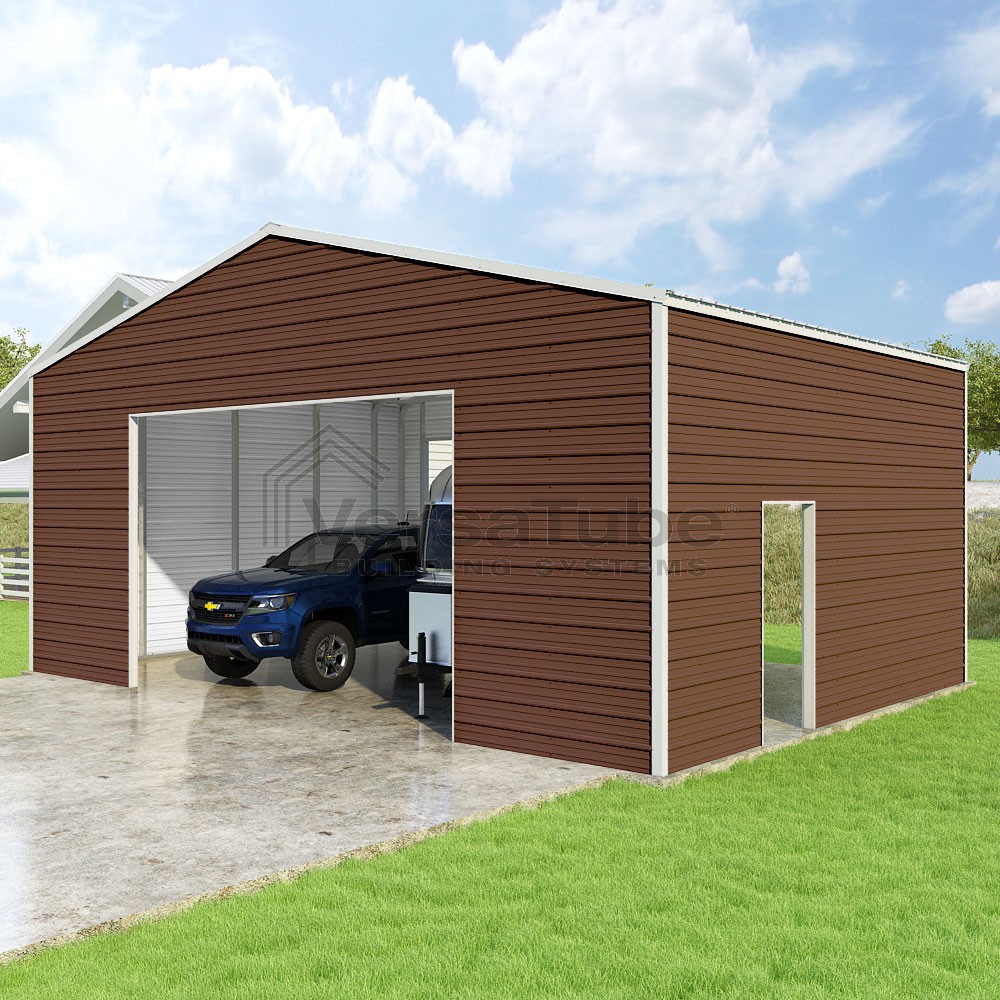 Frontier Series DIY garage kit features vertical sheet metal roof panels with horizontal siding panels..