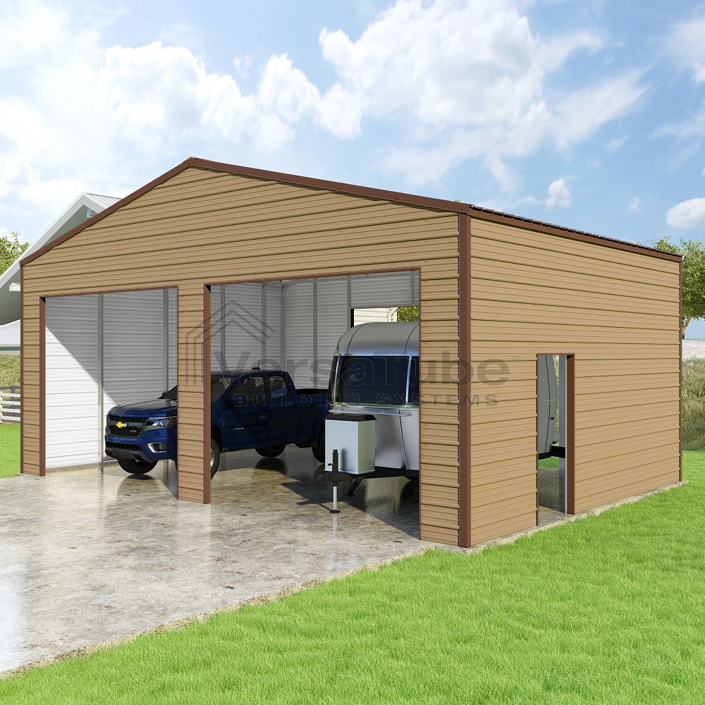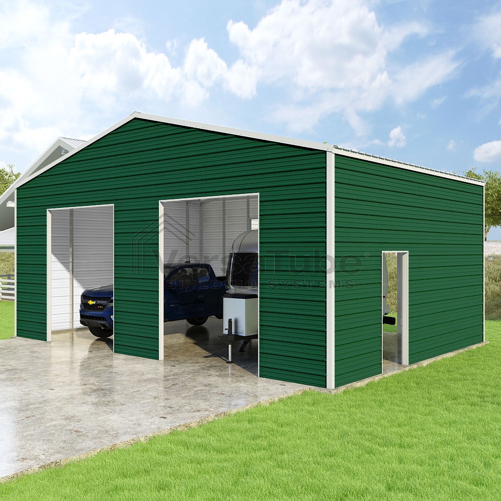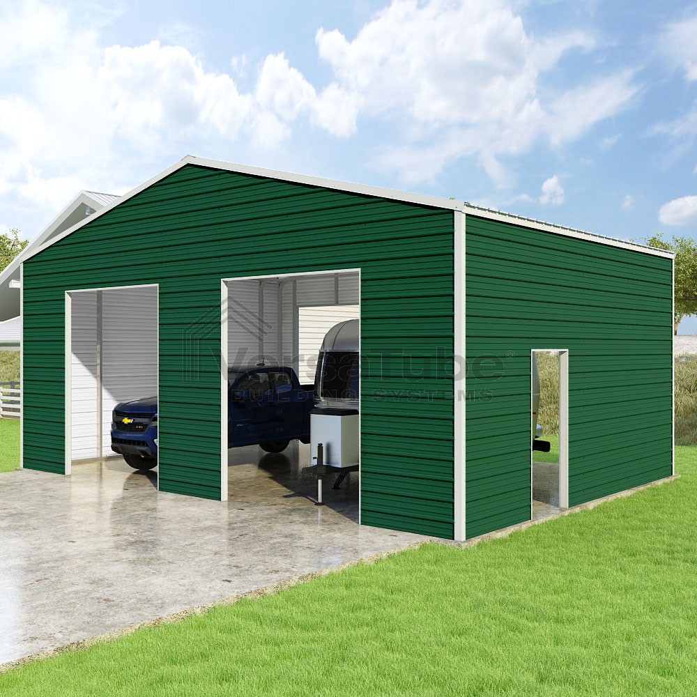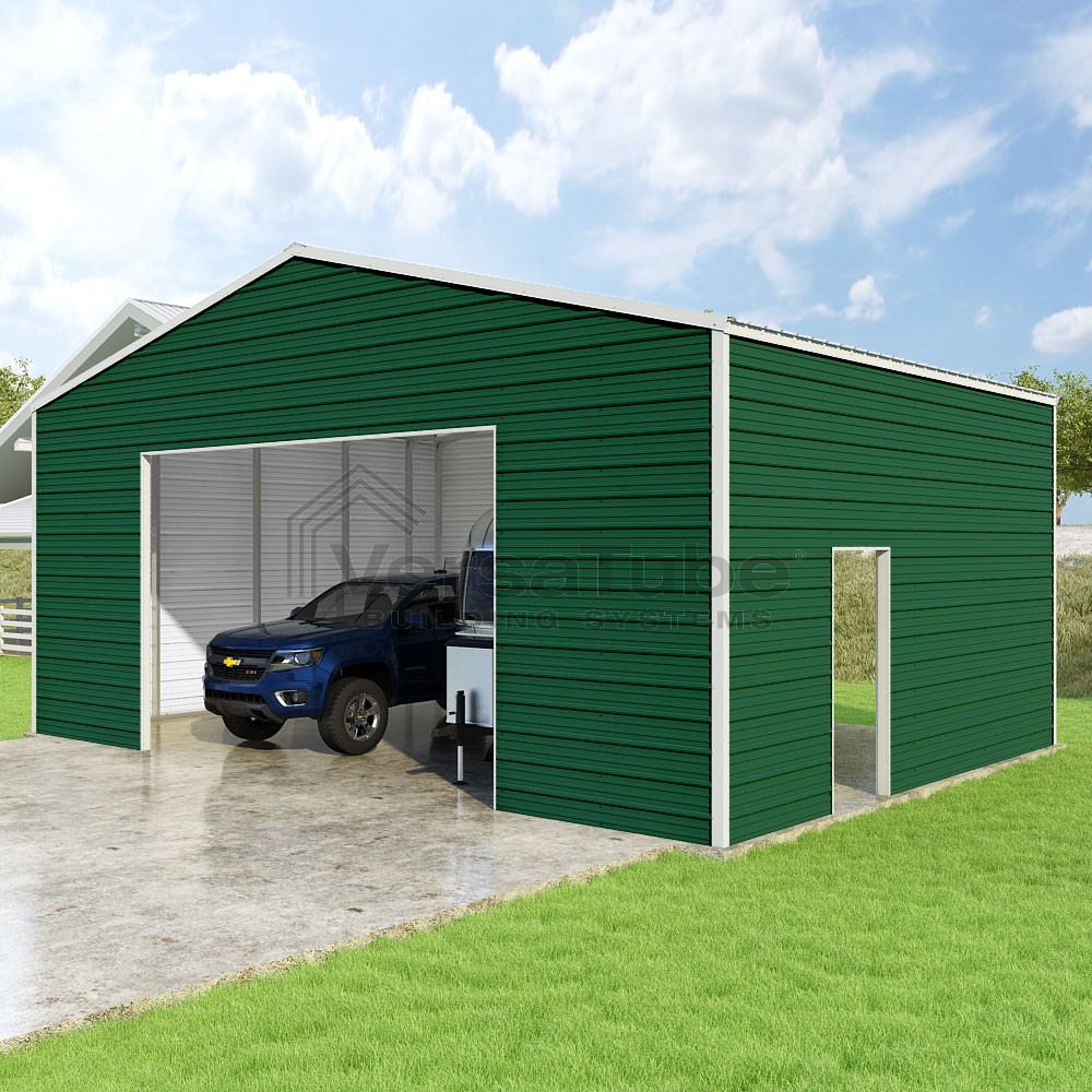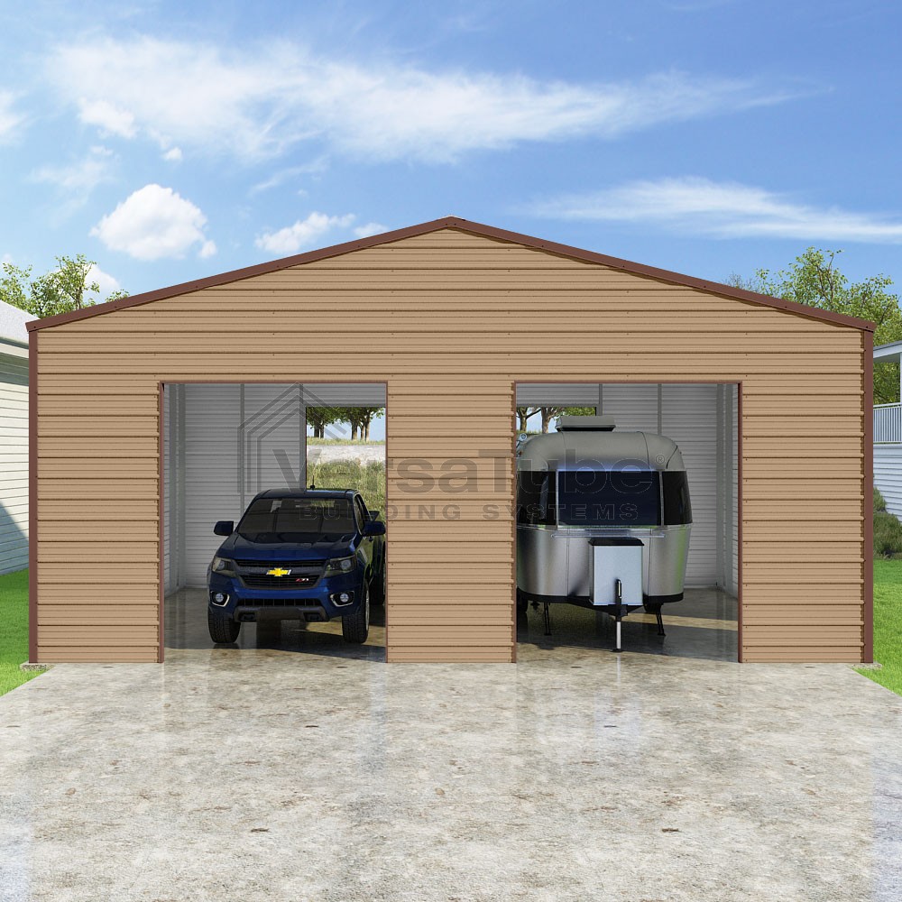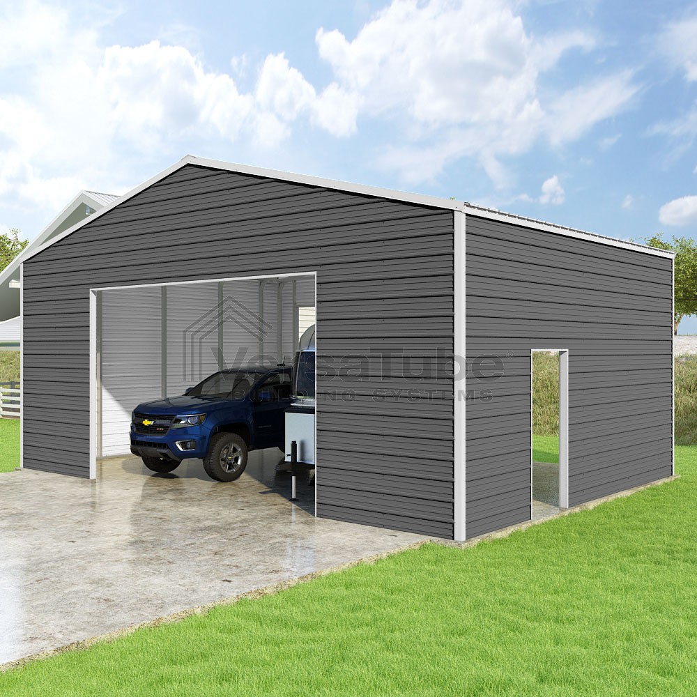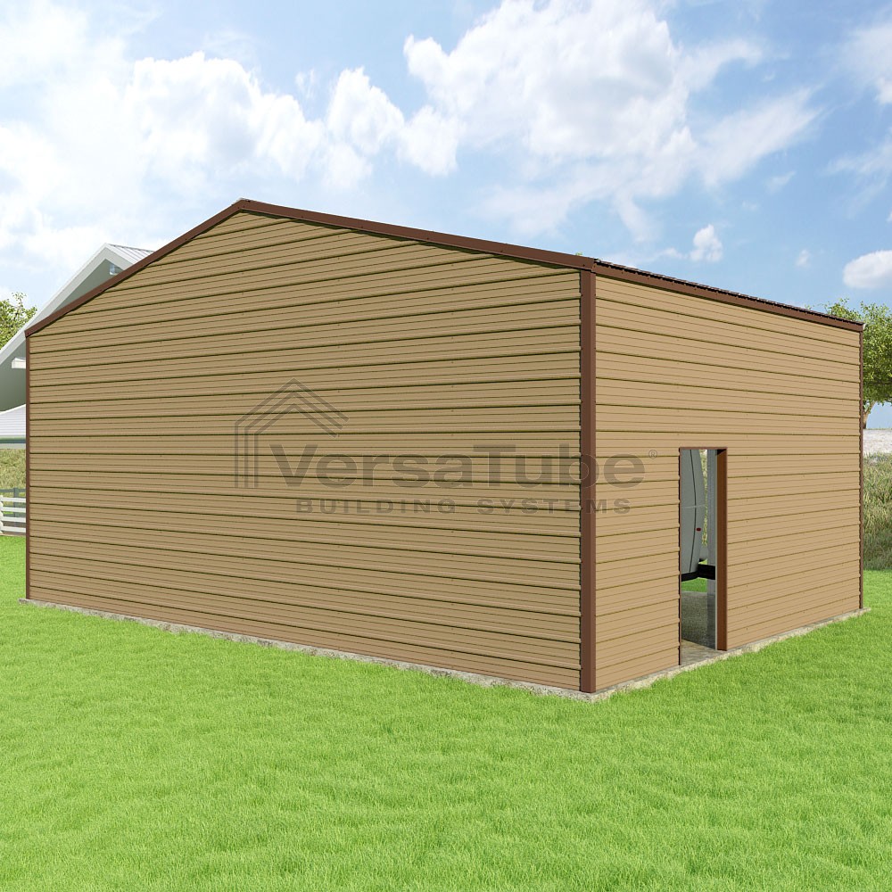 Frontier Series DIY garage kit features vertical sheet metal roof panels with horizontal siding panels..