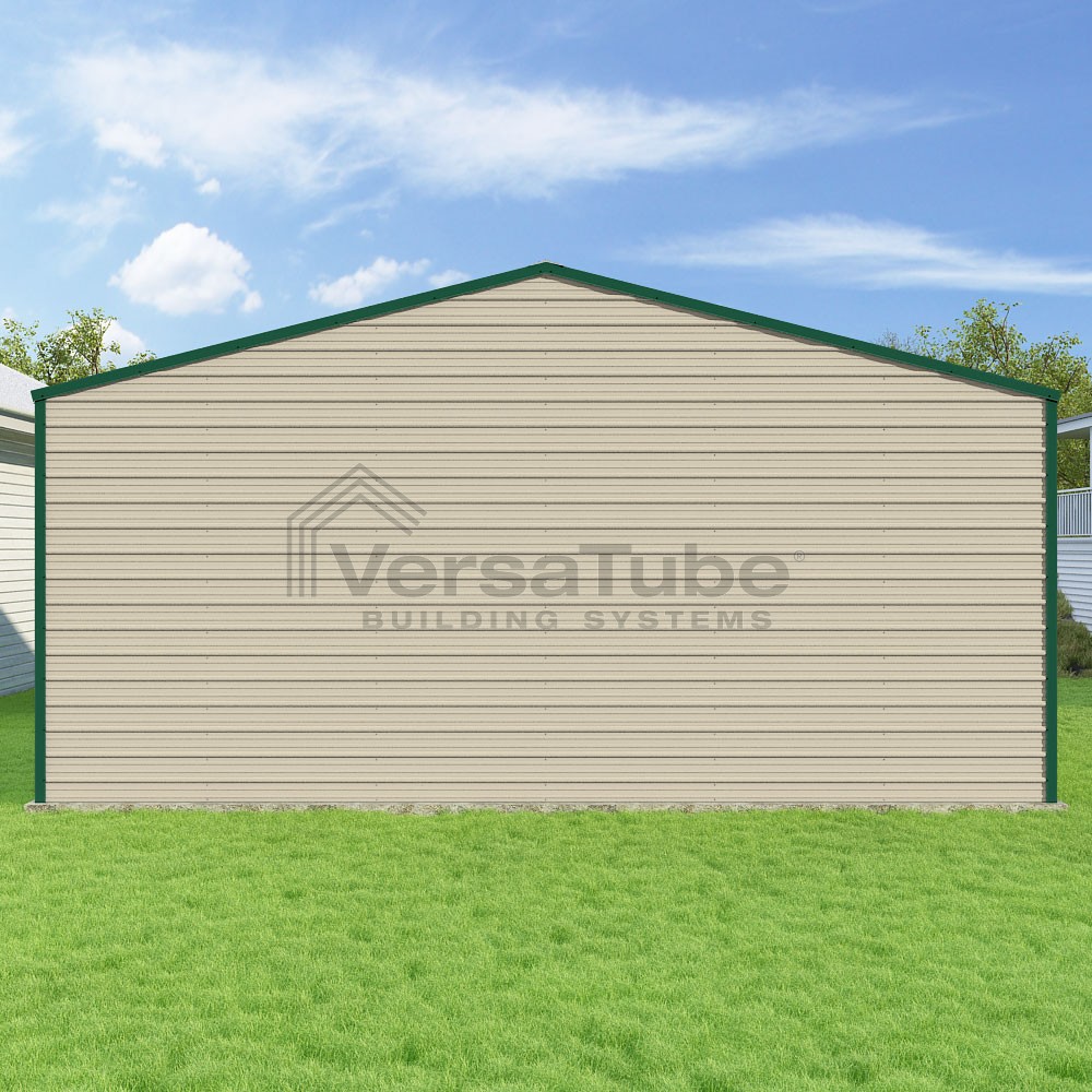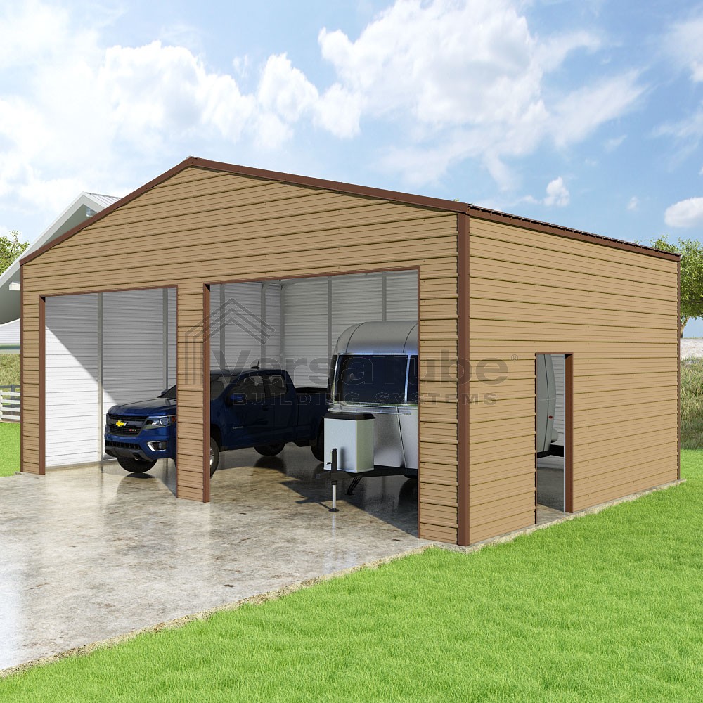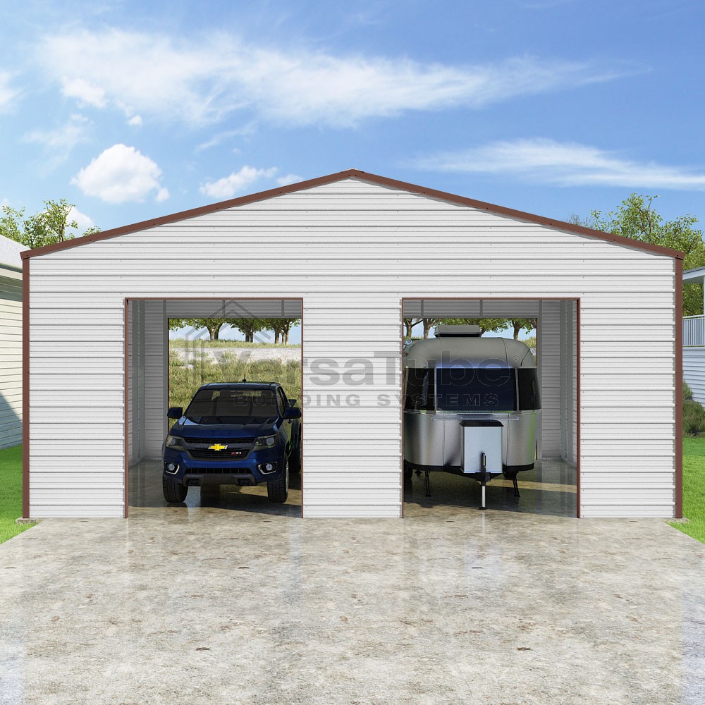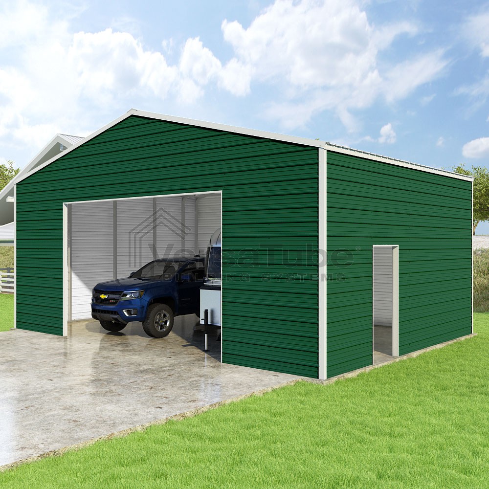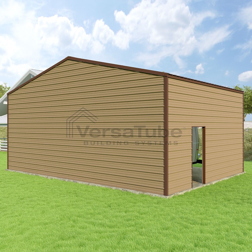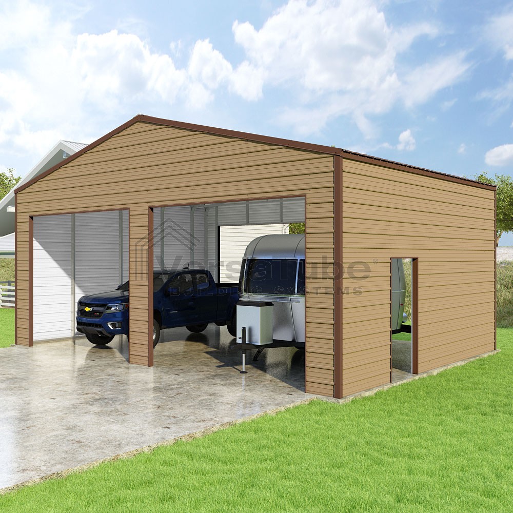 Frontier Series DIY garage kit features vertical sheet metal roof panels with horizontal siding panels..