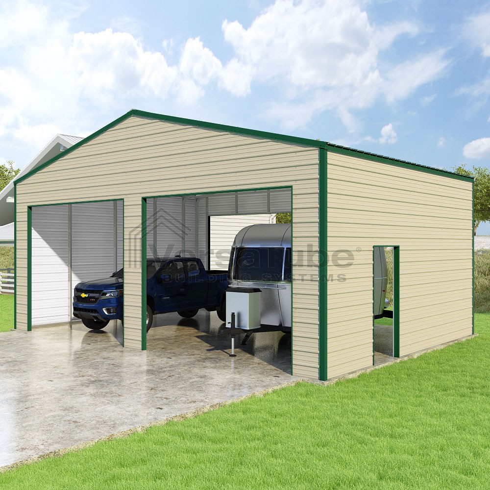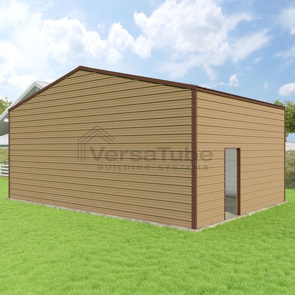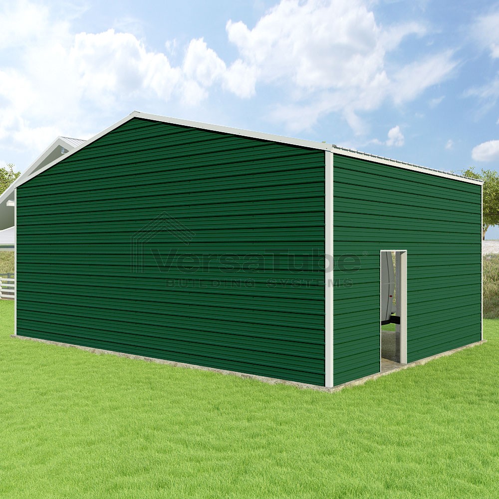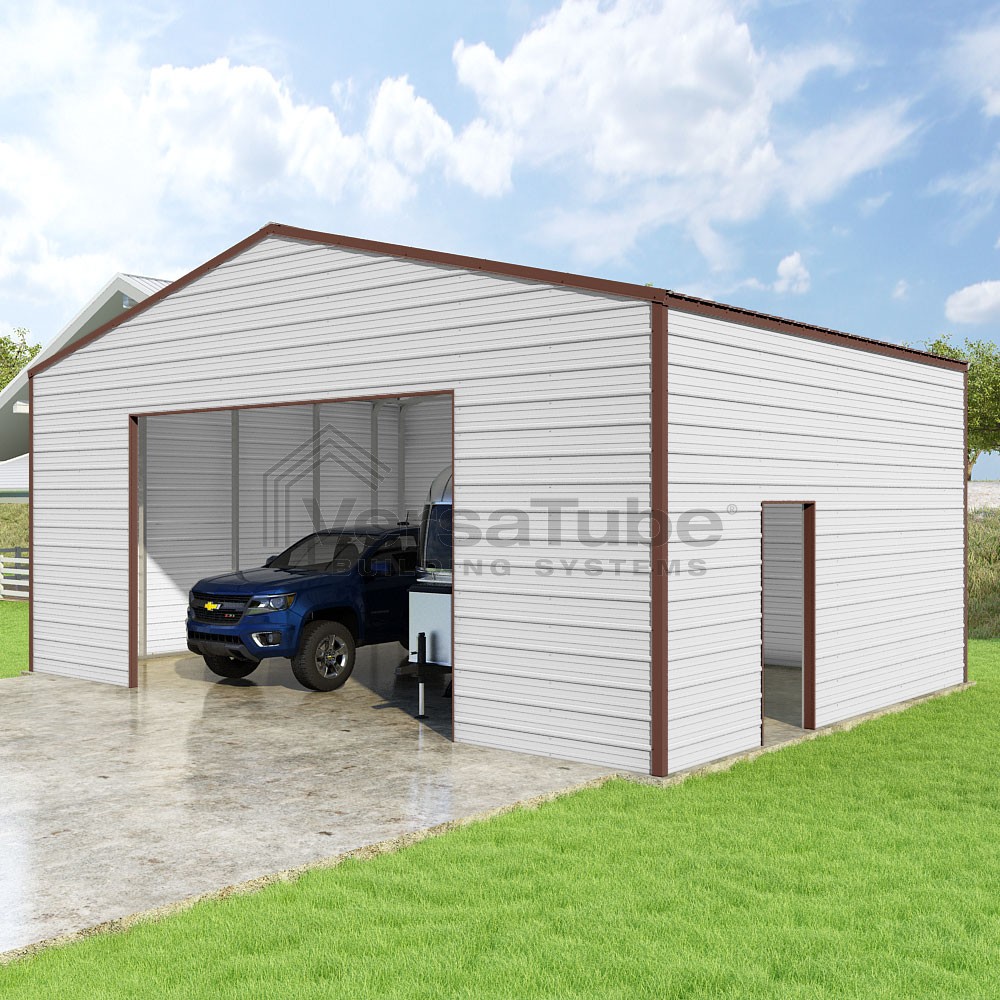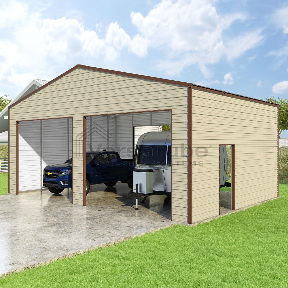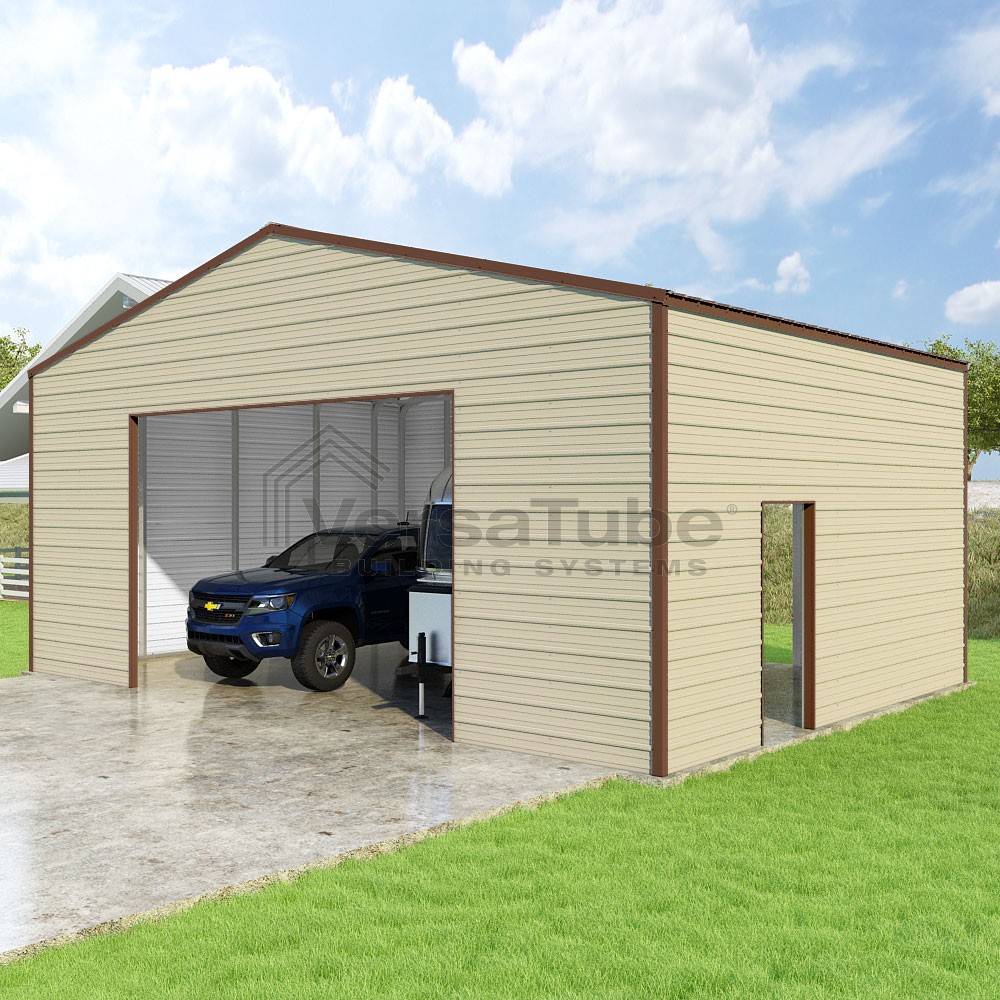 Frontier Series DIY garage kit features vertical sheet metal roof panels with horizontal siding panels..