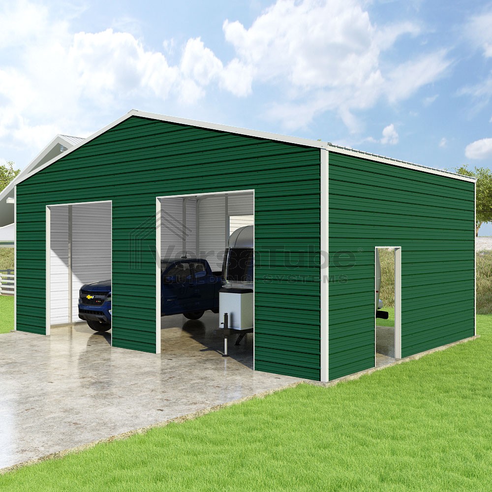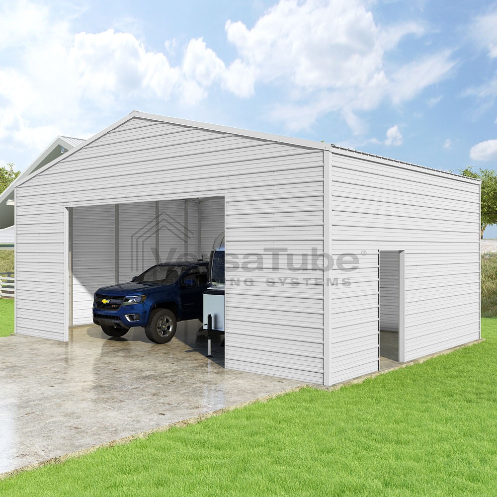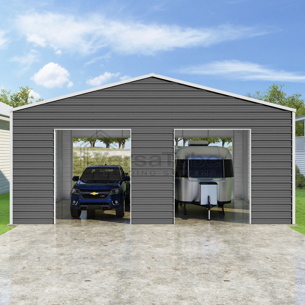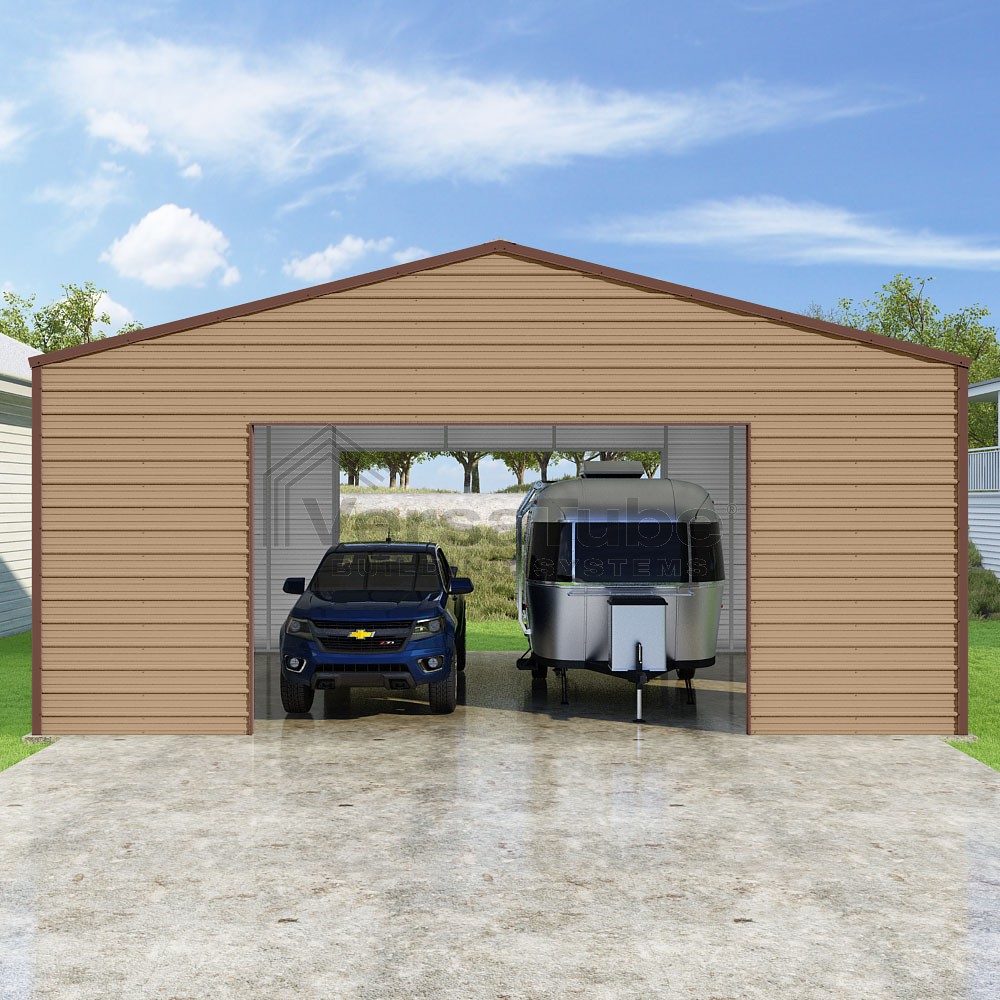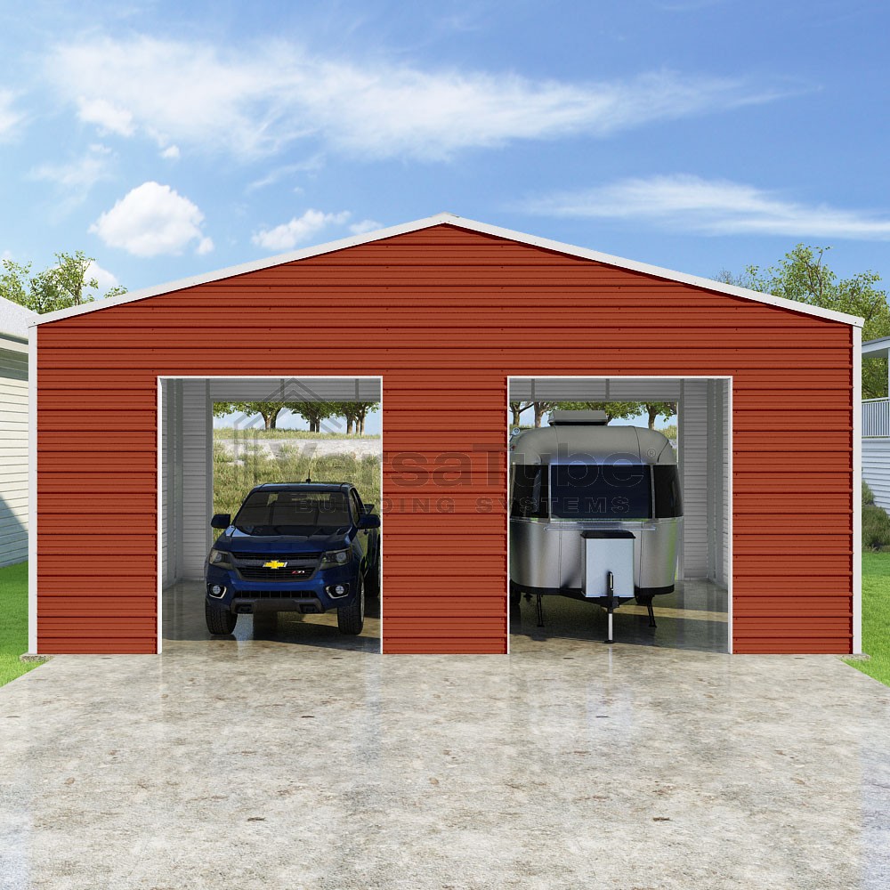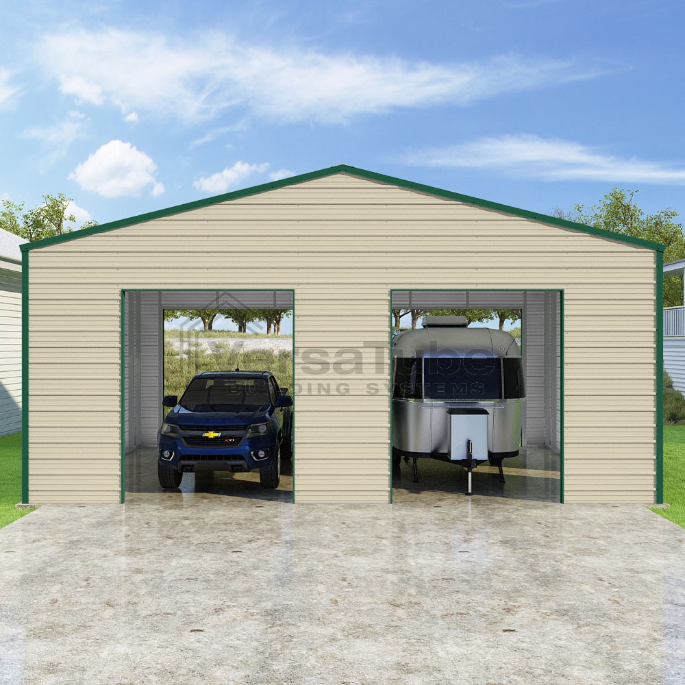Frontier Series DIY garage kit features vertical sheet metal roof panels with horizontal siding panels..