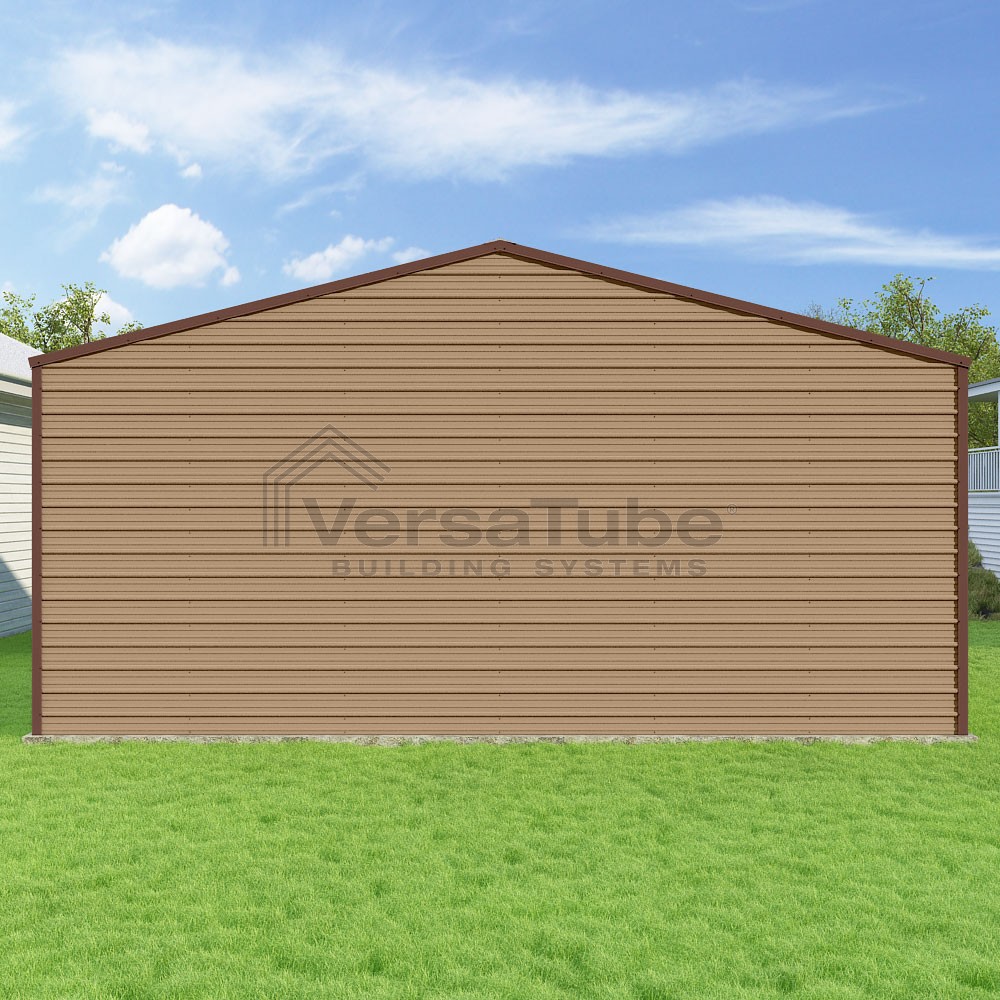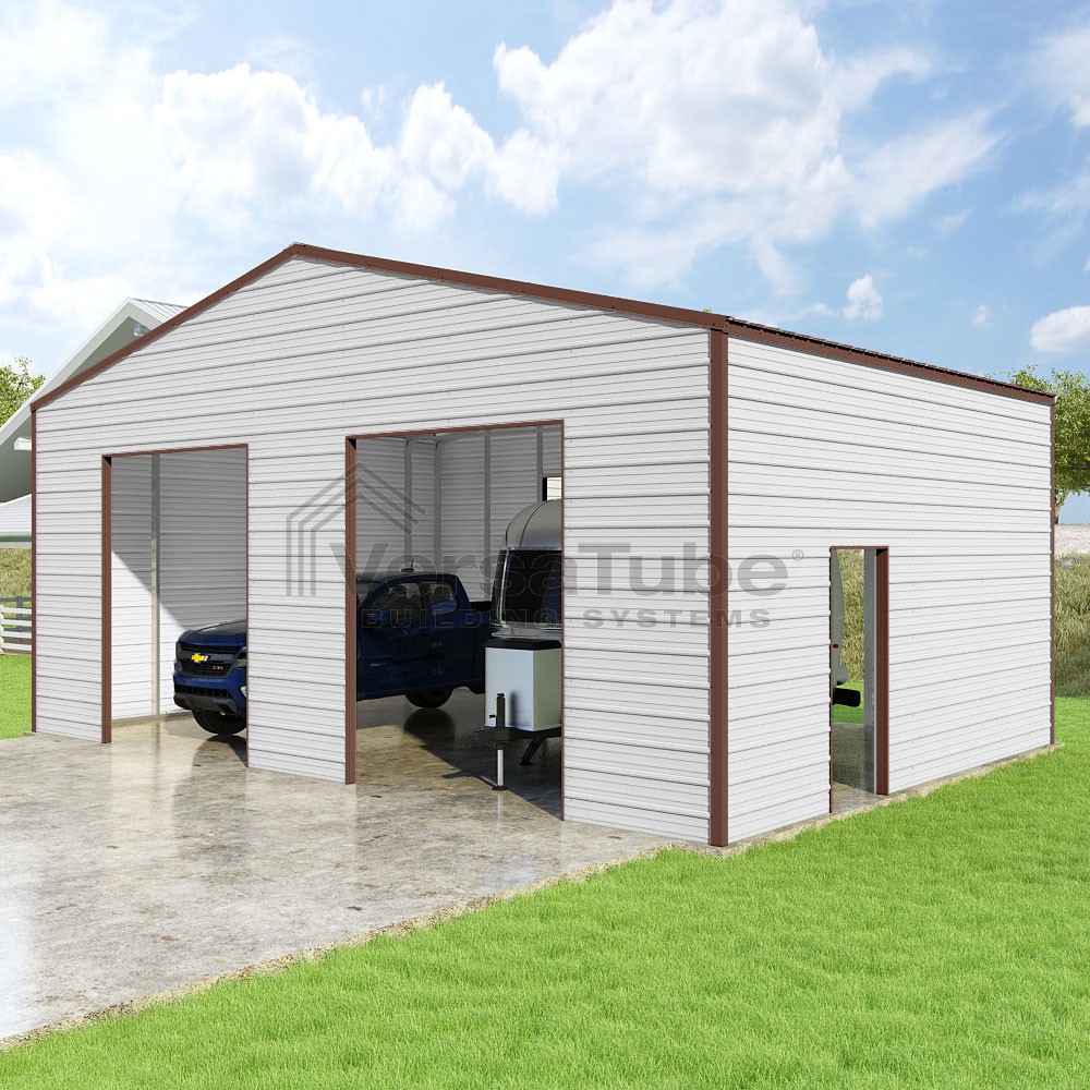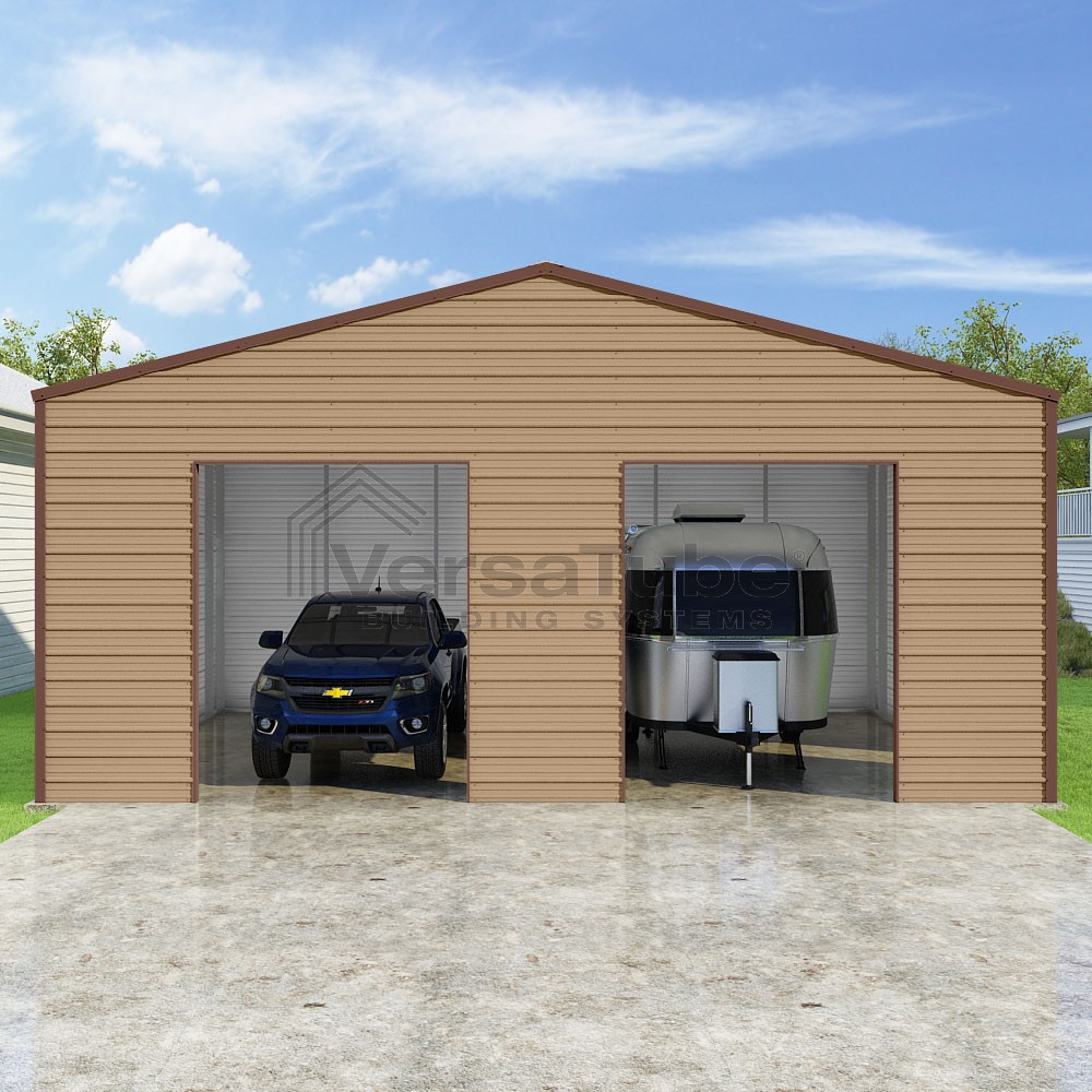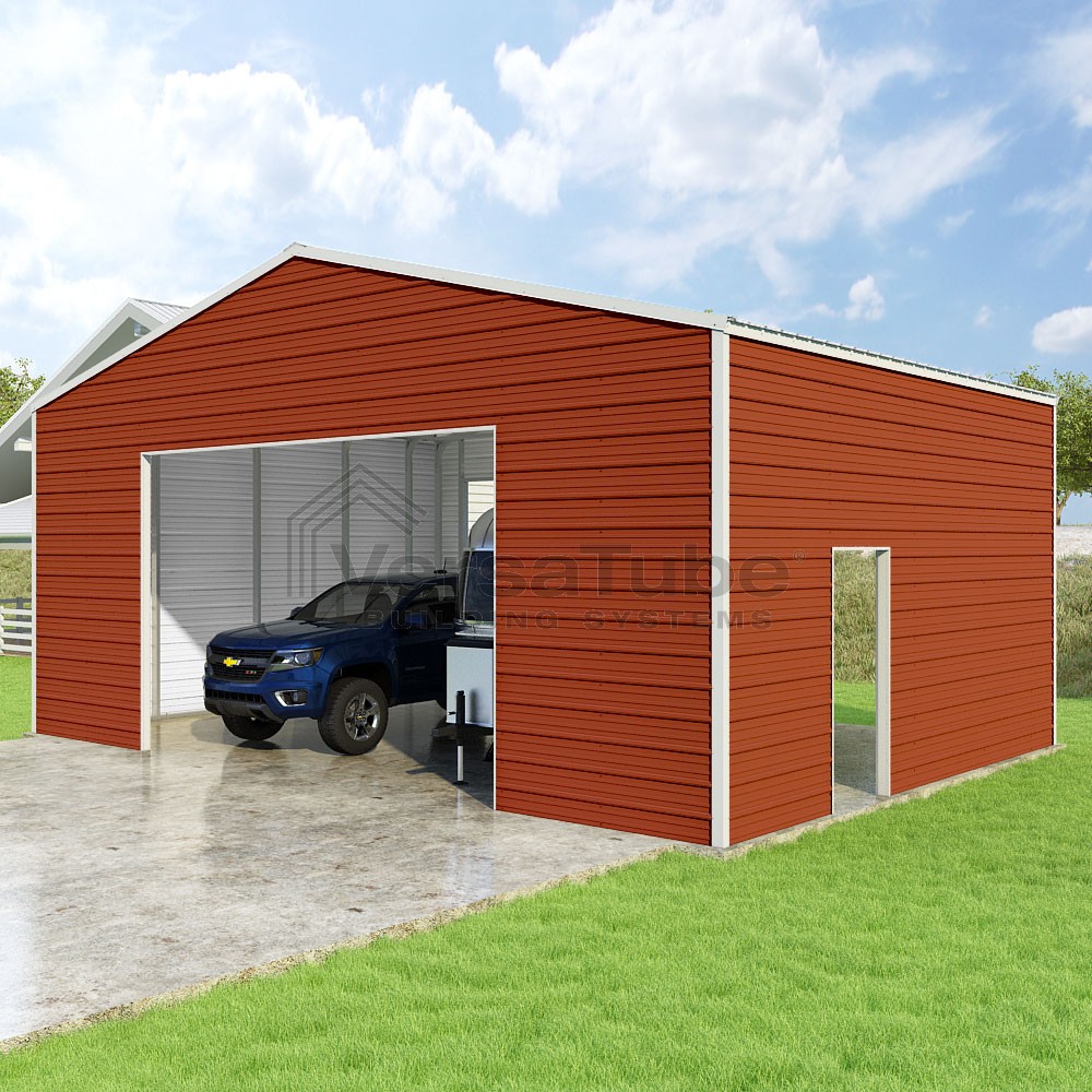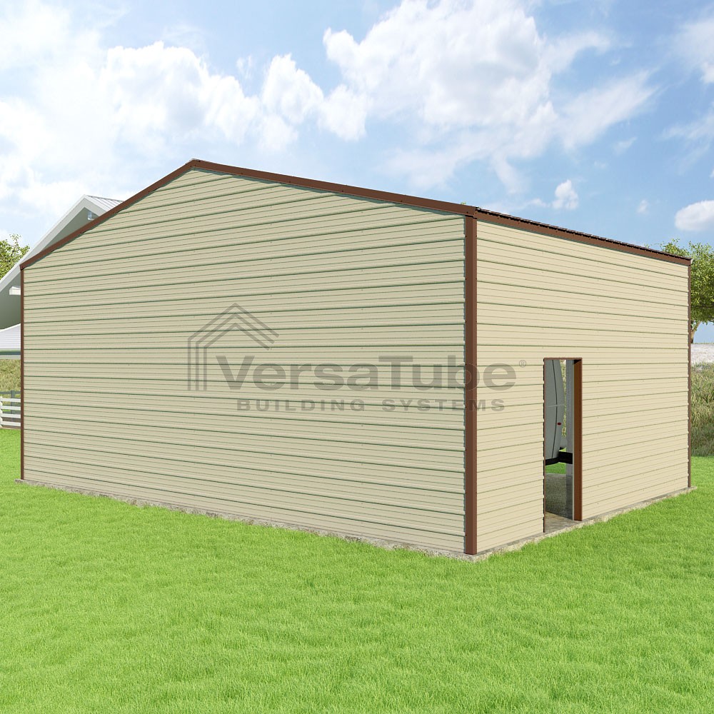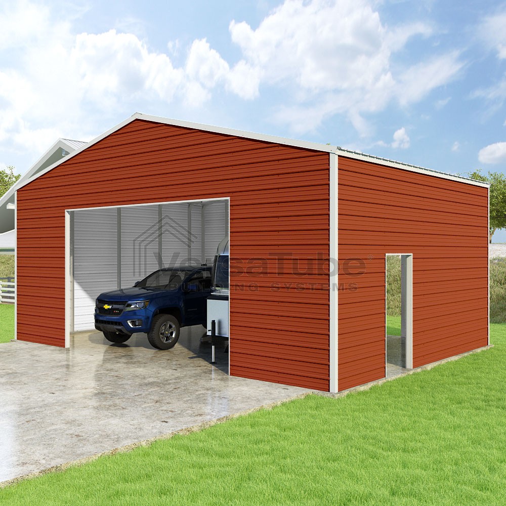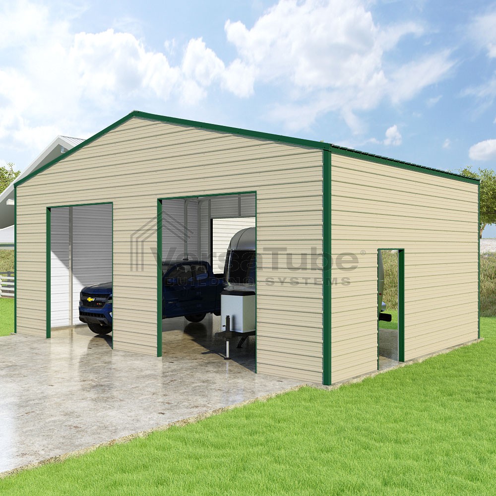 Frontier Series DIY garage kit features vertical sheet metal roof panels with horizontal siding panels..