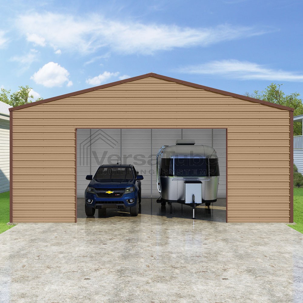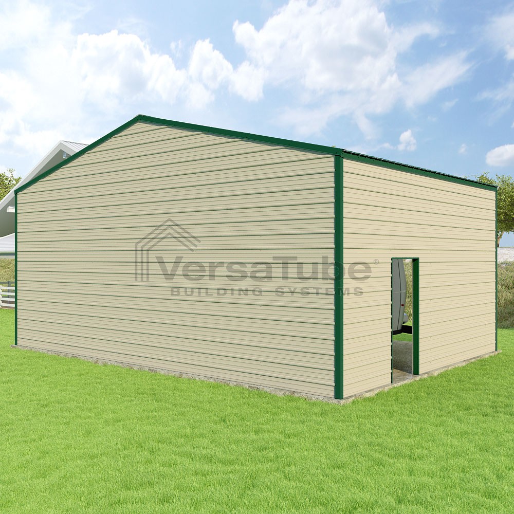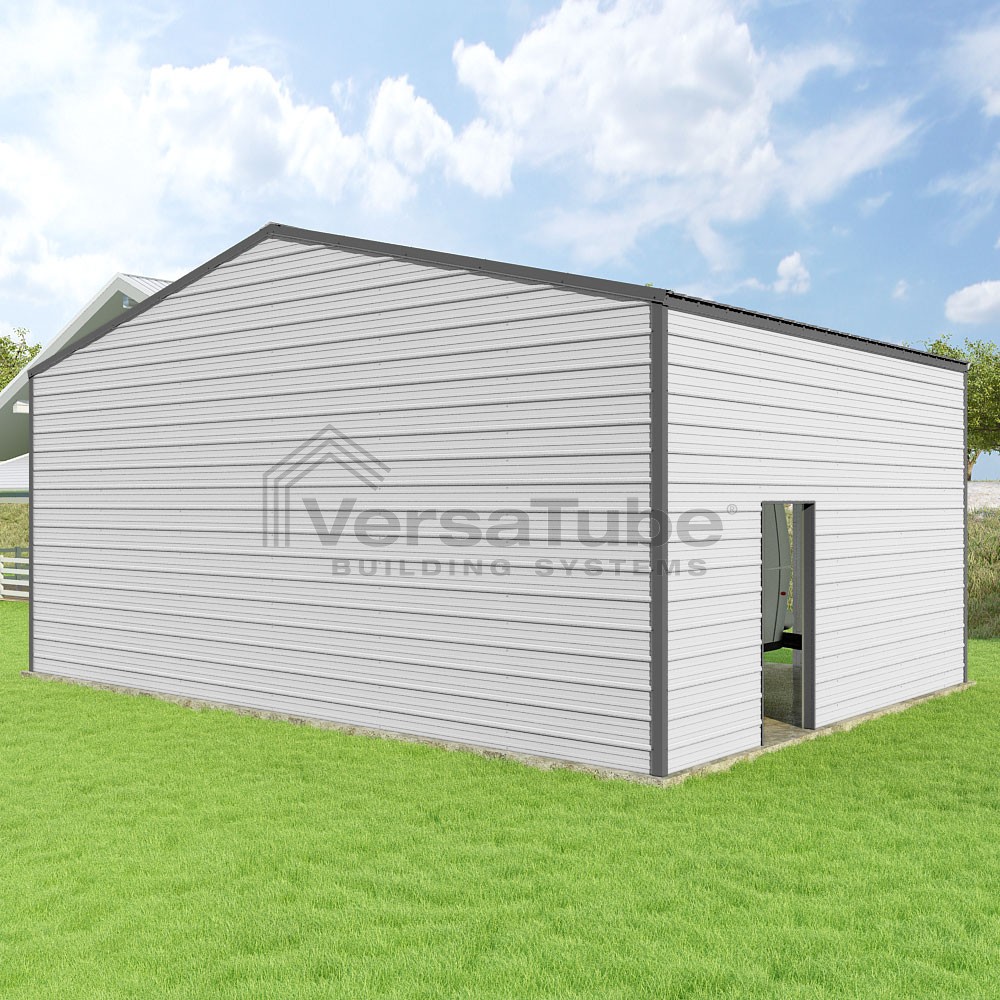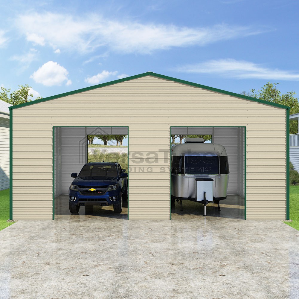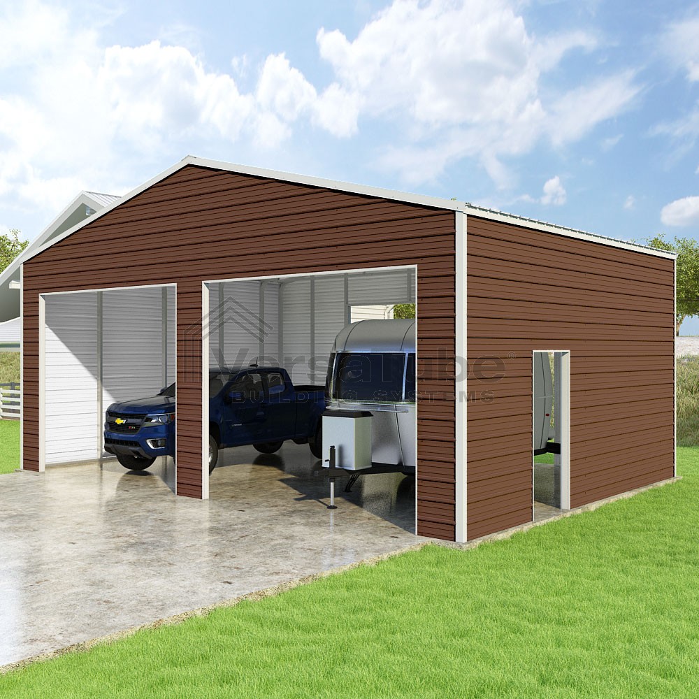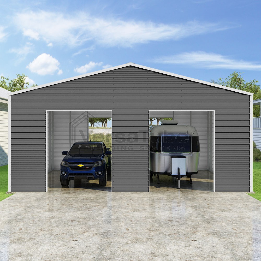 Frontier Series DIY garage kit features vertical sheet metal roof panels with horizontal siding panels..
