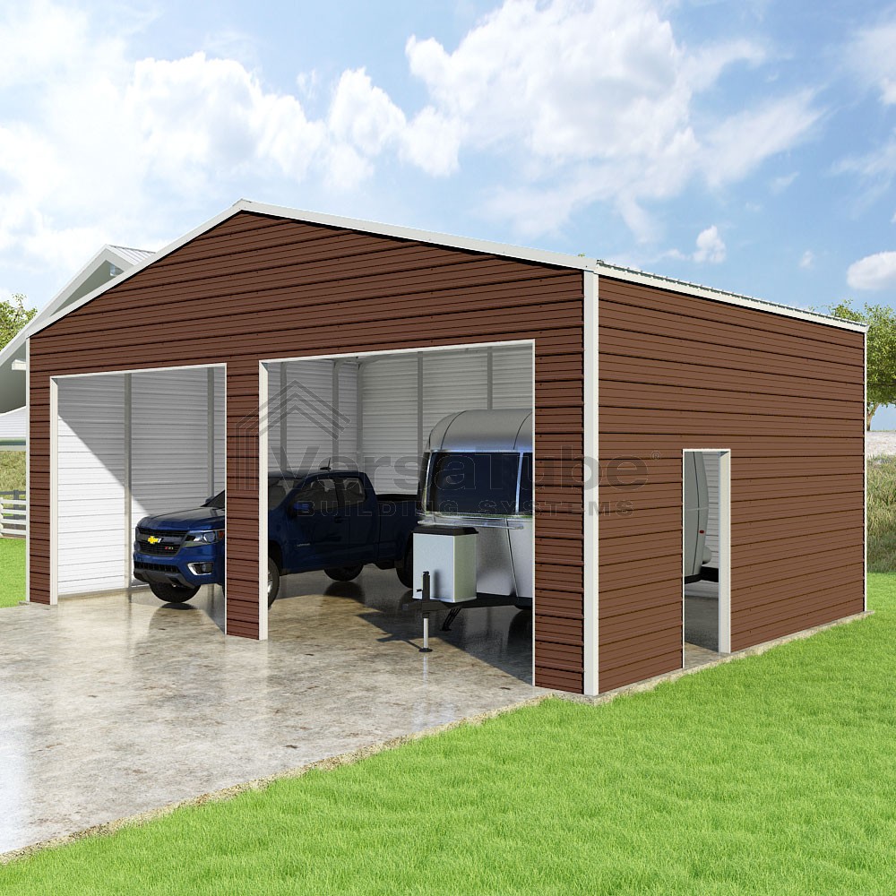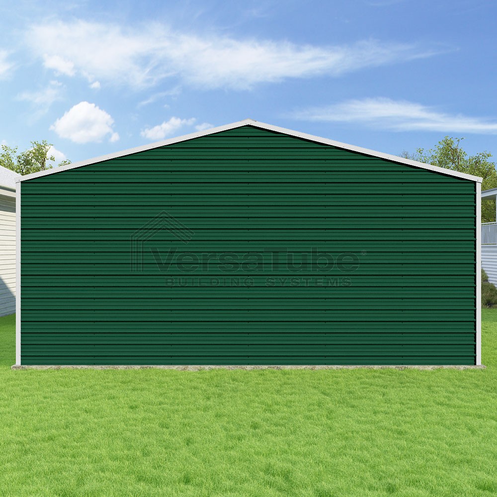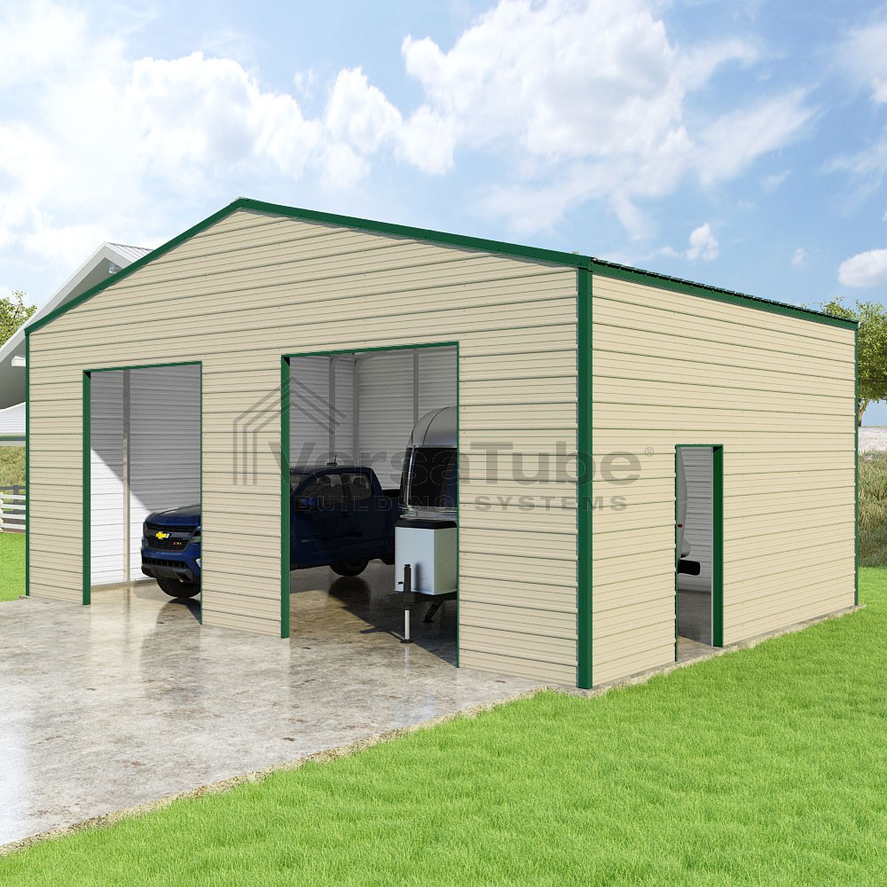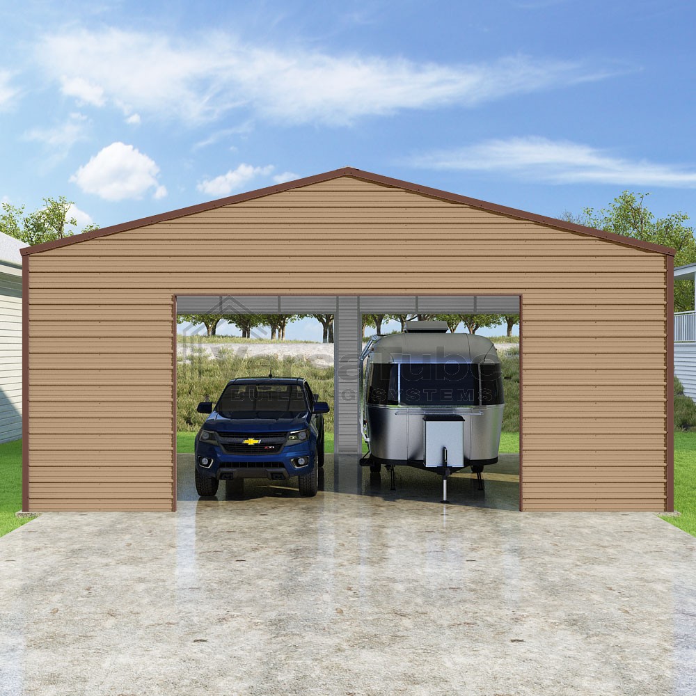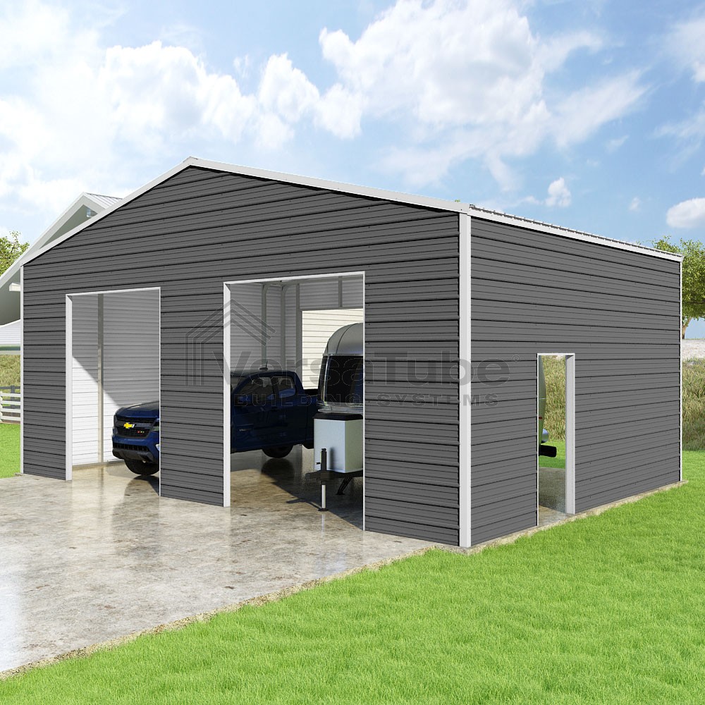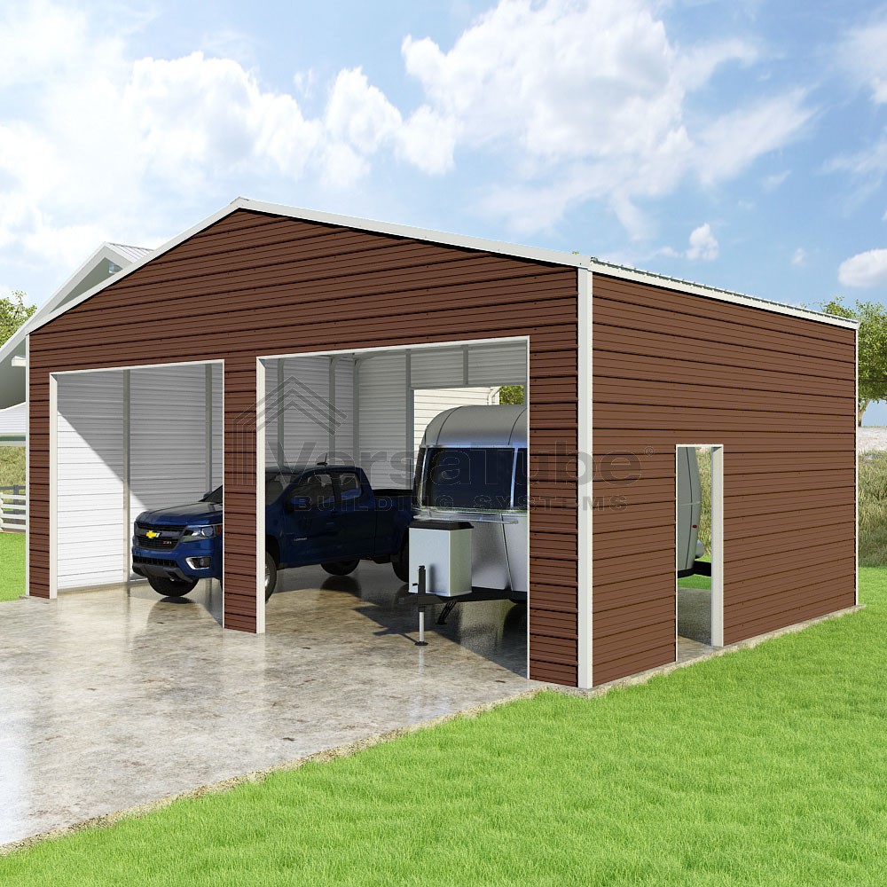 Frontier Series DIY garage kit features vertical sheet metal roof panels with horizontal siding panels..