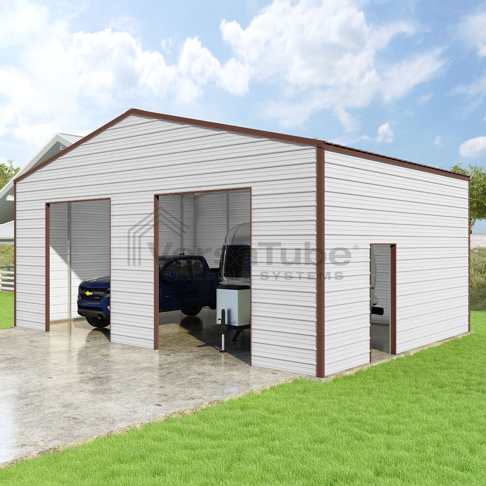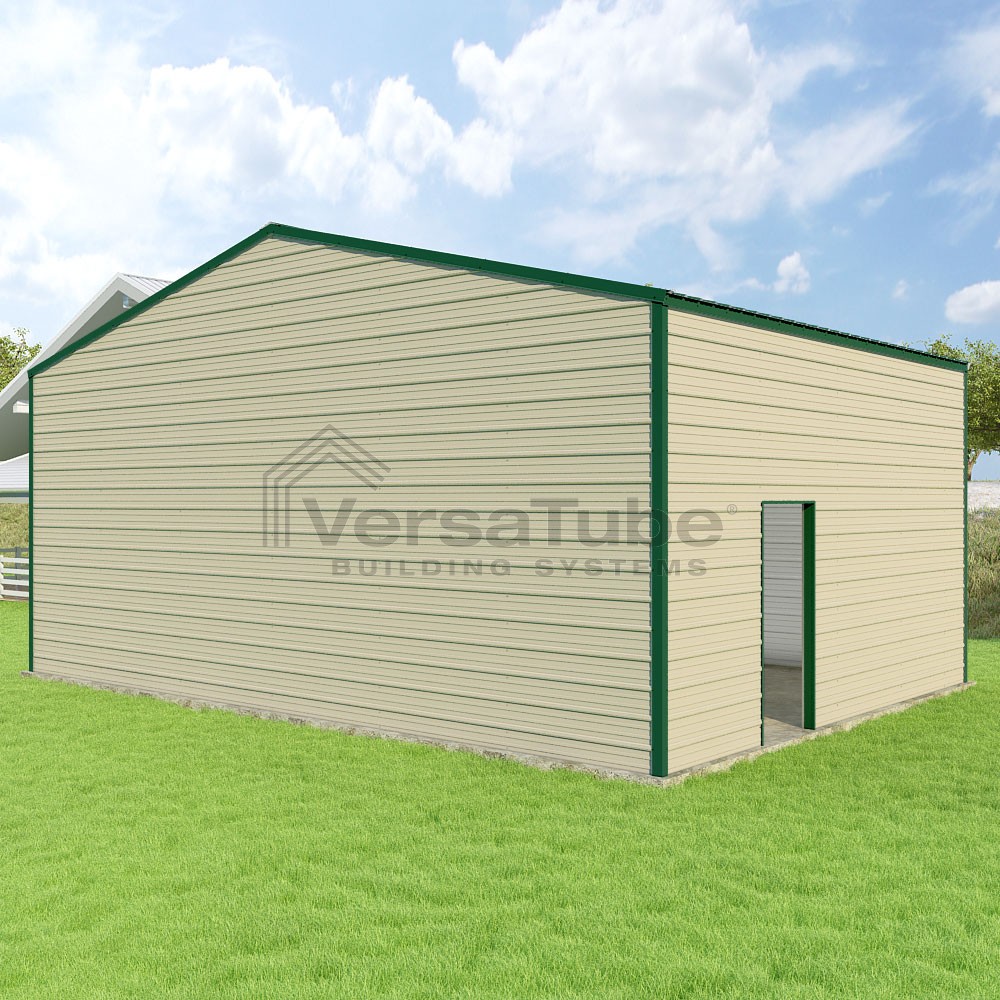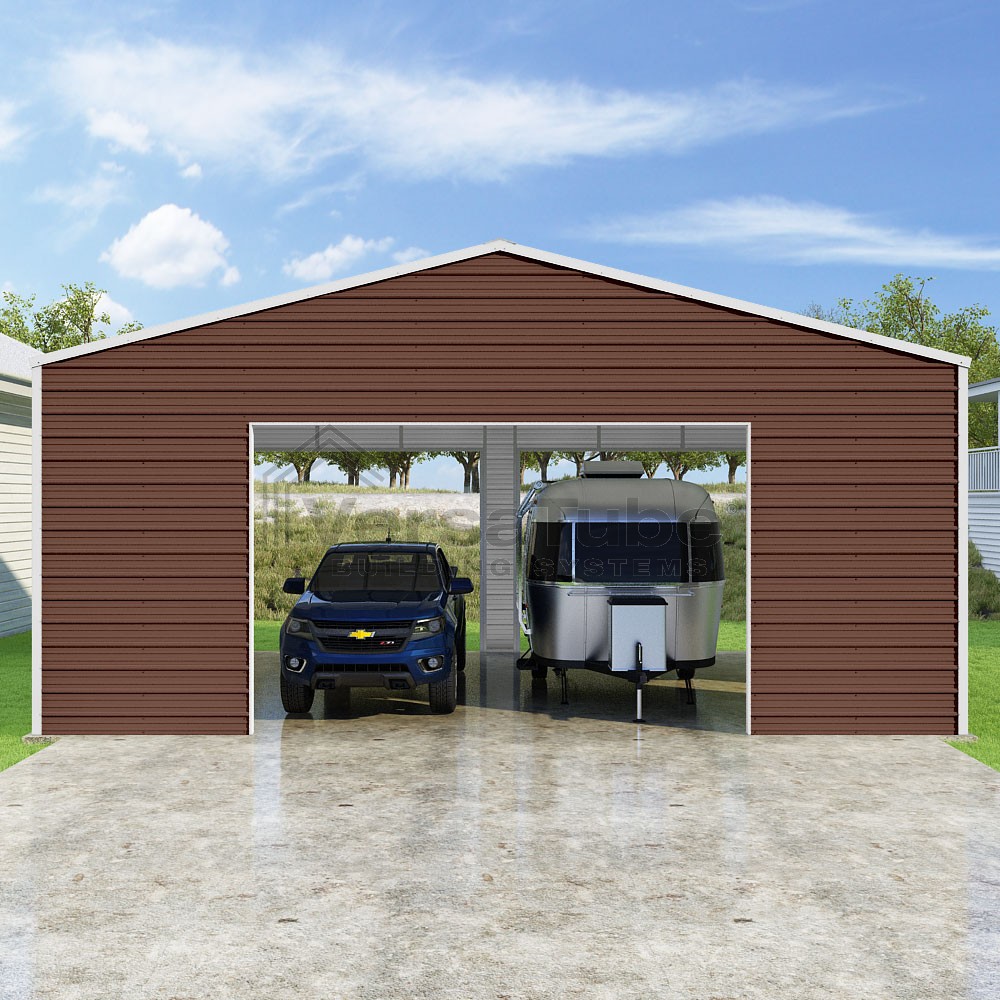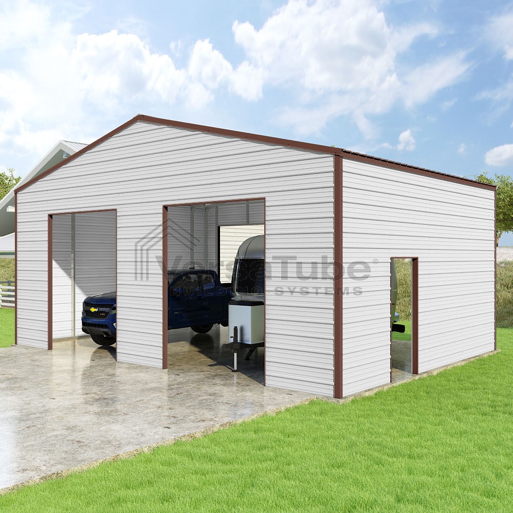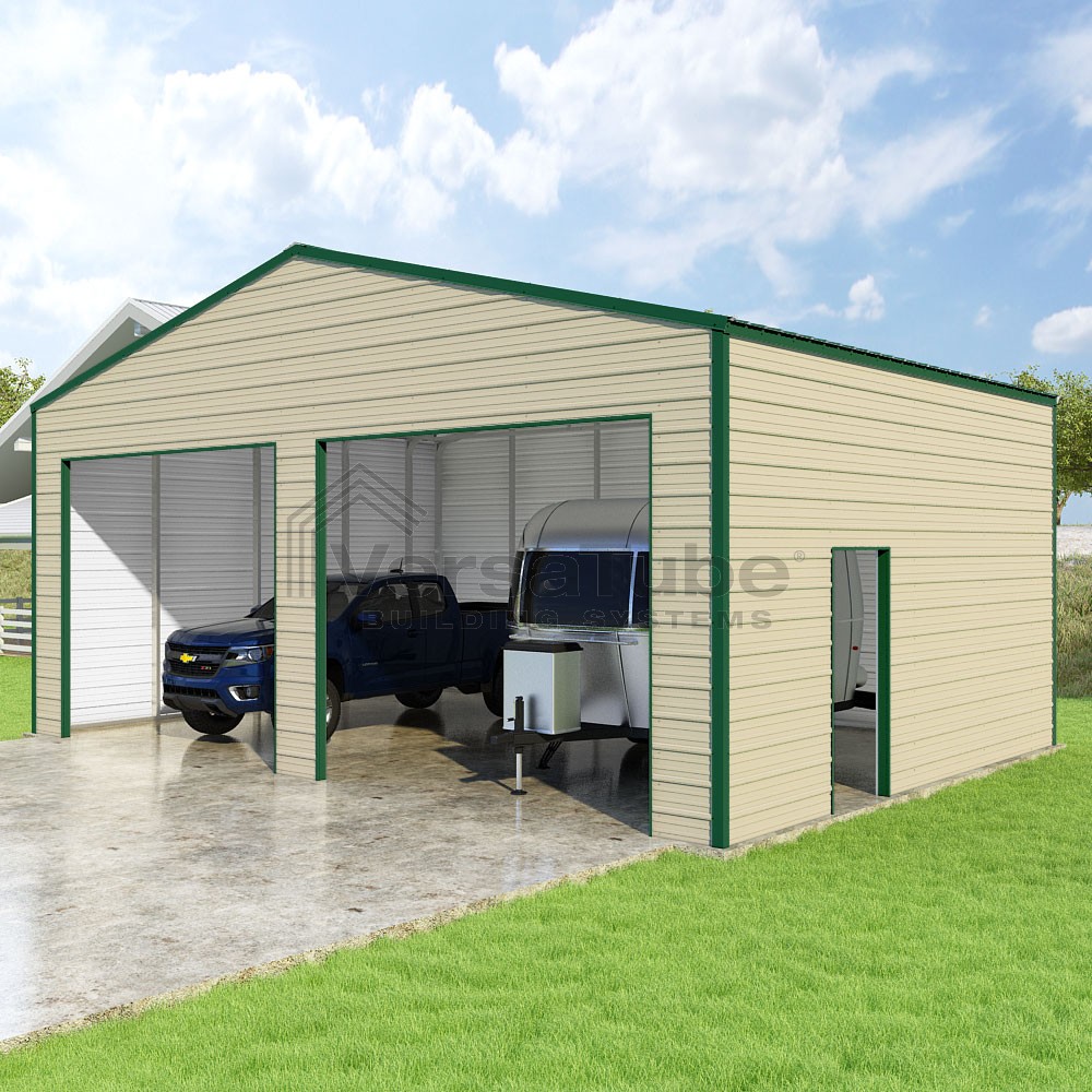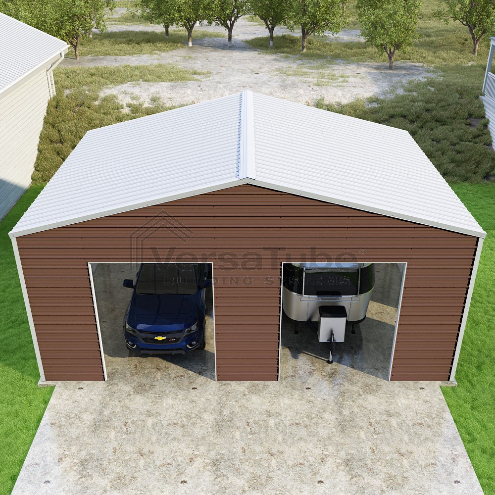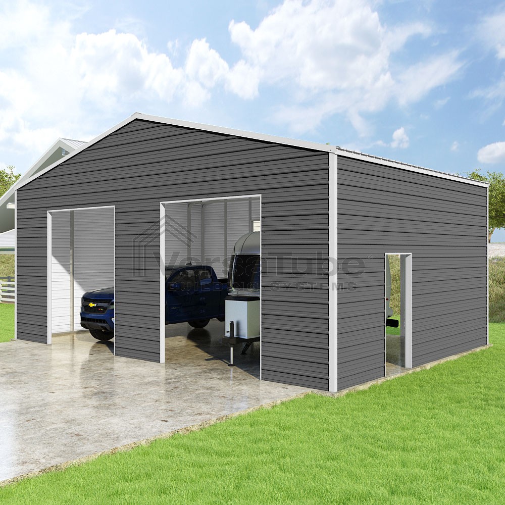 Frontier Series DIY garage kit features vertical sheet metal roof panels with horizontal siding panels..