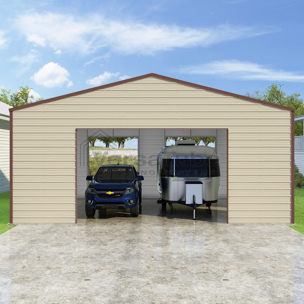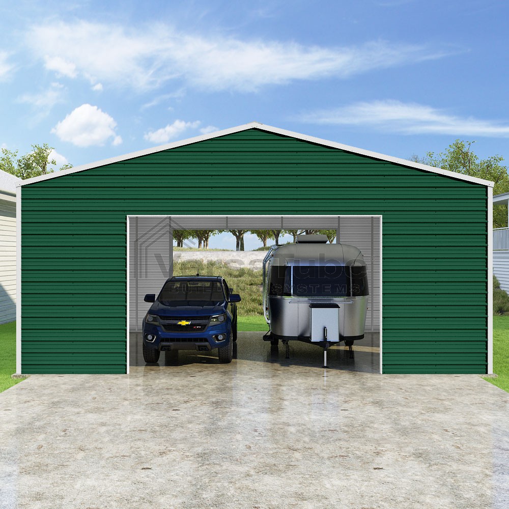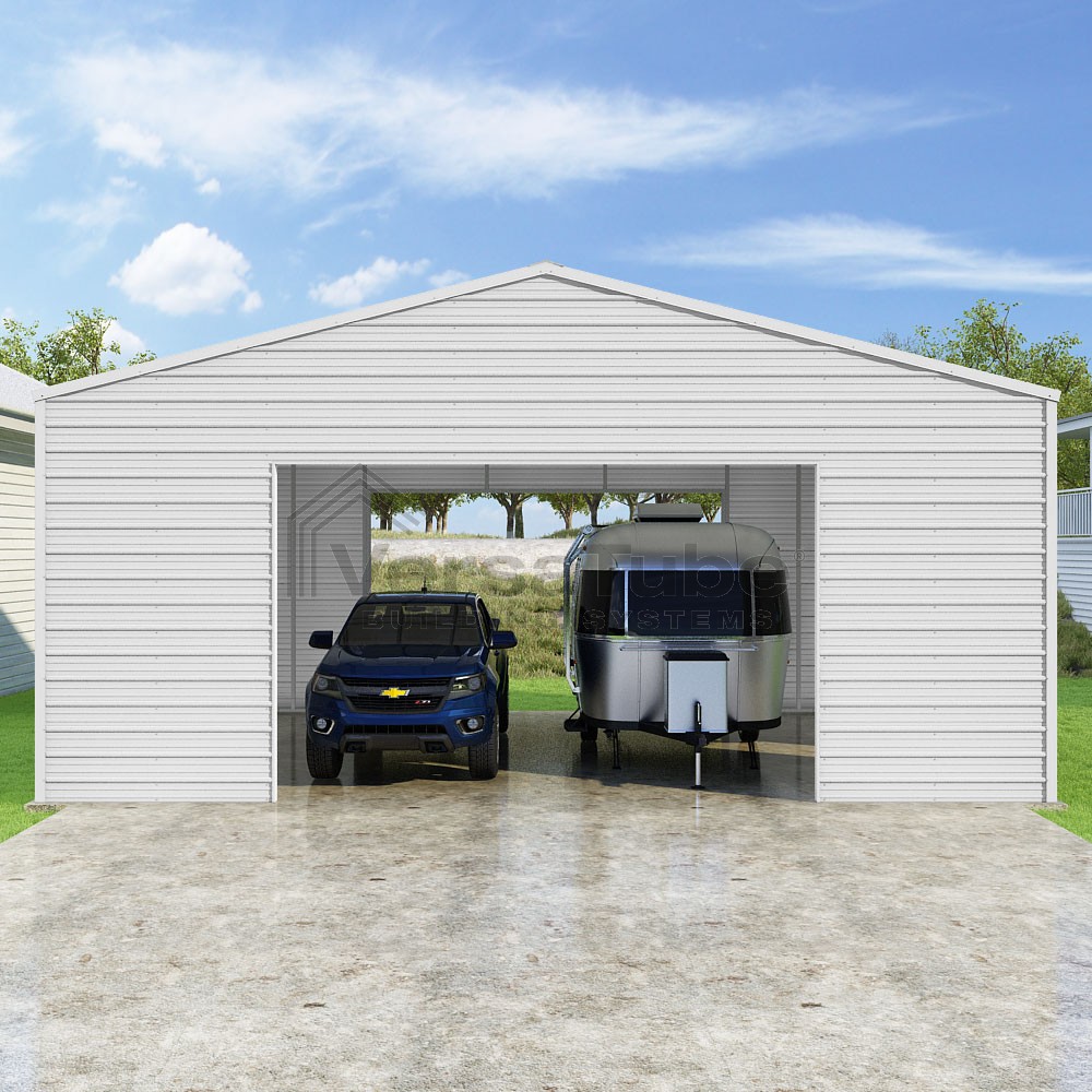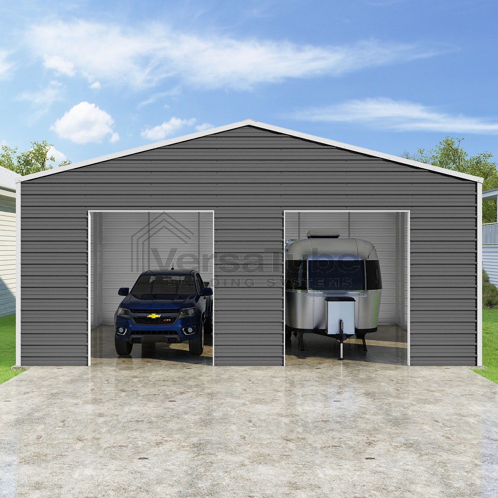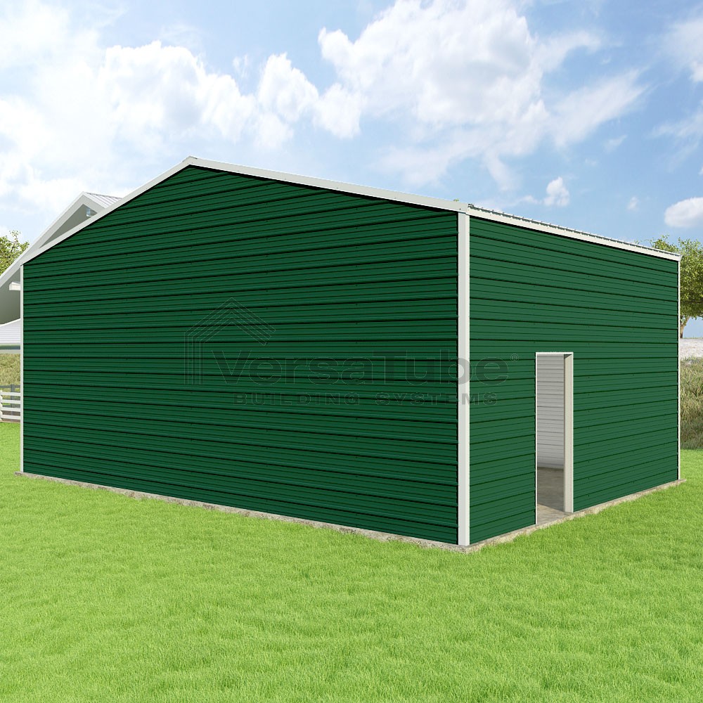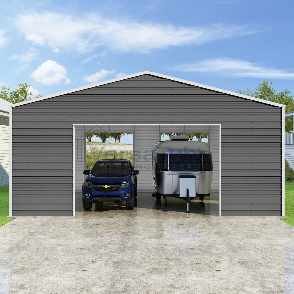 Frontier Series DIY garage kit features vertical sheet metal roof panels with horizontal siding panels..