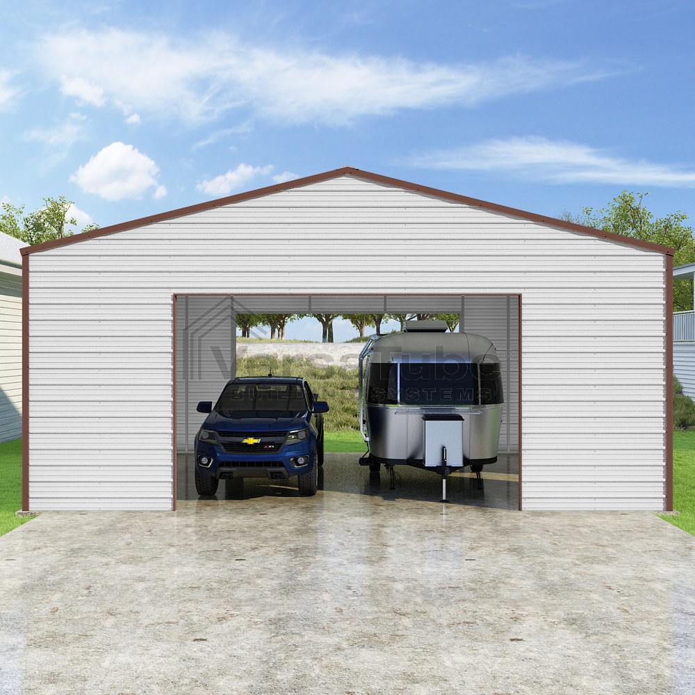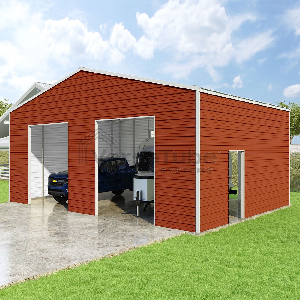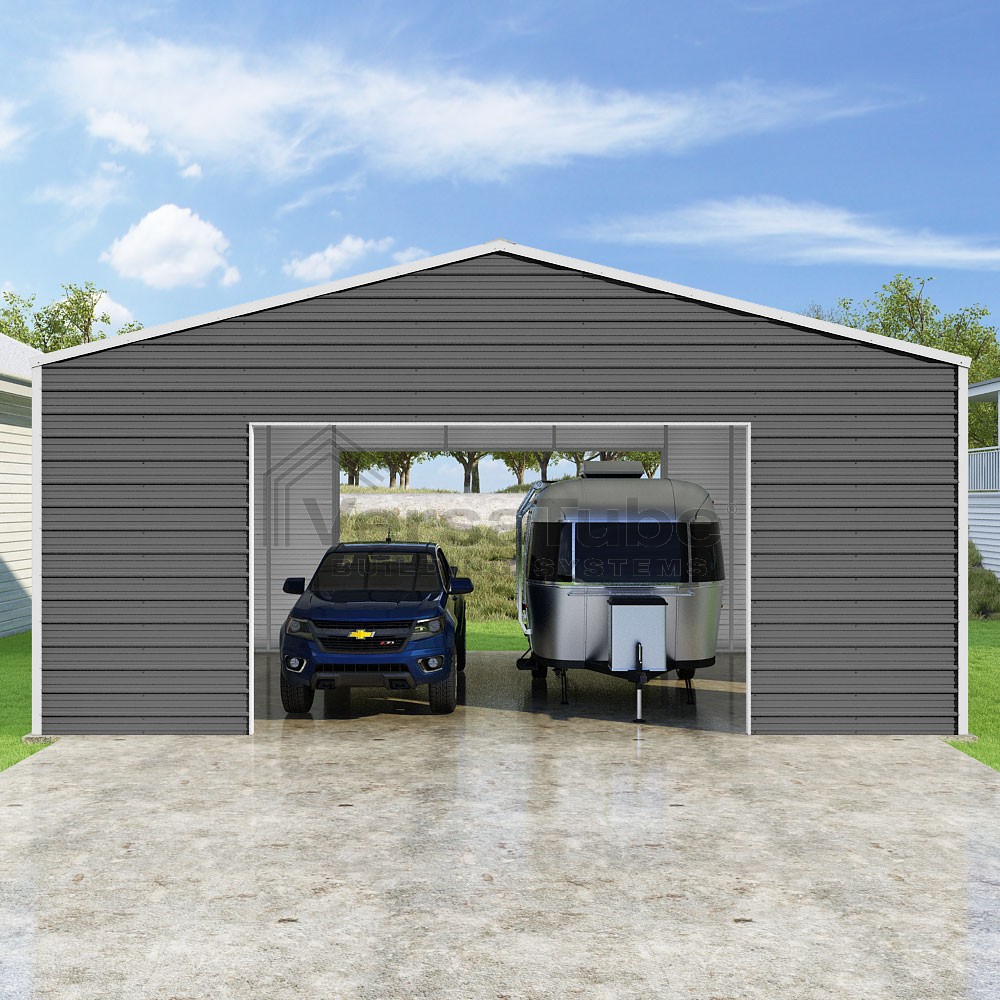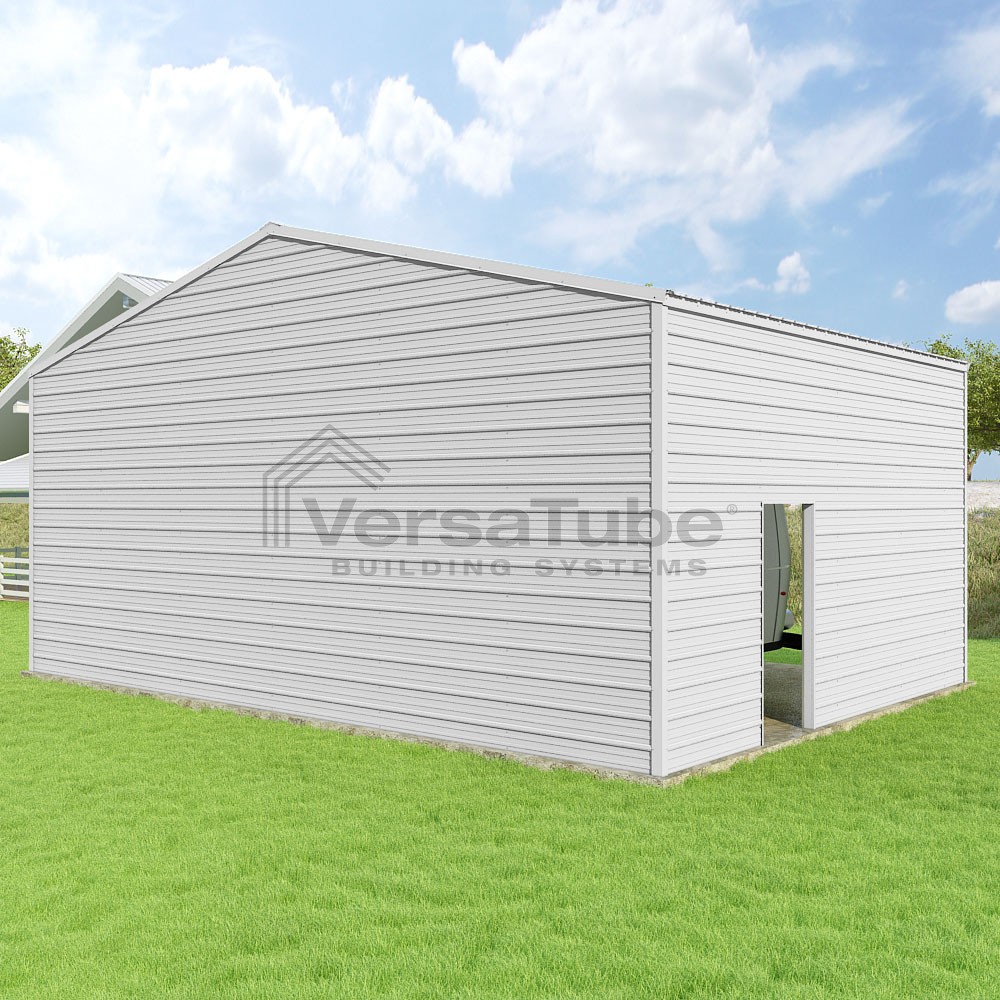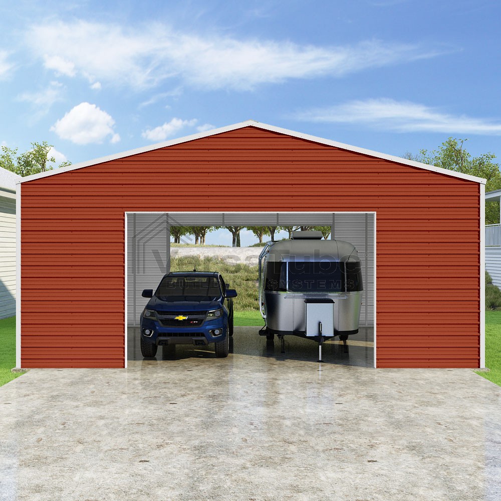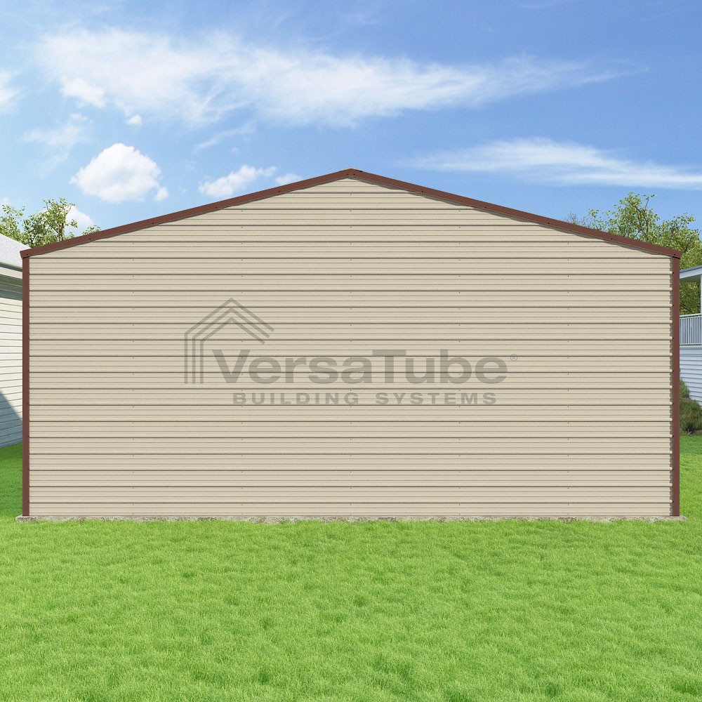 Frontier Series DIY garage kit features vertical sheet metal roof panels with horizontal siding panels..