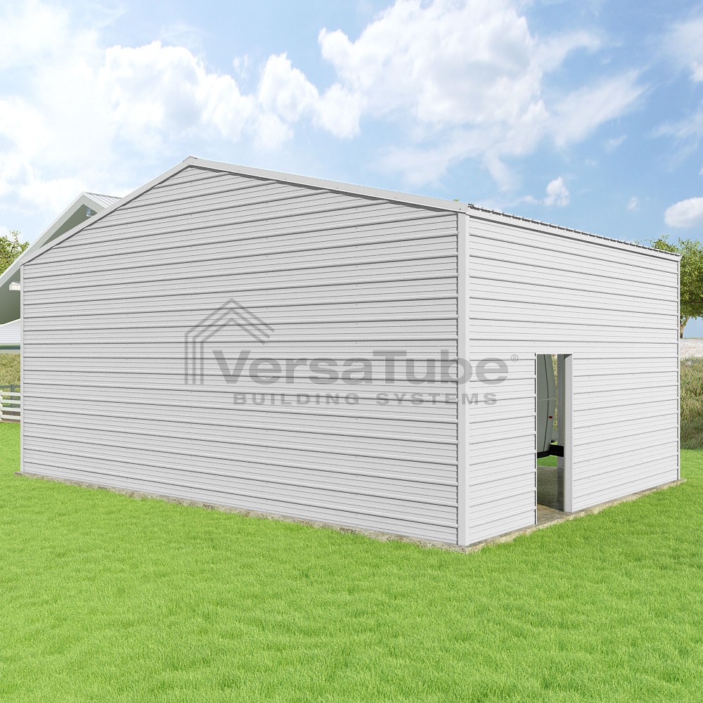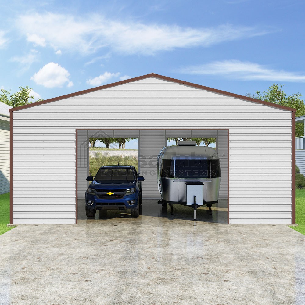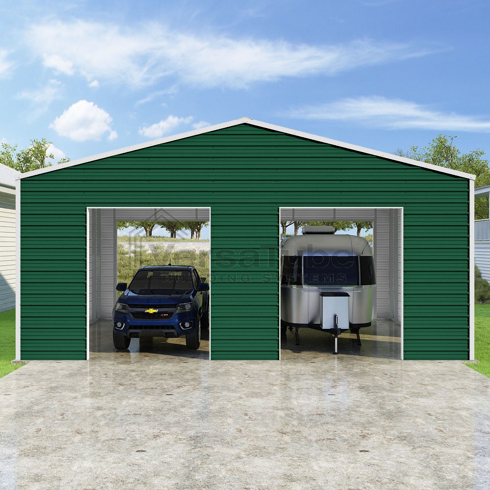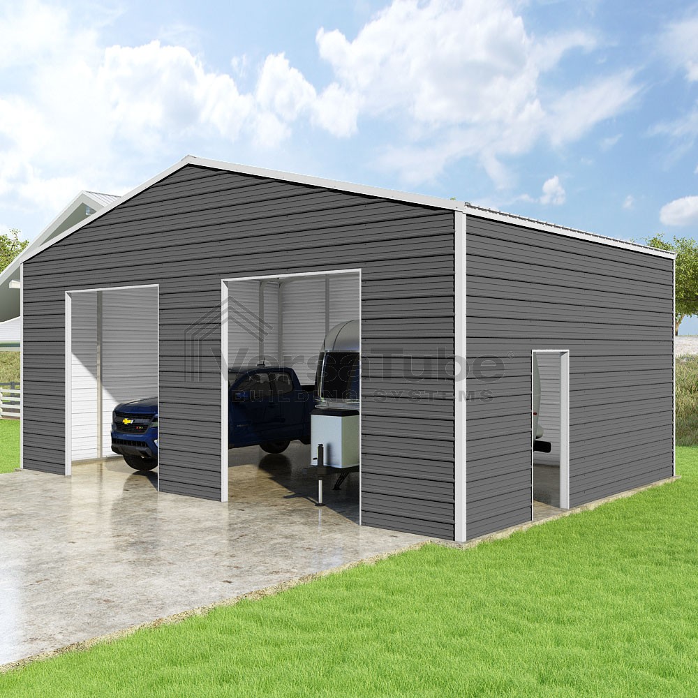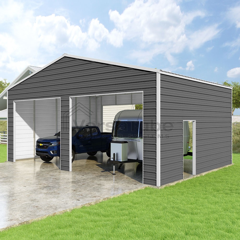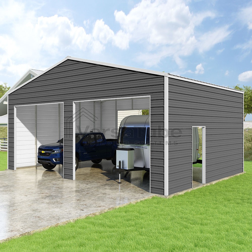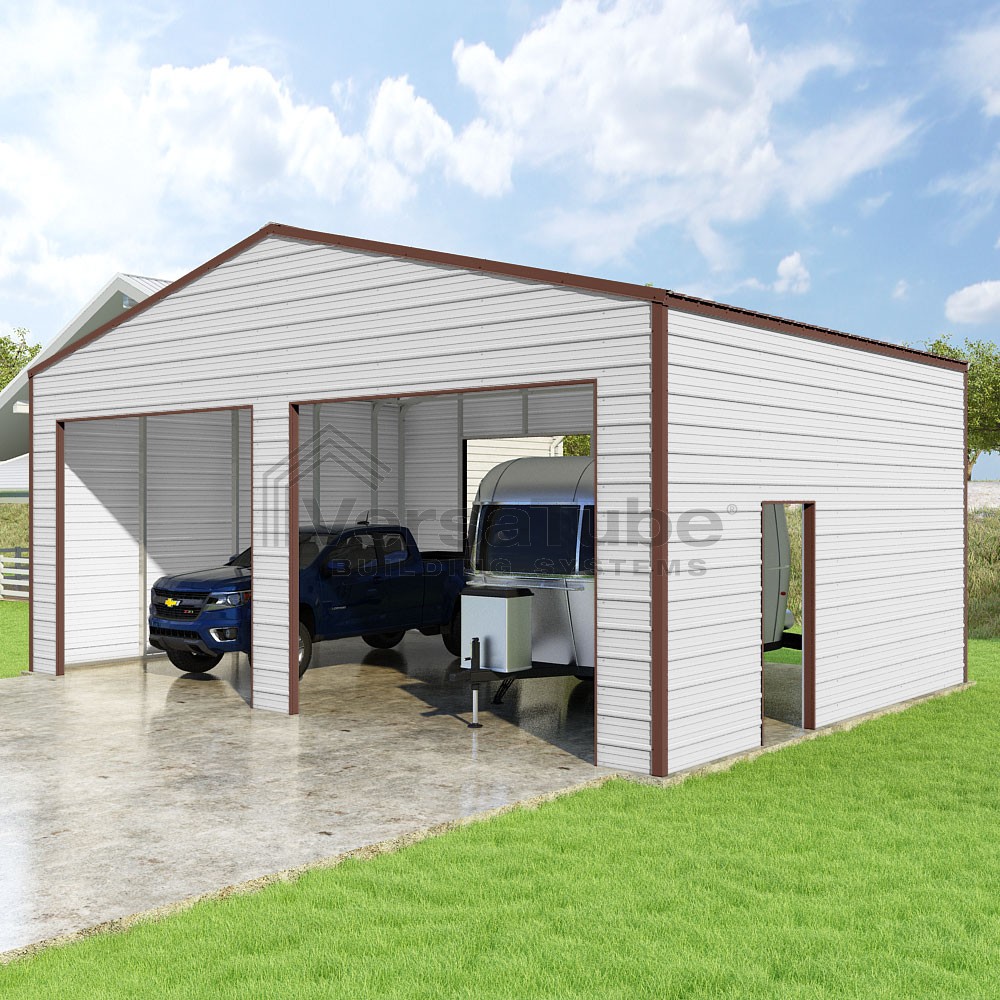 Frontier Series DIY garage kit features vertical sheet metal roof panels with horizontal siding panels..