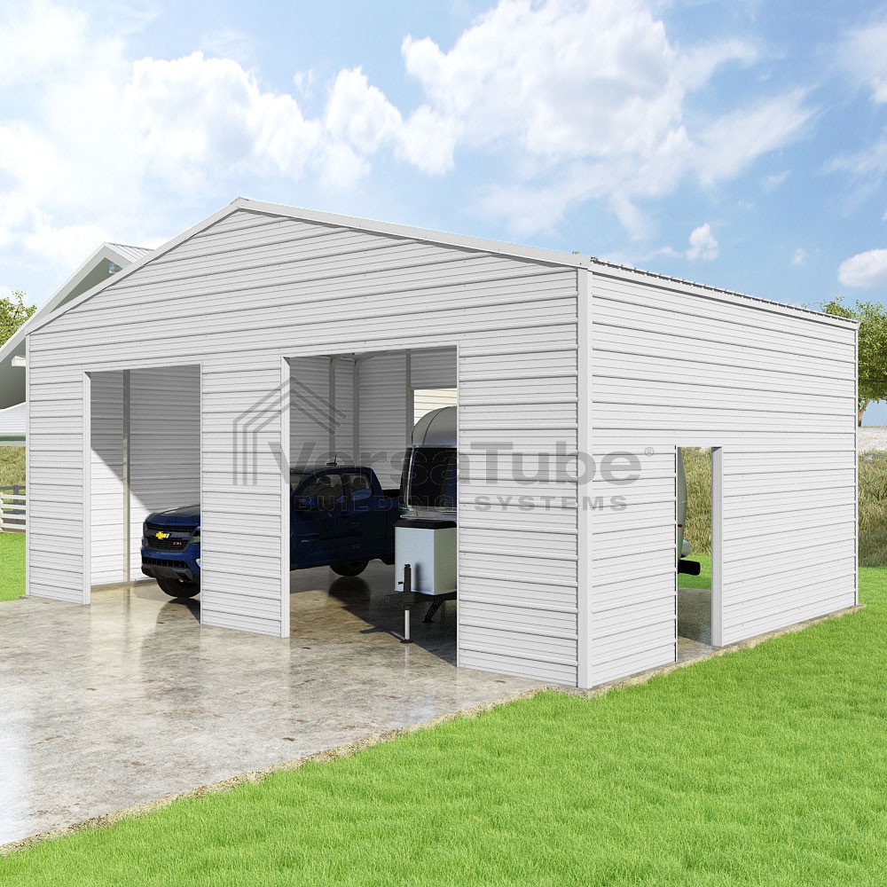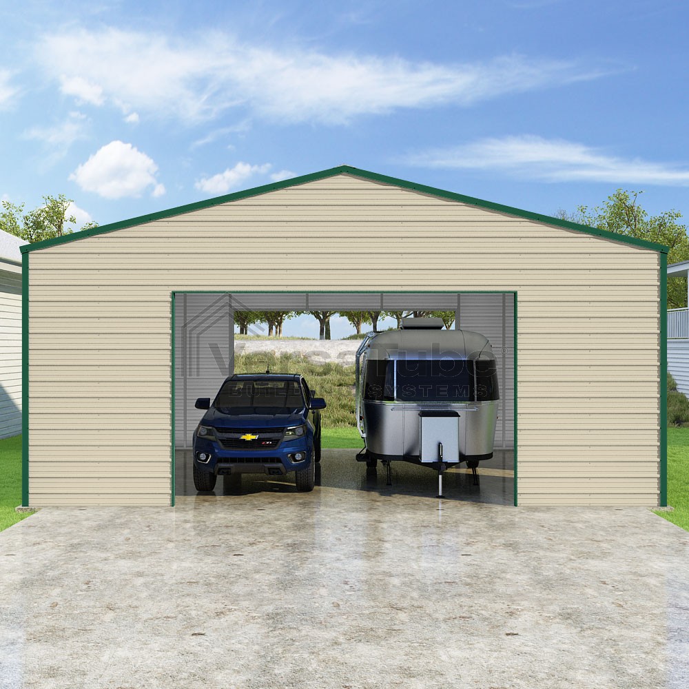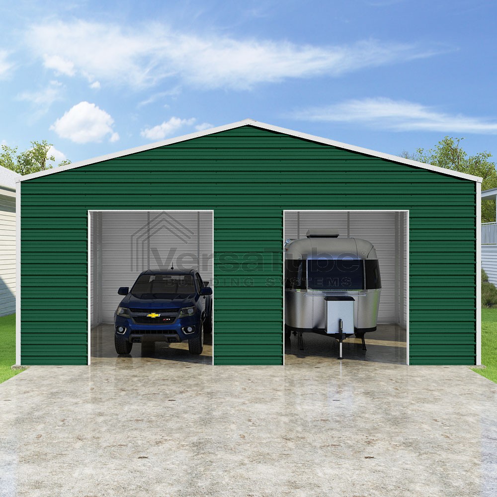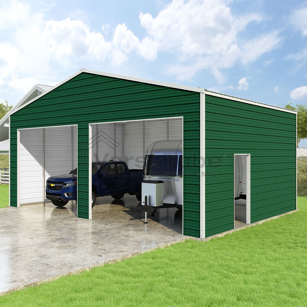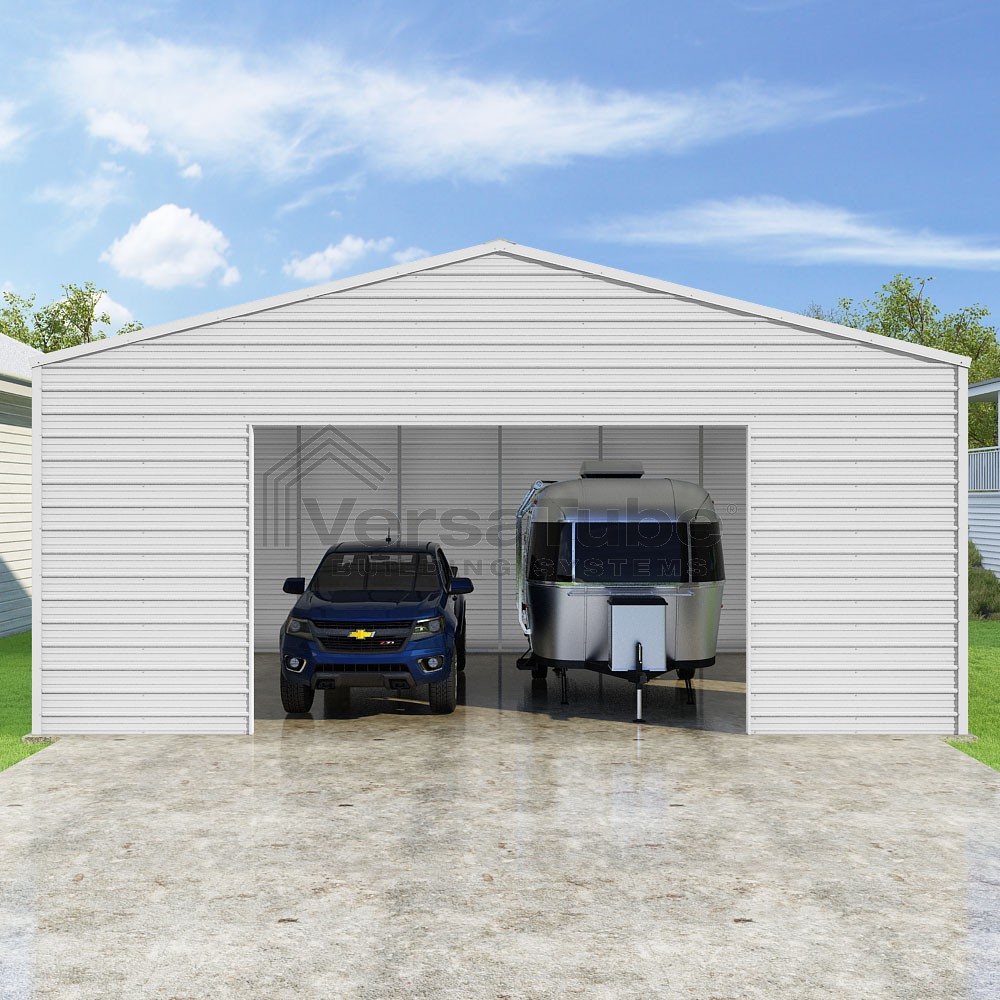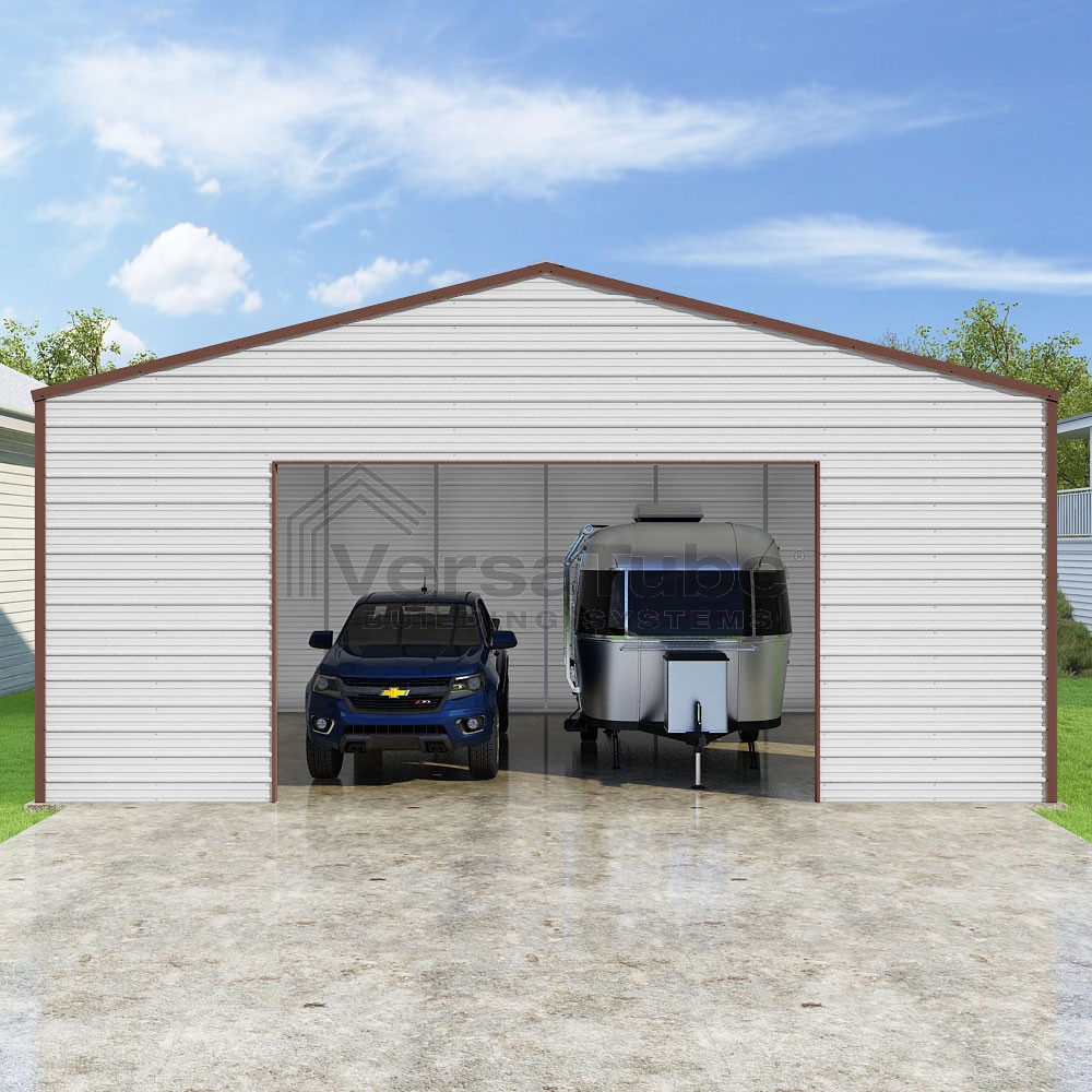 Frontier Series DIY garage kit features vertical sheet metal roof panels with horizontal siding panels..