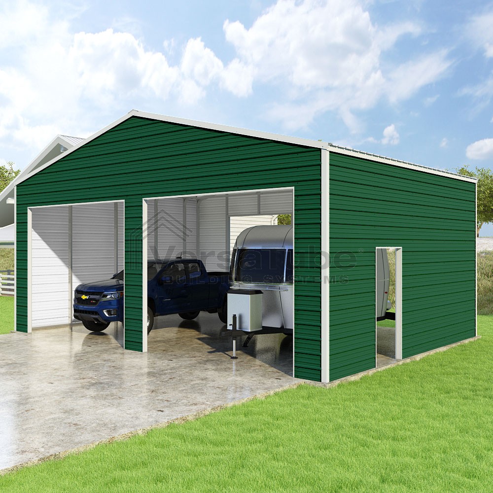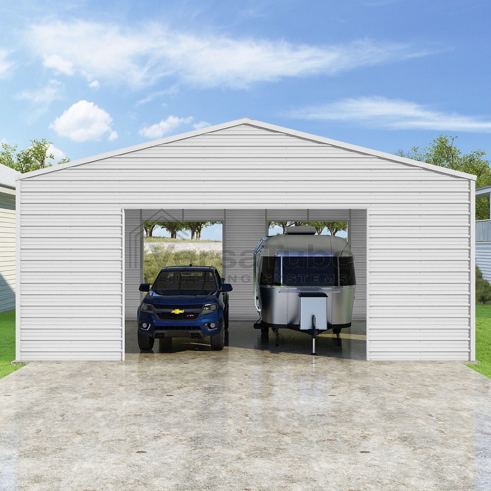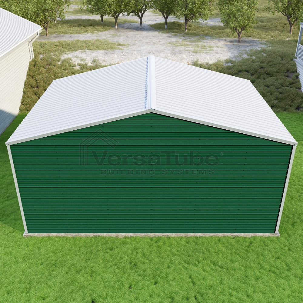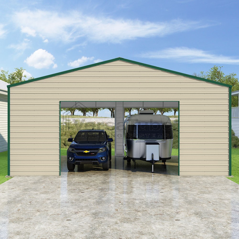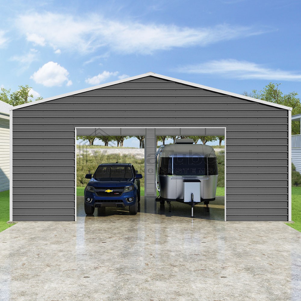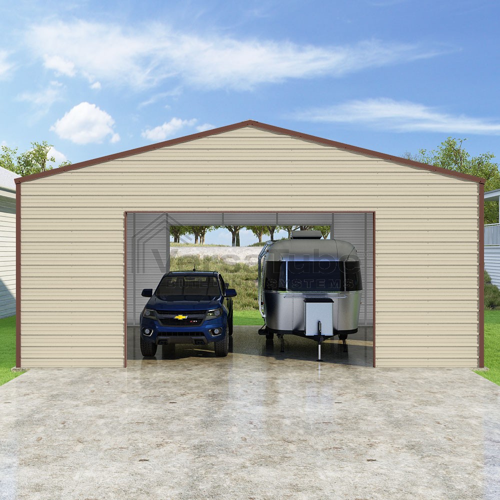 Frontier Series DIY garage kit features vertical sheet metal roof panels with horizontal siding panels..