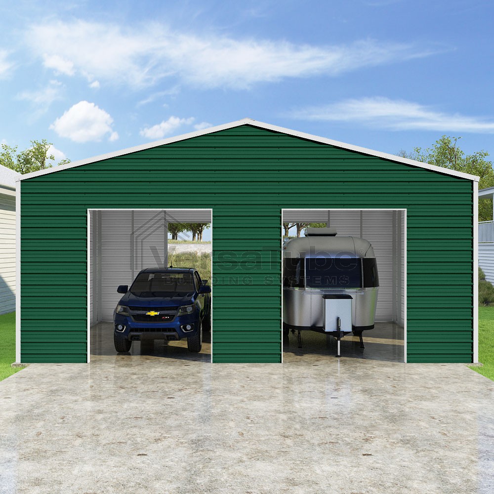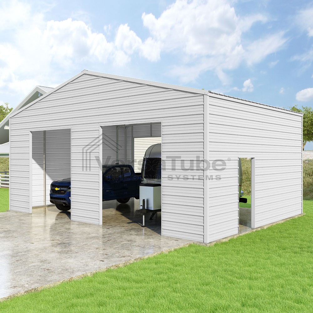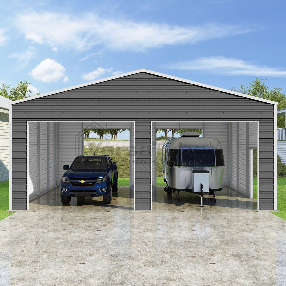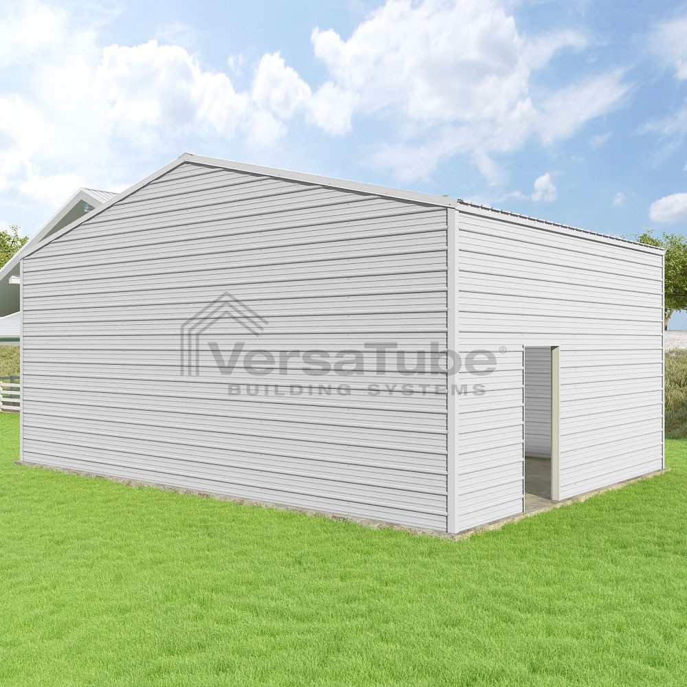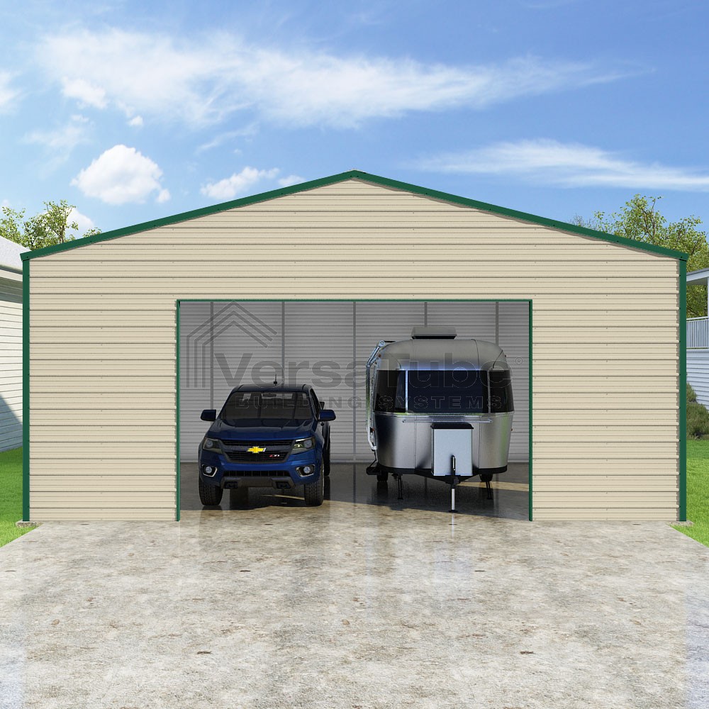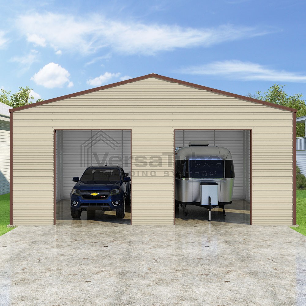 Frontier Series DIY garage kit features vertical sheet metal roof panels with horizontal siding panels..