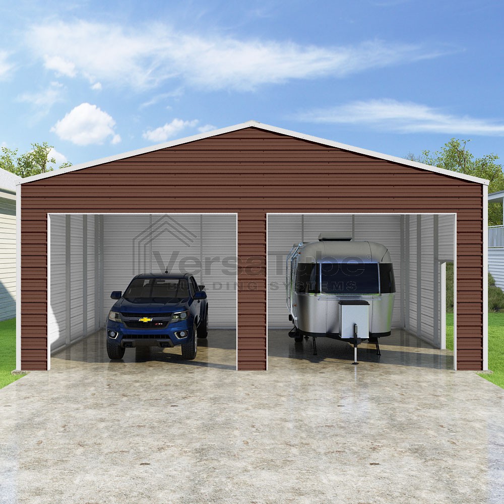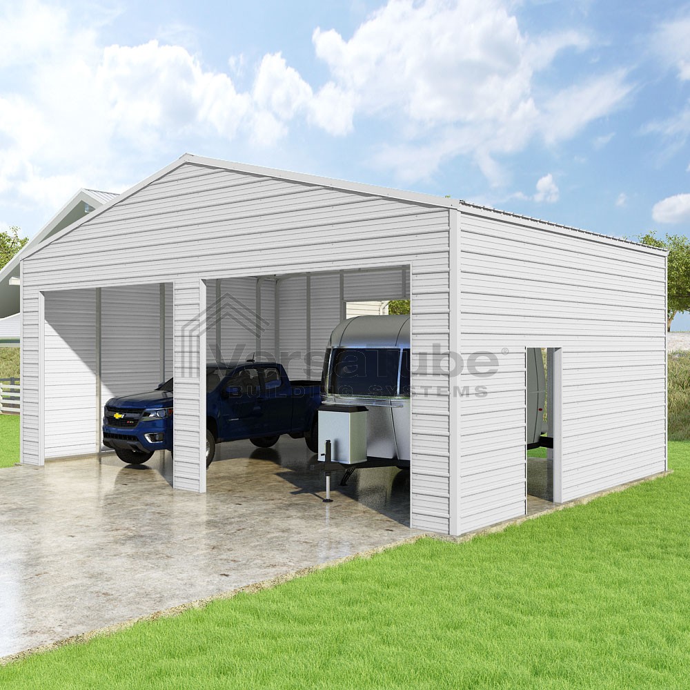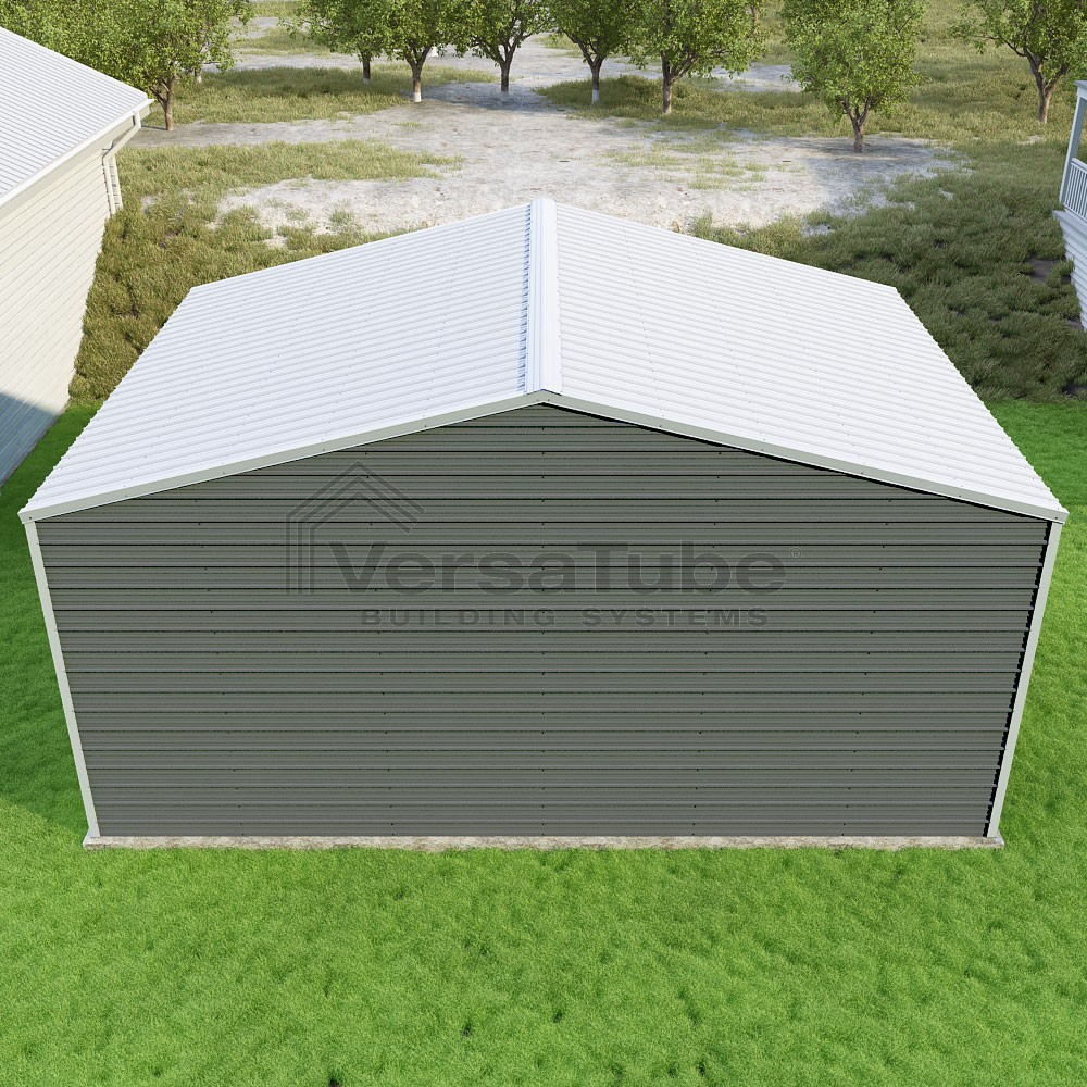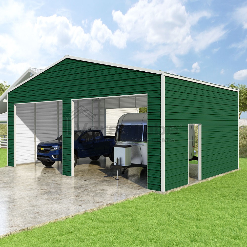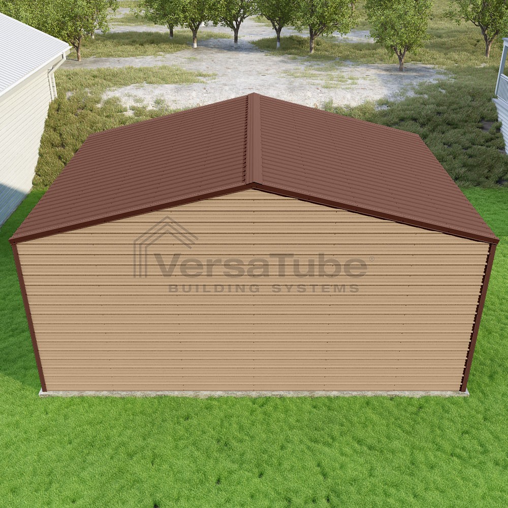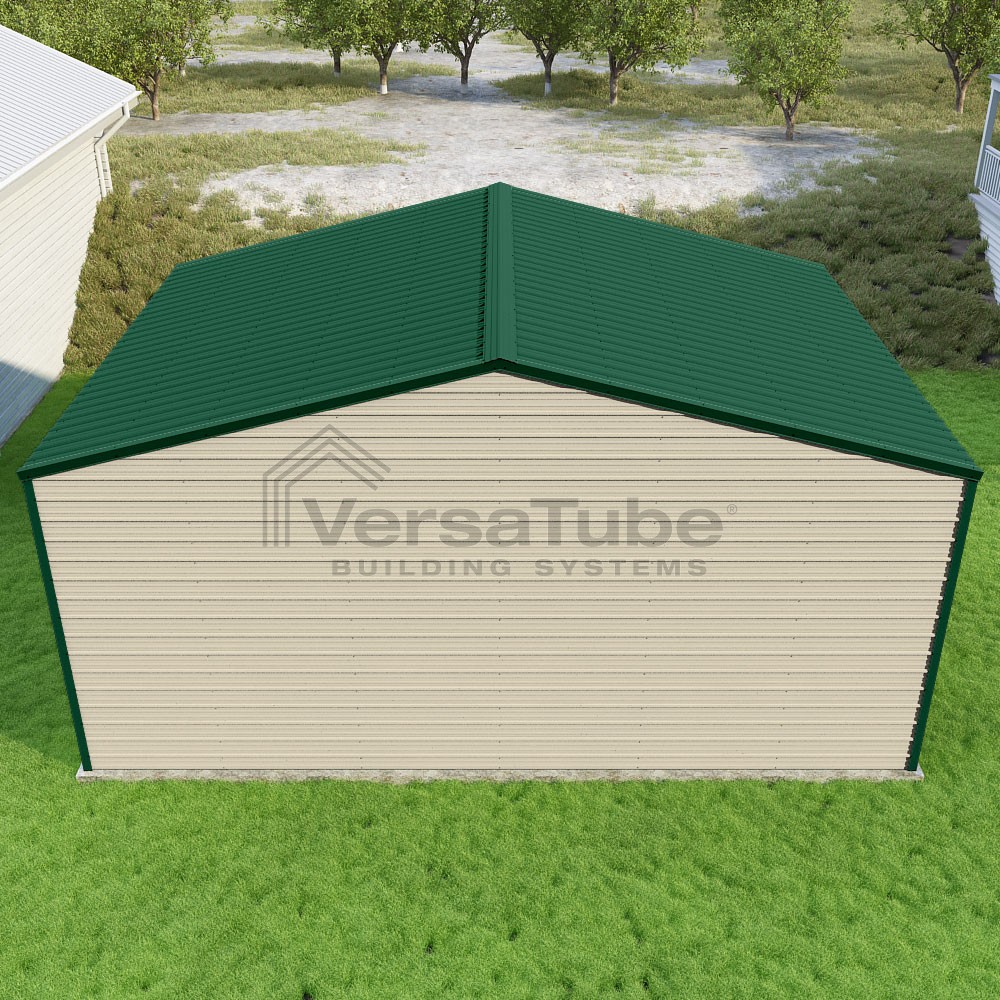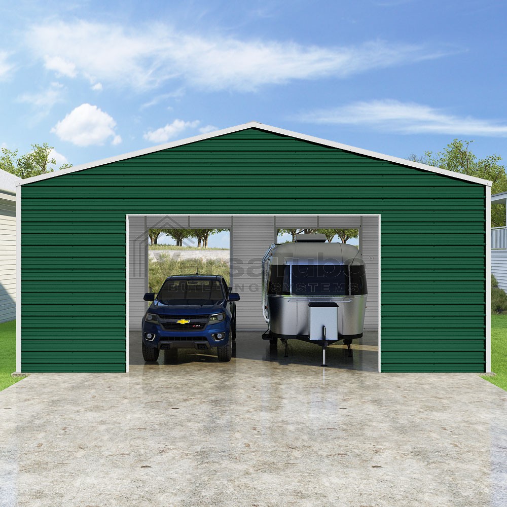 Frontier Series DIY garage kit features vertical sheet metal roof panels with horizontal siding panels..