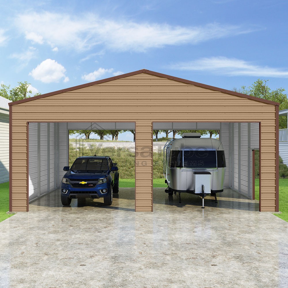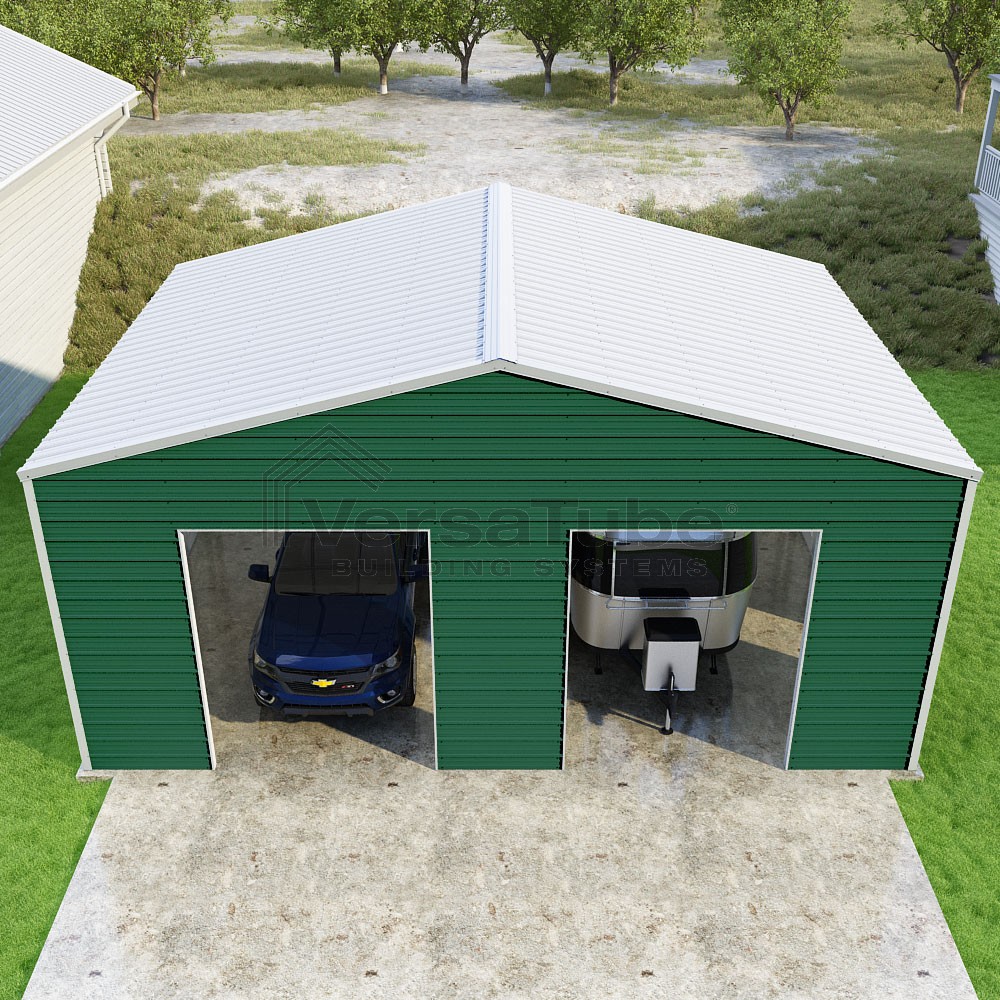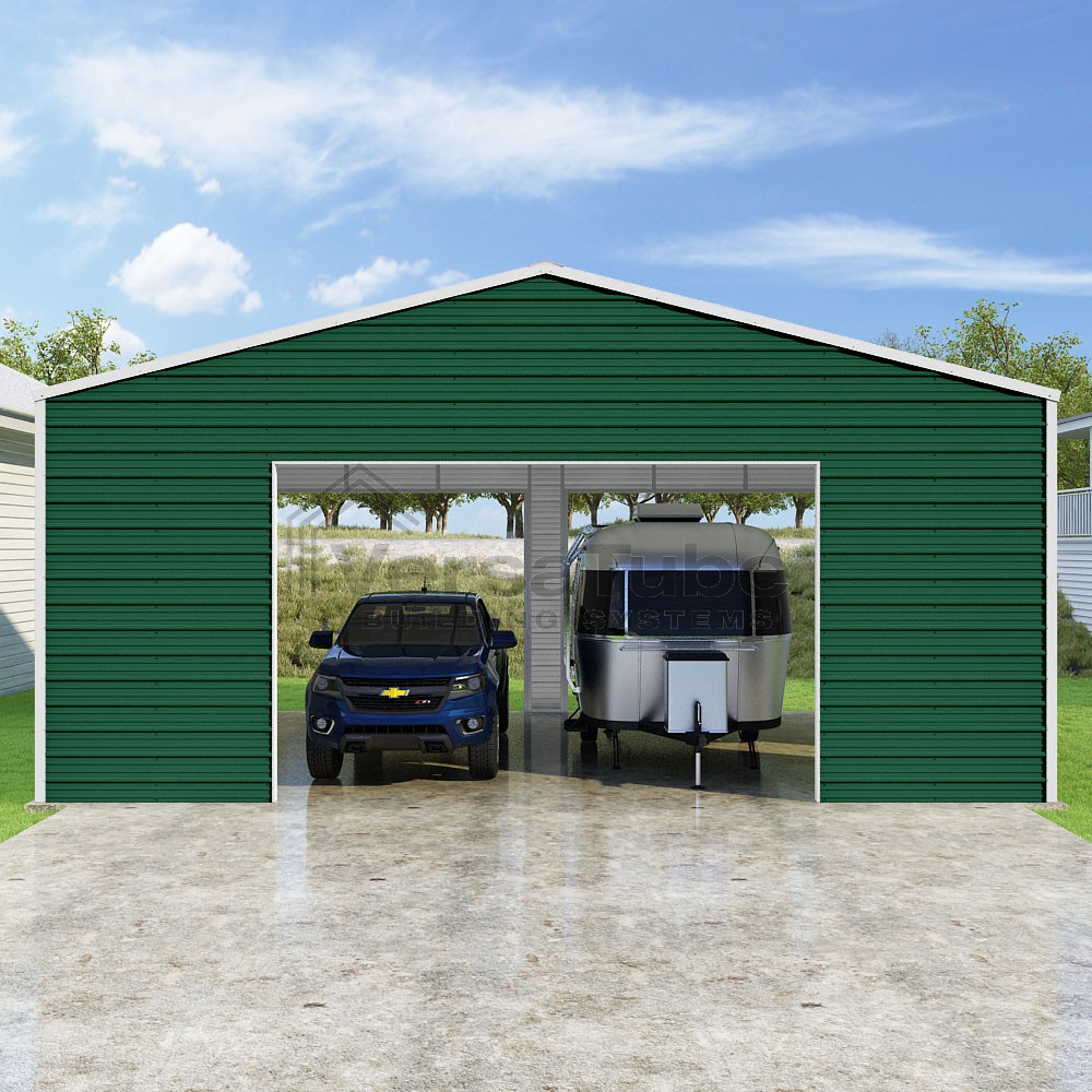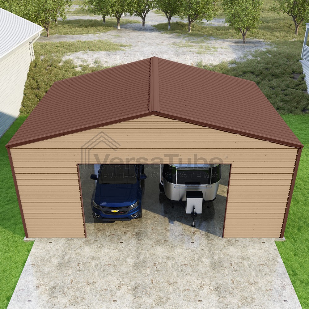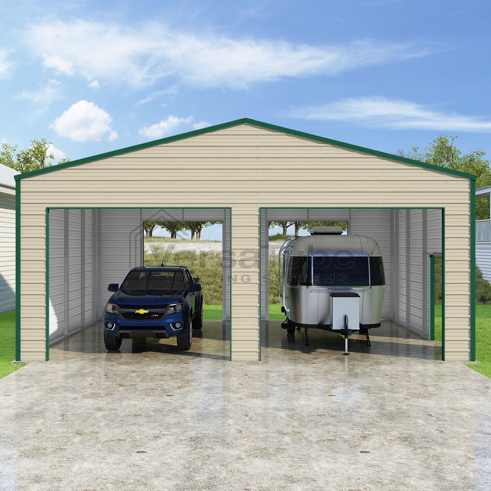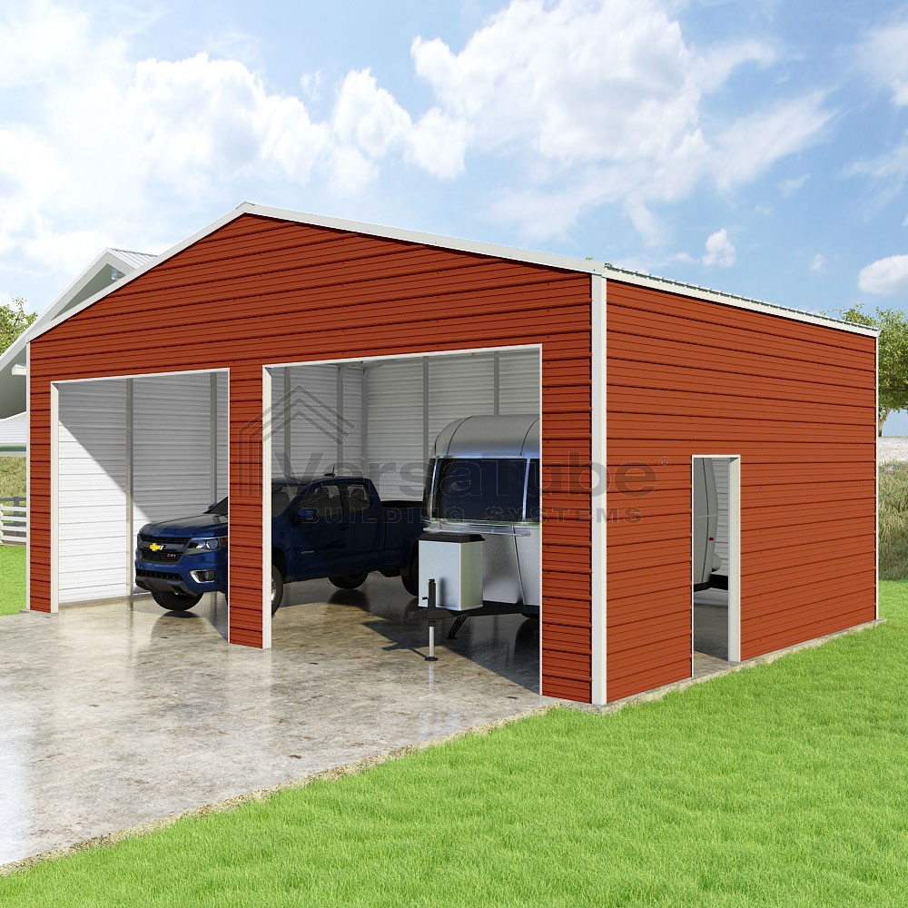 Frontier Series DIY garage kit features vertical sheet metal roof panels with horizontal siding panels..