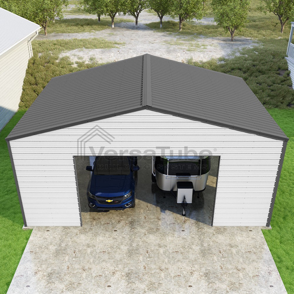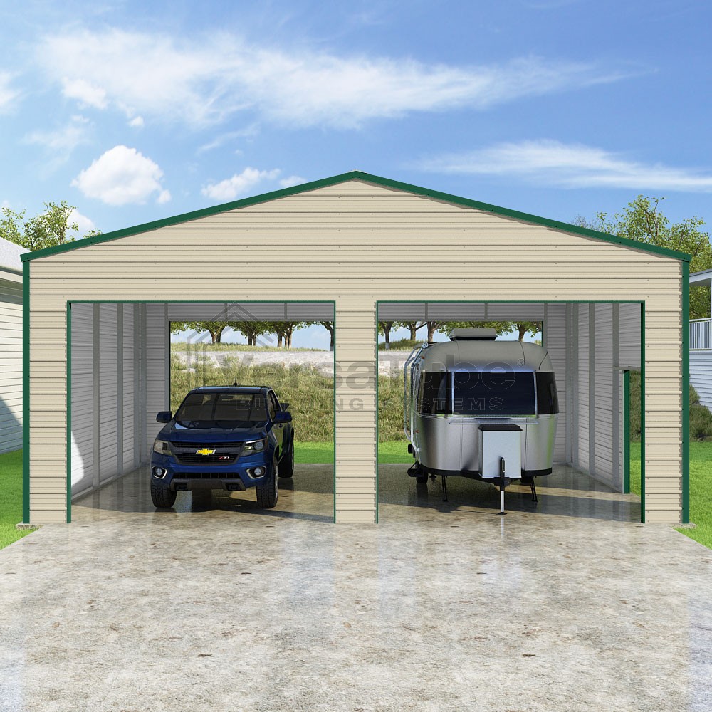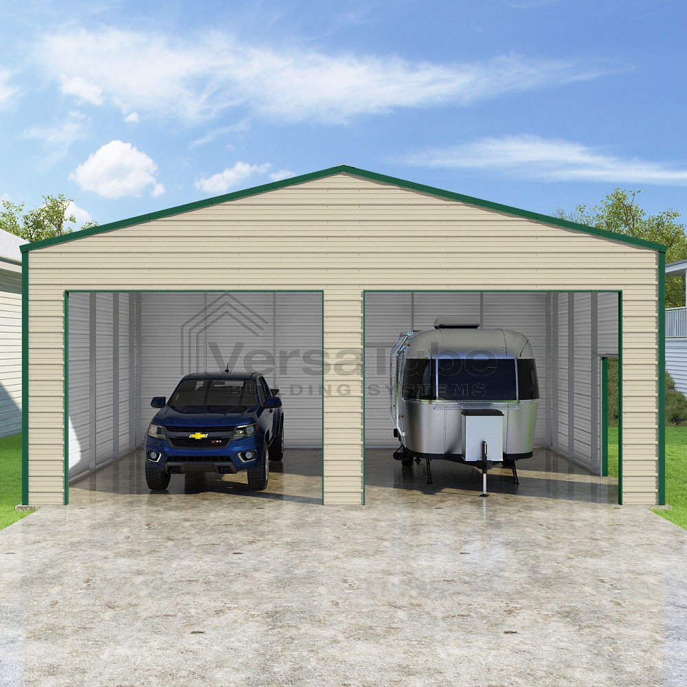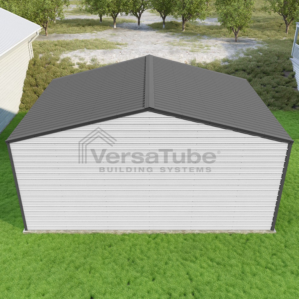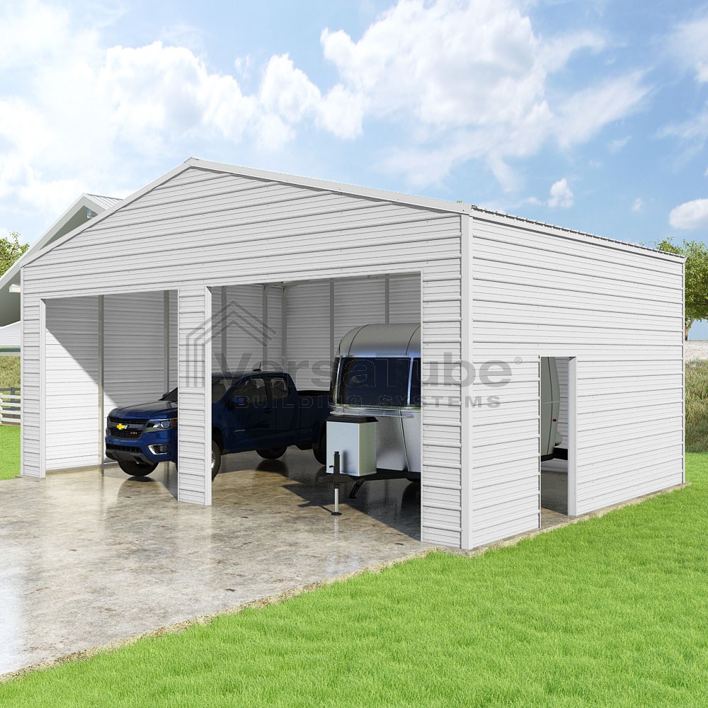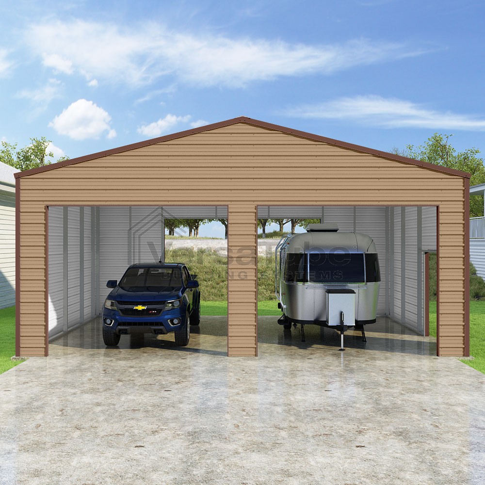 Frontier Series DIY garage kit features vertical sheet metal roof panels with horizontal siding panels..