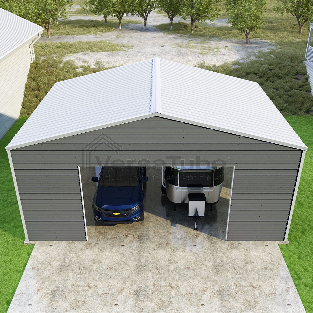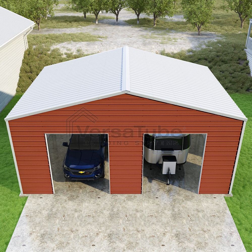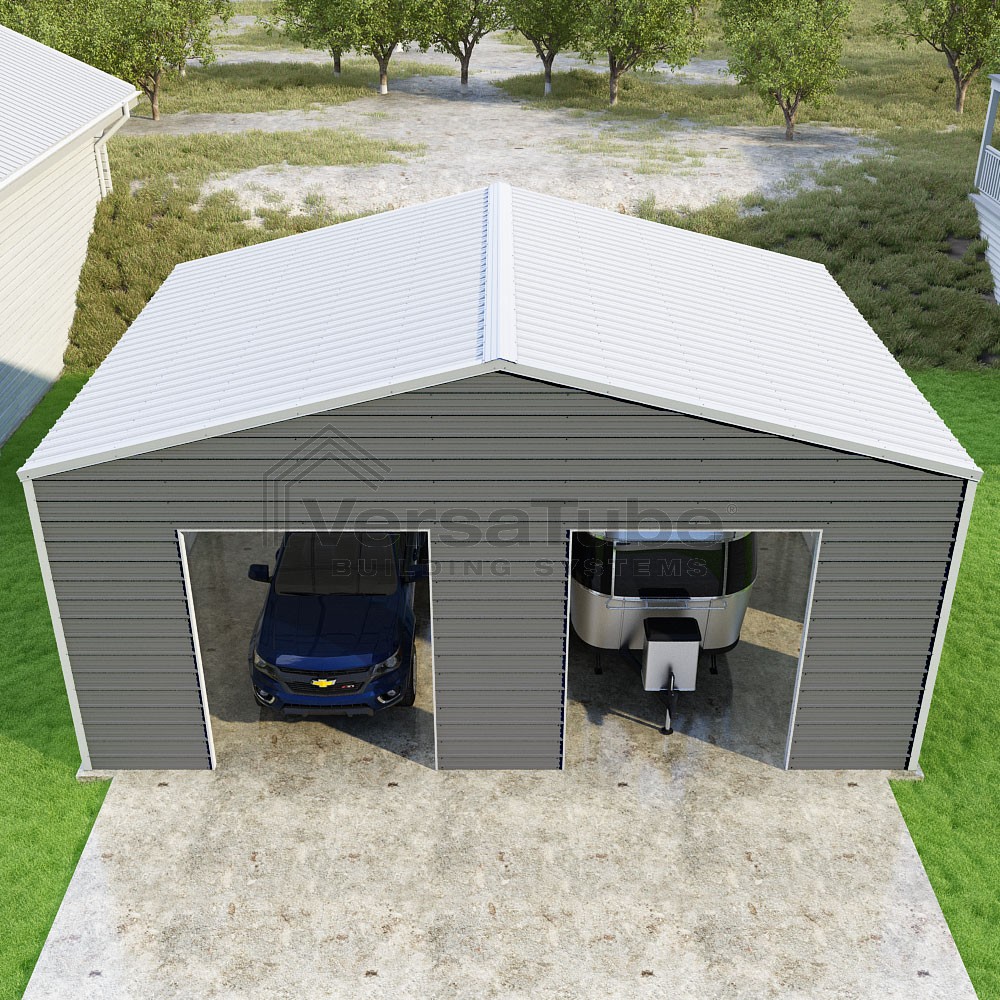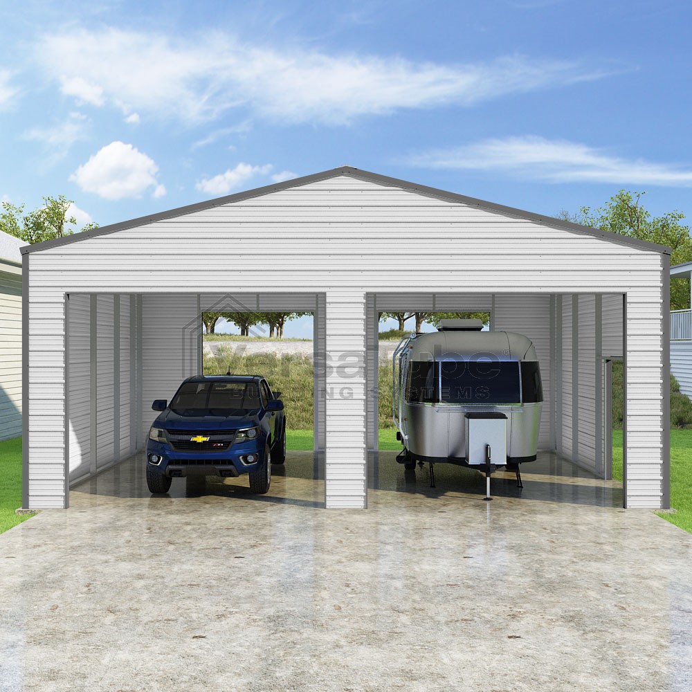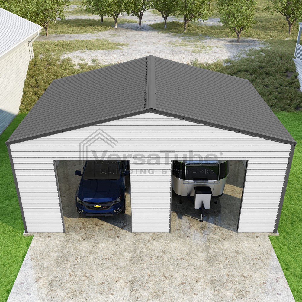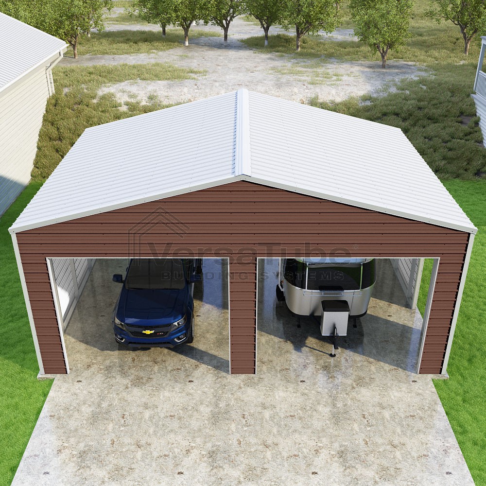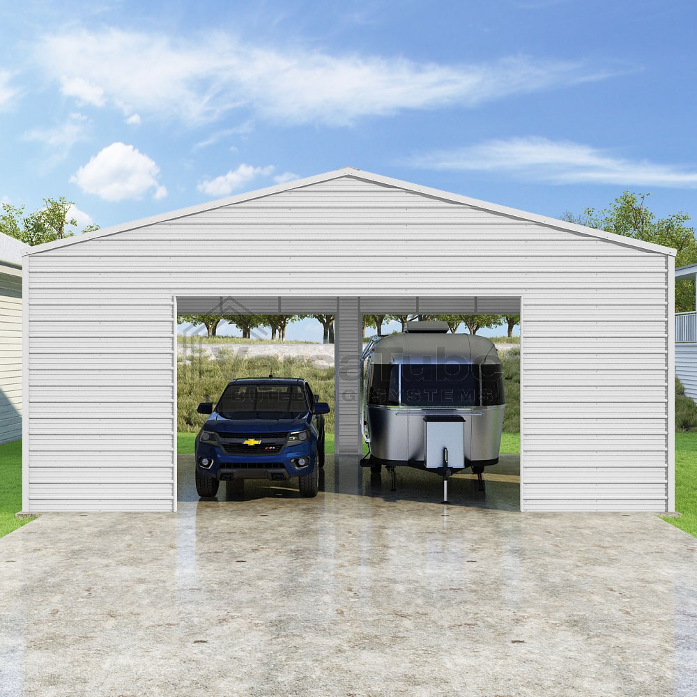 Frontier Series DIY garage kit features vertical sheet metal roof panels with horizontal siding panels..
