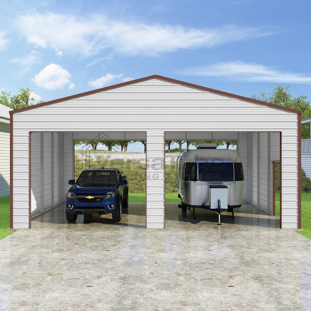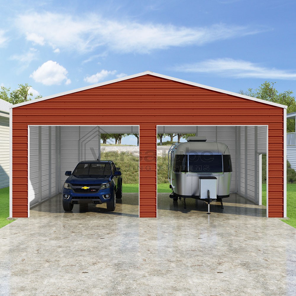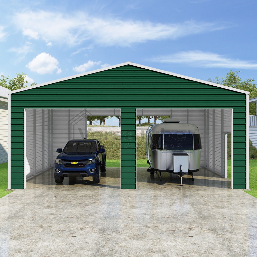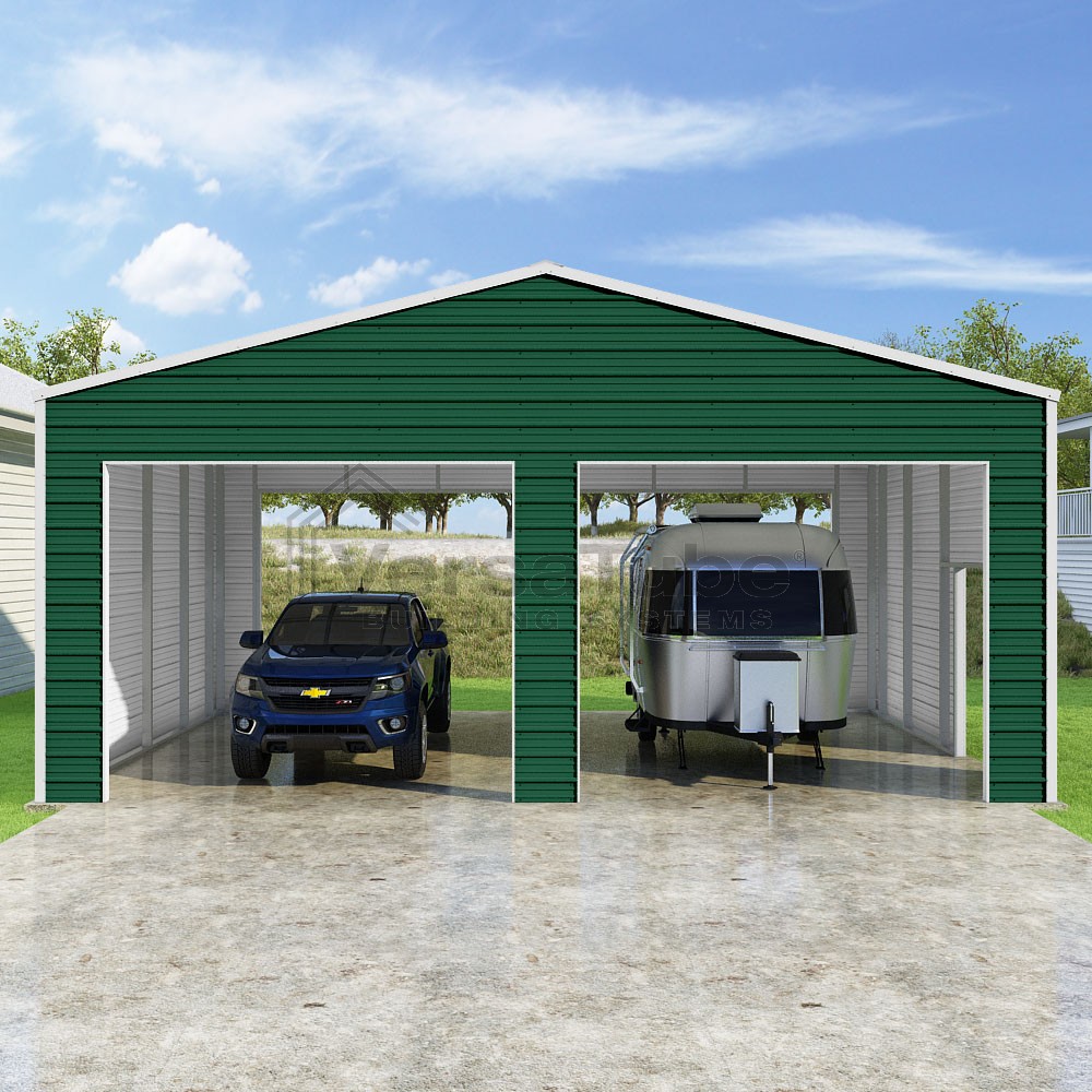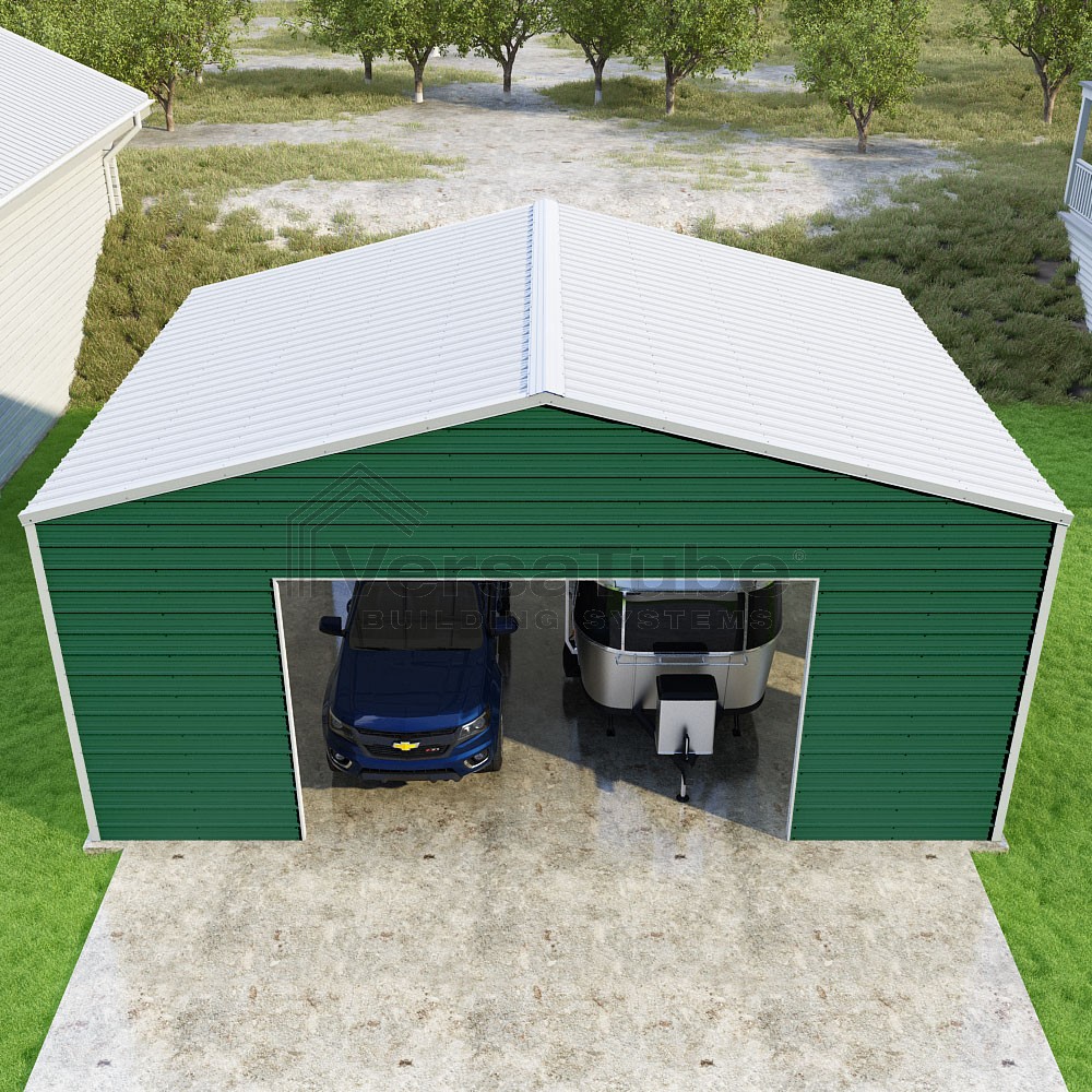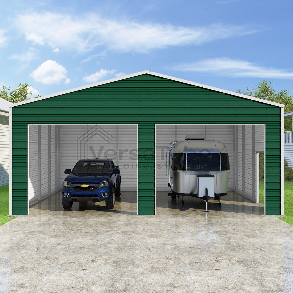 Frontier Series DIY garage kit features vertical sheet metal roof panels with horizontal siding panels..