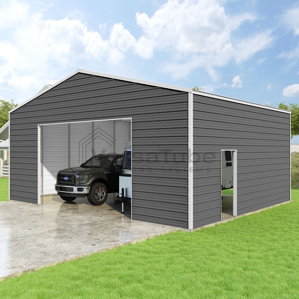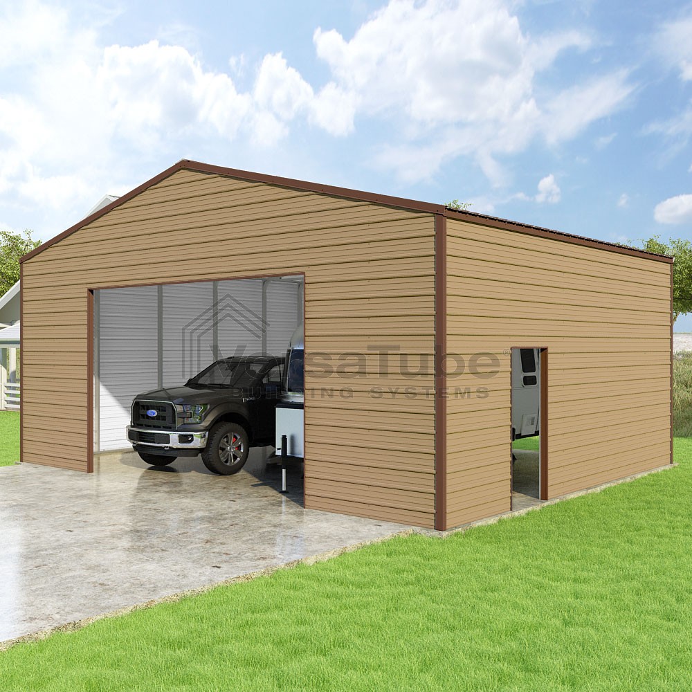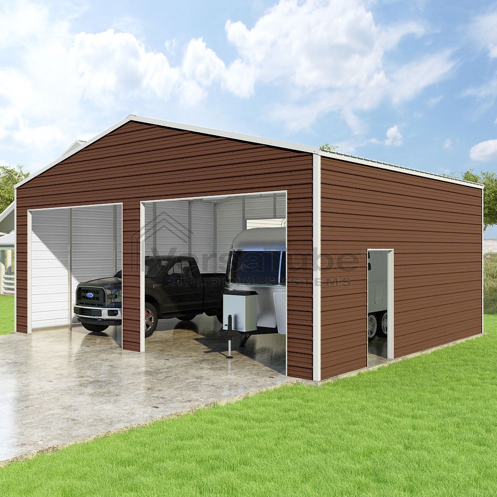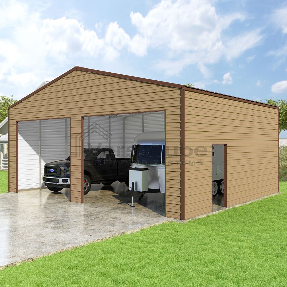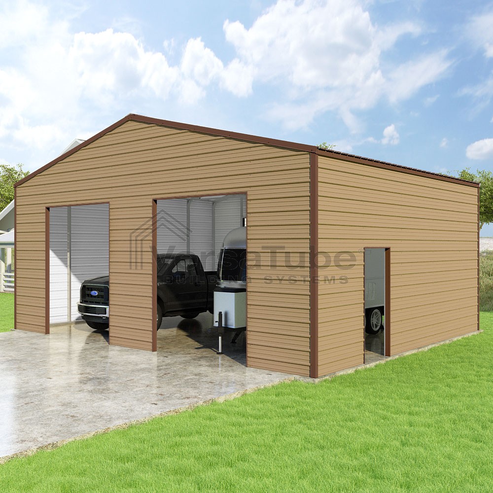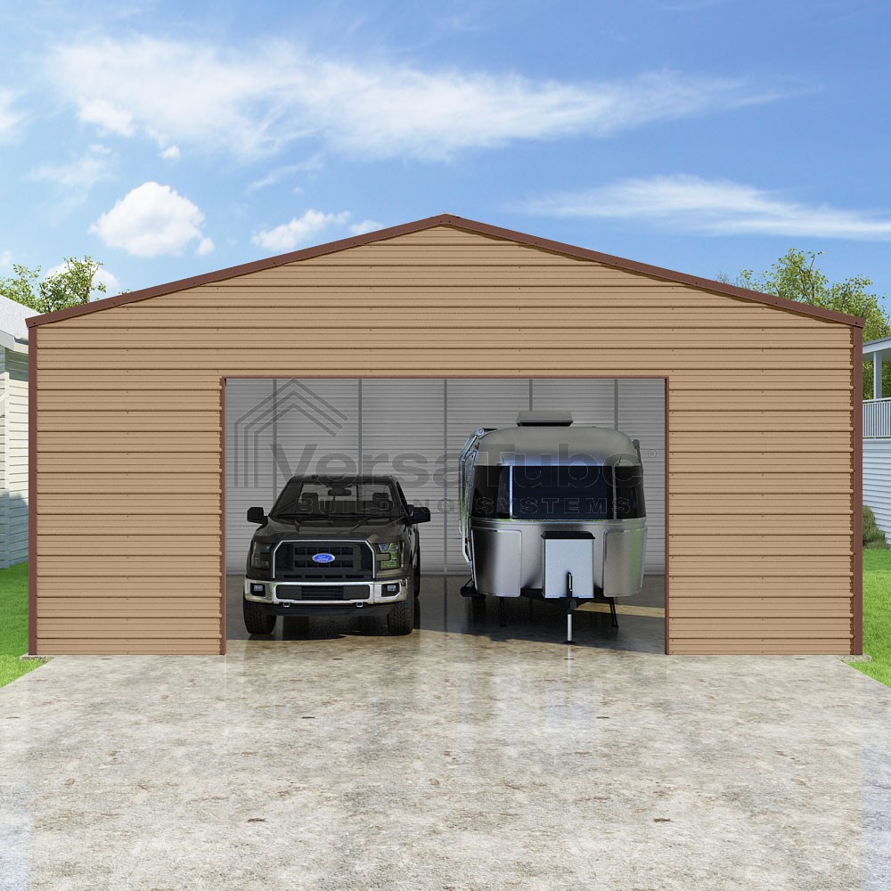 Frontier Series DIY garage kit features vertical sheet metal roof panels with horizontal siding panels..