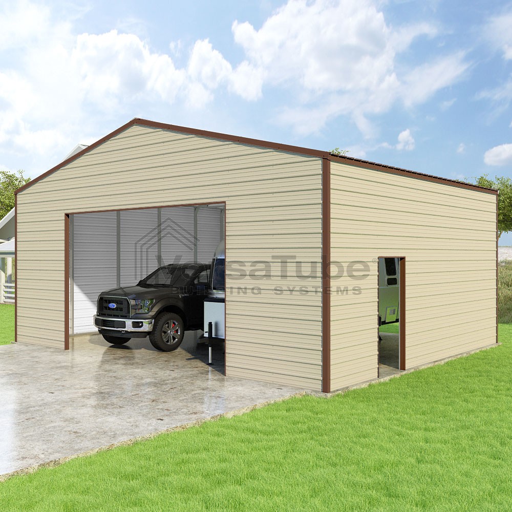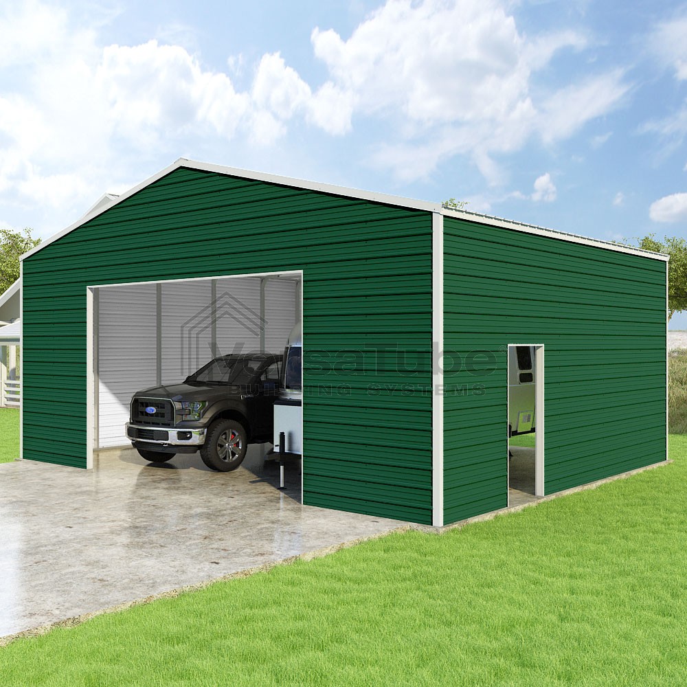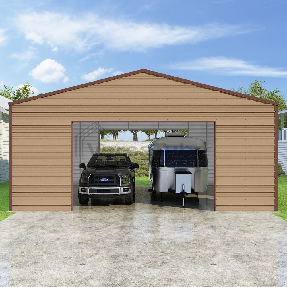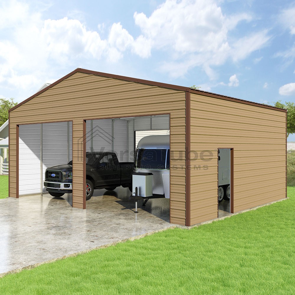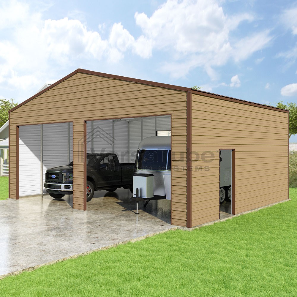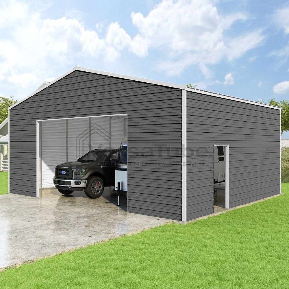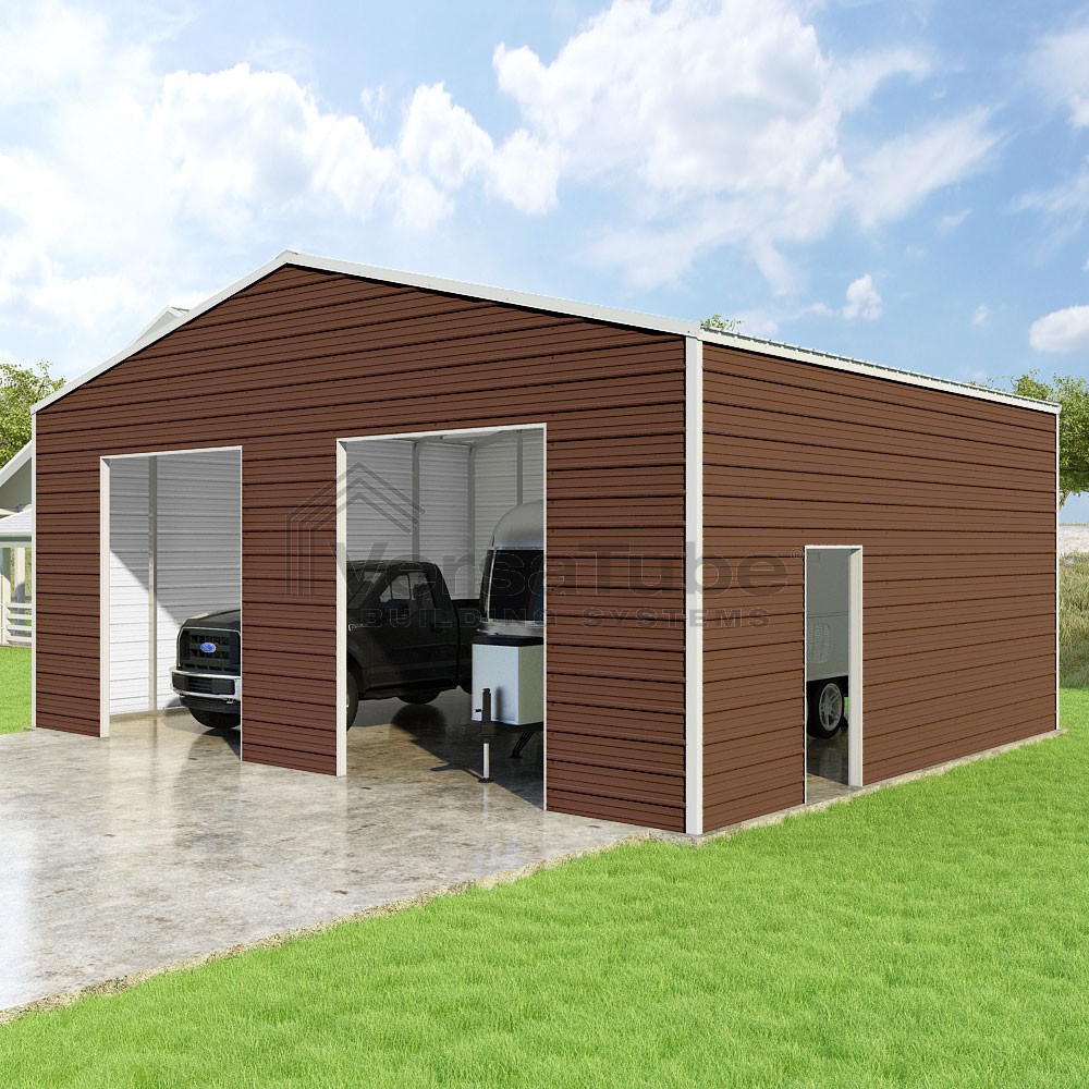 Frontier Series DIY garage kit features vertical sheet metal roof panels with horizontal siding panels..