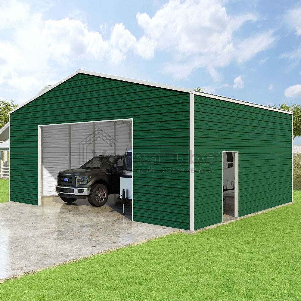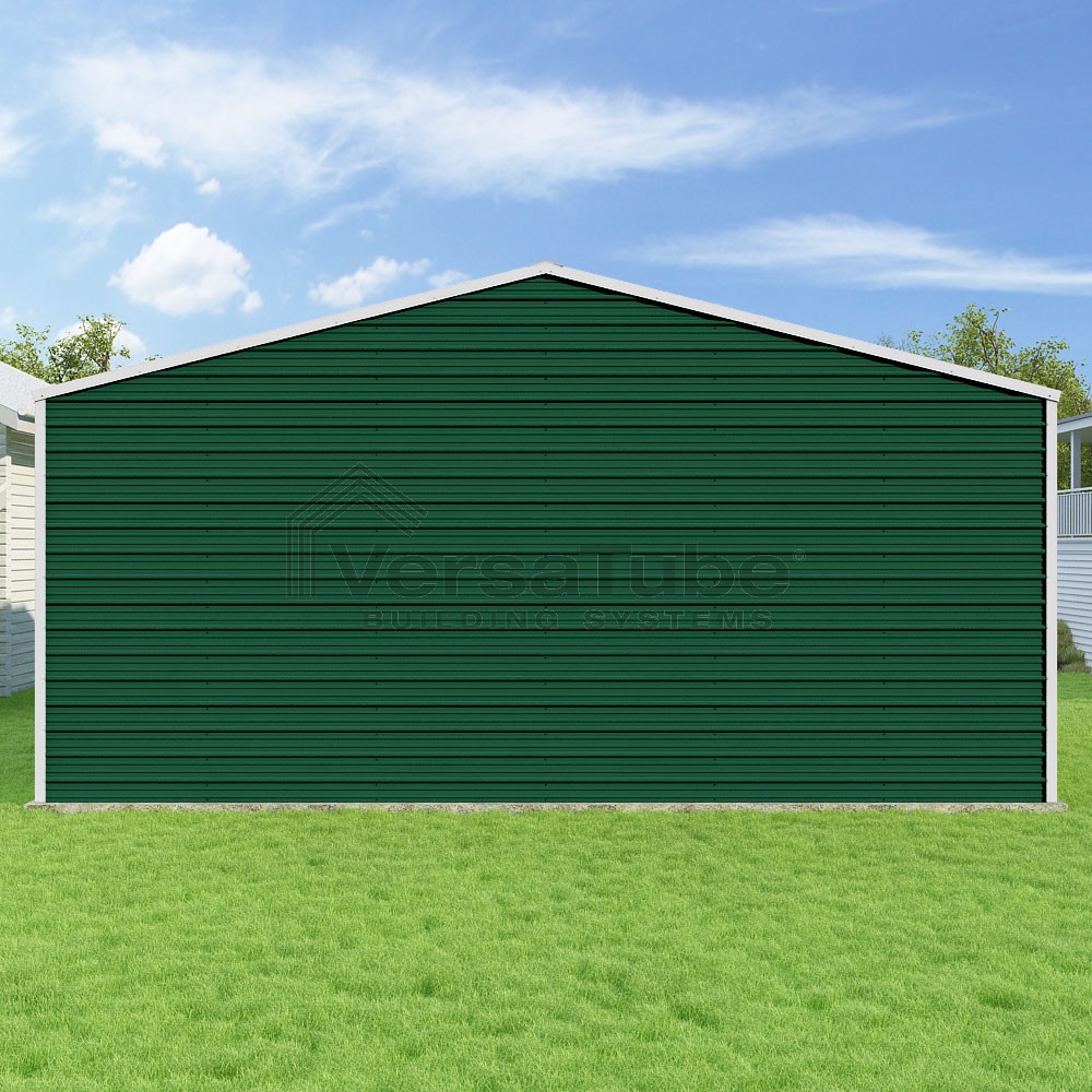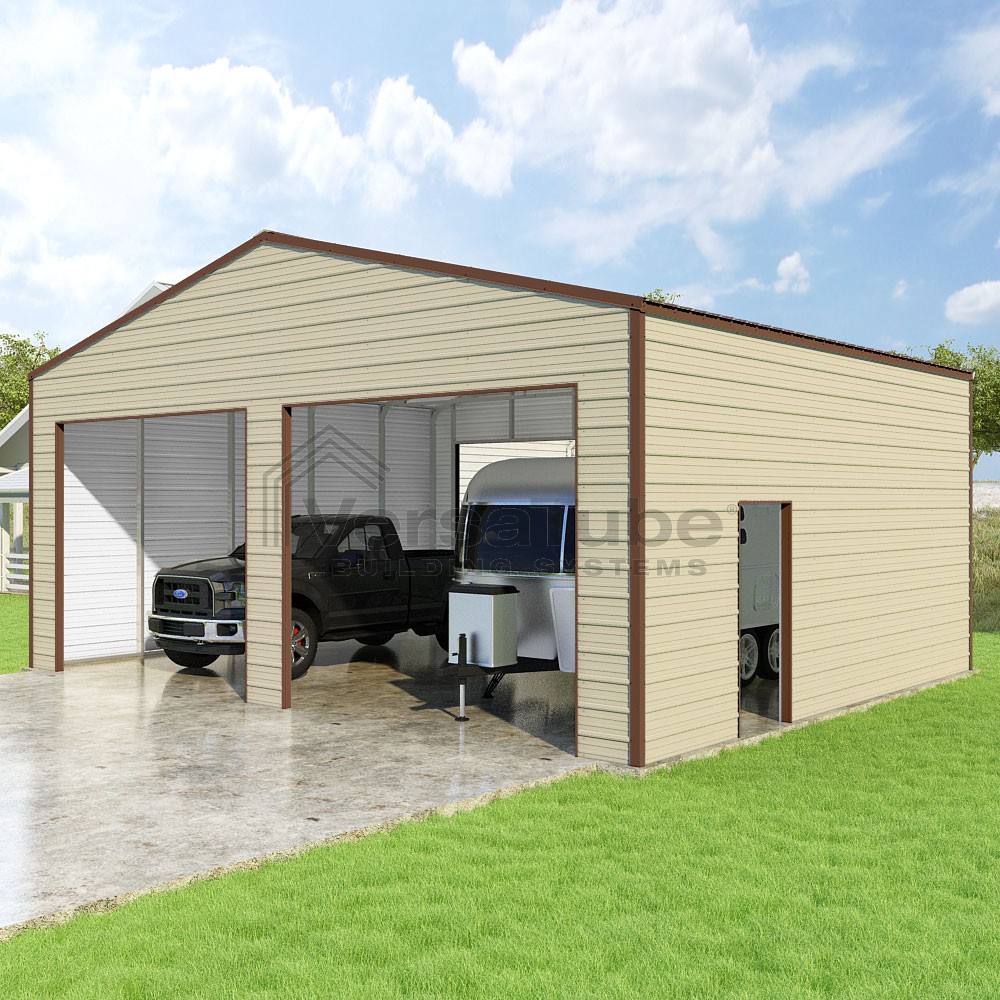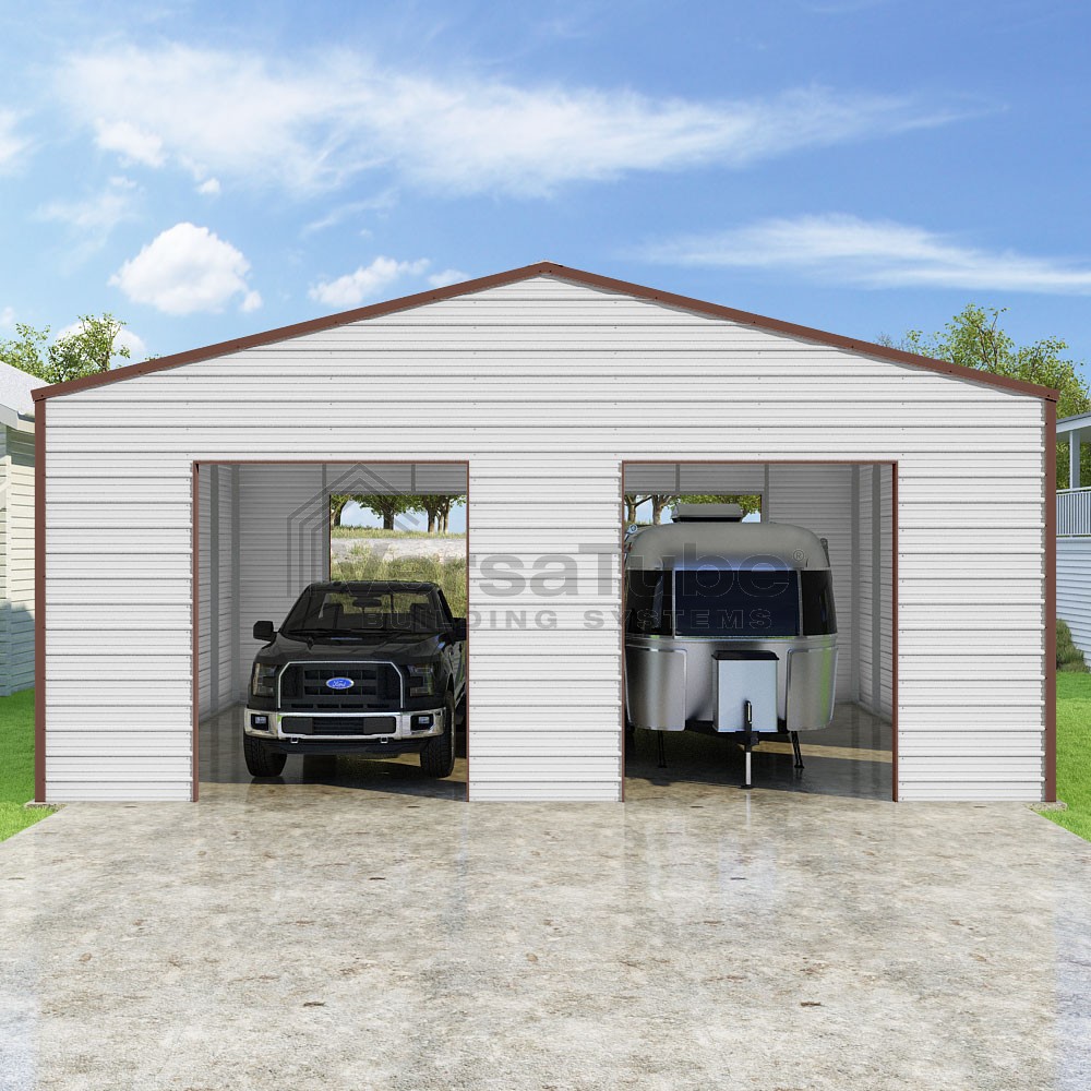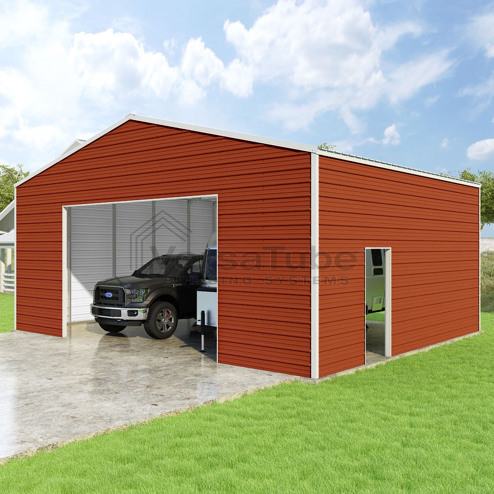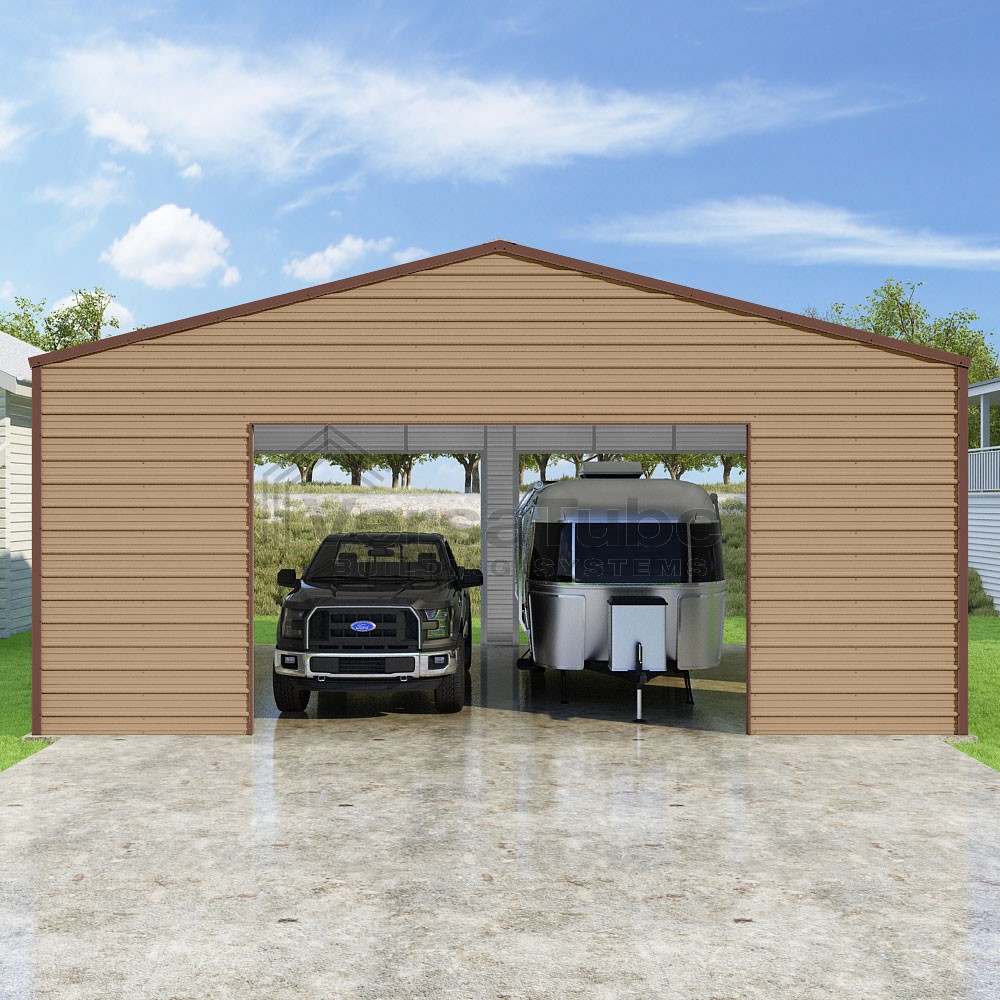 Frontier Series DIY garage kit features vertical sheet metal roof panels with horizontal siding panels..