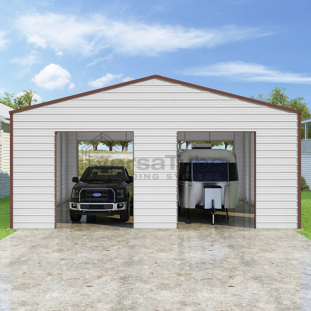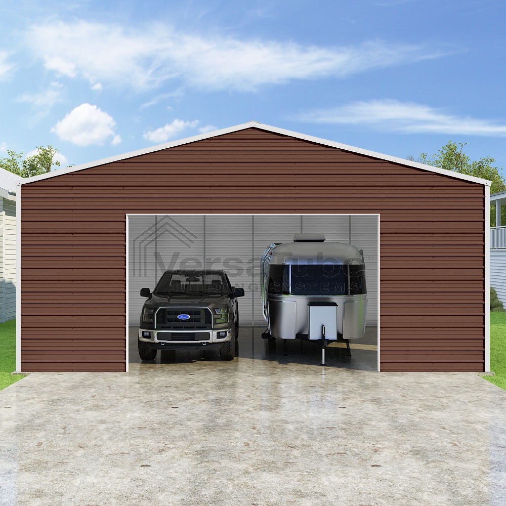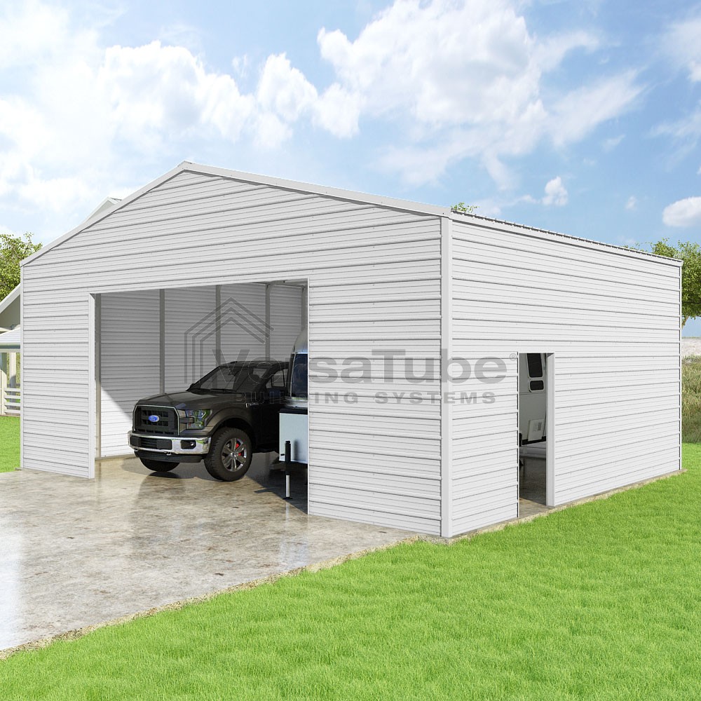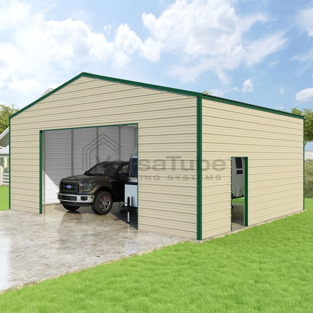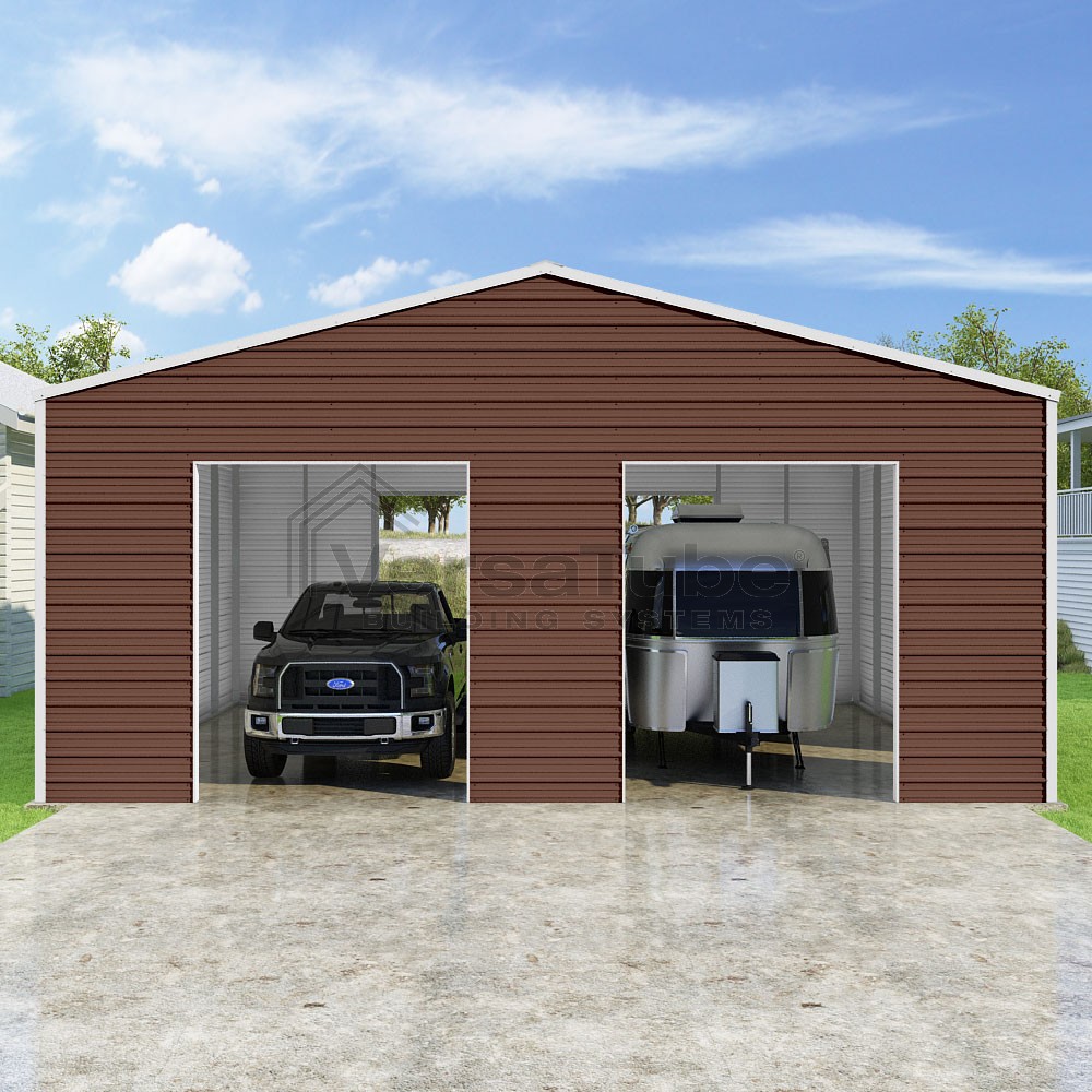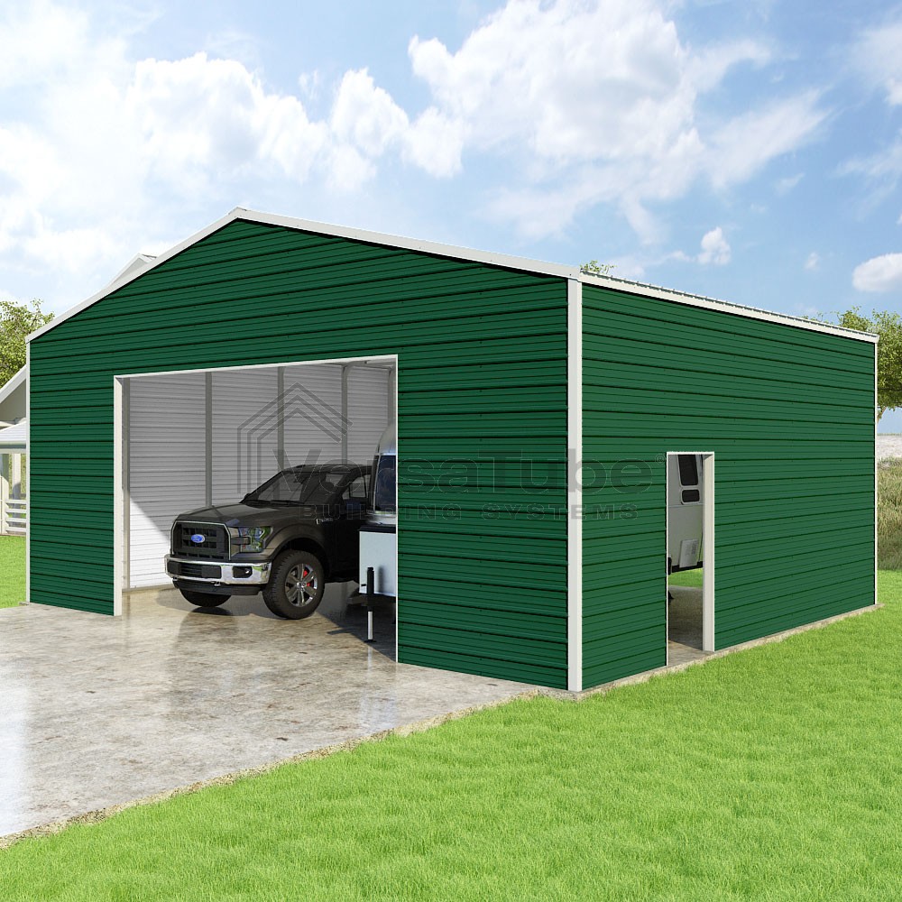 Frontier Series DIY garage kit features vertical sheet metal roof panels with horizontal siding panels..