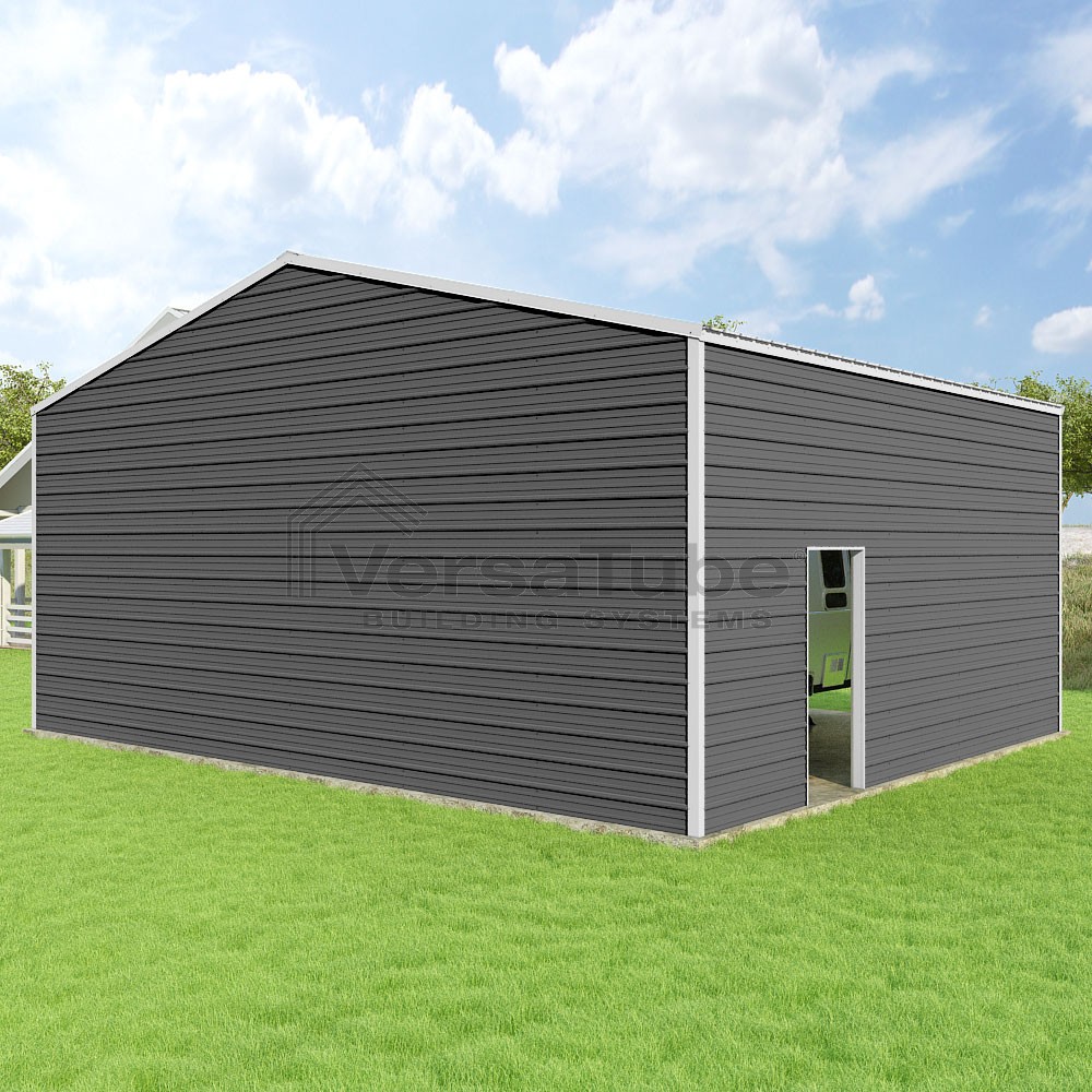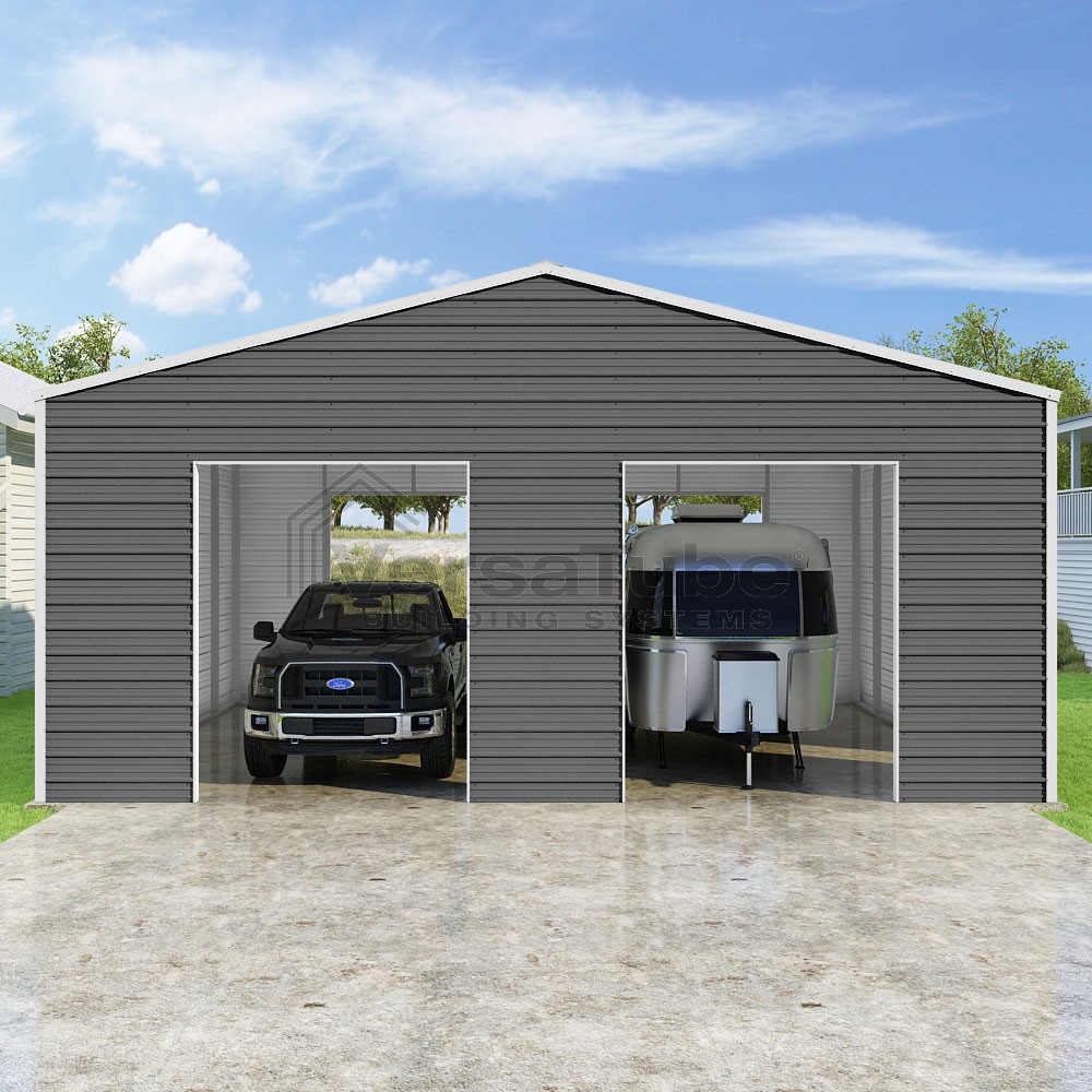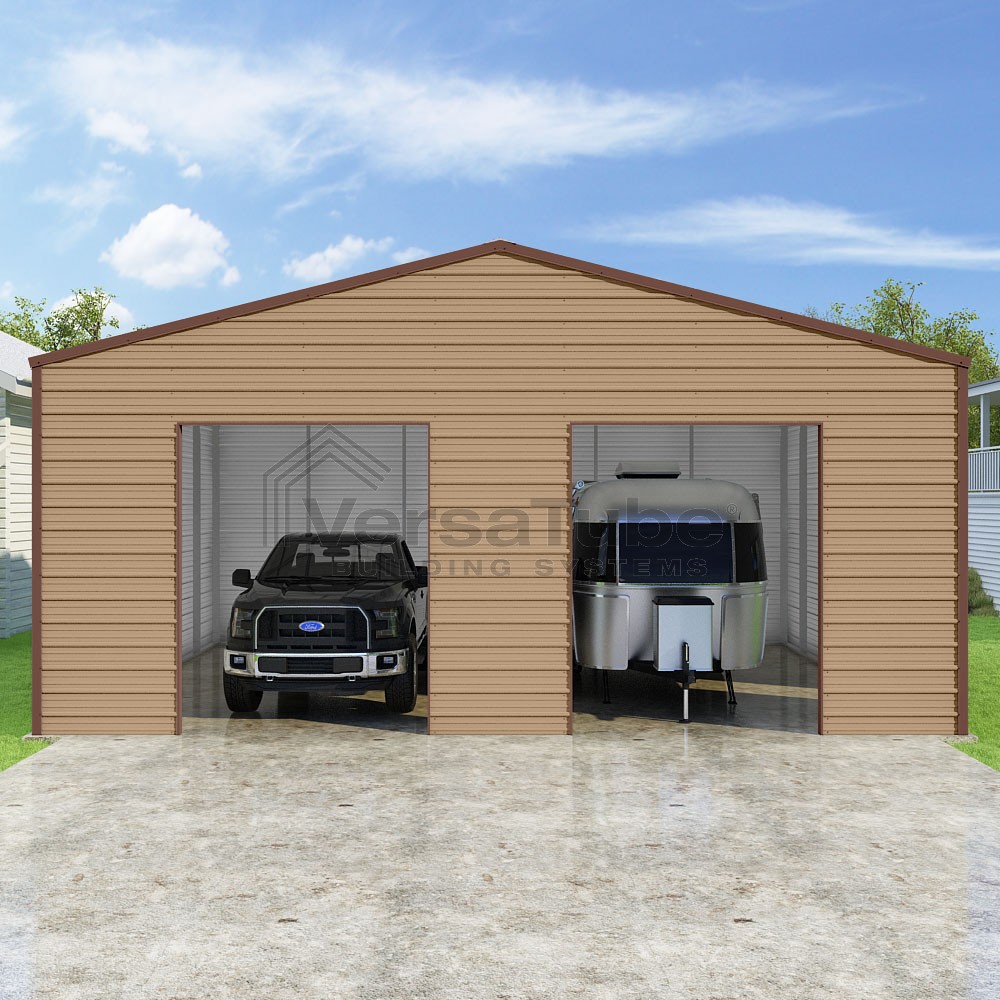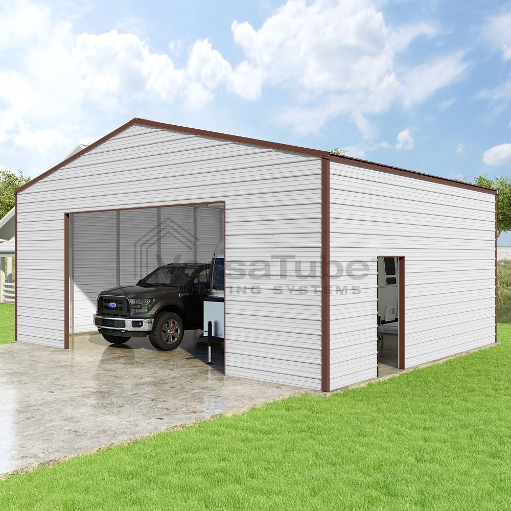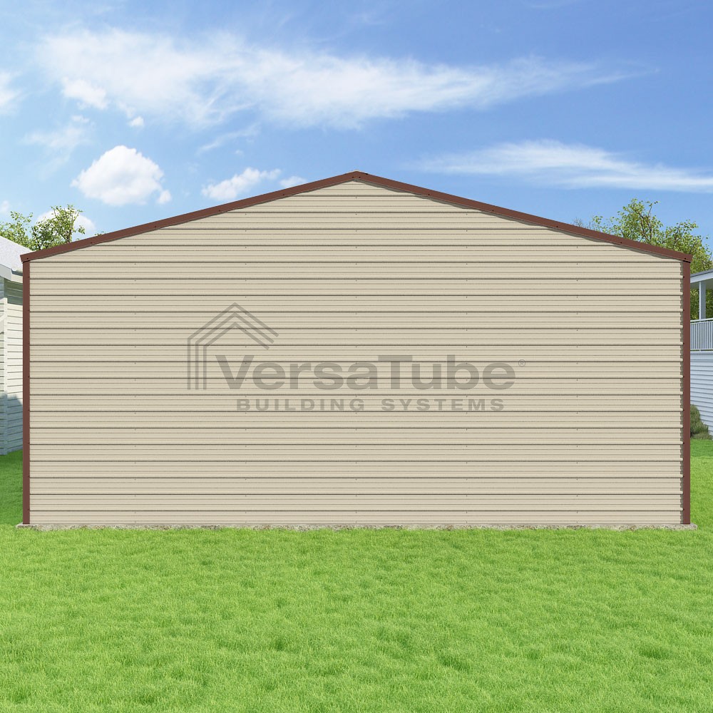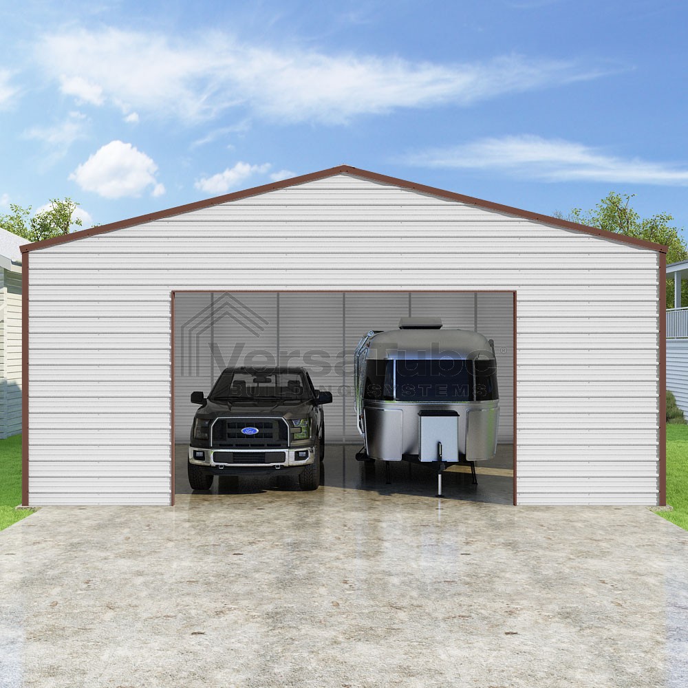 Frontier Series DIY garage kit features vertical sheet metal roof panels with horizontal siding panels..