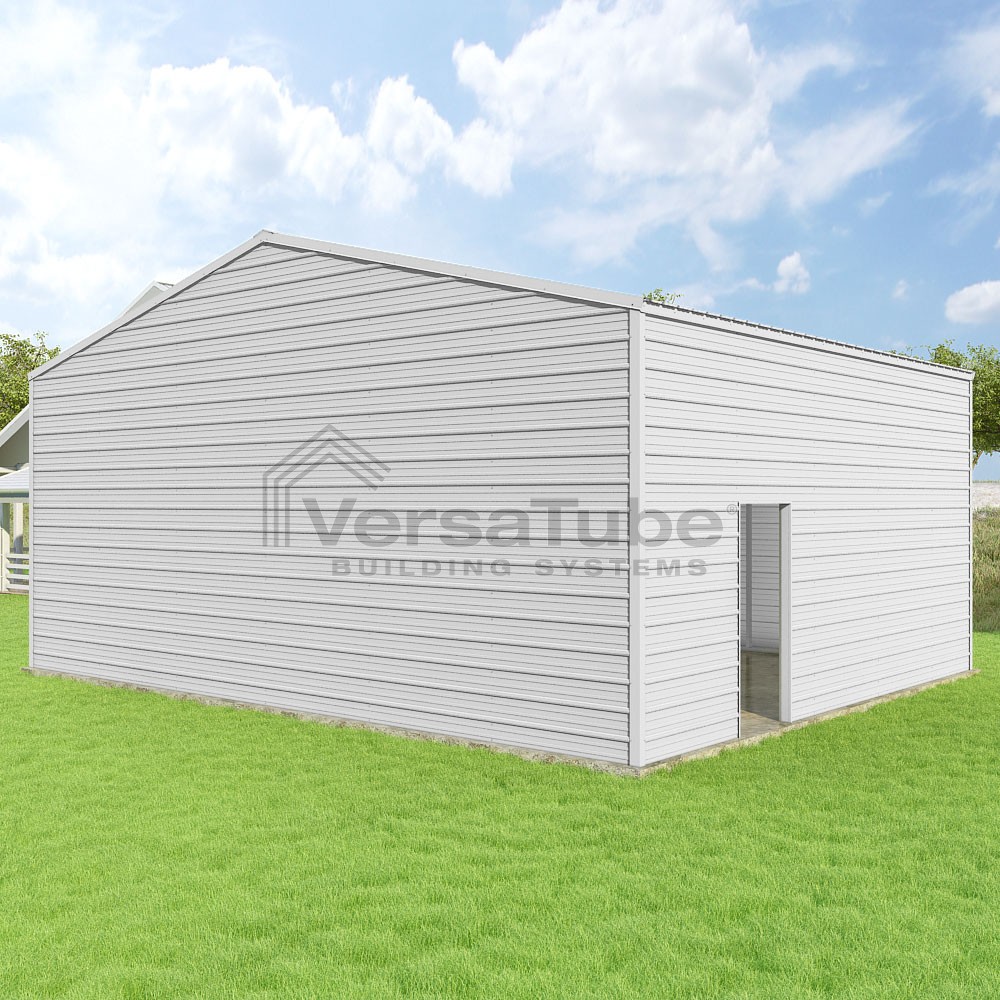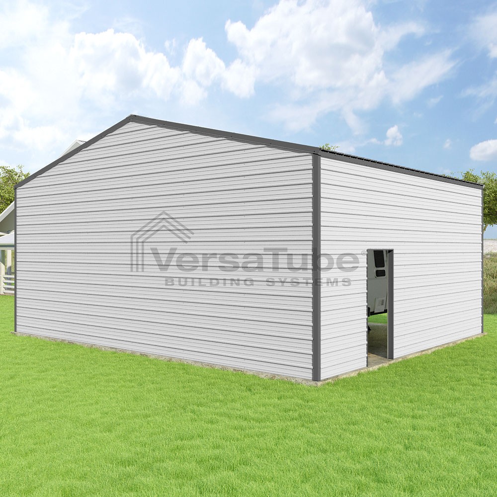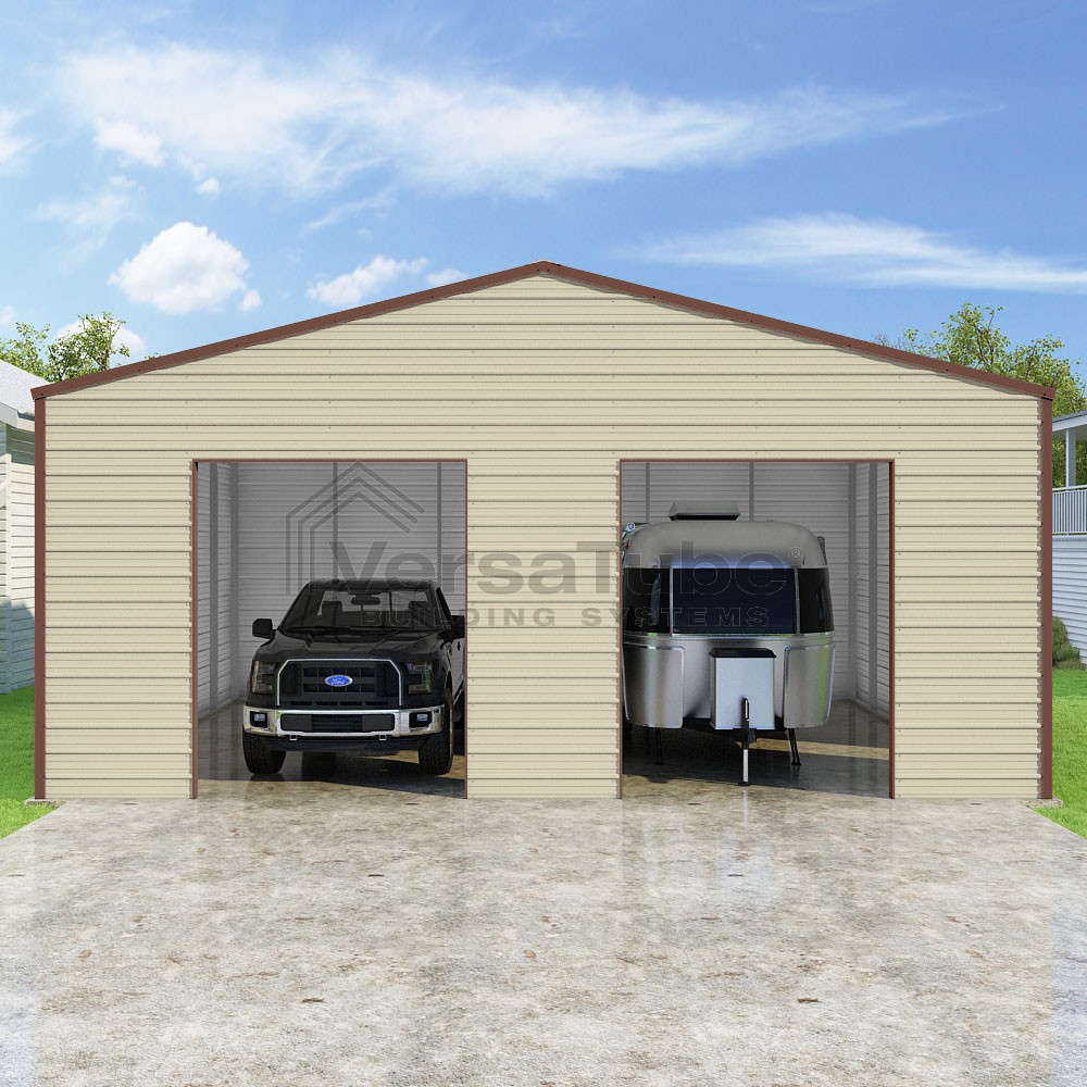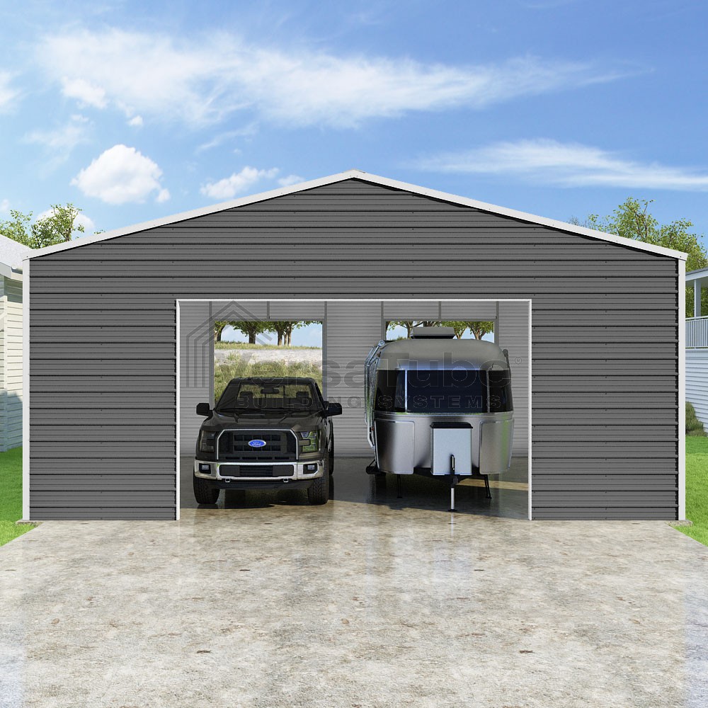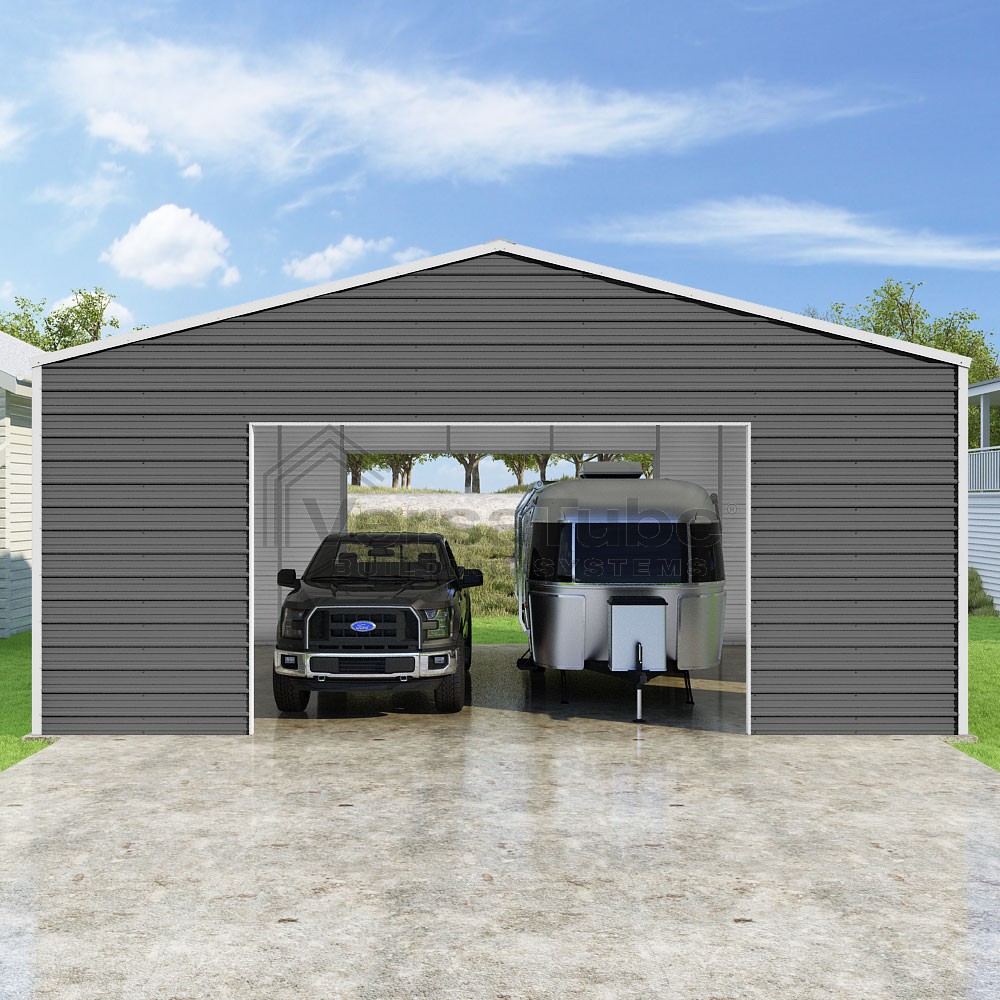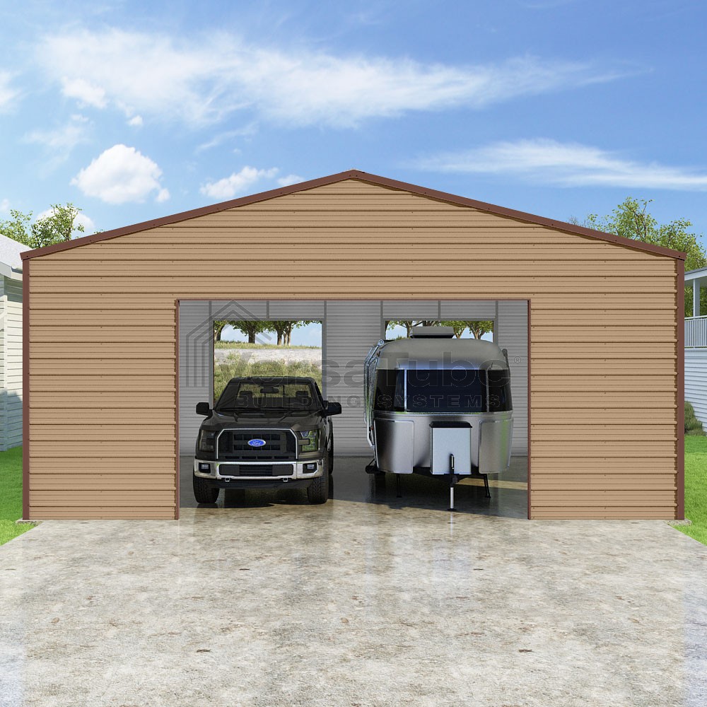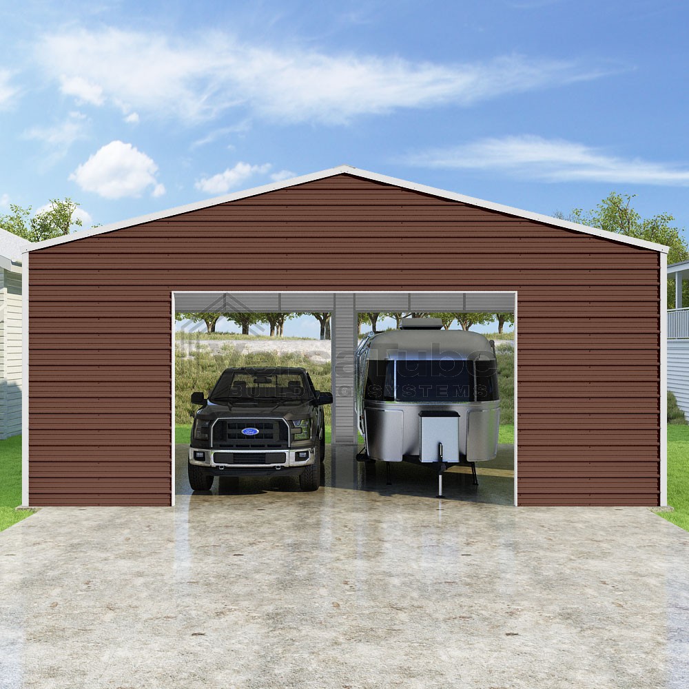 Frontier Series DIY garage kit features vertical sheet metal roof panels with horizontal siding panels..