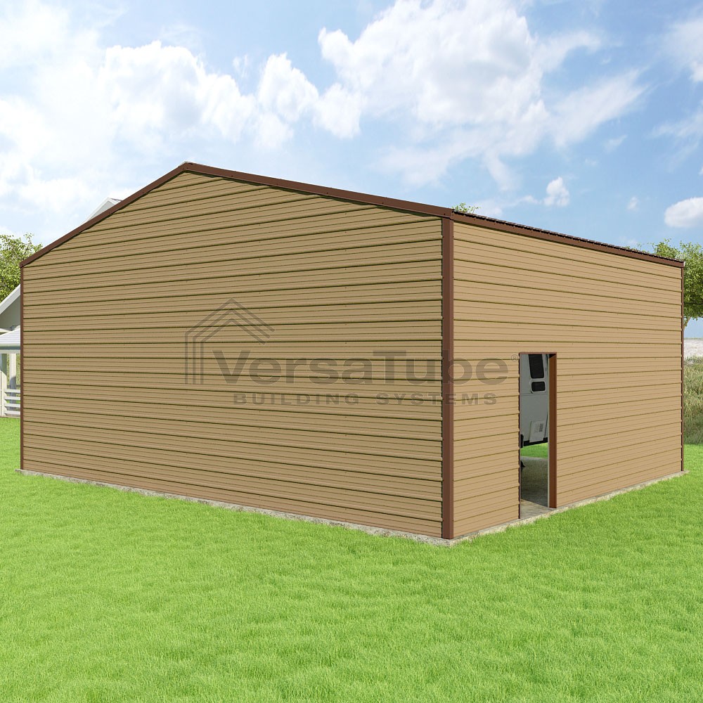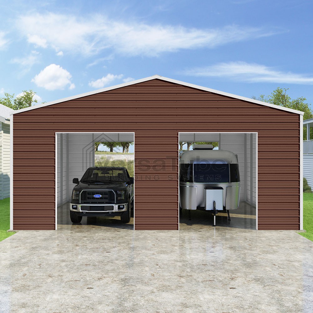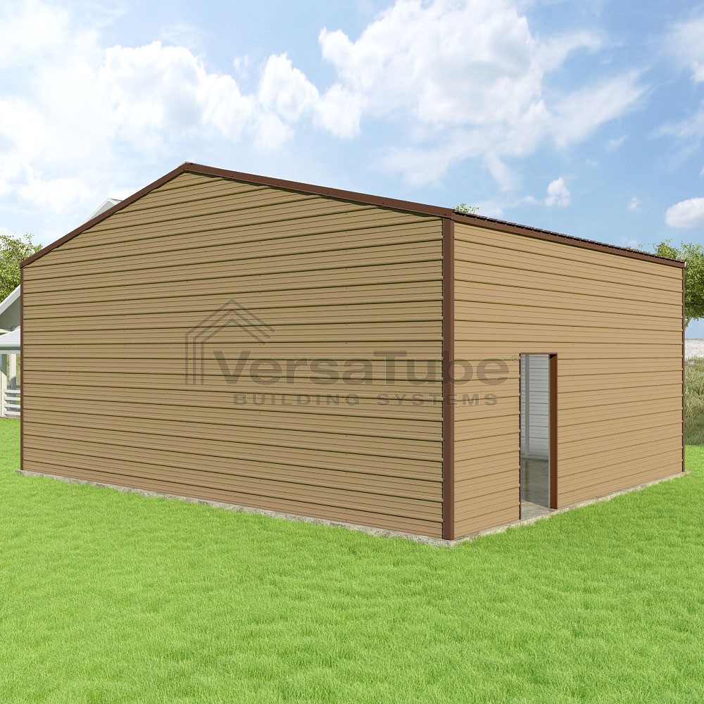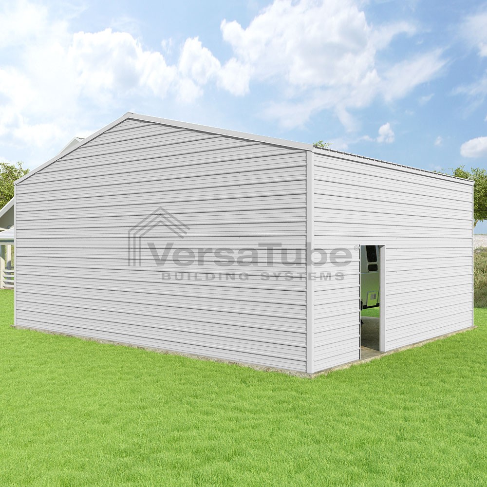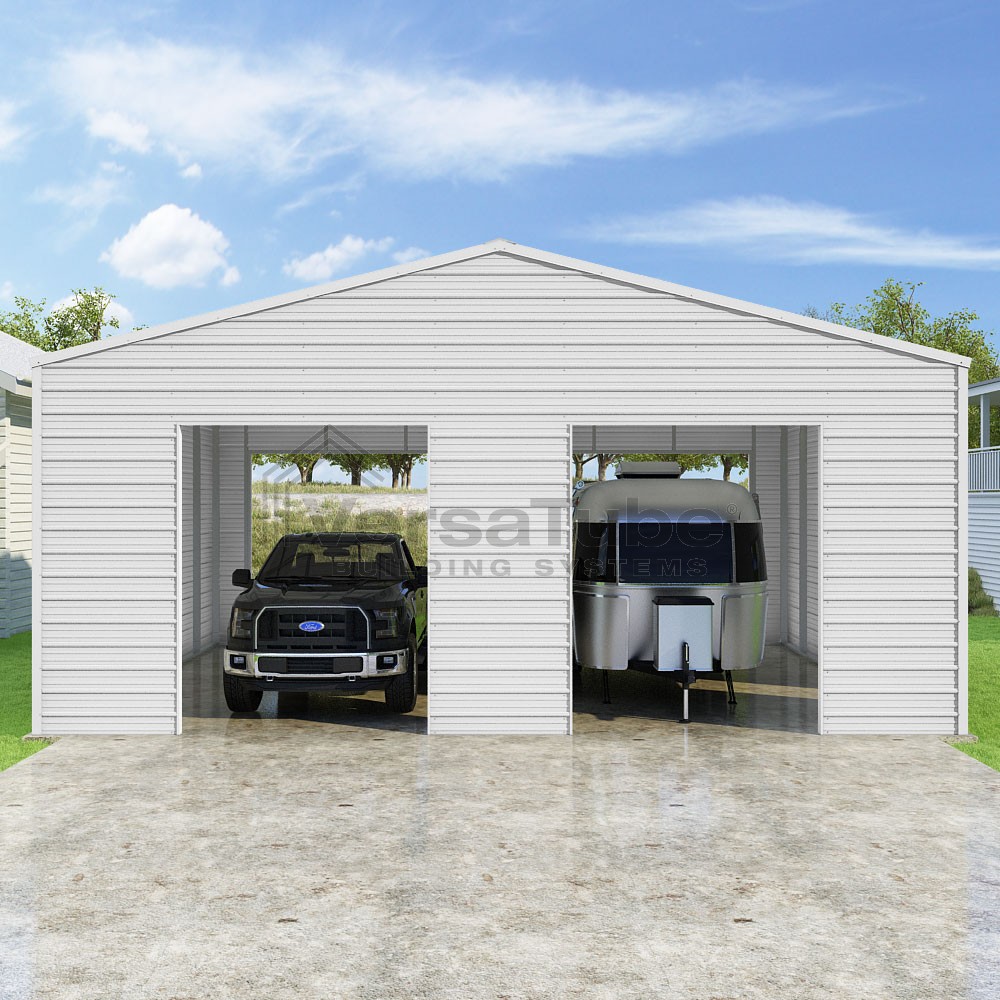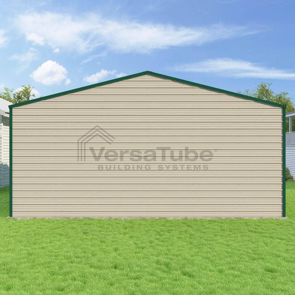 Frontier Series DIY garage kit features vertical sheet metal roof panels with horizontal siding panels..