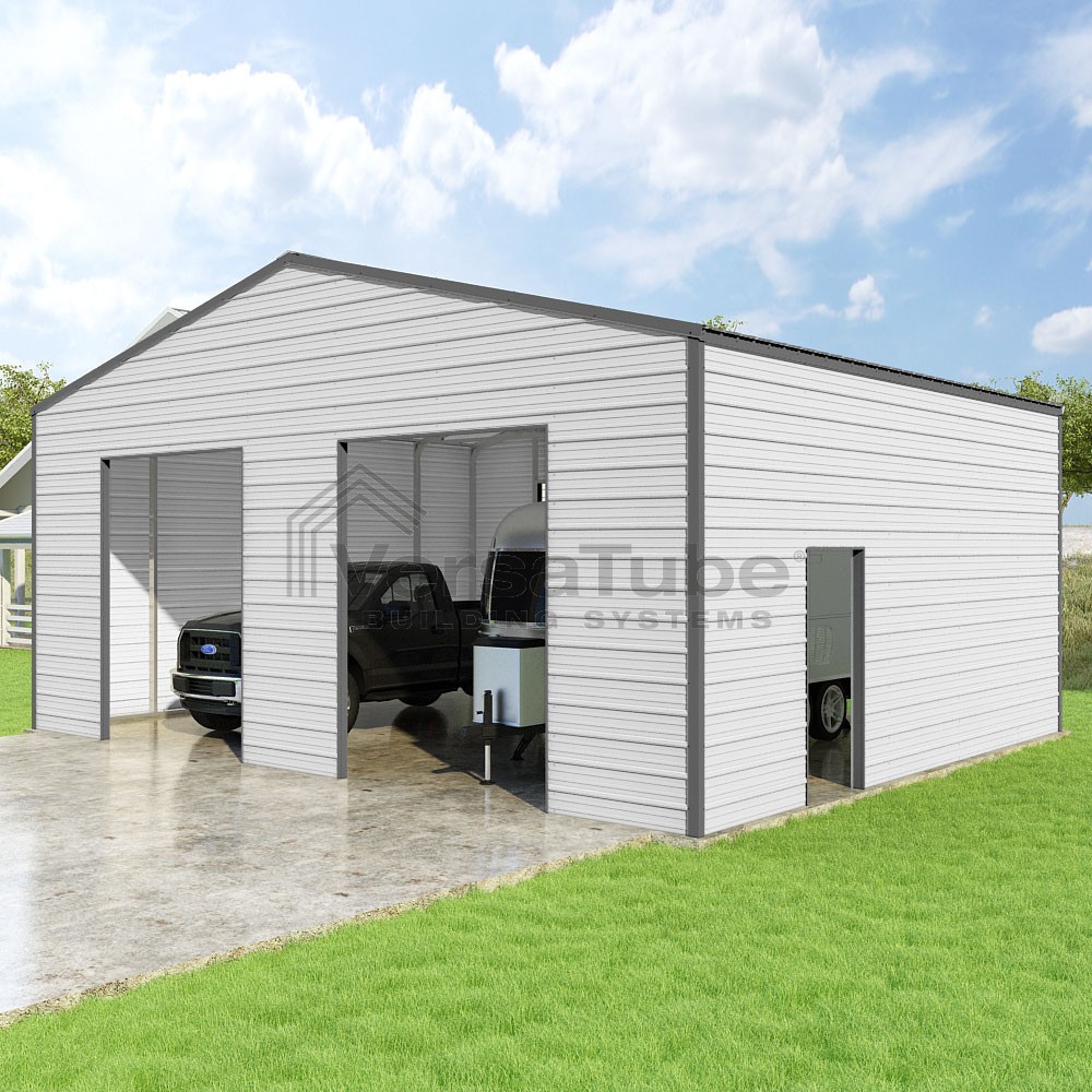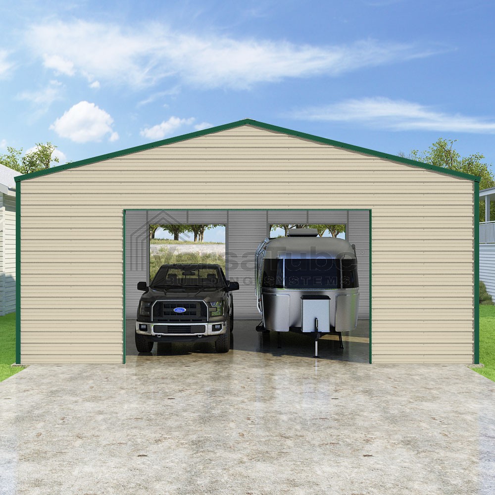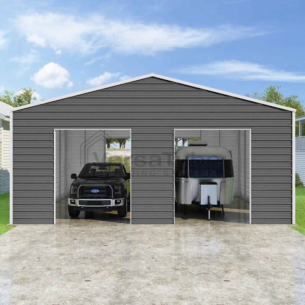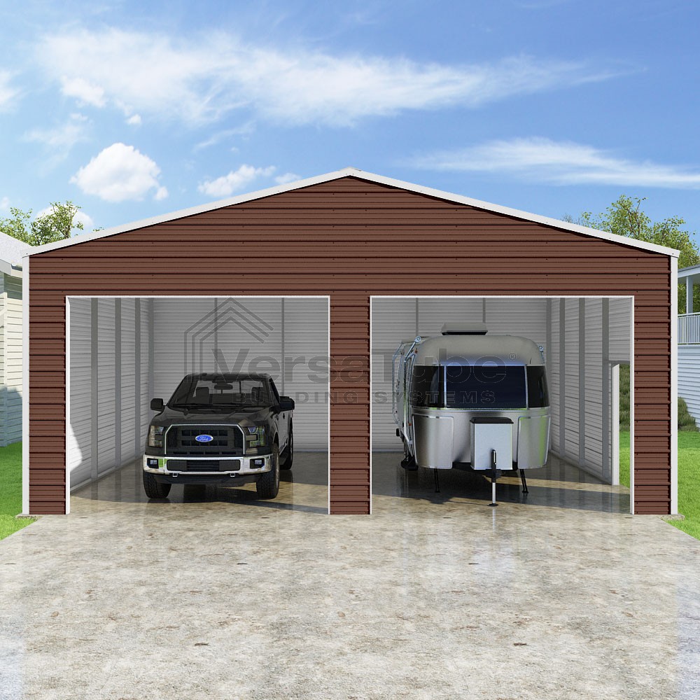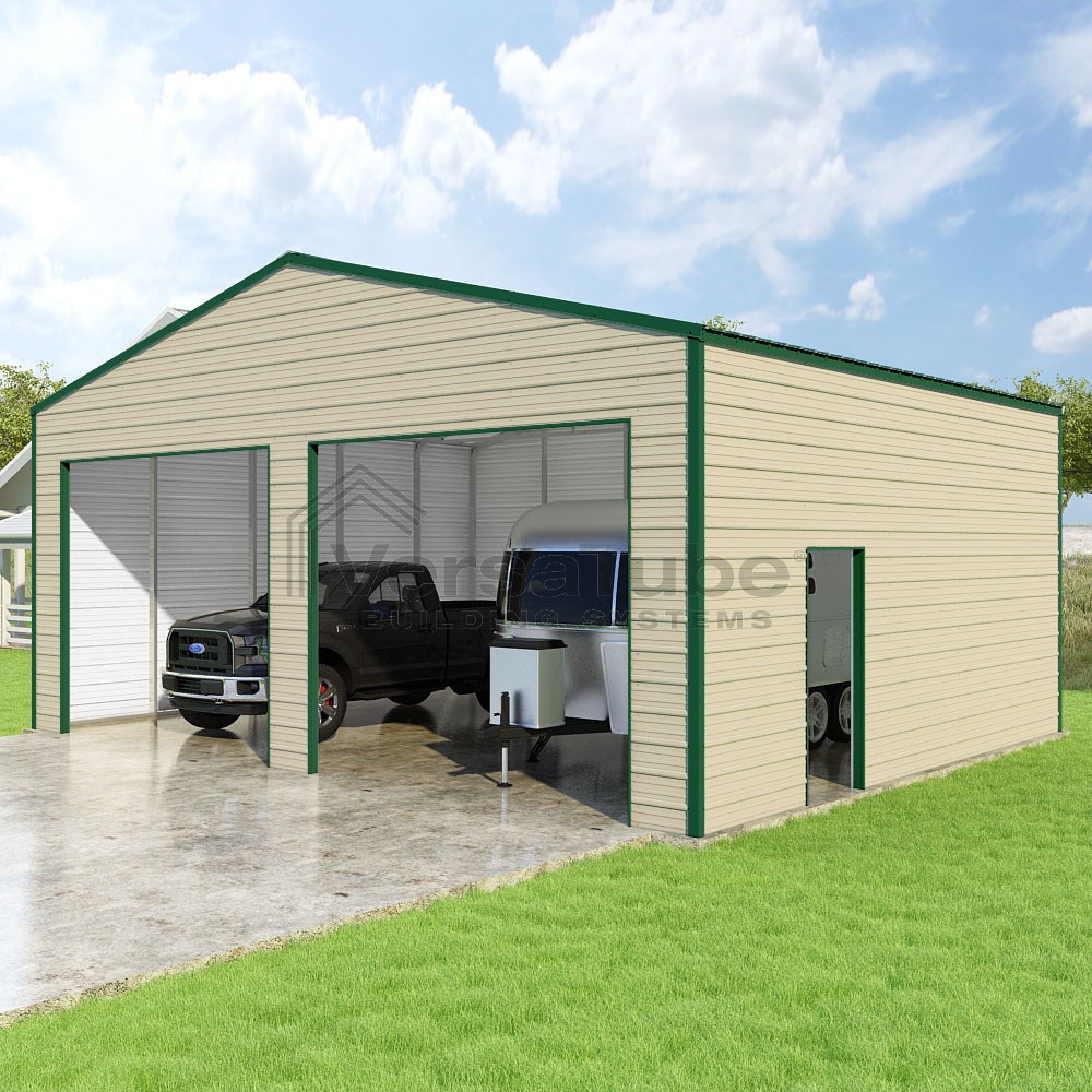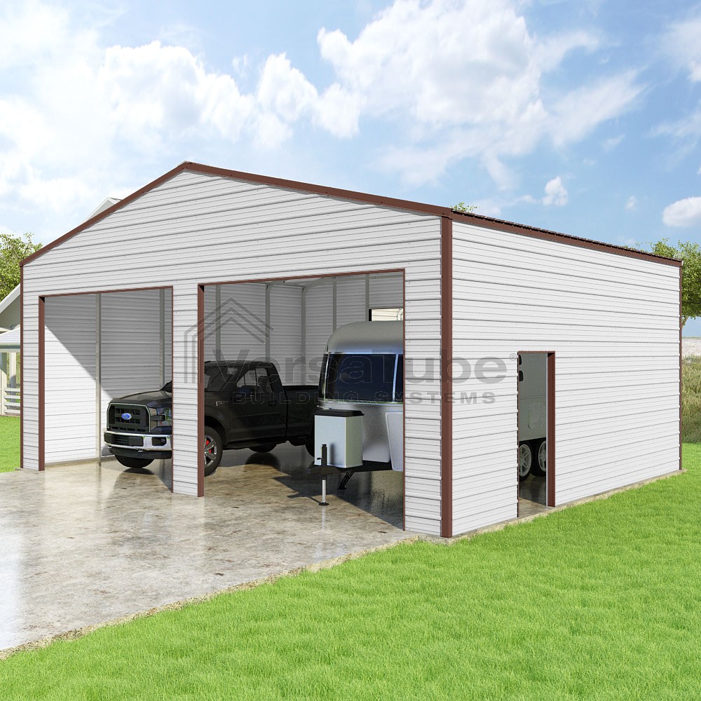 Frontier Series DIY garage kit features vertical sheet metal roof panels with horizontal siding panels..