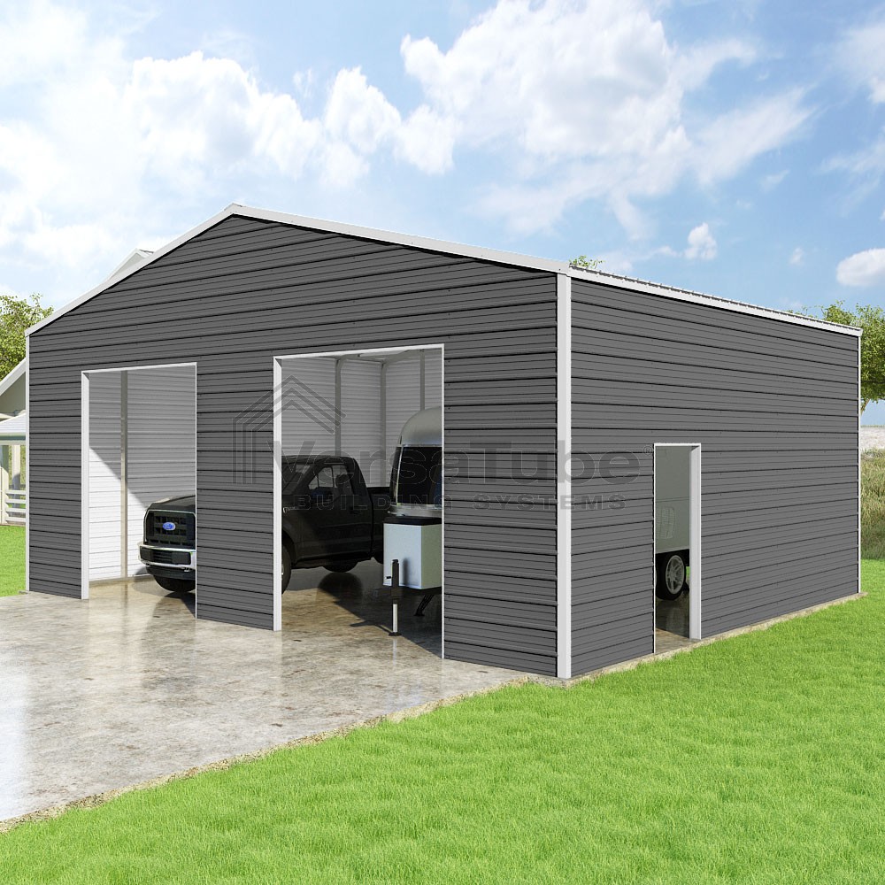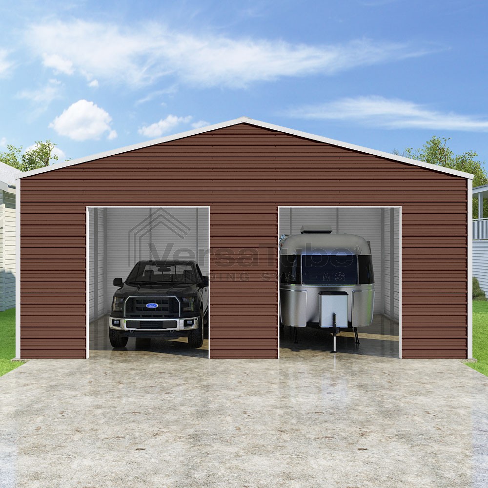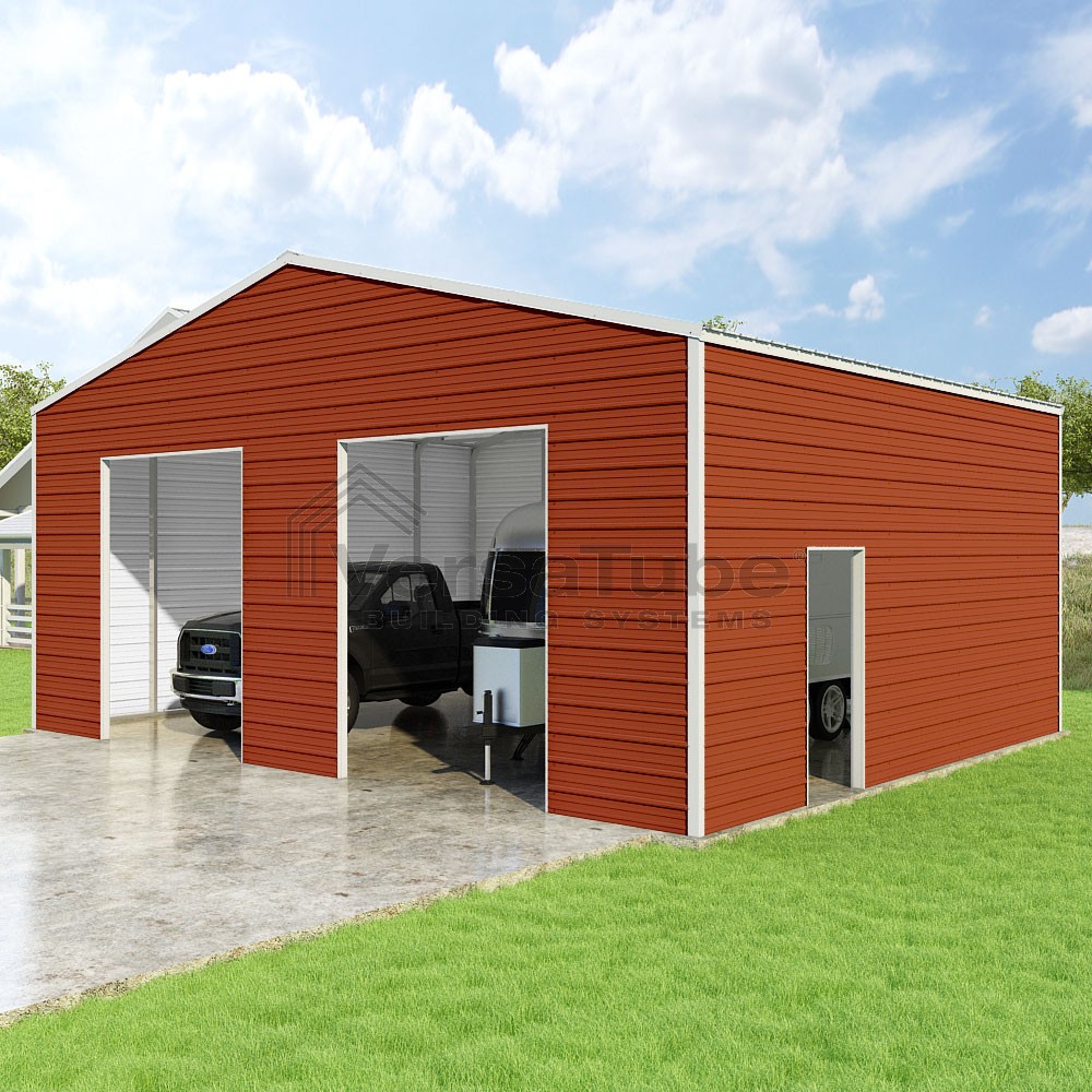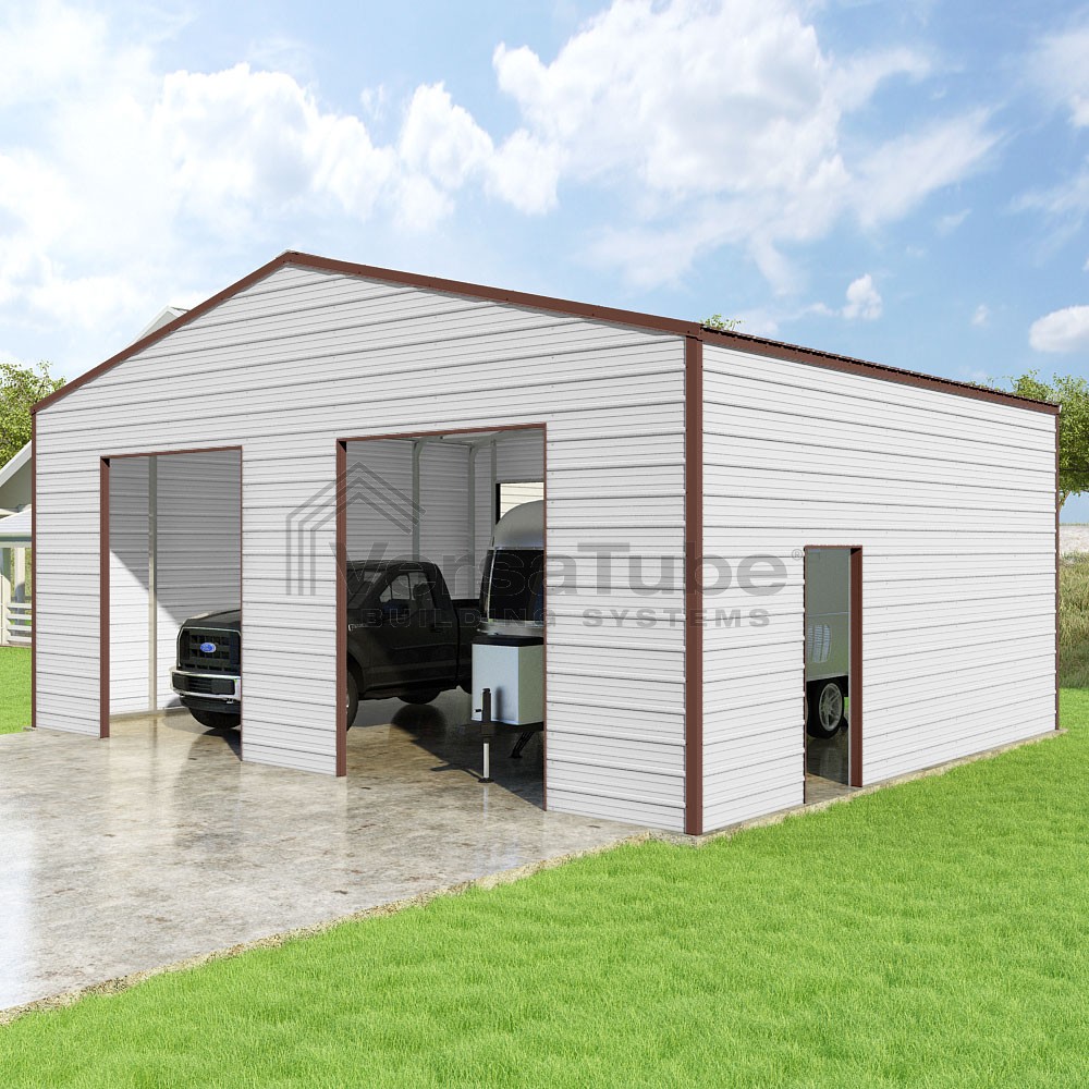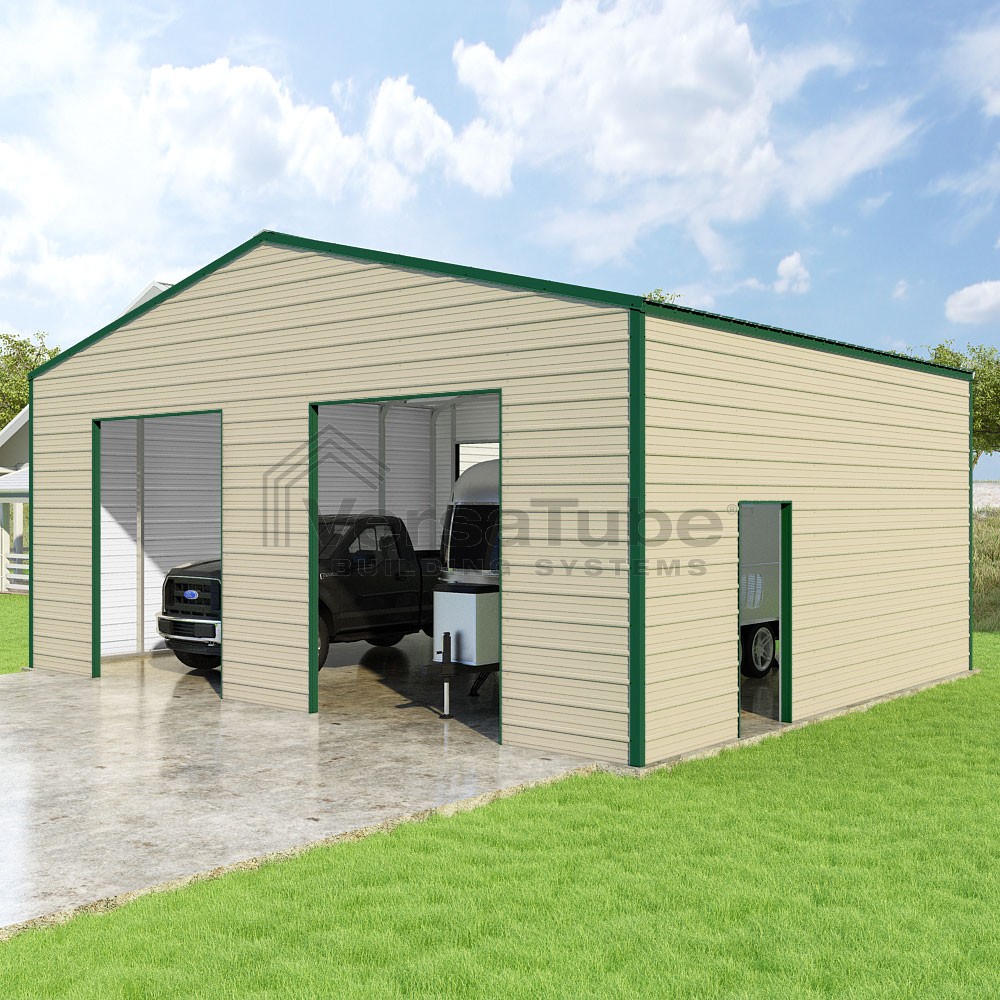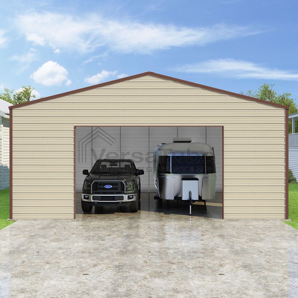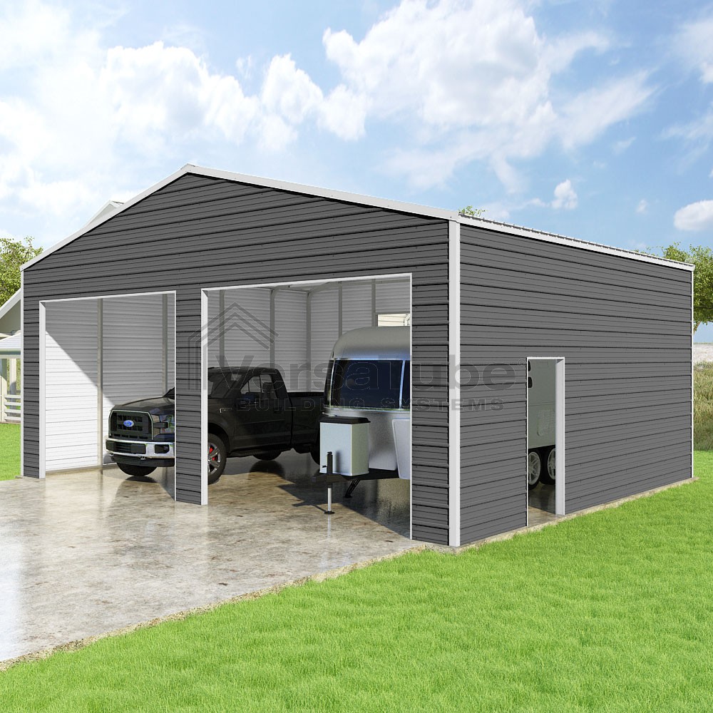 Frontier Series DIY garage kit features vertical sheet metal roof panels with horizontal siding panels..