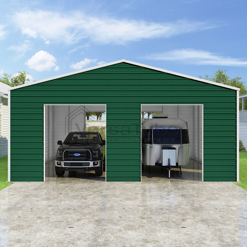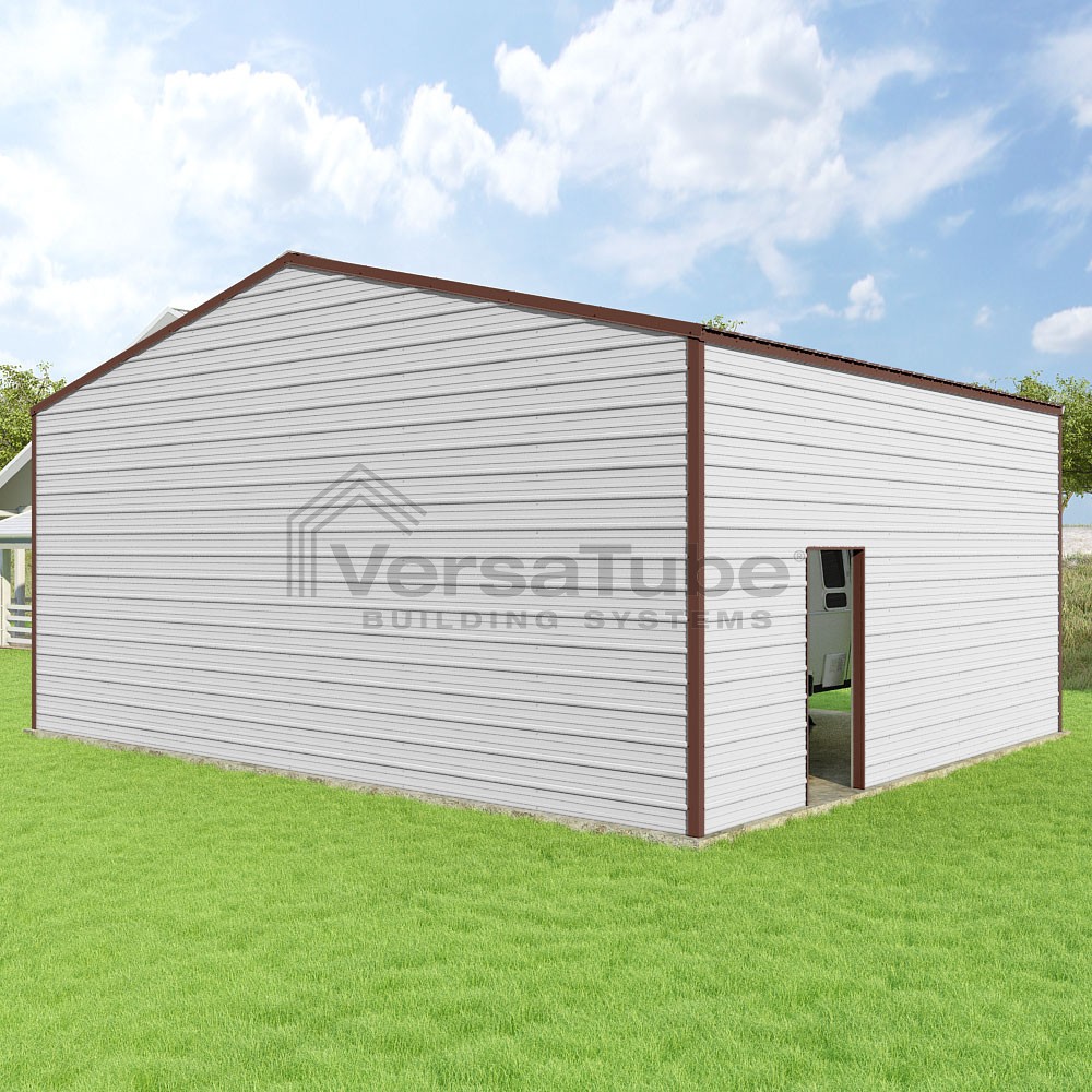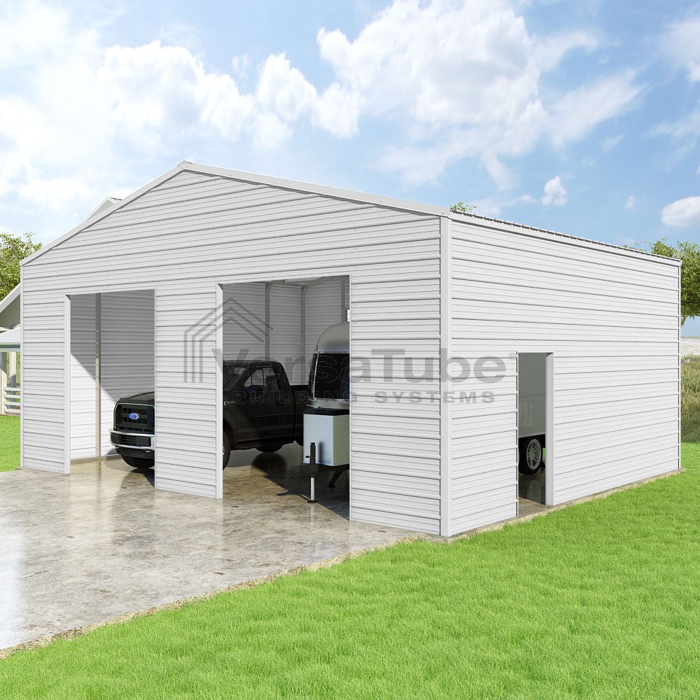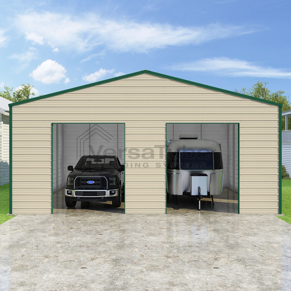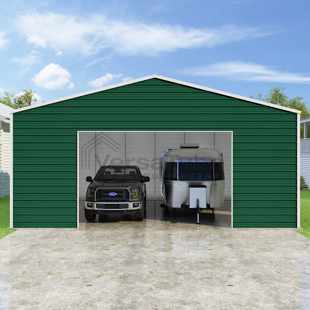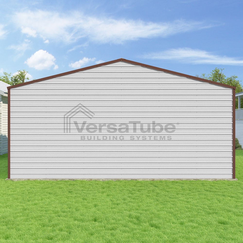 Frontier Series DIY garage kit features vertical sheet metal roof panels with horizontal siding panels..