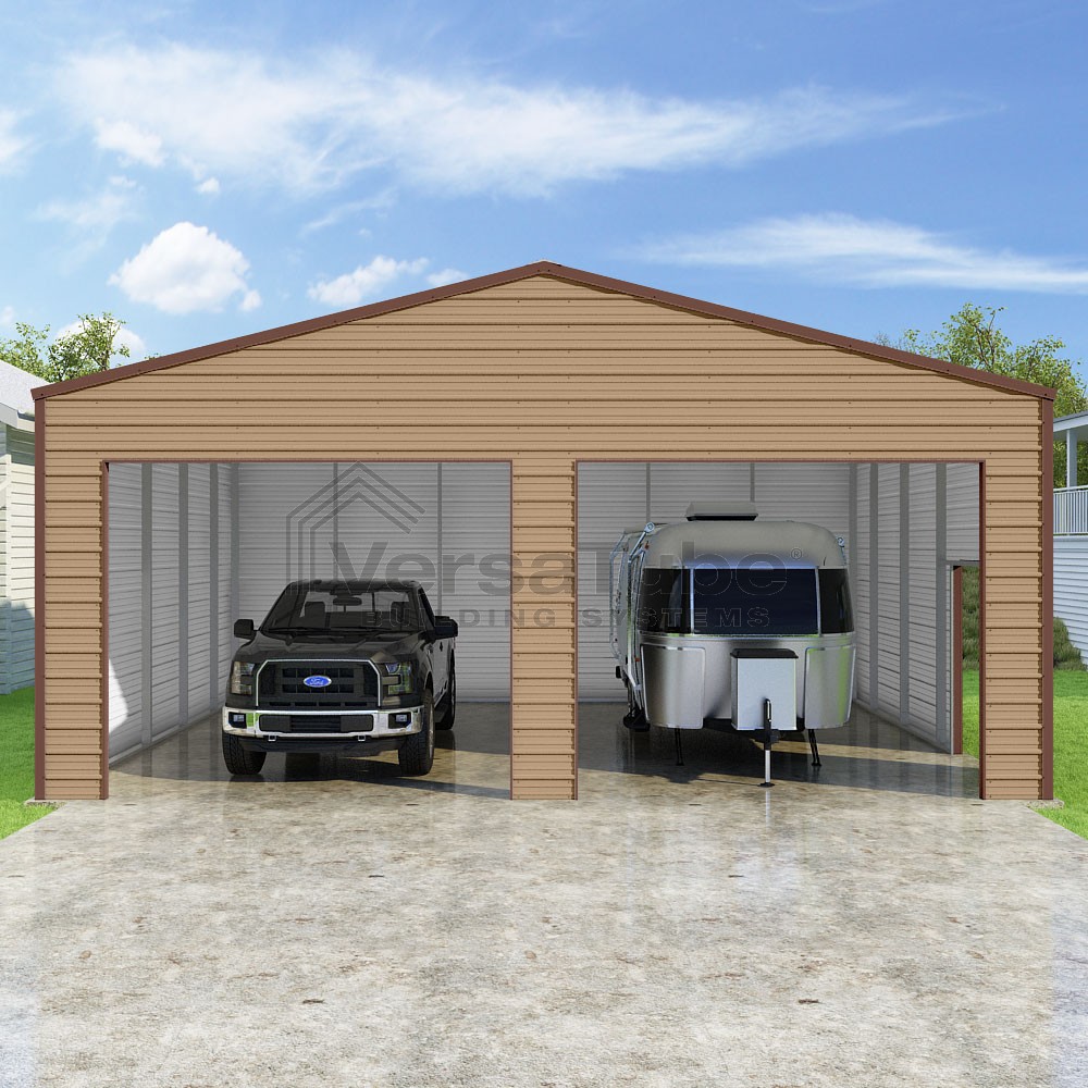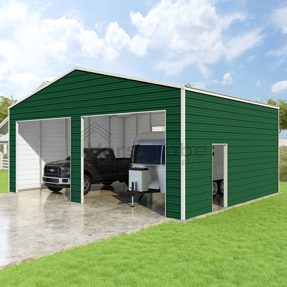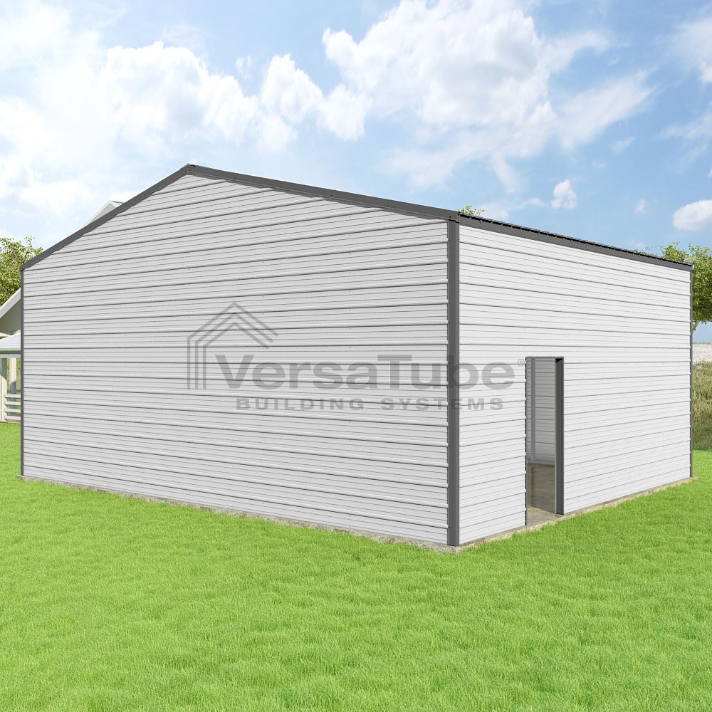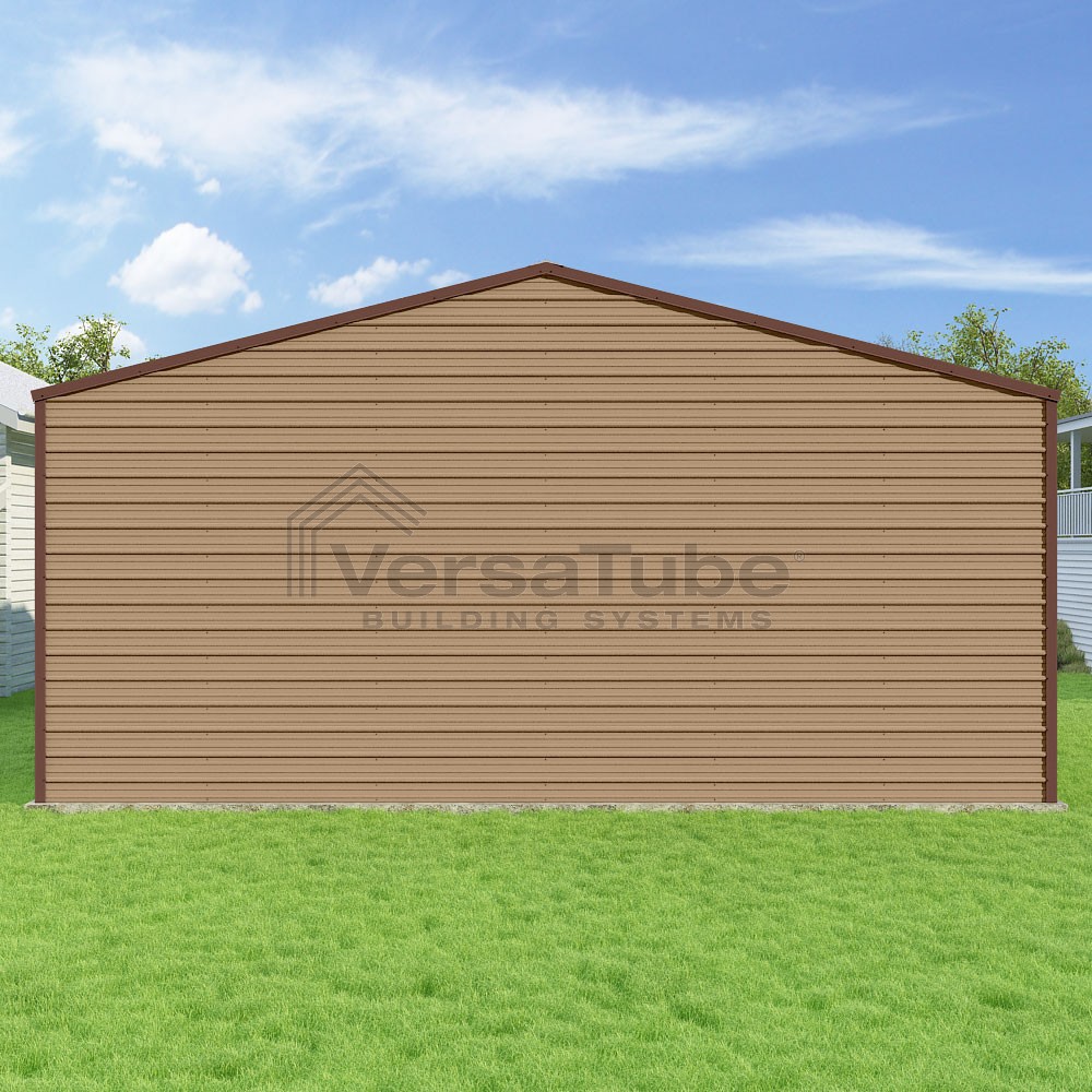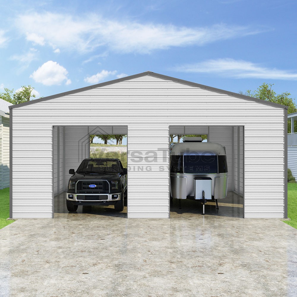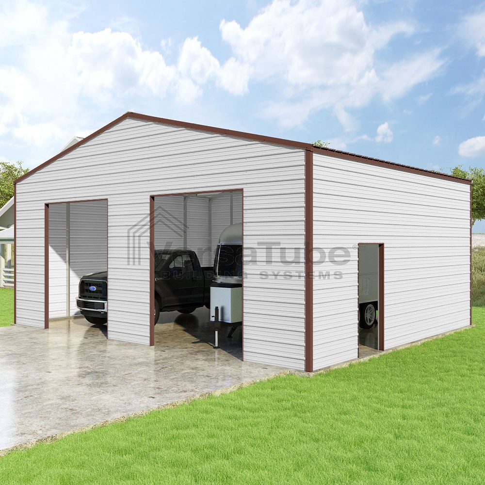 Frontier Series DIY garage kit features vertical sheet metal roof panels with horizontal siding panels..