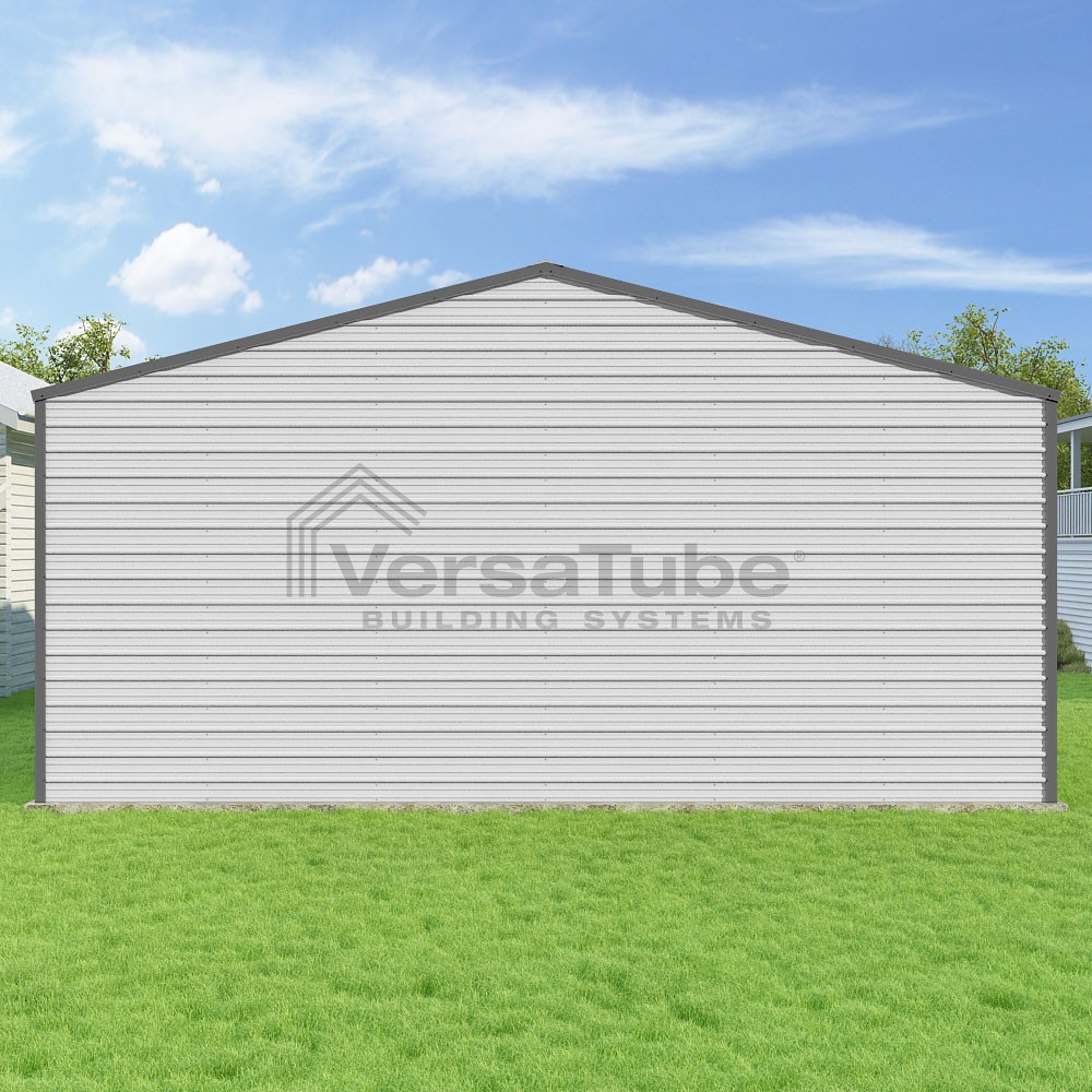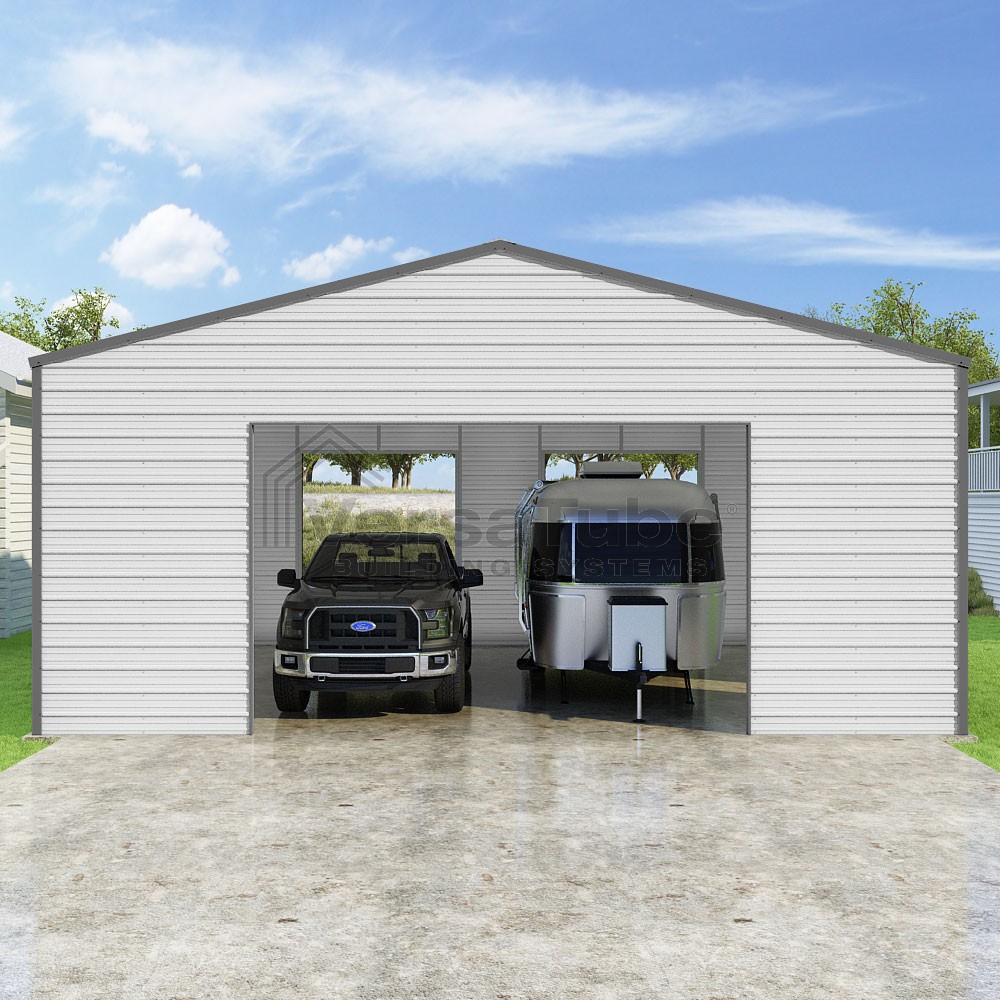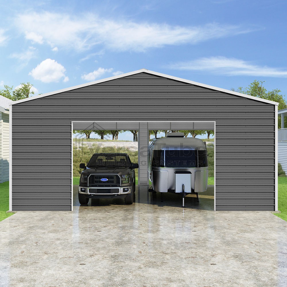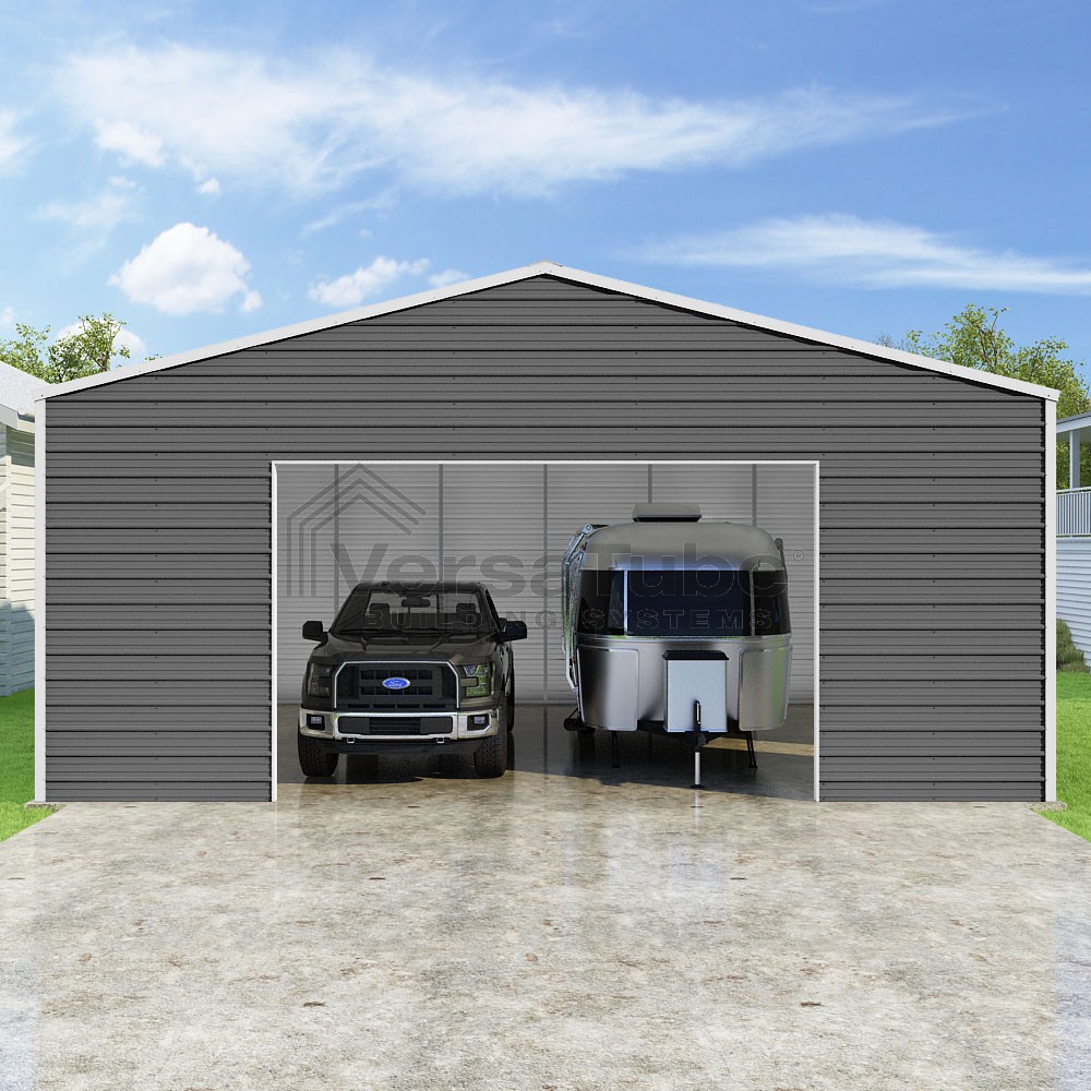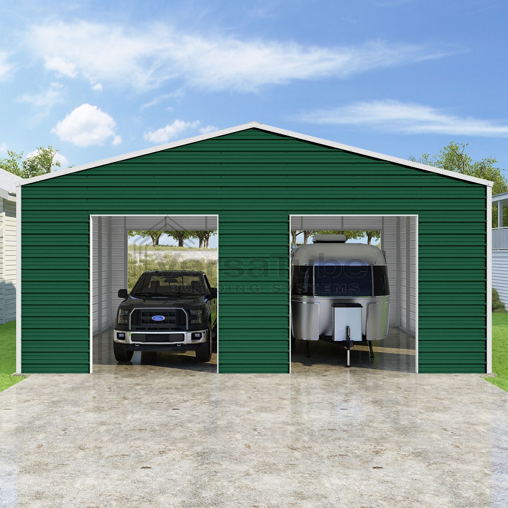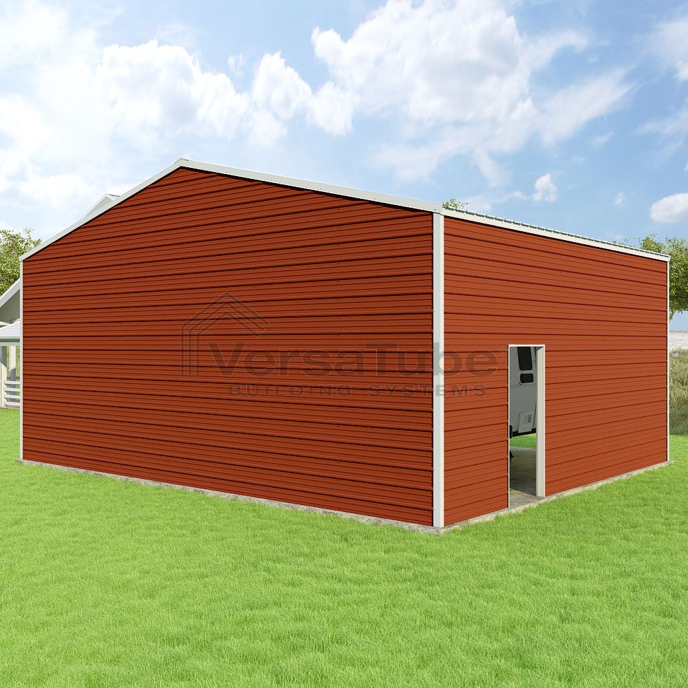 Frontier Series DIY garage kit features vertical sheet metal roof panels with horizontal siding panels..